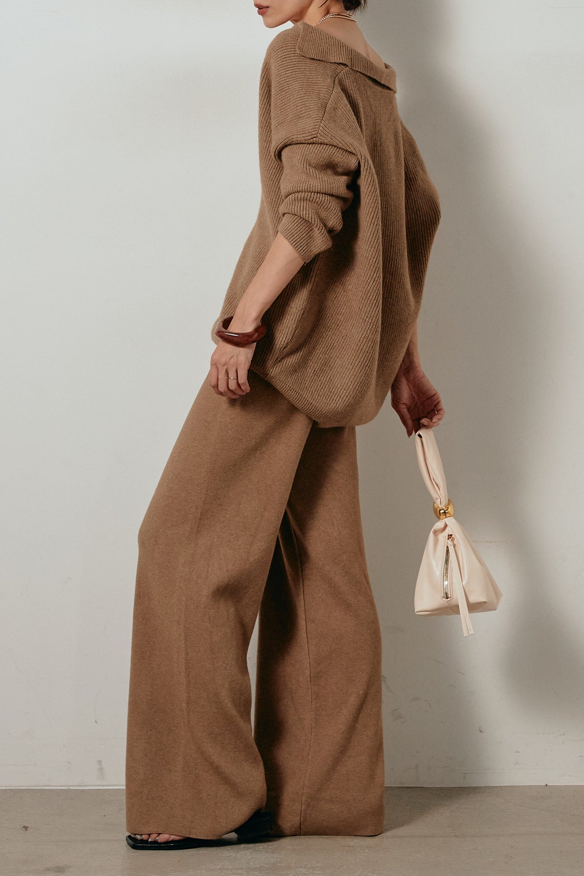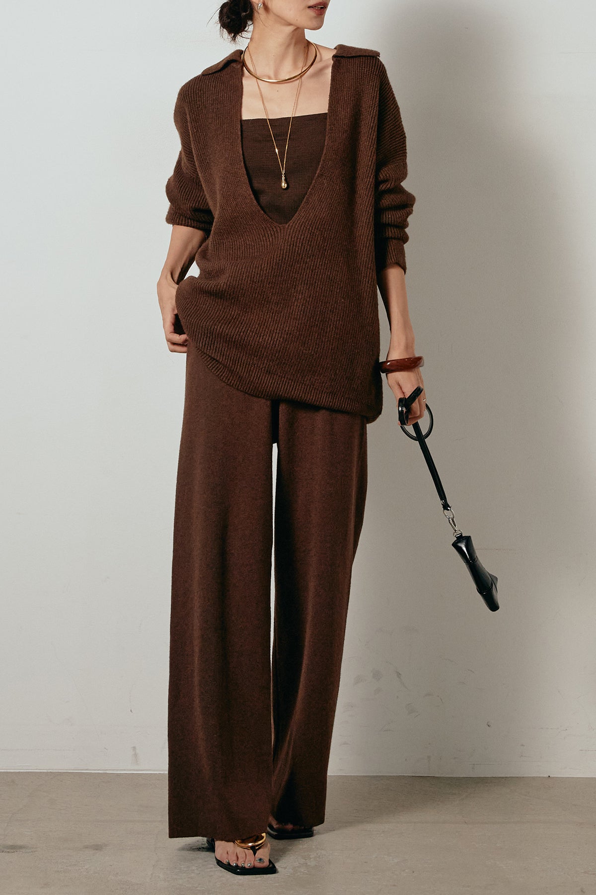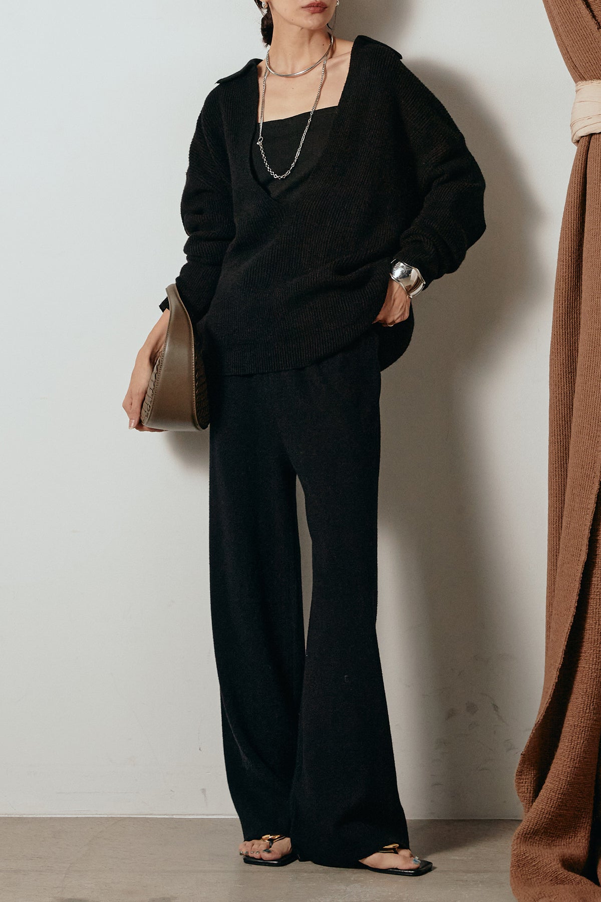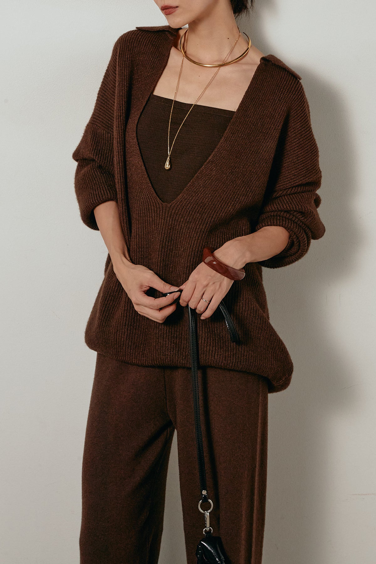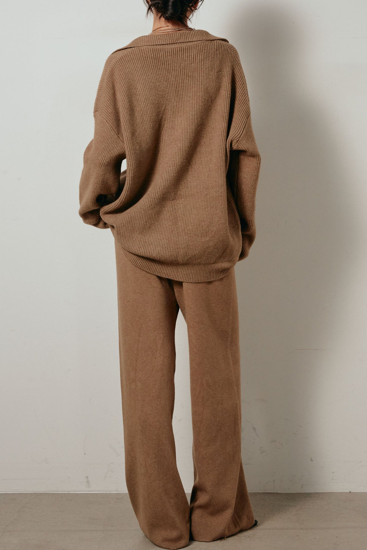 ざっくりとした編地が特徴の深Vネックニットセットアップ。トップスはデコルテがきれいに見える深めのVラインに太ベルトを合わせ、ウエストマークができるバランスの取れたシルエットに。パンツはゆるやかなストレートラインで抜け感をプラス。単品使いでも着回しやすく、ラフさと上品さを兼ね備えたアイテムです。