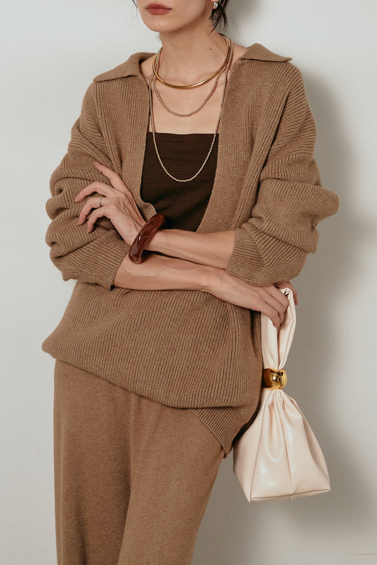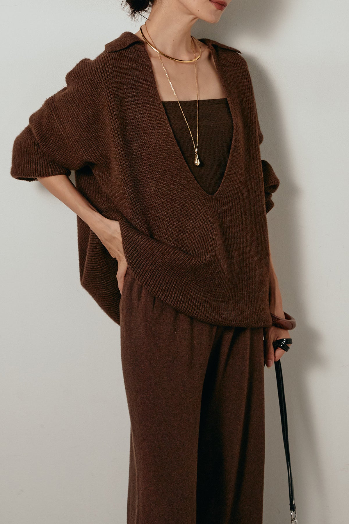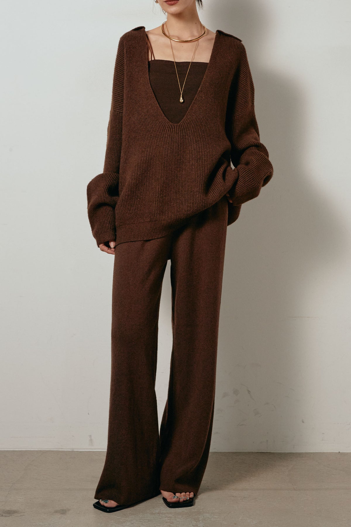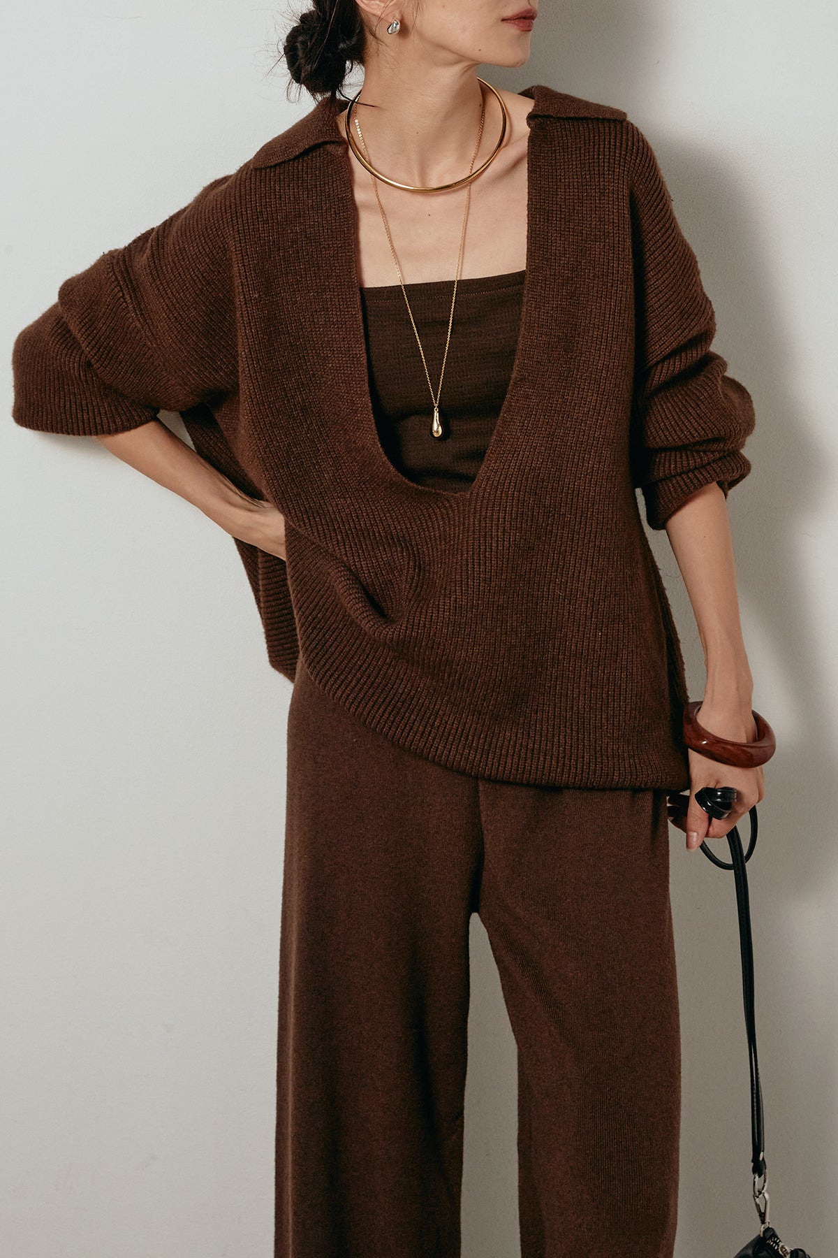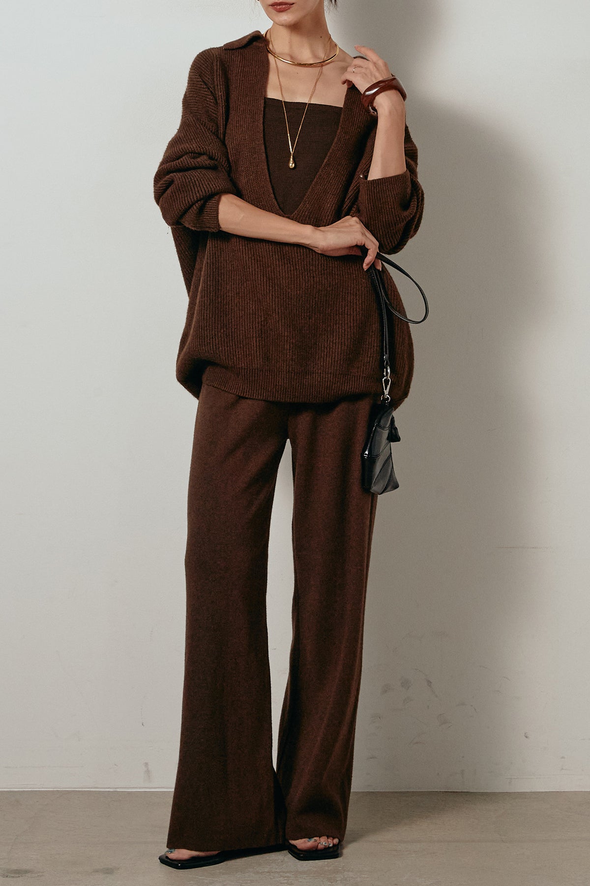 ざっくりとした編地が特徴の深Vネックニットセットアップ。トップスはデコルテがきれいに見える深めのVラインに太ベルトを合わせ、ウエストマークができるバランスの取れたシルエットに。パンツはゆるやかなストレートラインで抜け感をプラス。単品使いでも着回しやすく、ラフさと上品さを兼ね備えたアイテムです。