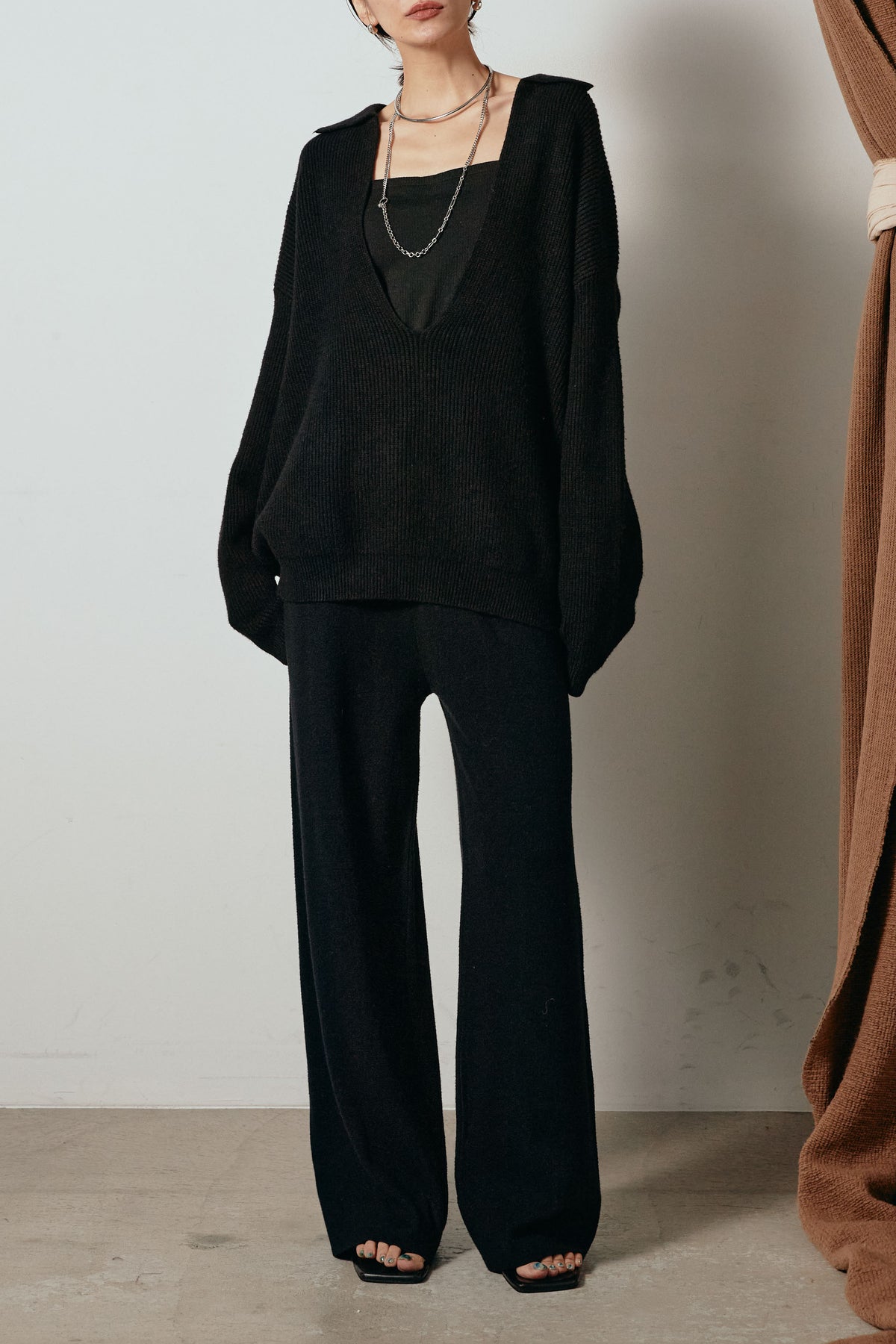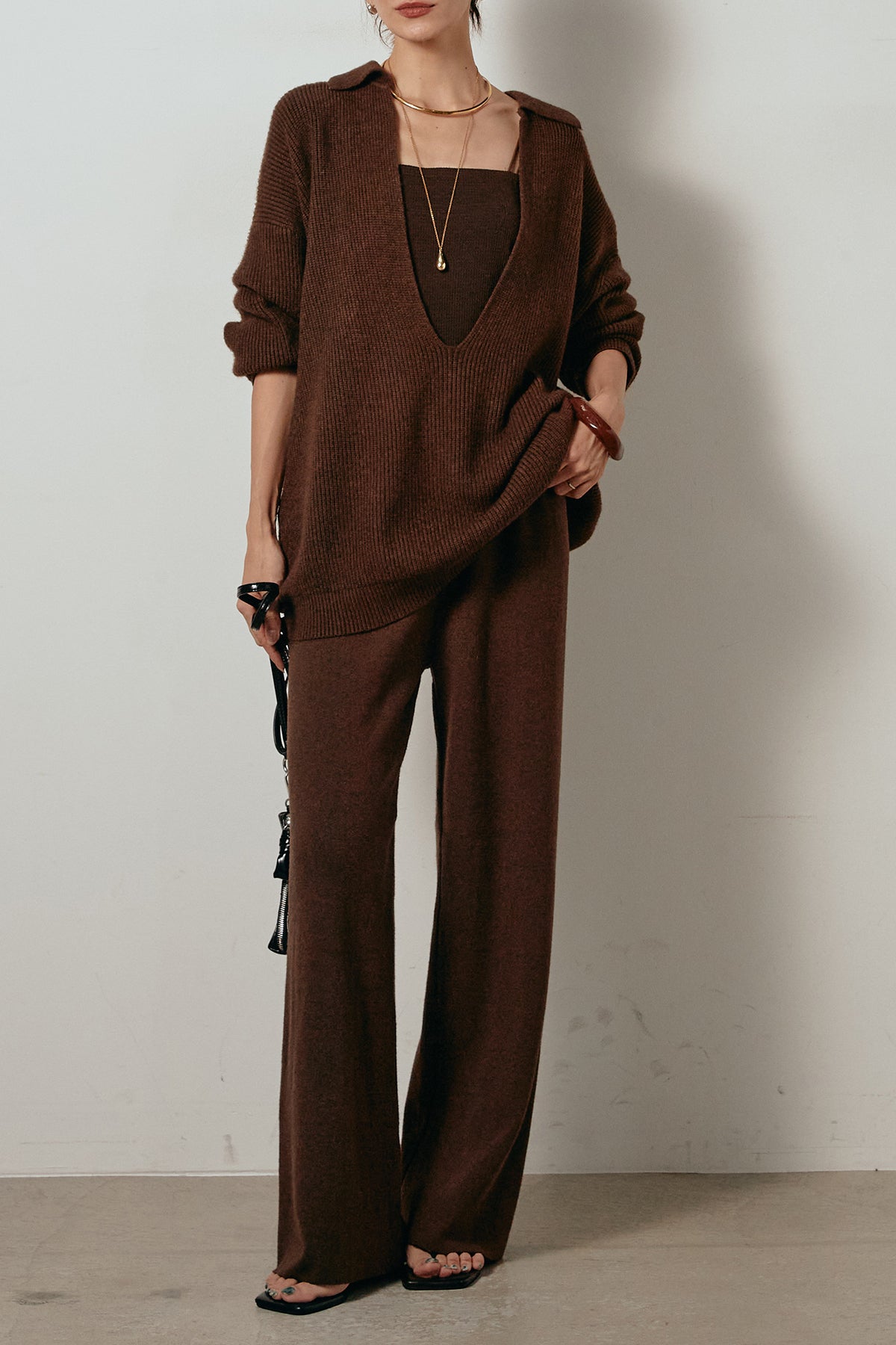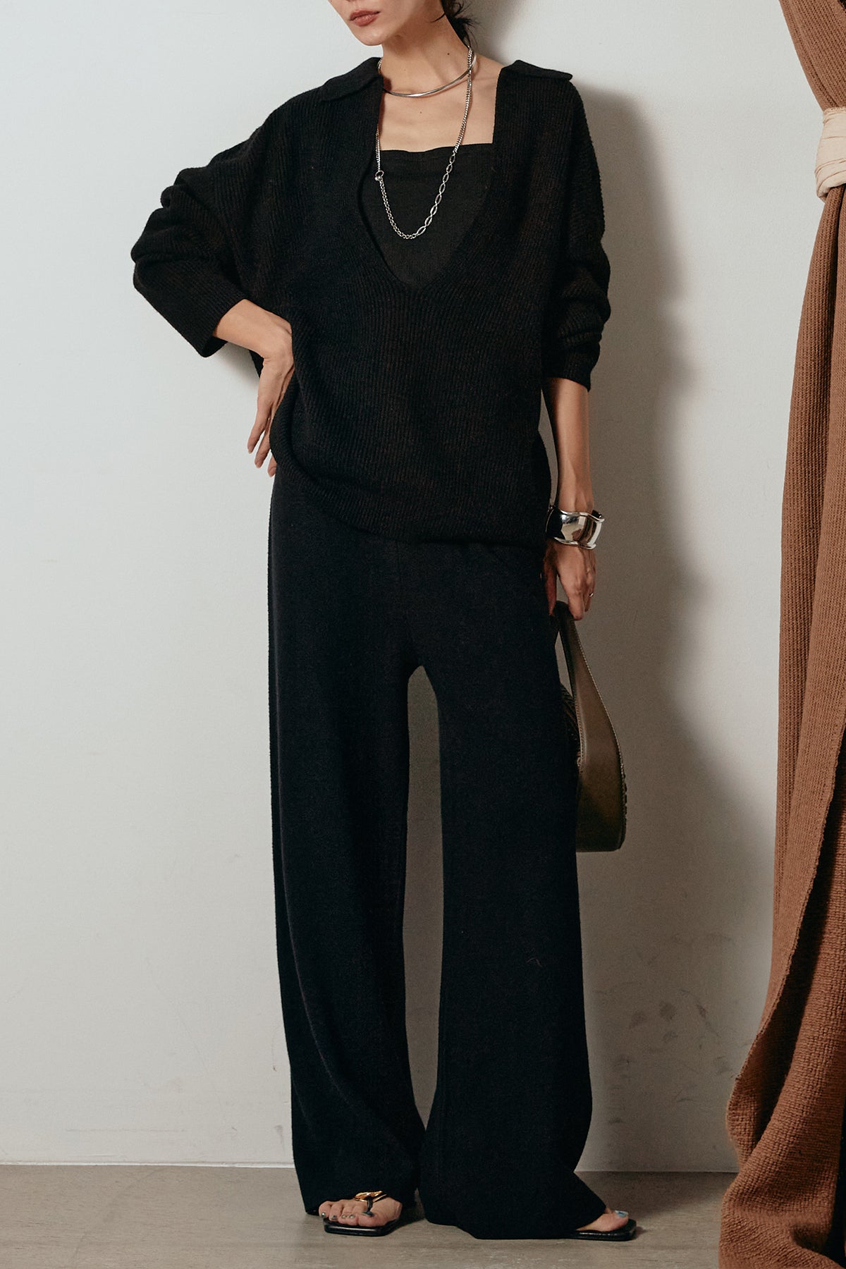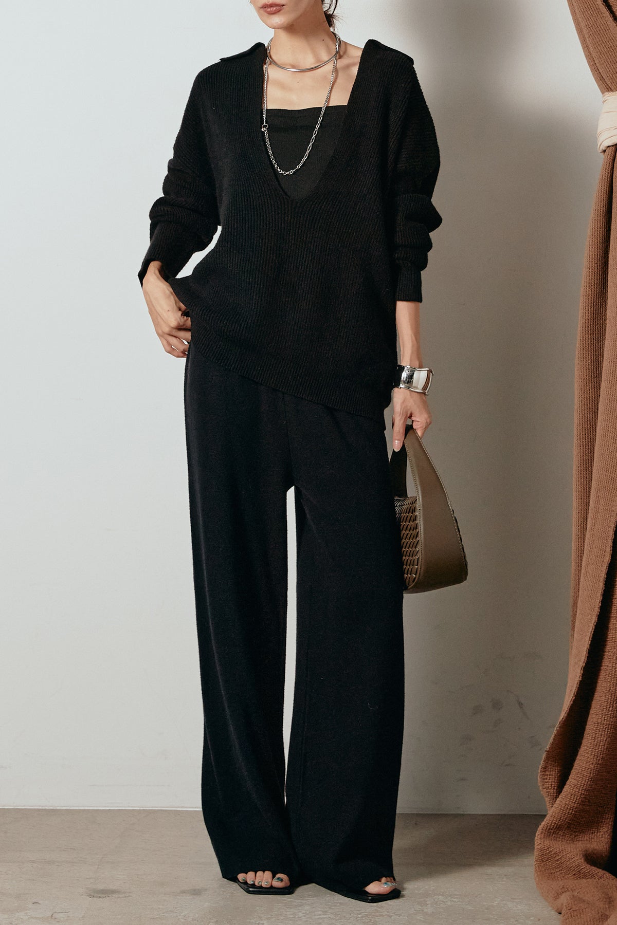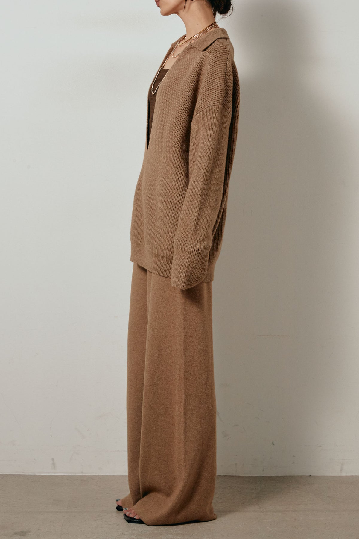 ざっくりとした編地が特徴の深Vネックニットセットアップ。トップスはデコルテがきれいに見える深めのVラインに太ベルトを合わせ、ウエストマークができるバランスの取れたシルエットに。パンツはゆるやかなストレートラインで抜け感をプラス。単品使いでも着回しやすく、ラフさと上品さを兼ね備えたアイテムです。