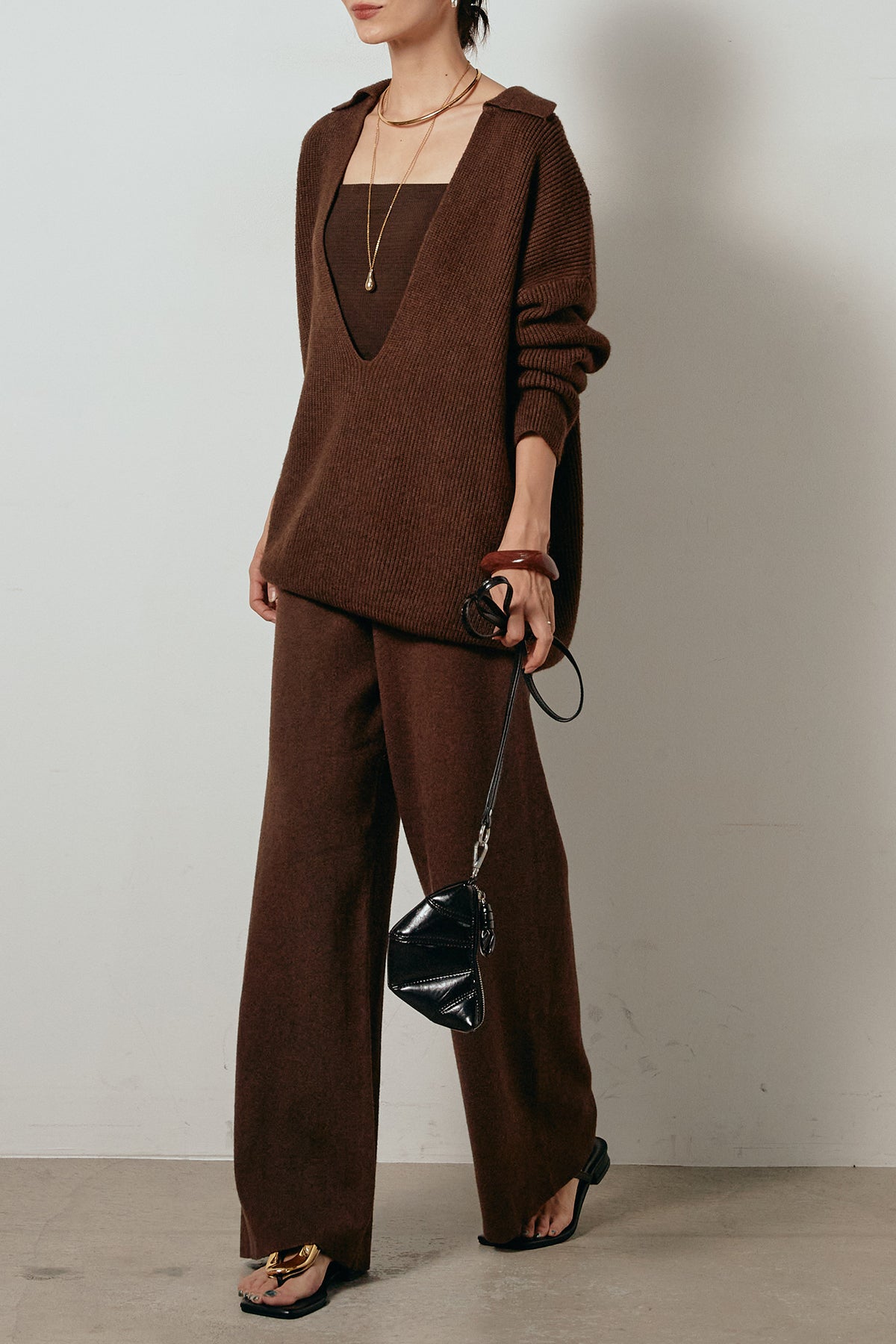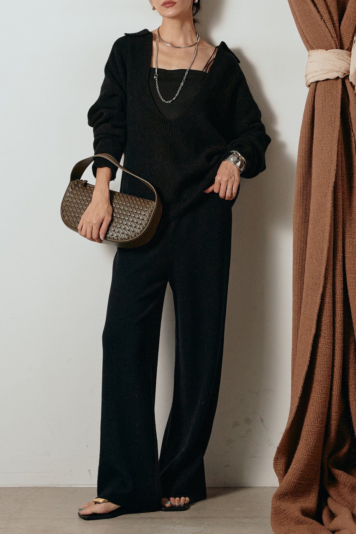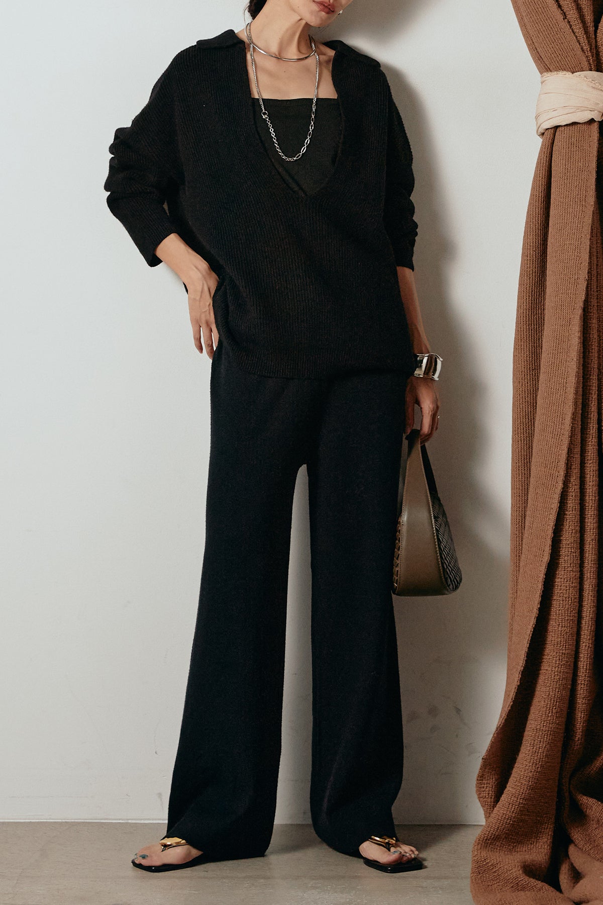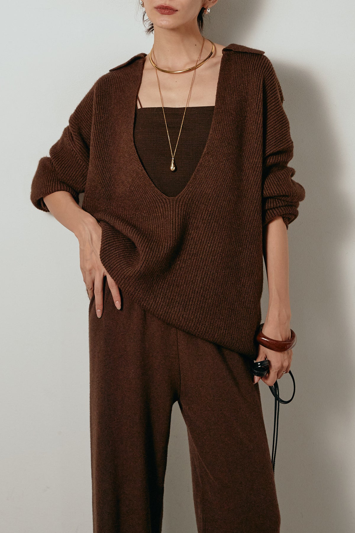 ざっくりとした編地が特徴の深Vネックニットセットアップ。トップスはデコルテがきれいに見える深めのVラインに太ベルトを合わせ、ウエストマークができるバランスの取れたシルエットに。パンツはゆるやかなストレートラインで抜け感をプラス。単品使いでも着回しやすく、ラフさと上品さを兼ね備えたアイテムです。
