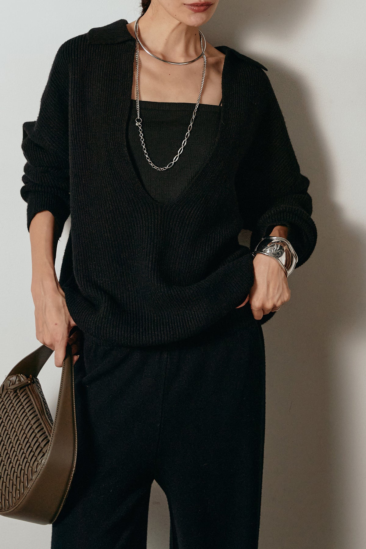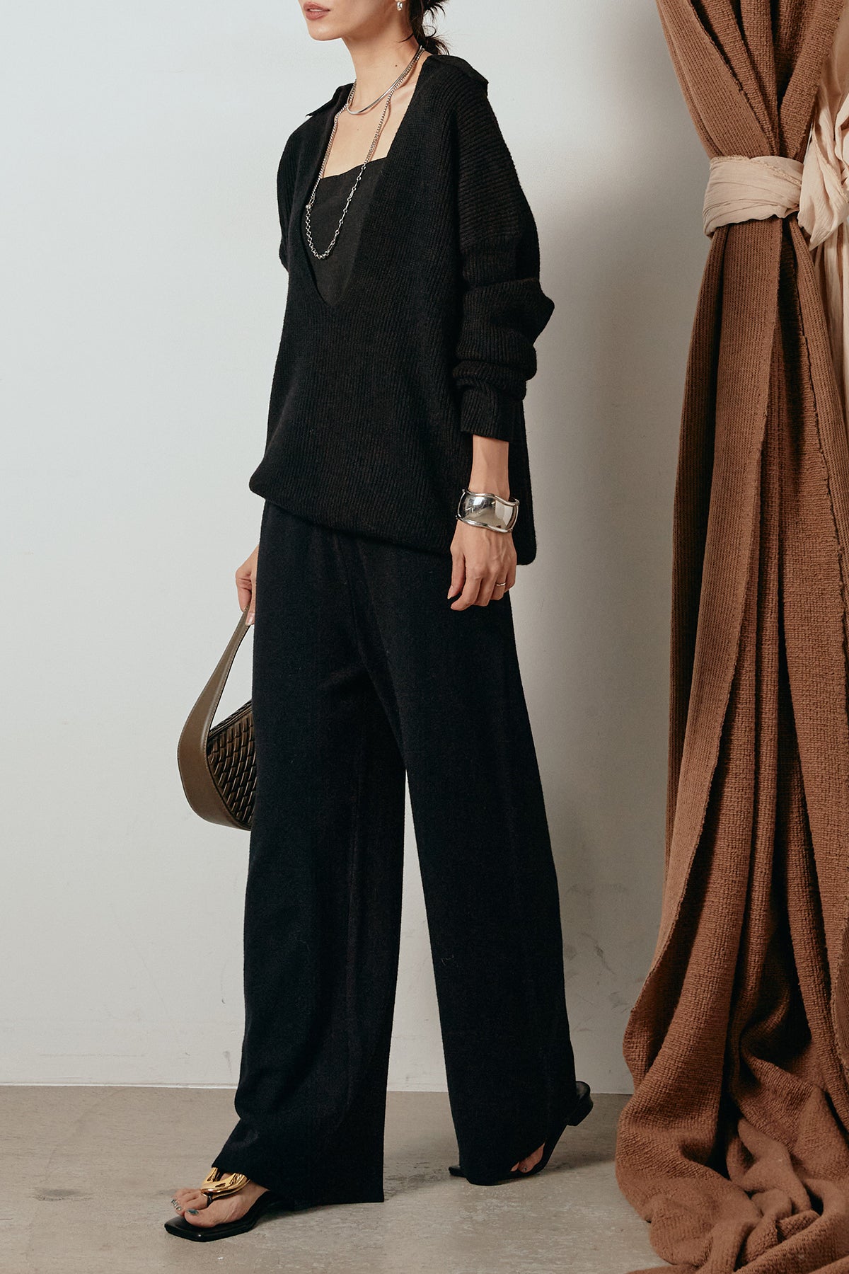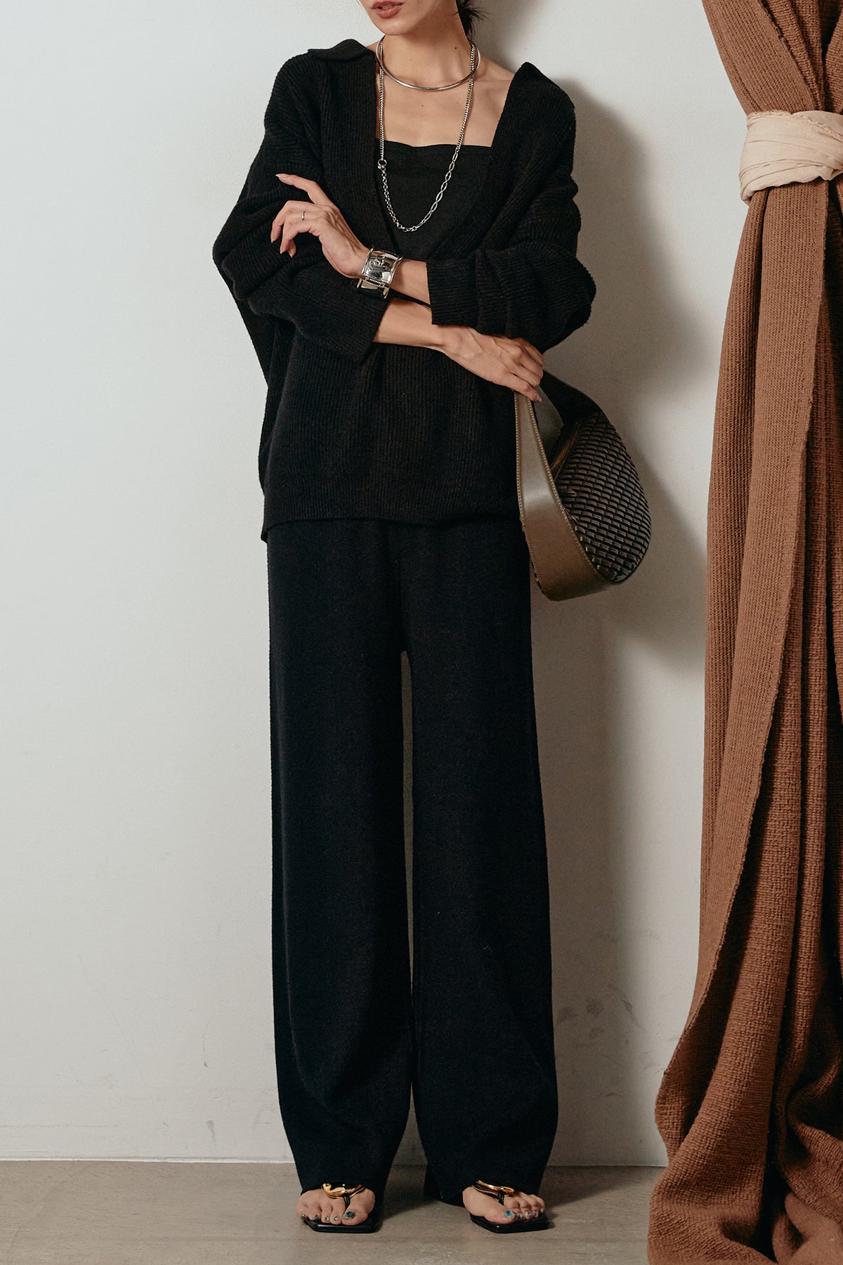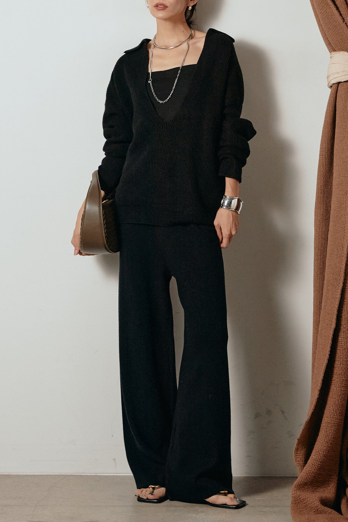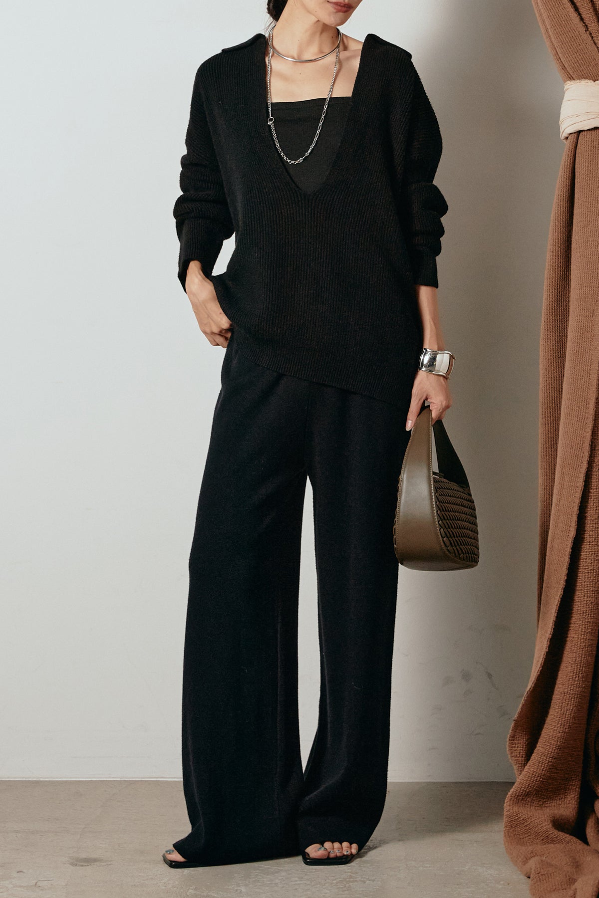 ざっくりとした編地が特徴の深Vネックニットセットアップ。トップスはデコルテがきれいに見える深めのVラインに太ベルトを合わせ、ウエストマークができるバランスの取れたシルエットに。パンツはゆるやかなストレートラインで抜け感をプラス。単品使いでも着回しやすく、ラフさと上品さを兼ね備えたアイテムです。