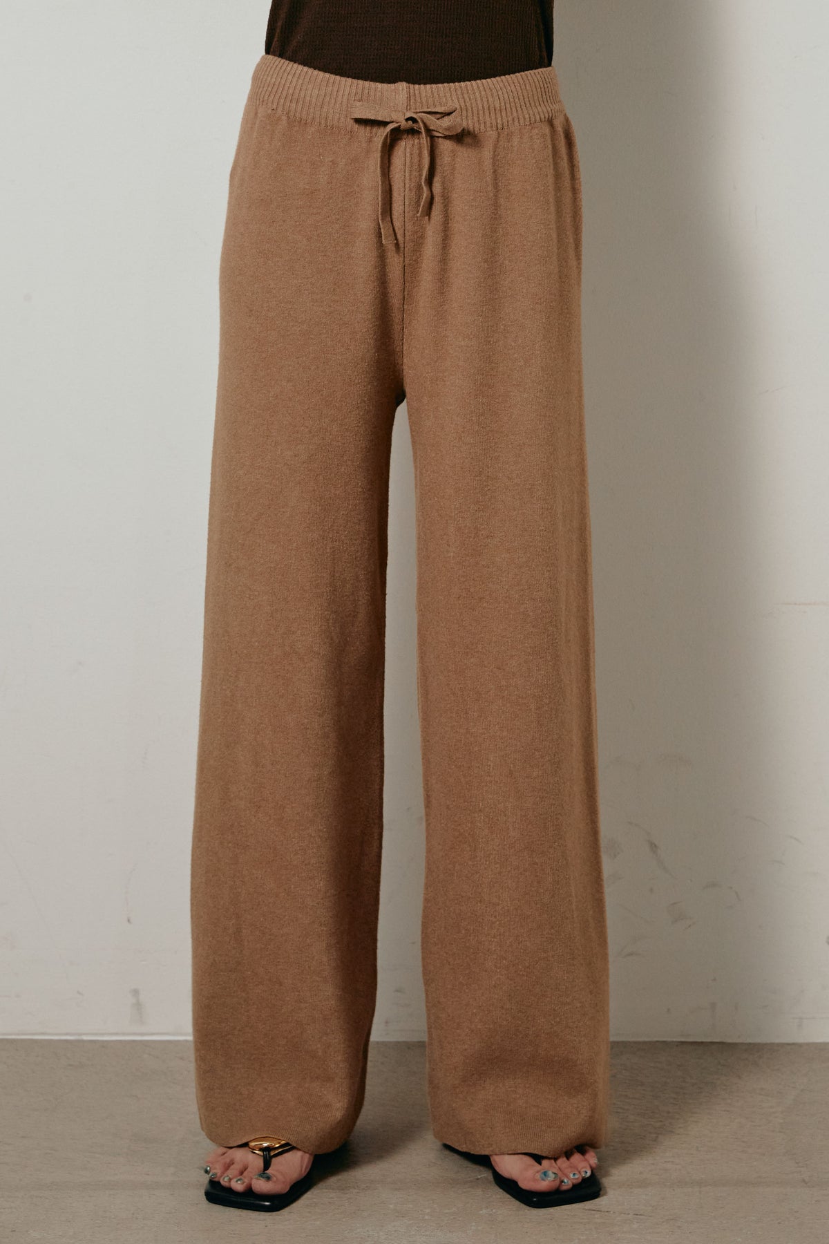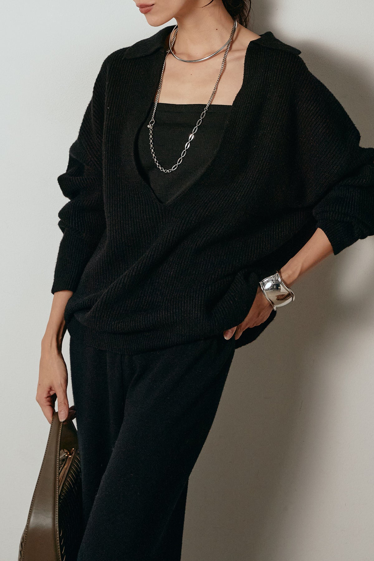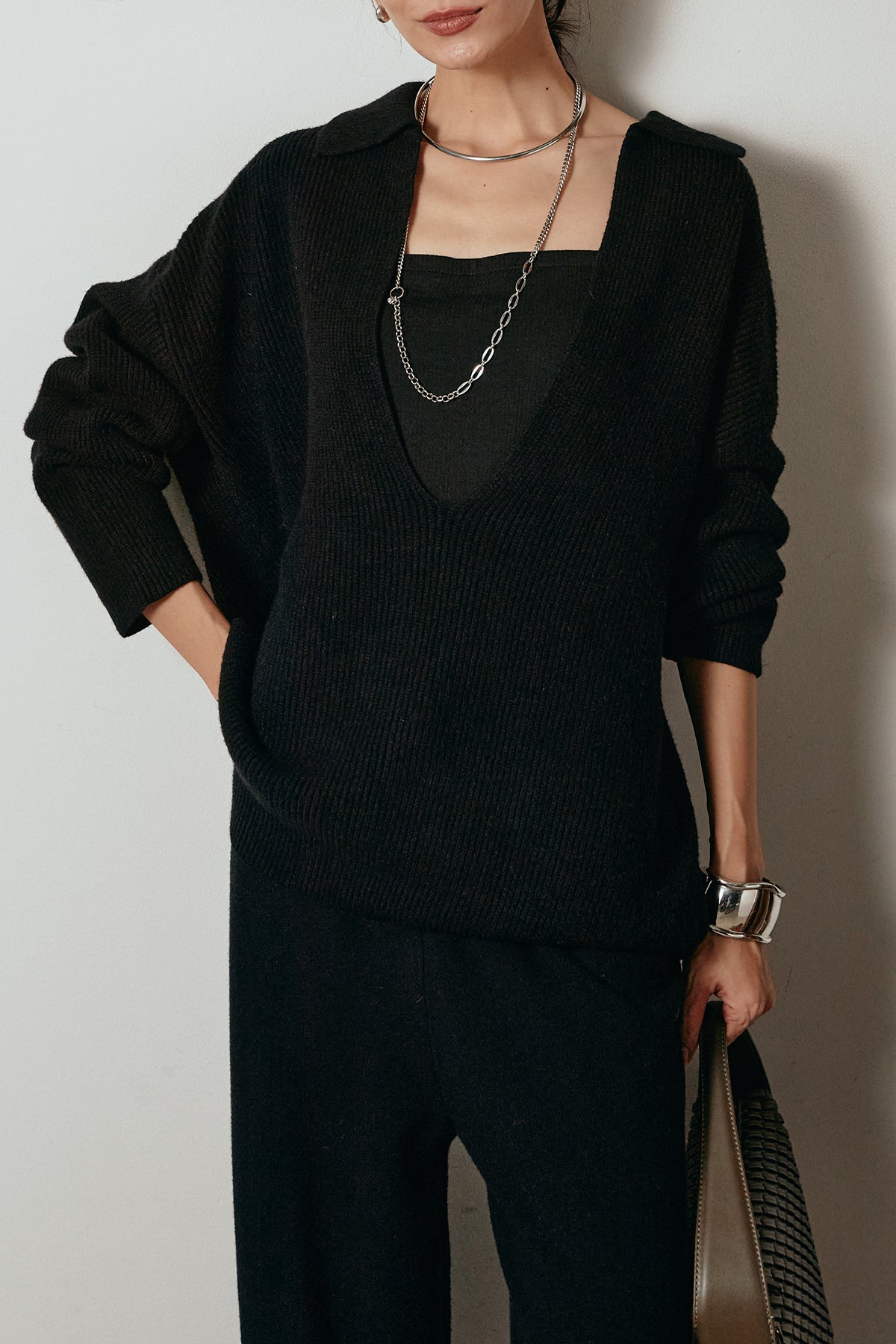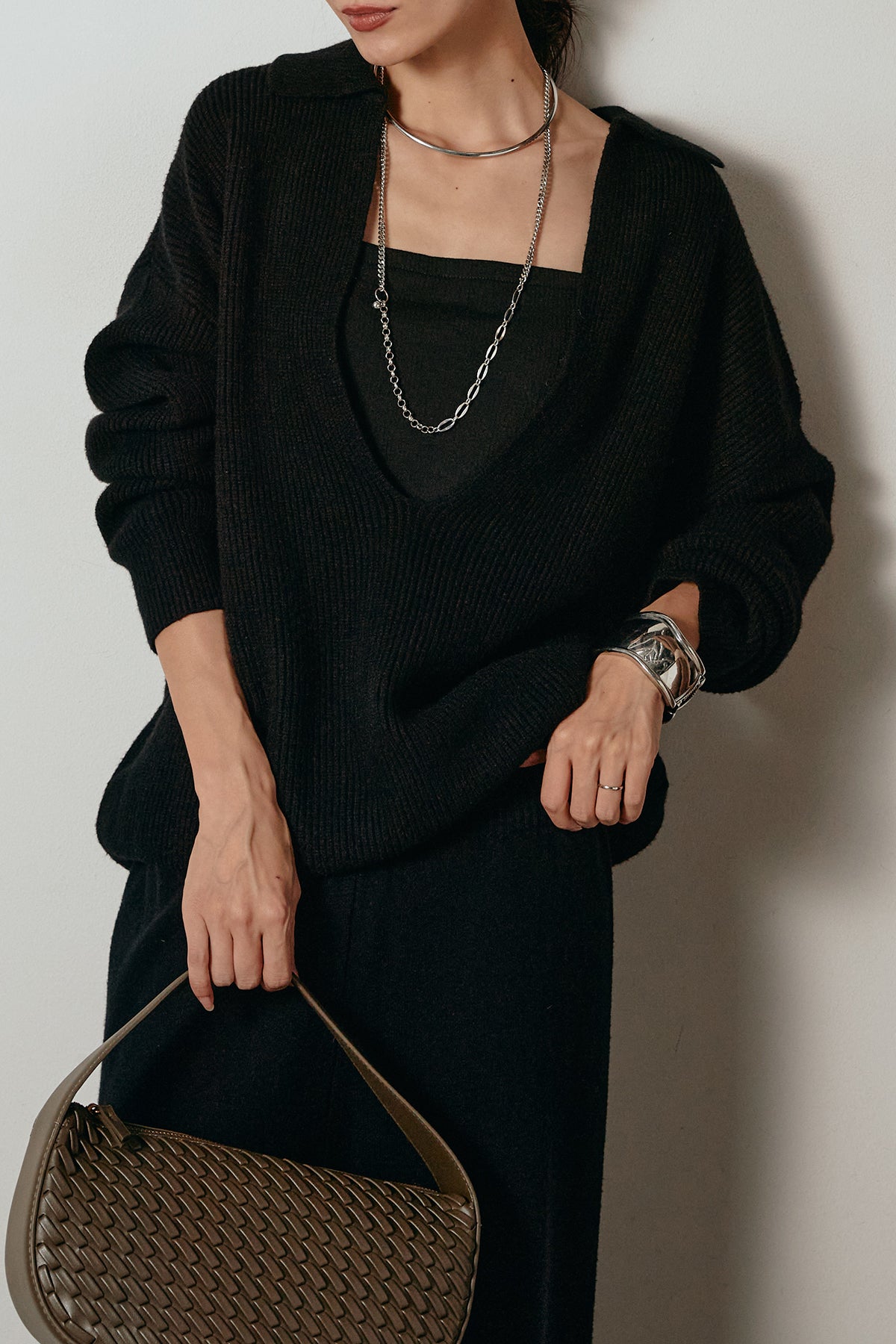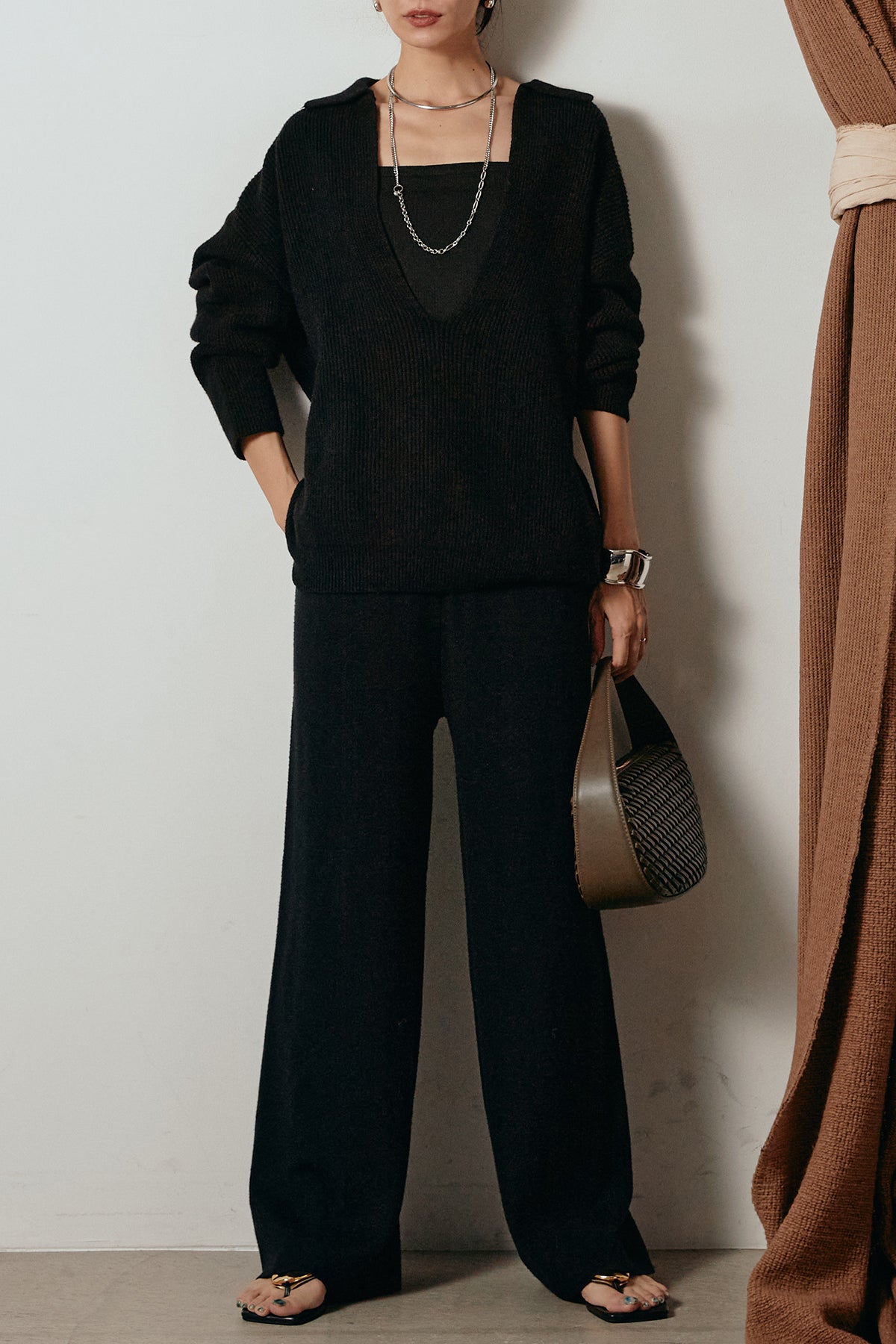 ざっくりとした編地が特徴の深Vネックニットセットアップ。トップスはデコルテがきれいに見える深めのVラインに太ベルトを合わせ、ウエストマークができるバランスの取れたシルエットに。パンツはゆるやかなストレートラインで抜け感をプラス。単品使いでも着回しやすく、ラフさと上品さを兼ね備えたアイテムです。
