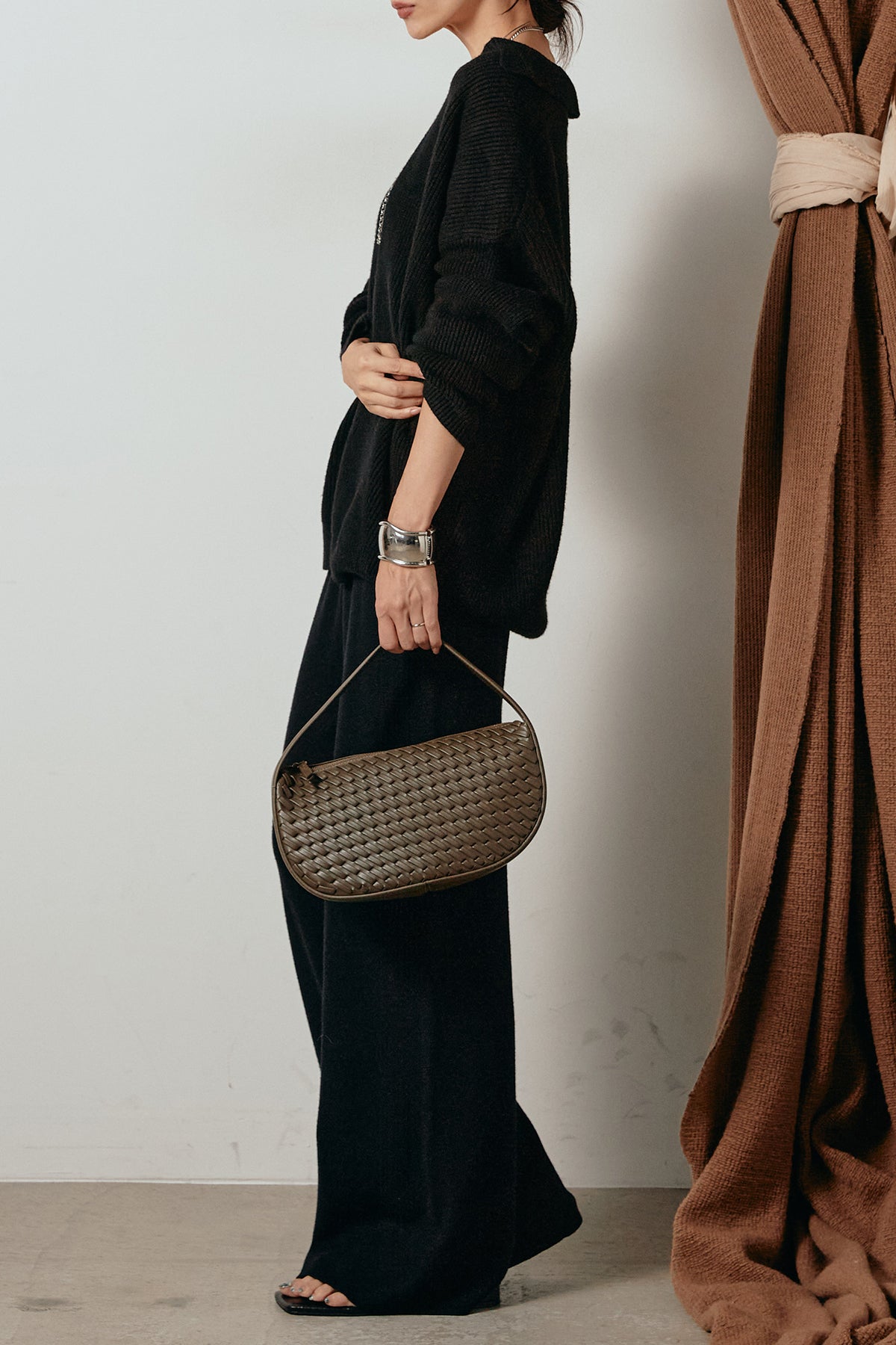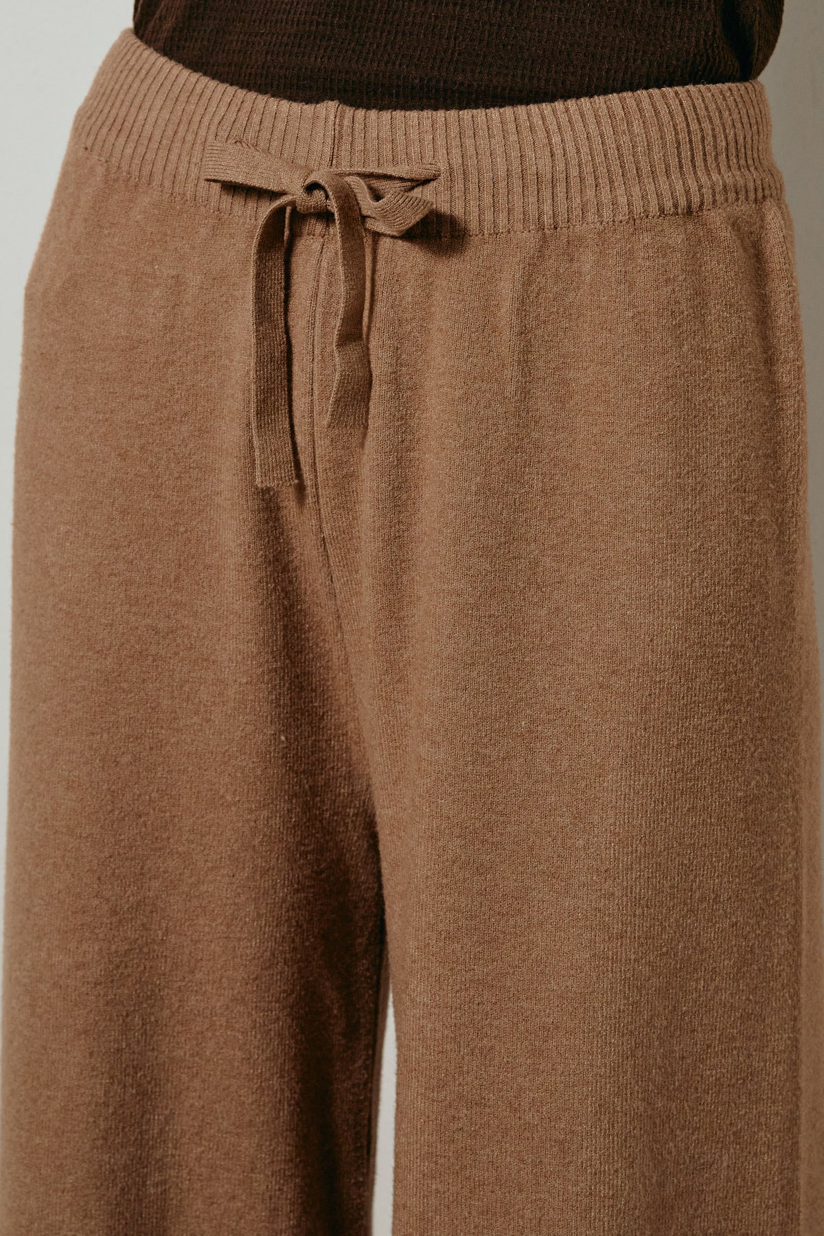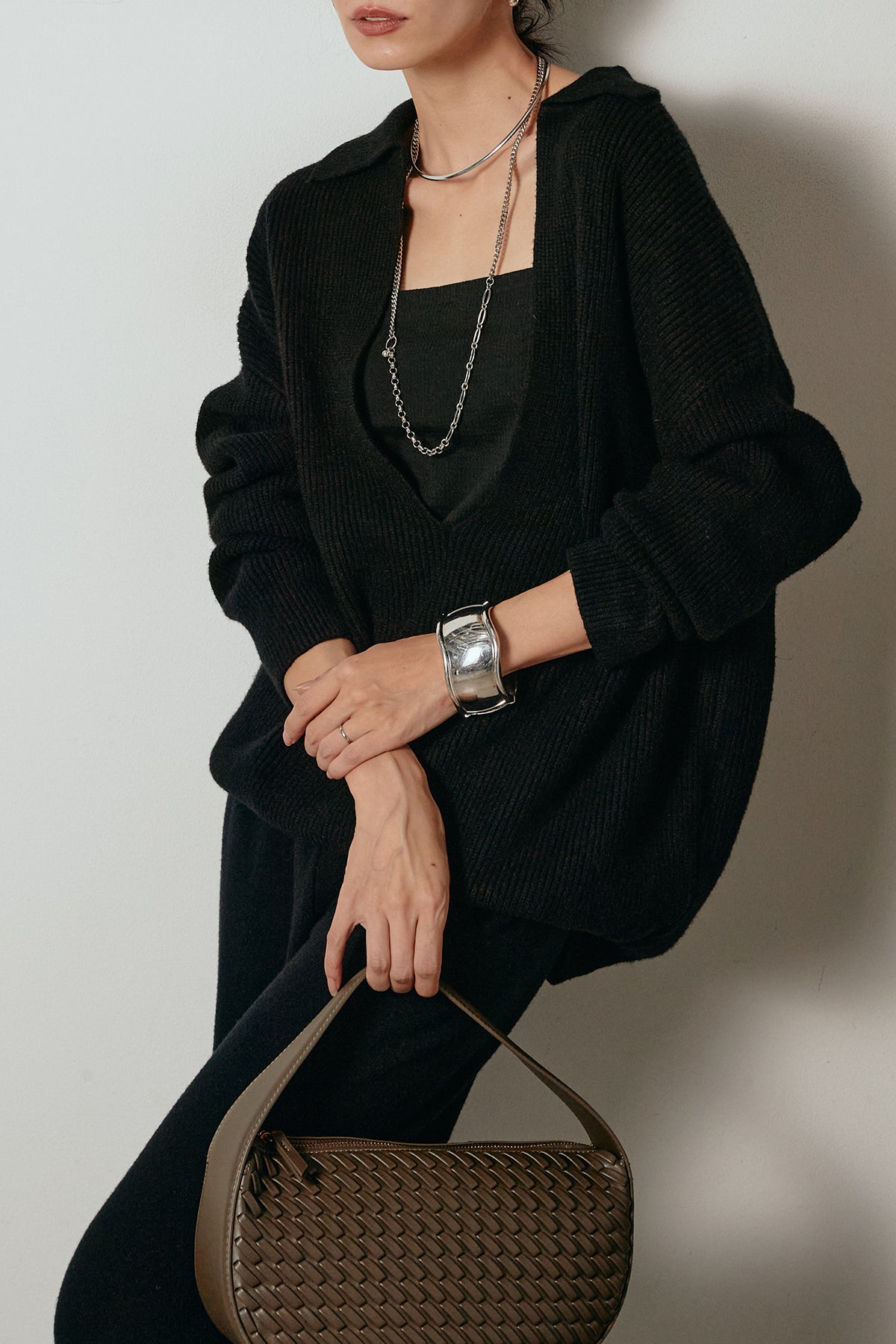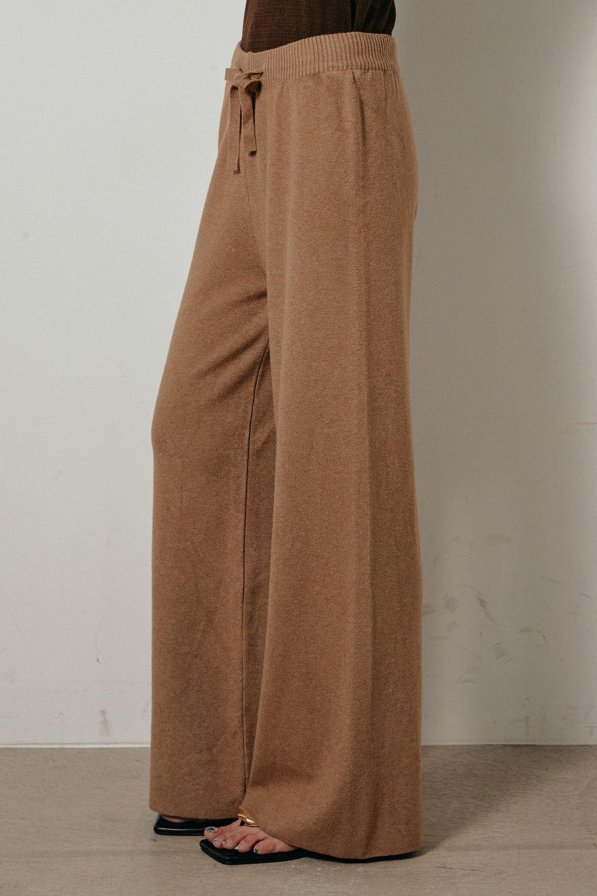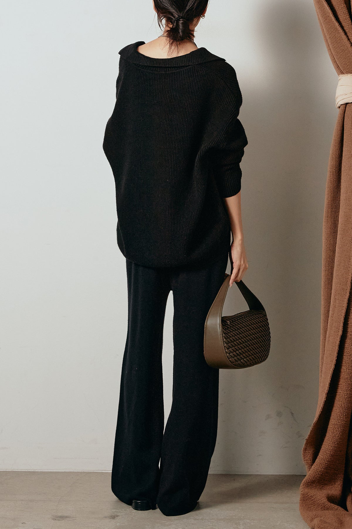ざっくりとした編地が特徴の深Vネックニットセットアップ。トップスはデコルテがきれいに見える深めのVラインに太ベルトを合わせ、ウエストマークができるバランスの取れたシルエットに。パンツはゆるやかなストレートラインで抜け感をプラス。単品使いでも着回しやすく、ラフさと上品さを兼ね備えたアイテムです。