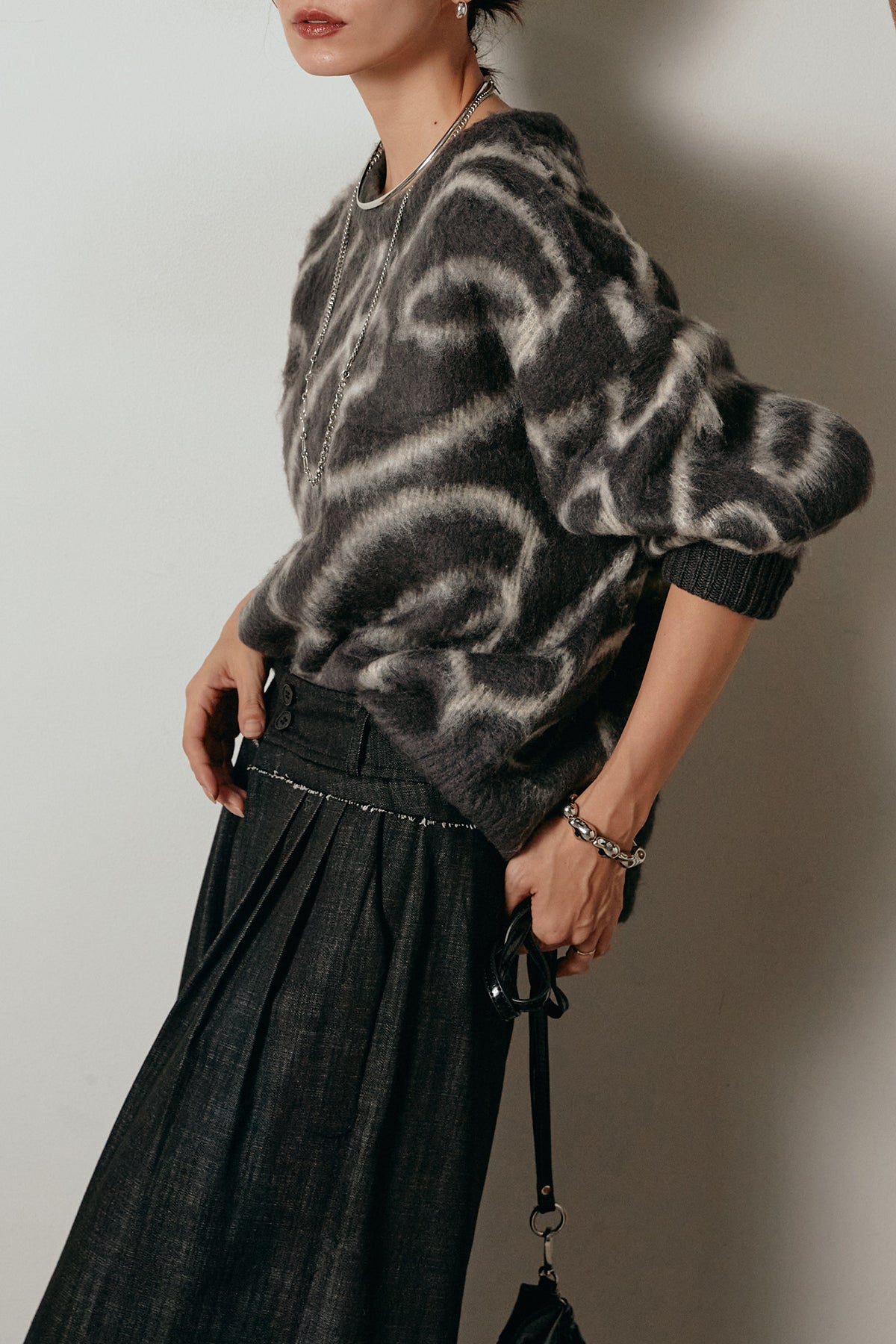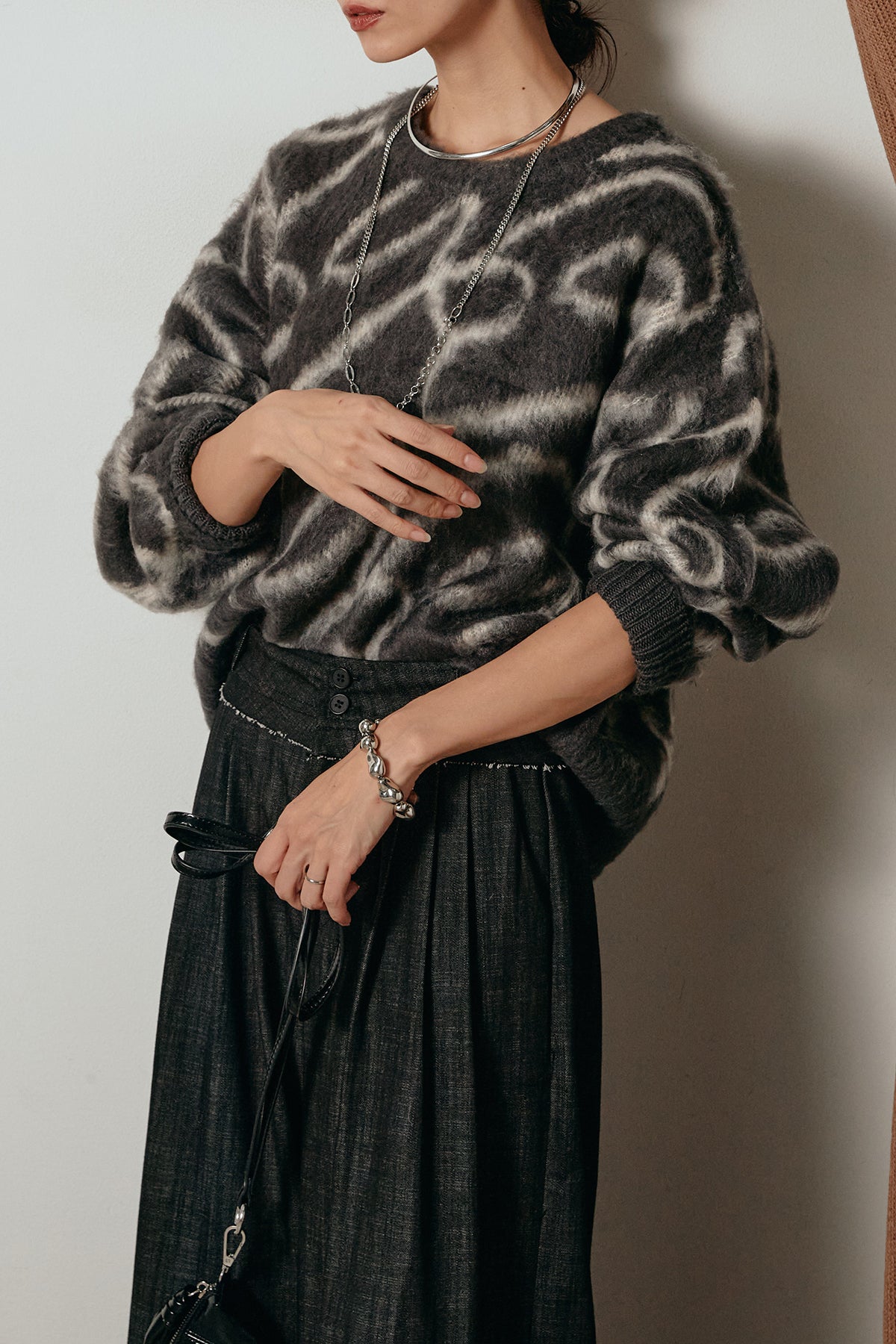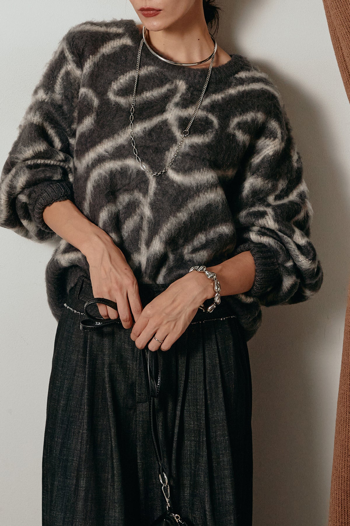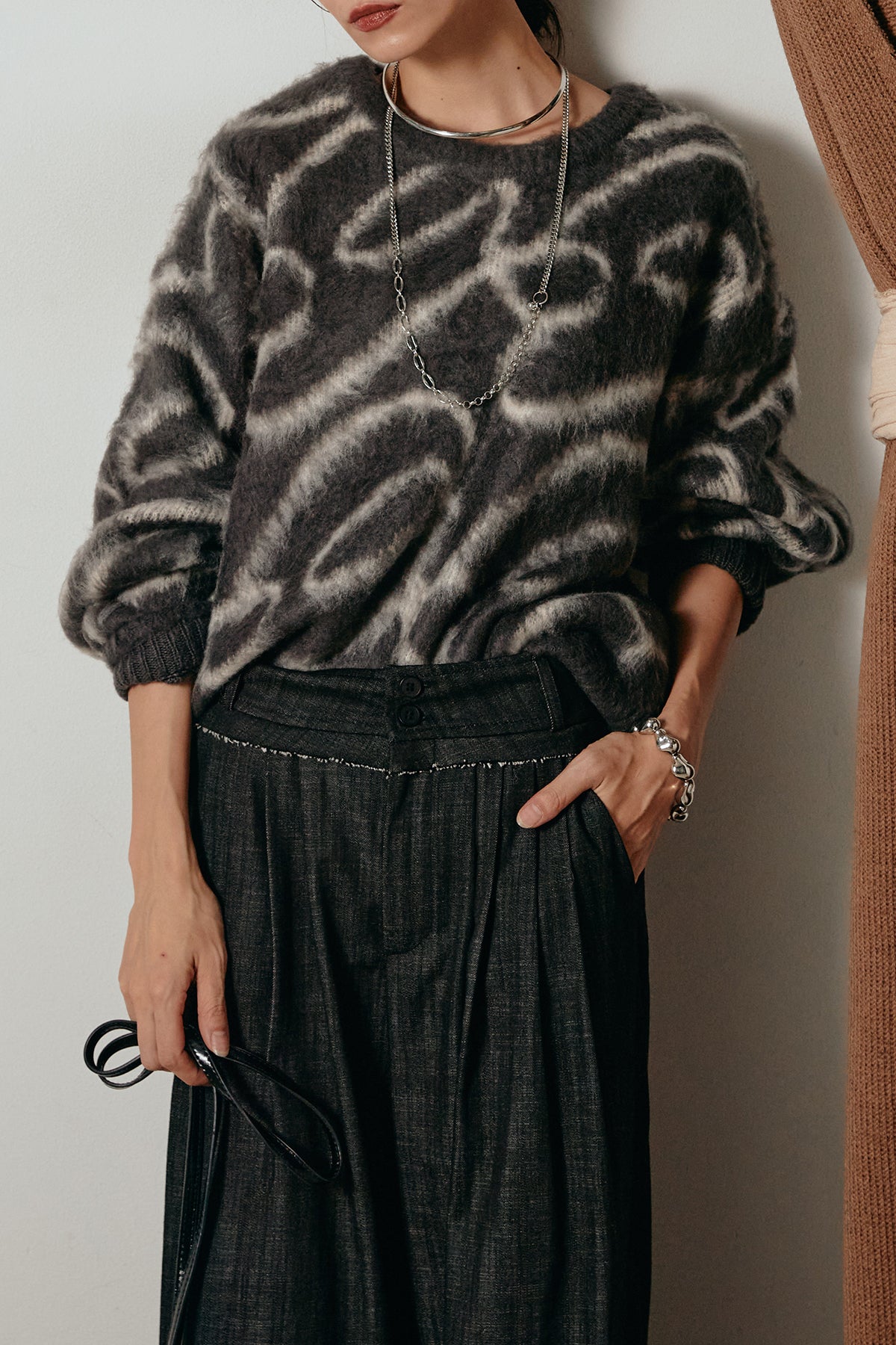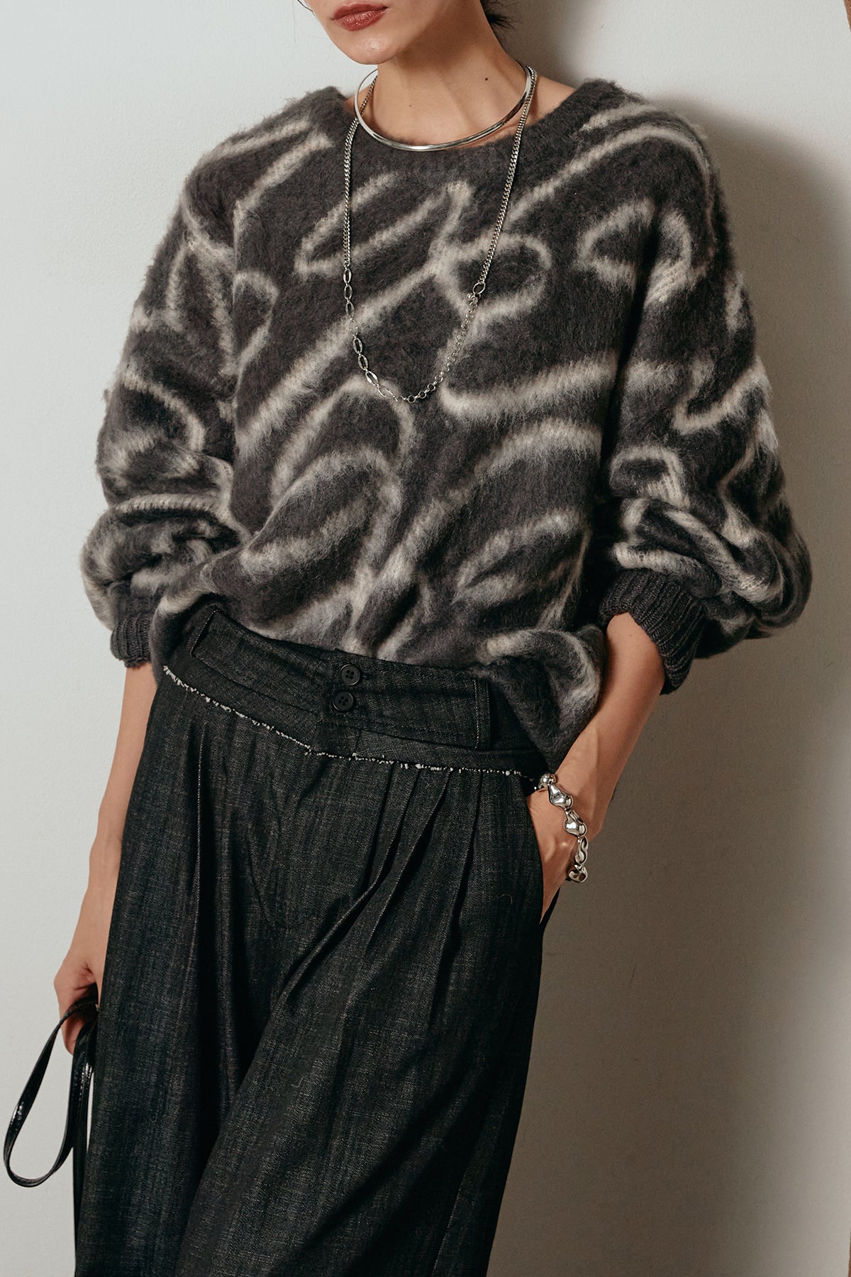 柔らかな毛足のあるニットに、印象的なライン柄を施したプルオーバー。抽象的なニュアンスデザインが存在感を放ち、シンプルながらもモードな印象を演出します。ゆったりとしたシルエットでリラックス感があり、ボトムを選ばず着回し自在。デニムやスカートと合わせるだけで洗練されたスタイリングが完成します。