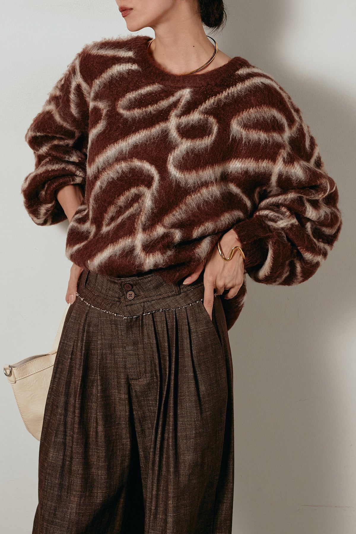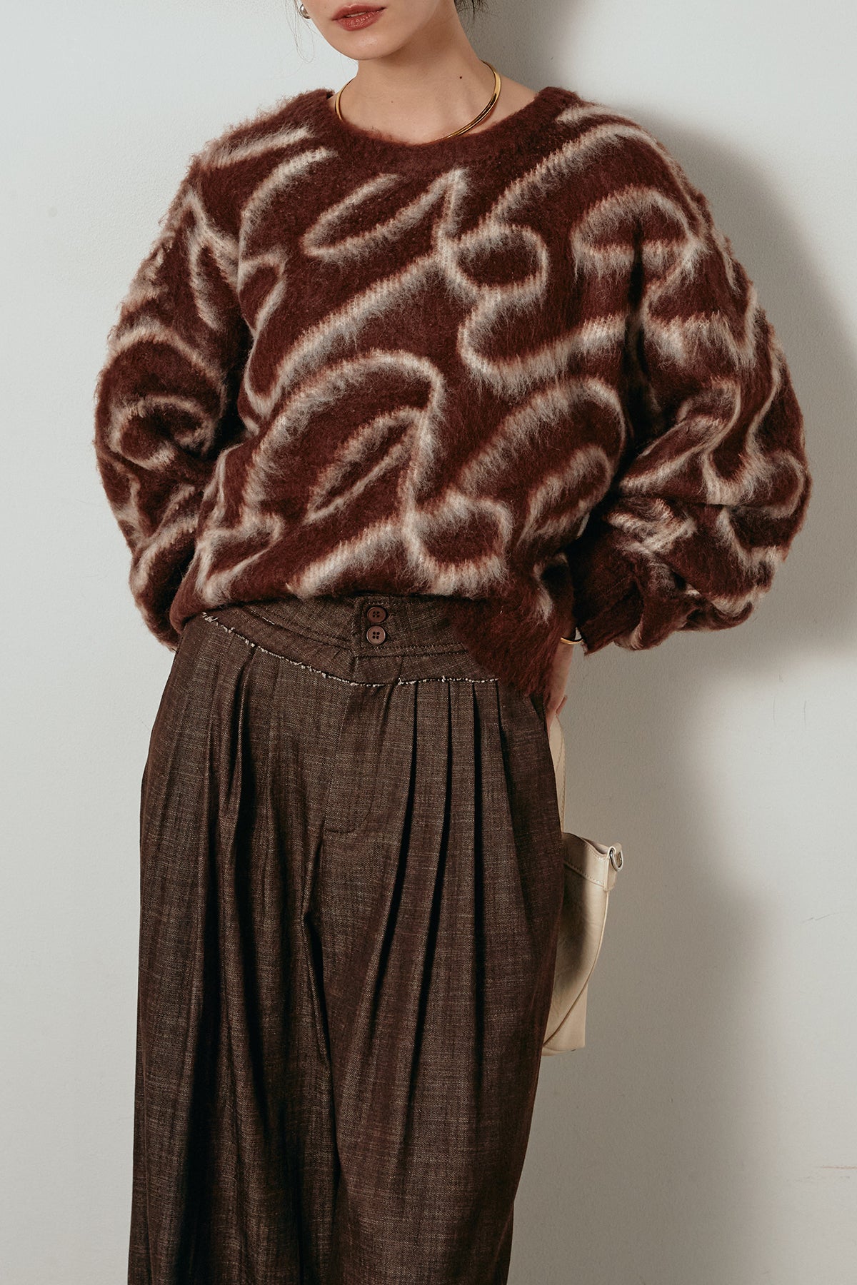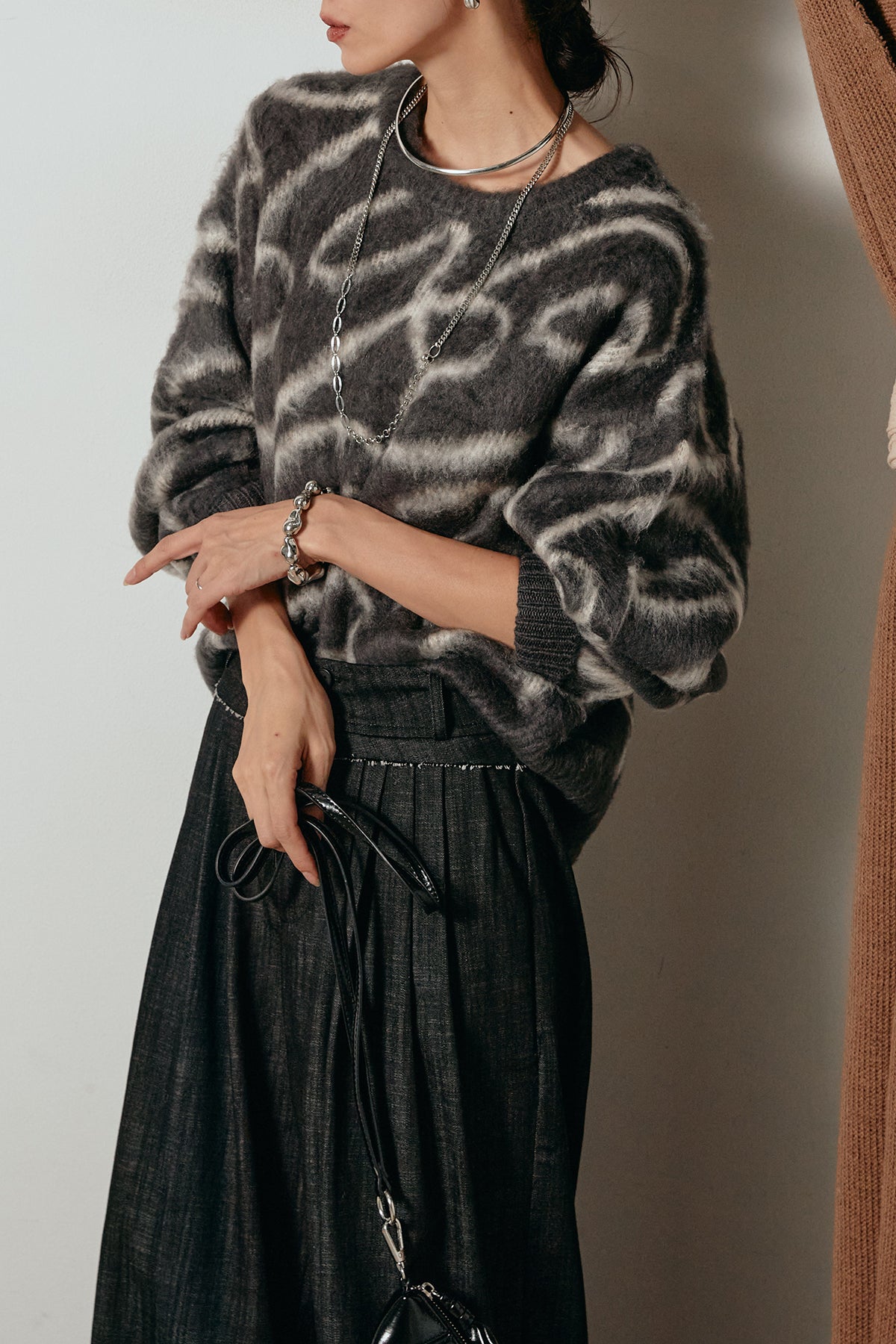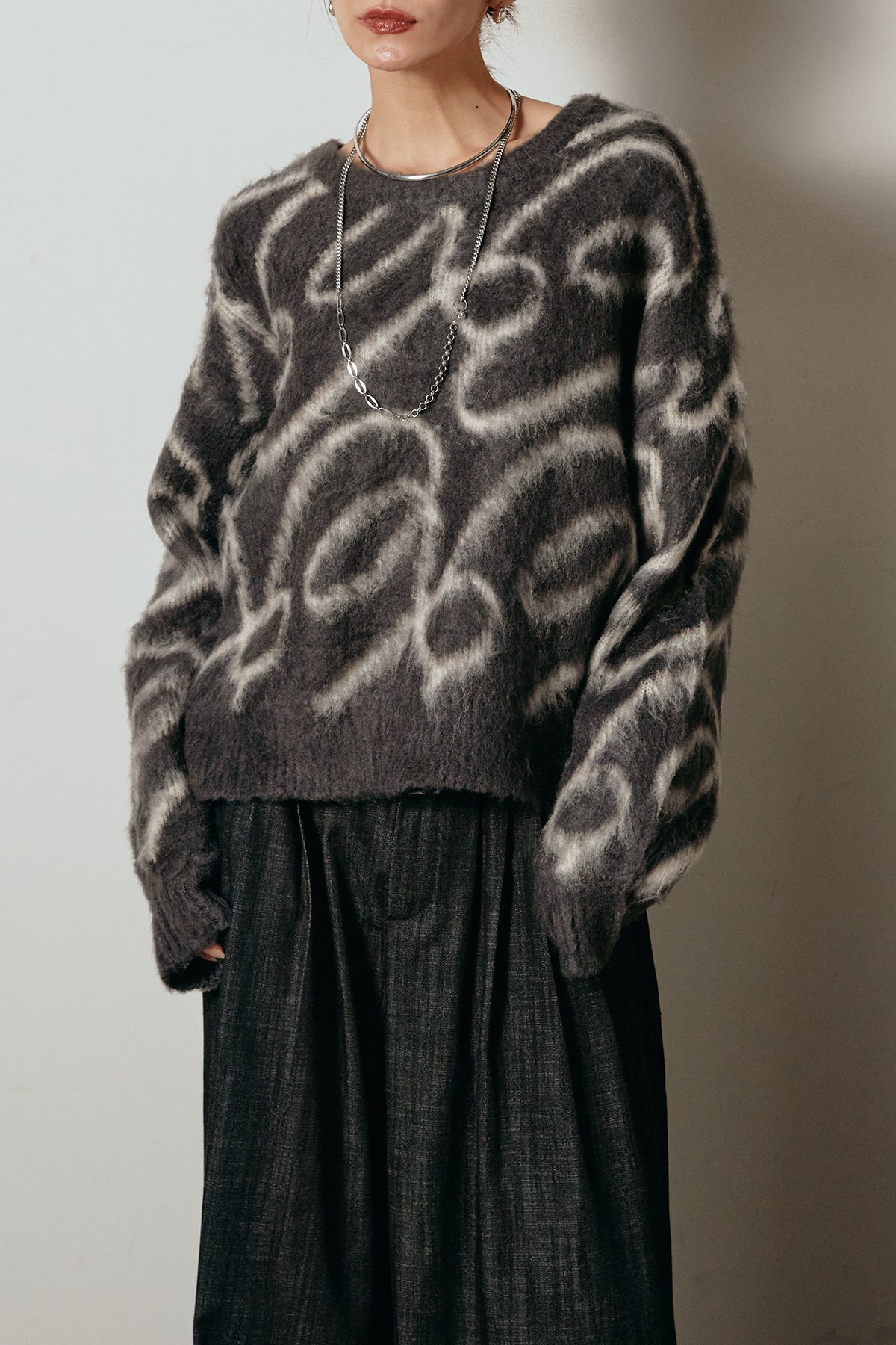 柔らかな毛足のあるニットに、印象的なライン柄を施したプルオーバー。抽象的なニュアンスデザインが存在感を放ち、シンプルながらもモードな印象を演出します。ゆったりとしたシルエットでリラックス感があり、ボトムを選ばず着回し自在。デニムやスカートと合わせるだけで洗練されたスタイリングが完成します。