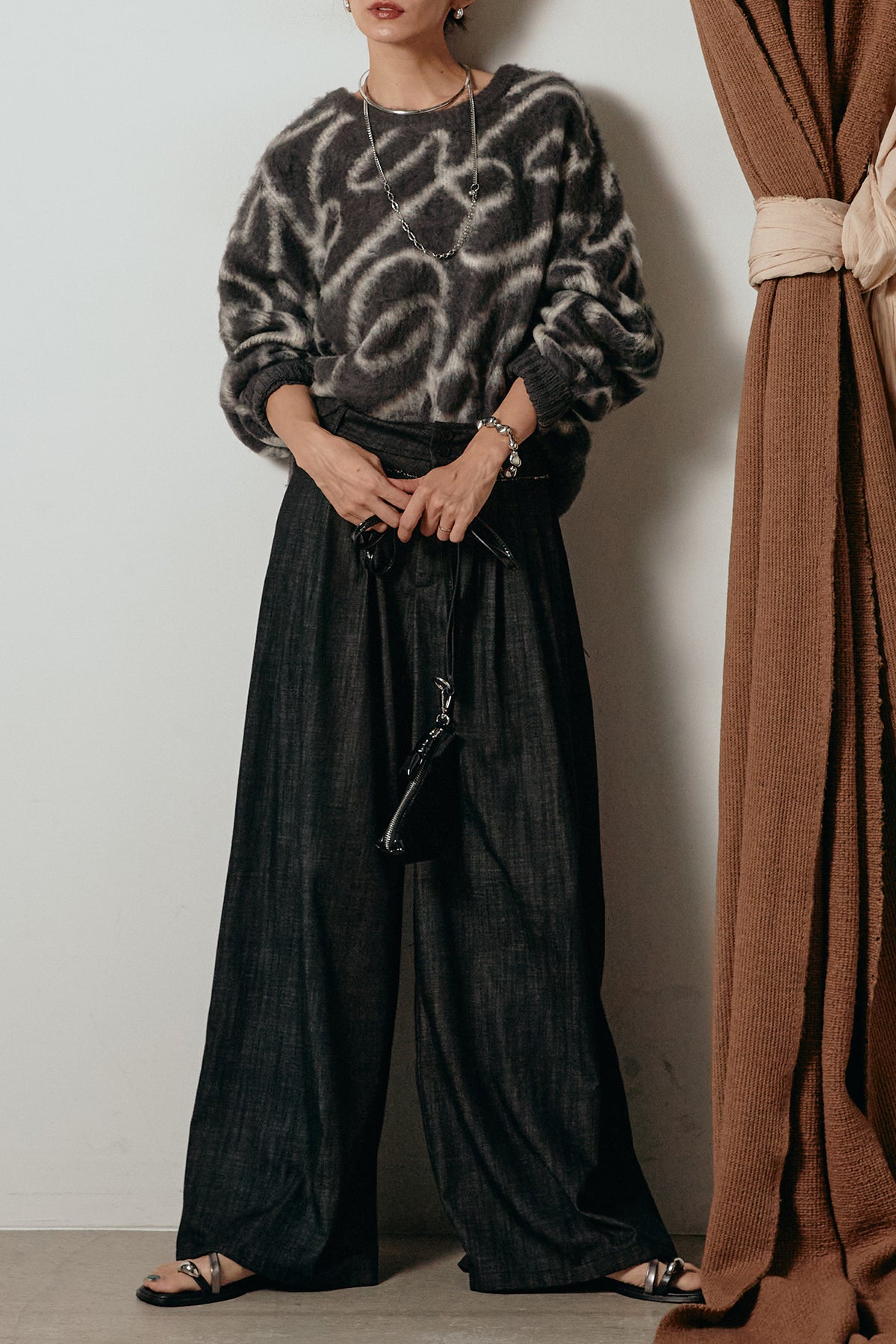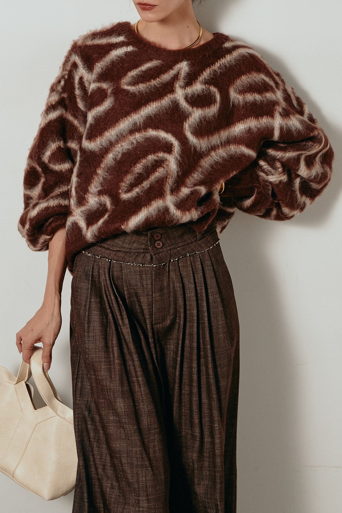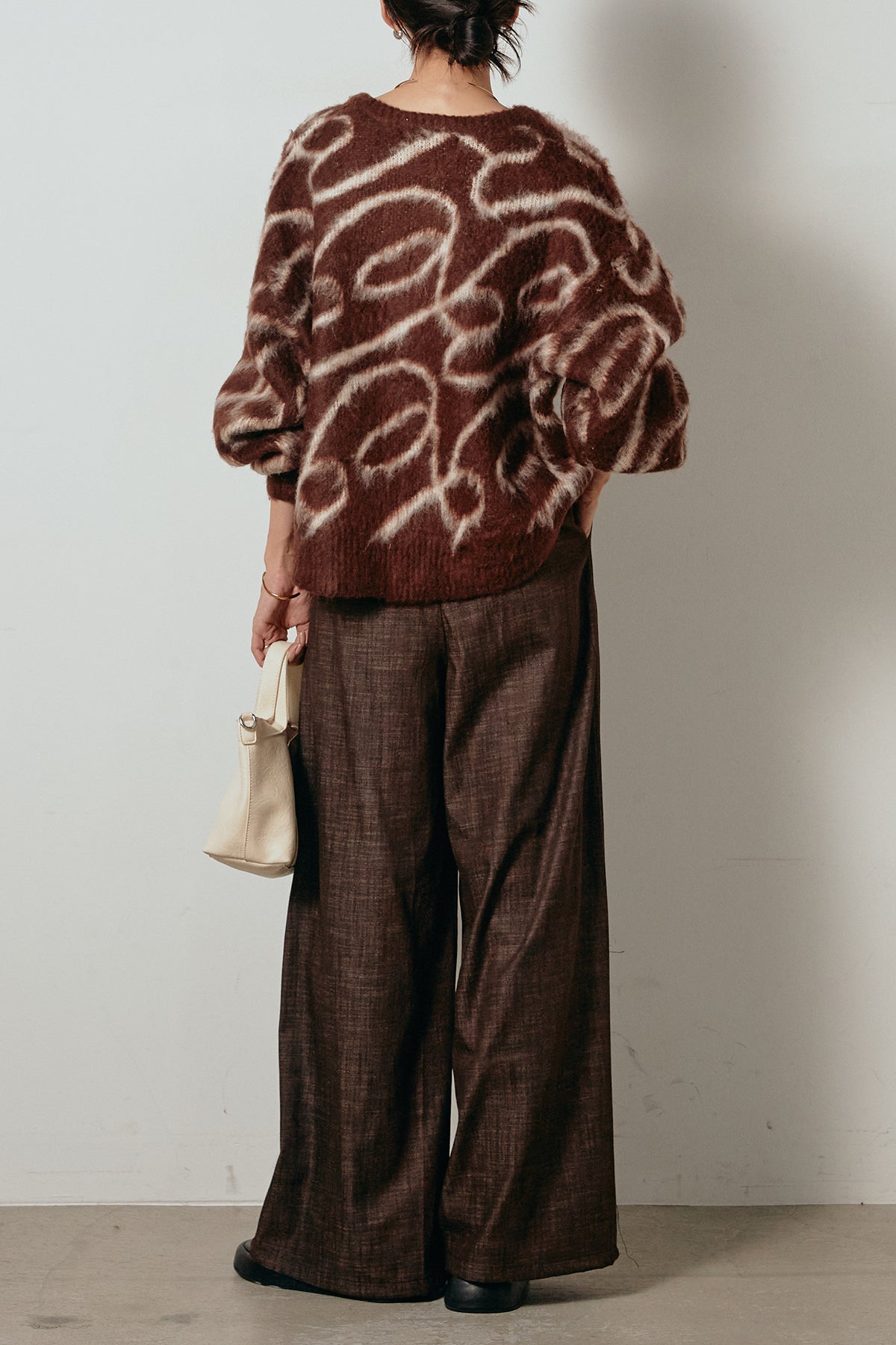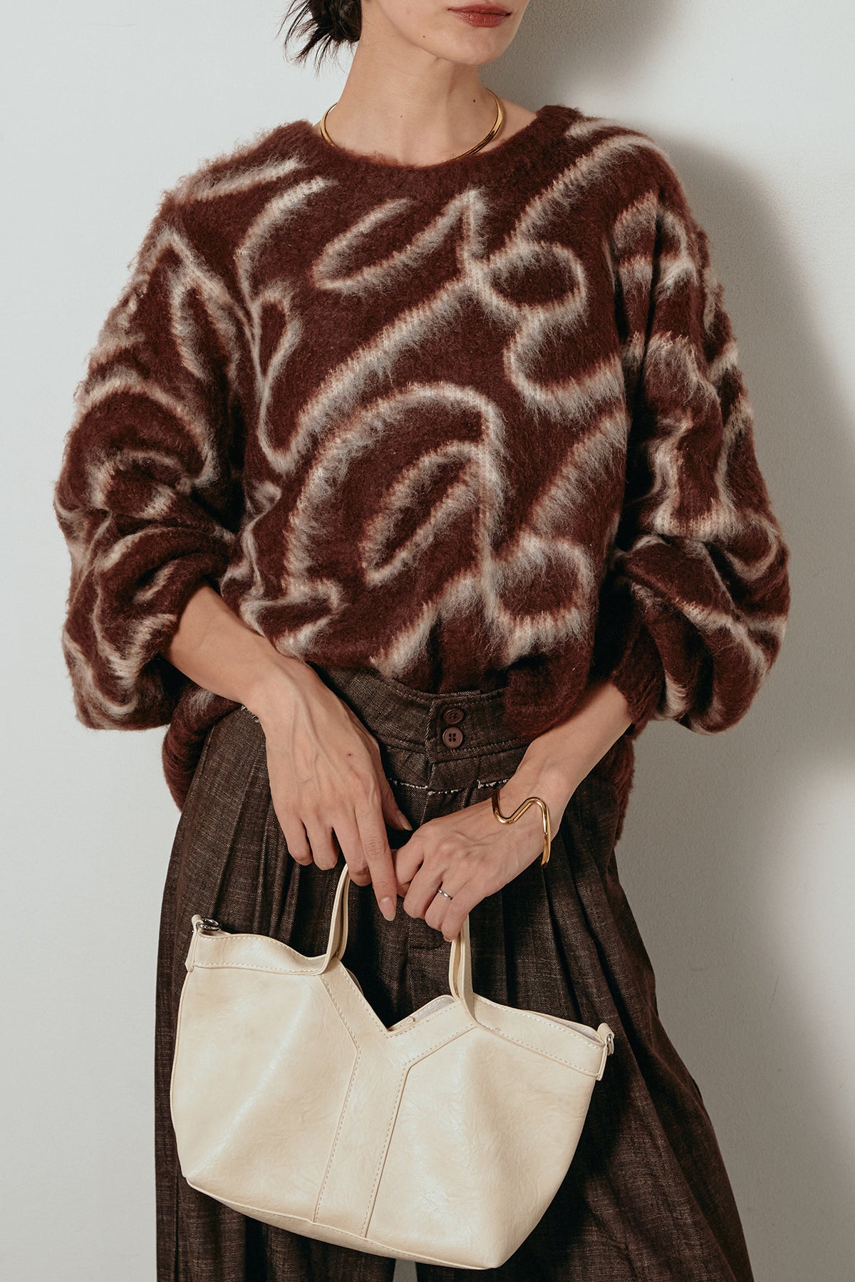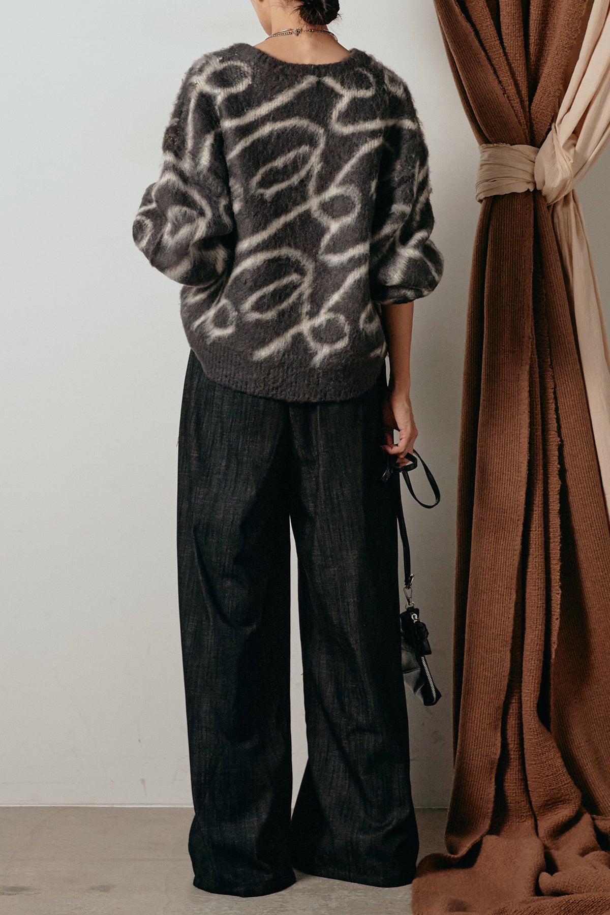柔らかな毛足のあるニットに、印象的なライン柄を施したプルオーバー。抽象的なニュアンスデザインが存在感を放ち、シンプルながらもモードな印象を演出します。ゆったりとしたシルエットでリラックス感があり、ボトムを選ばず着回し自在。デニムやスカートと合わせるだけで洗練されたスタイリングが完成します。