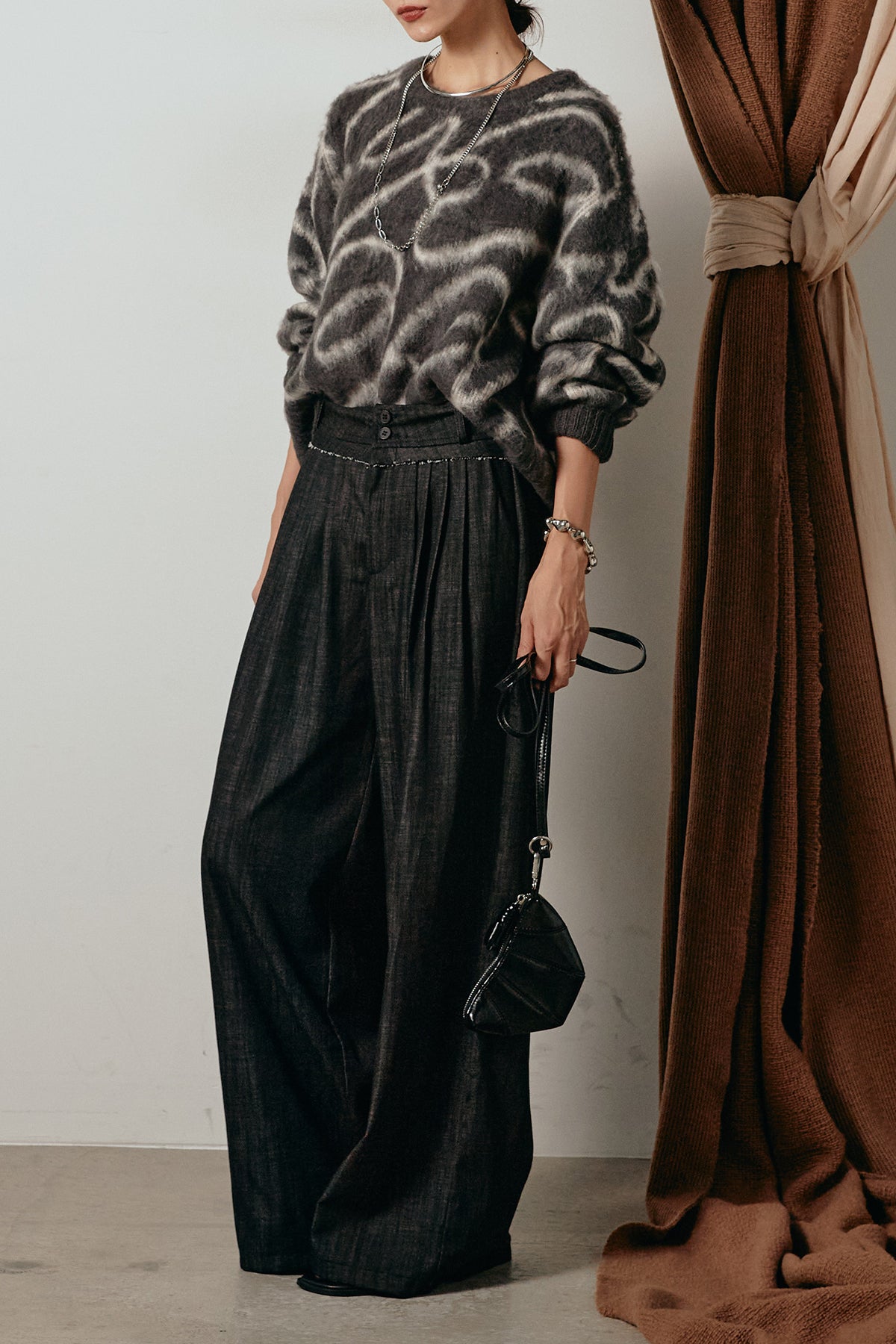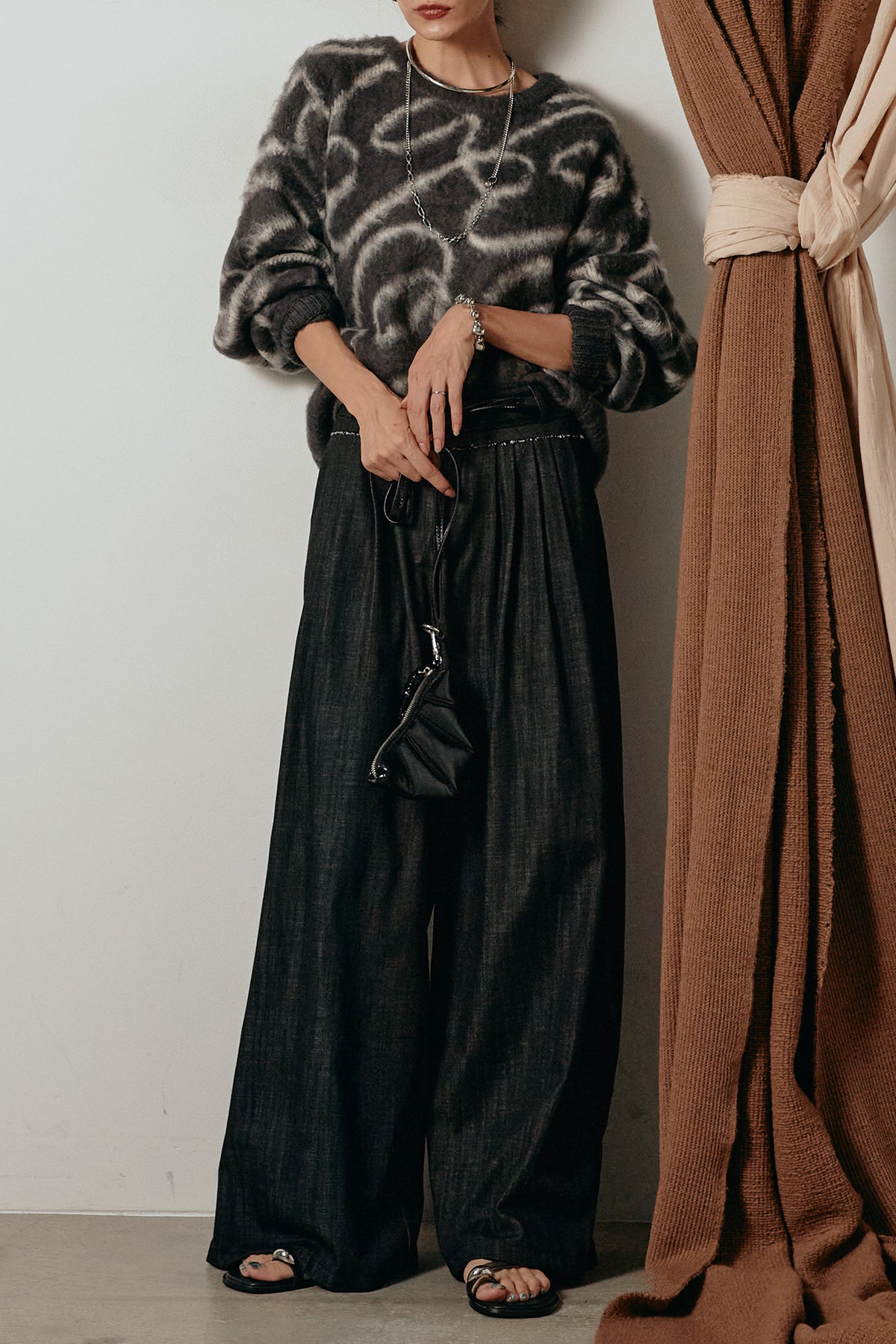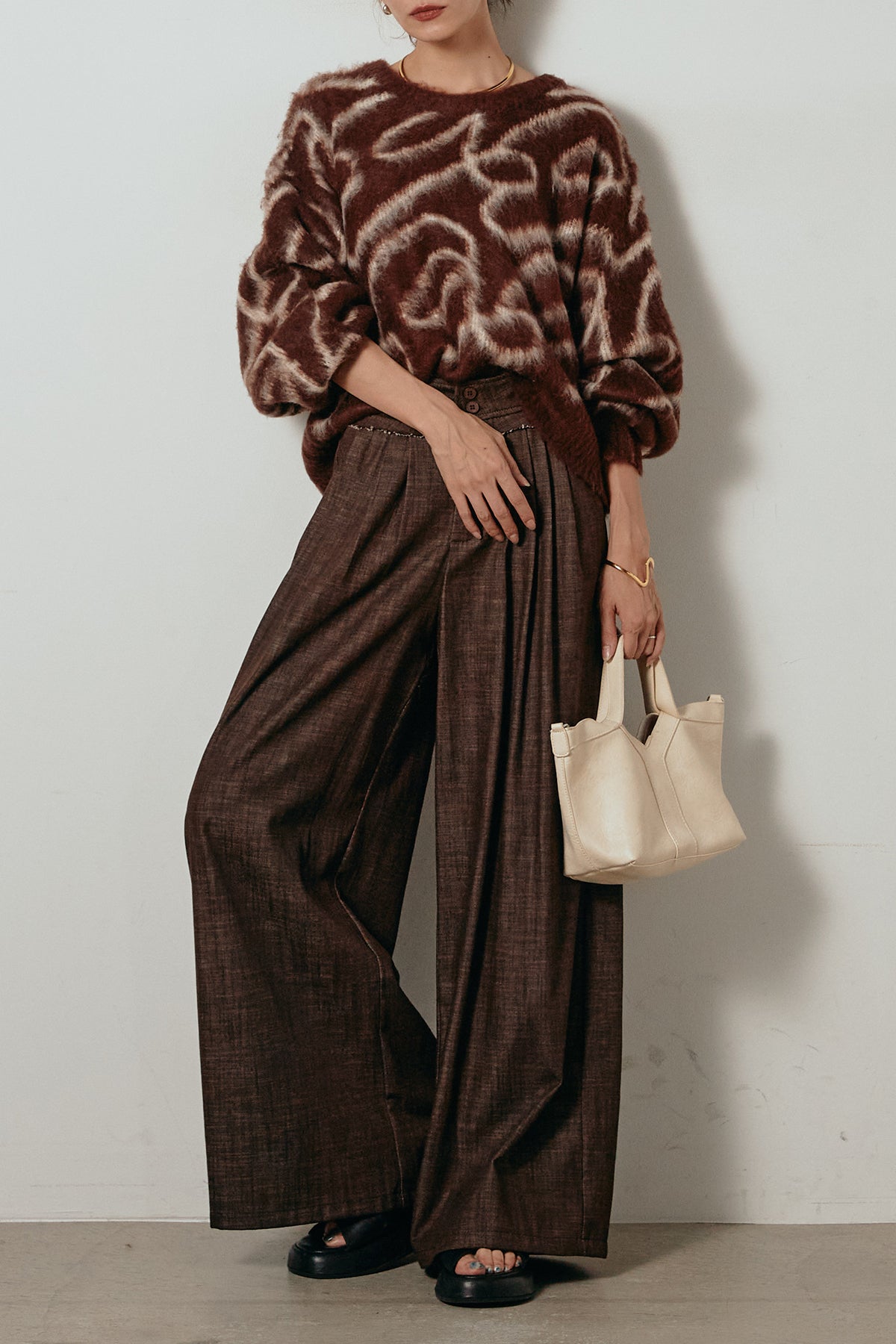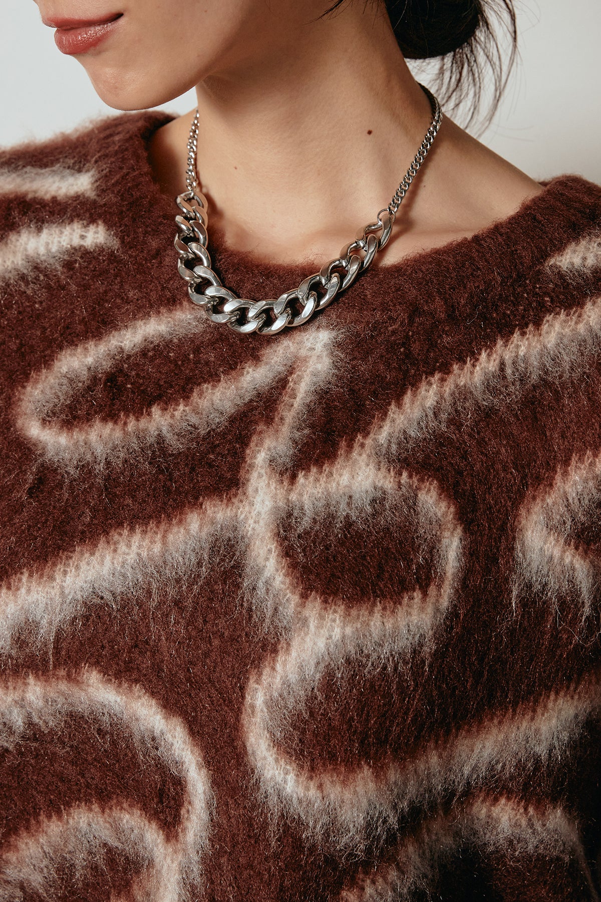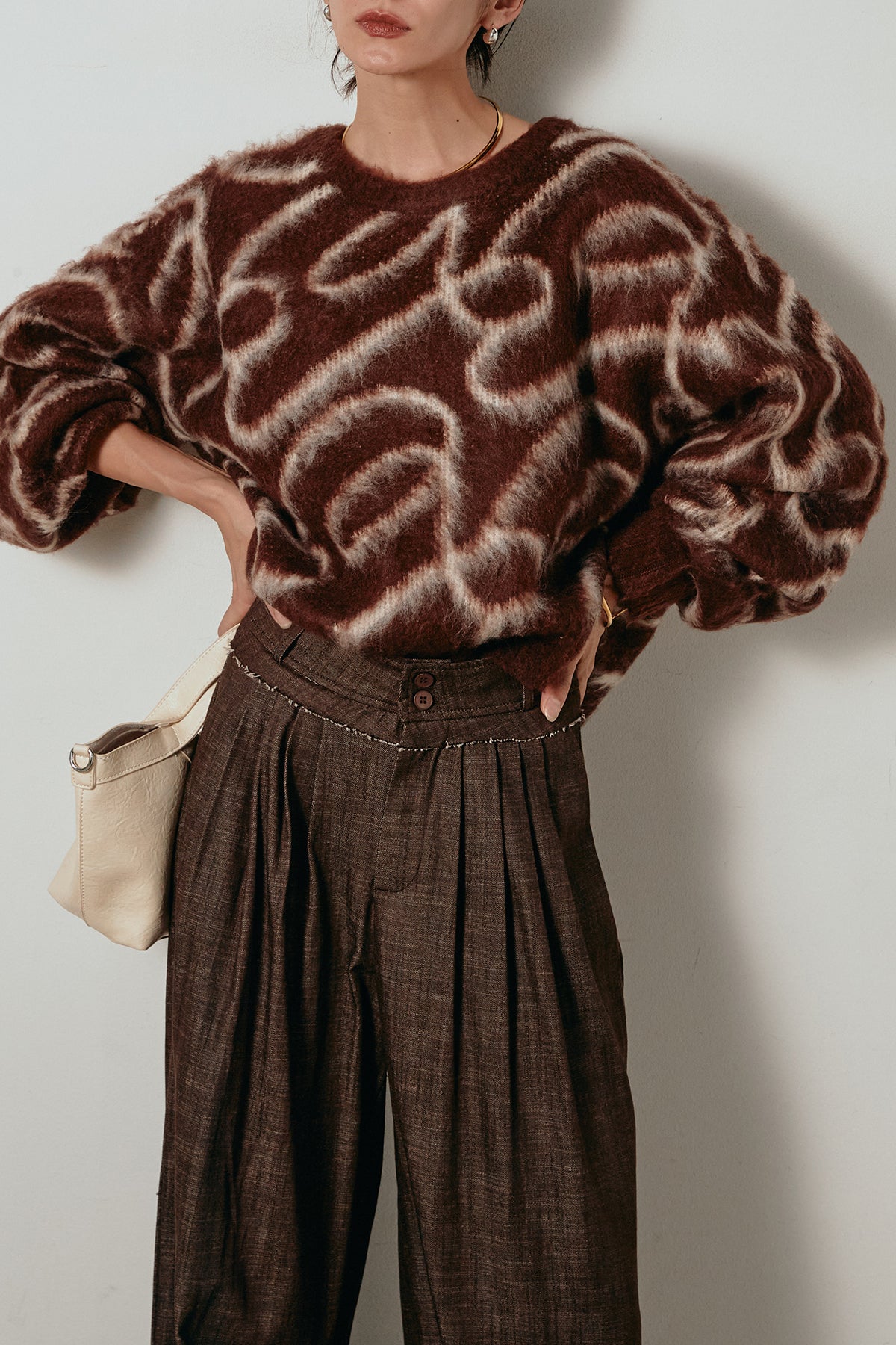柔らかな毛足のあるニットに、印象的なライン柄を施したプルオーバー。抽象的なニュアンスデザインが存在感を放ち、シンプルながらもモードな印象を演出します。ゆったりとしたシルエットでリラックス感があり、ボトムを選ばず着回し自在。デニムやスカートと合わせるだけで洗練されたスタイリングが完成します。