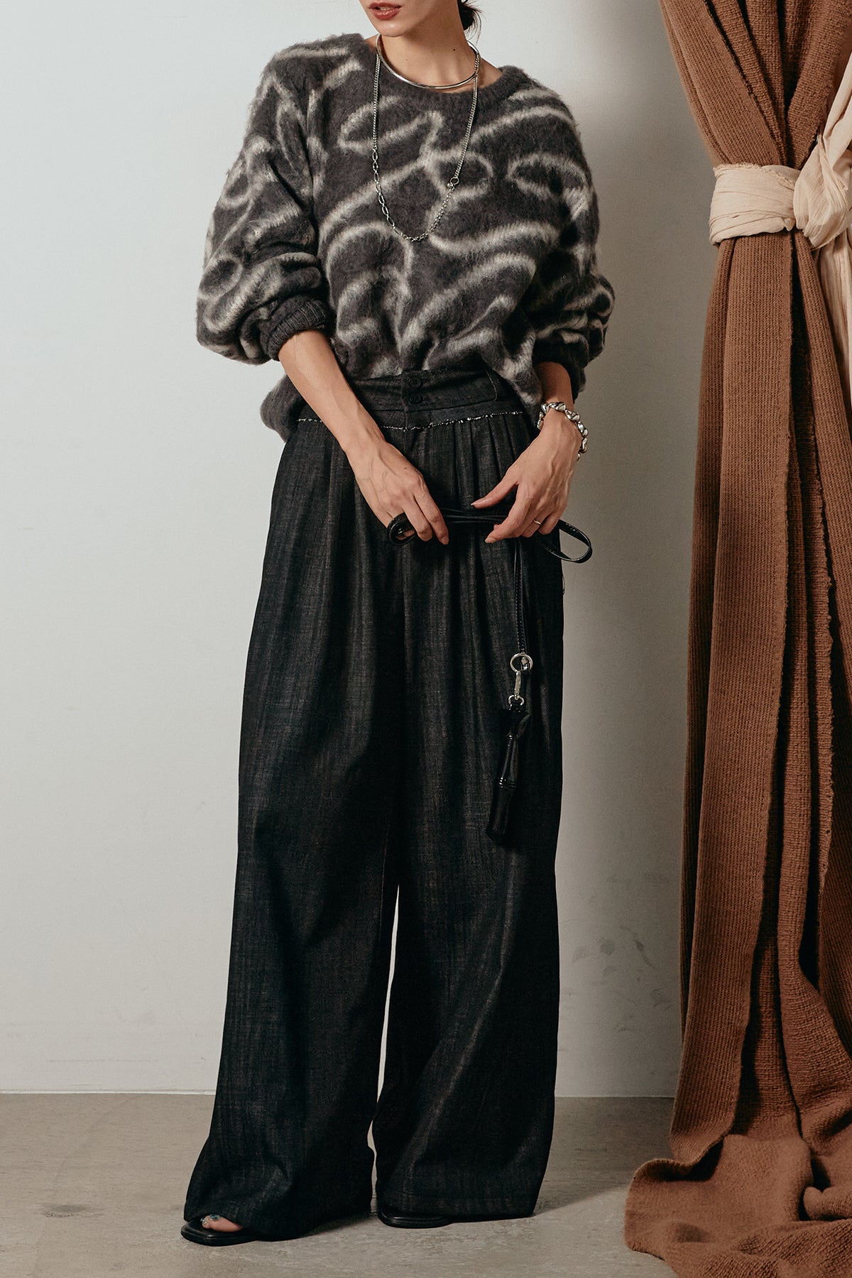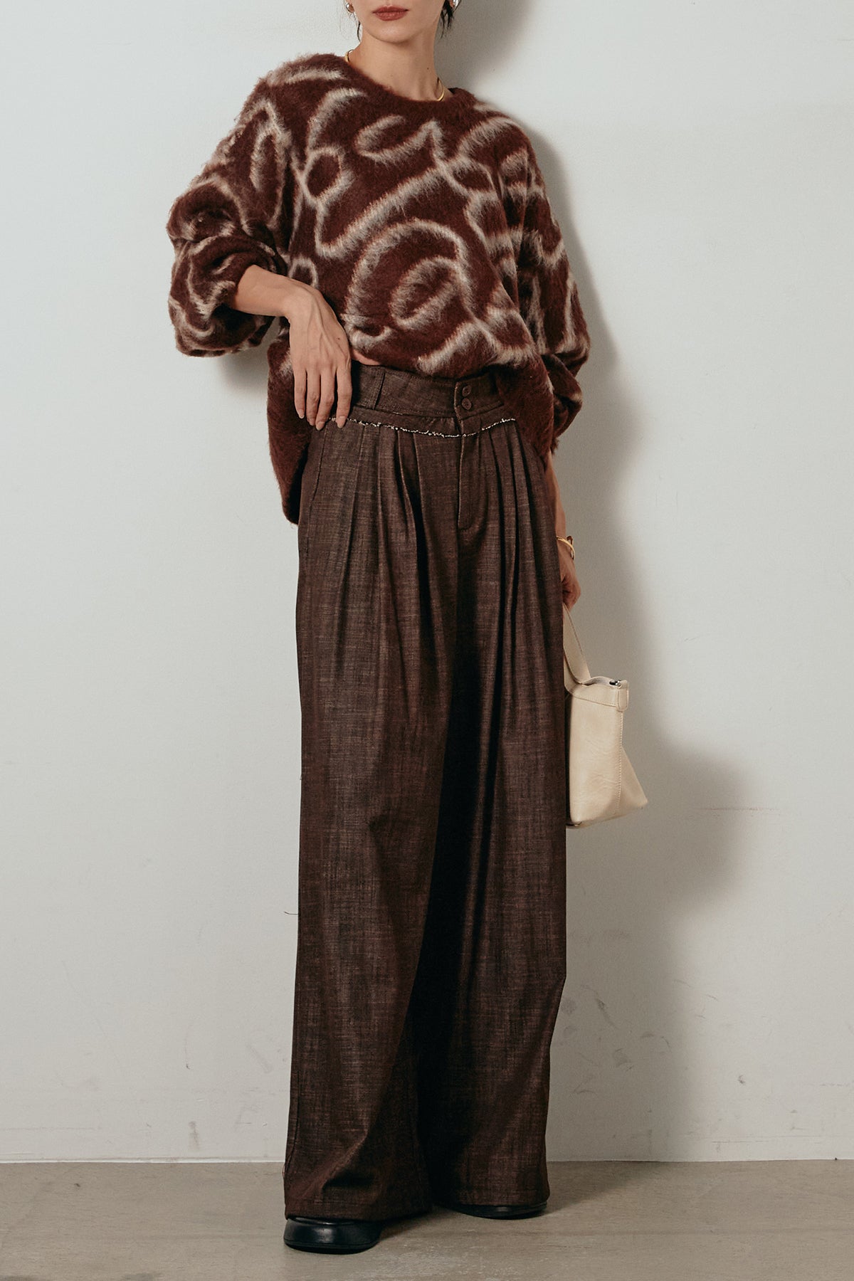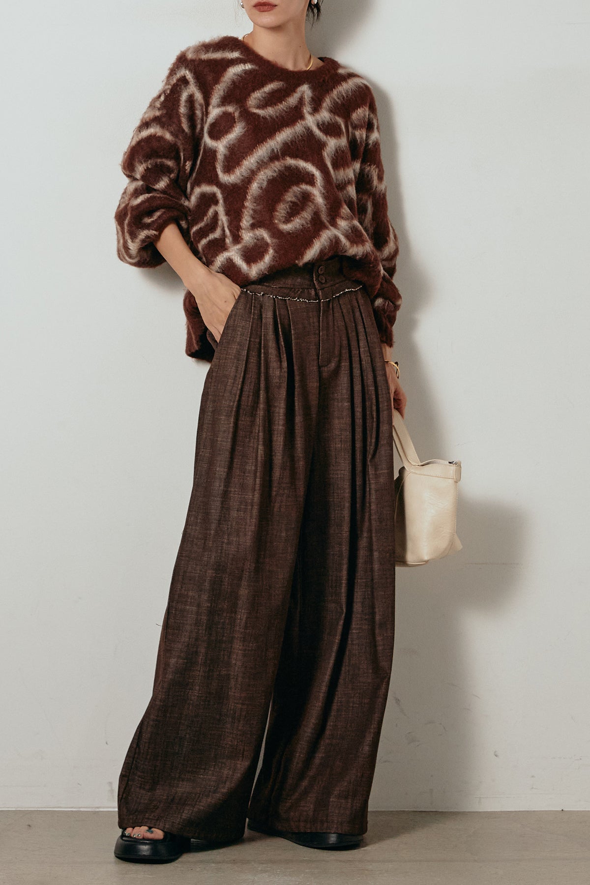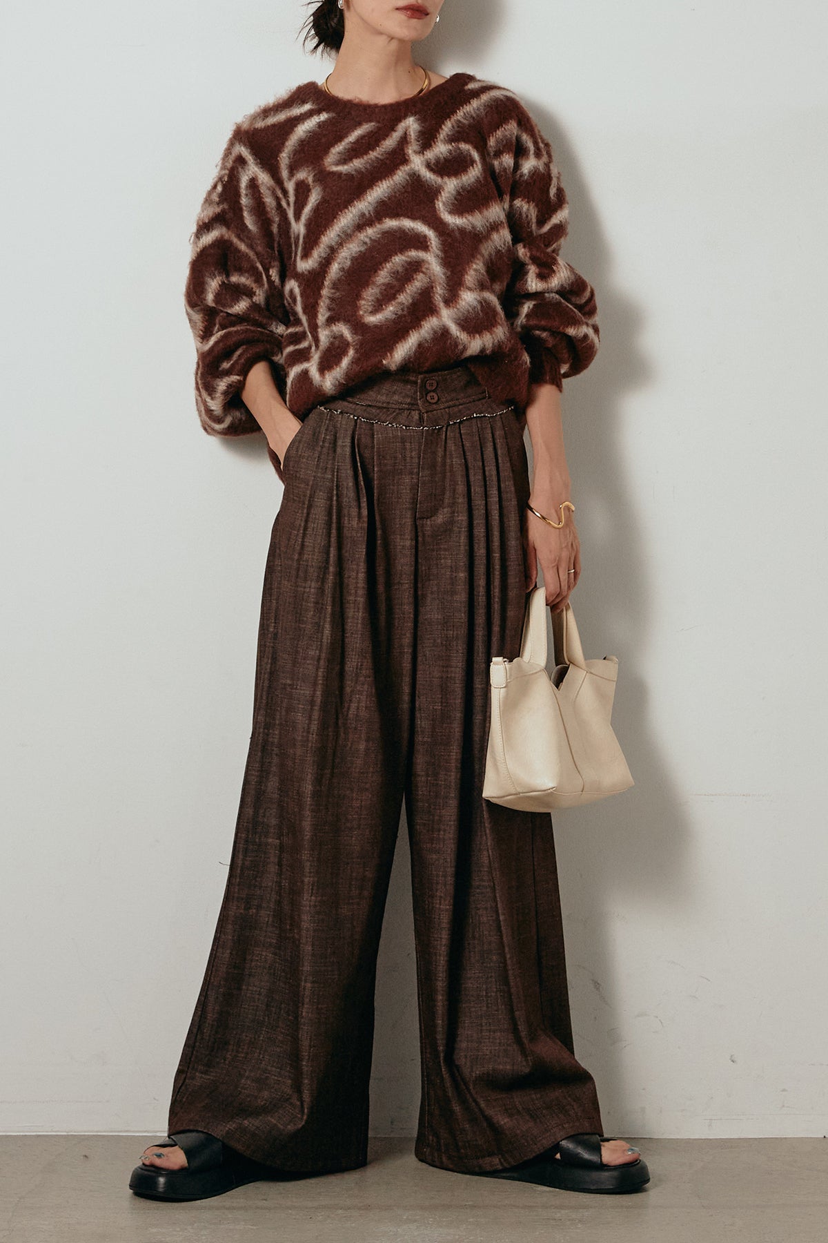 柔らかな毛足のあるニットに、印象的なライン柄を施したプルオーバー。抽象的なニュアンスデザインが存在感を放ち、シンプルながらもモードな印象を演出します。ゆったりとしたシルエットでリラックス感があり、ボトムを選ばず着回し自在。デニムやスカートと合わせるだけで洗練されたスタイリングが完成します。