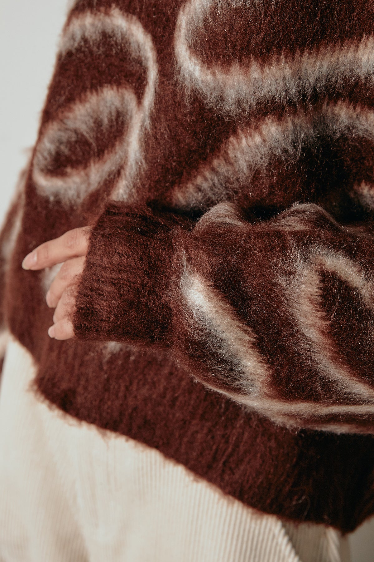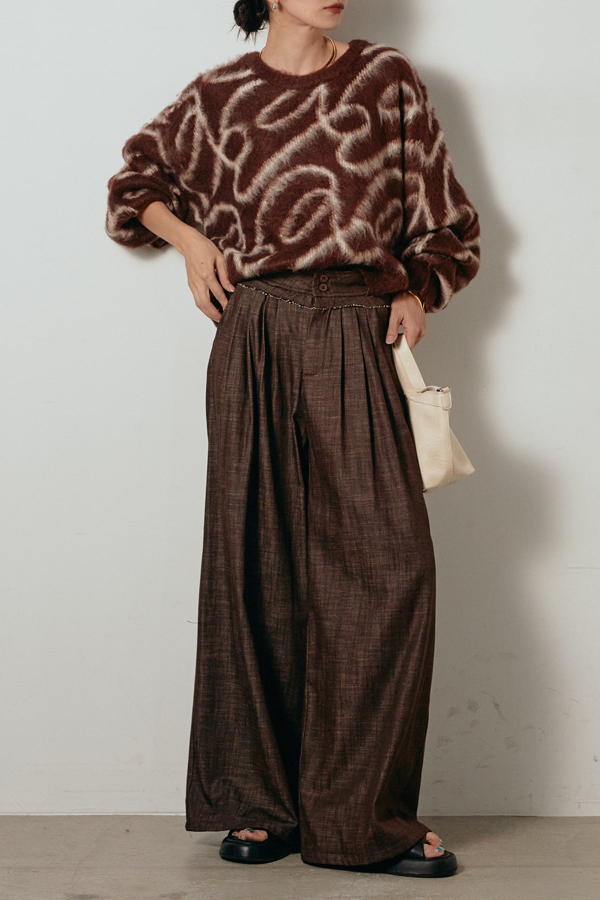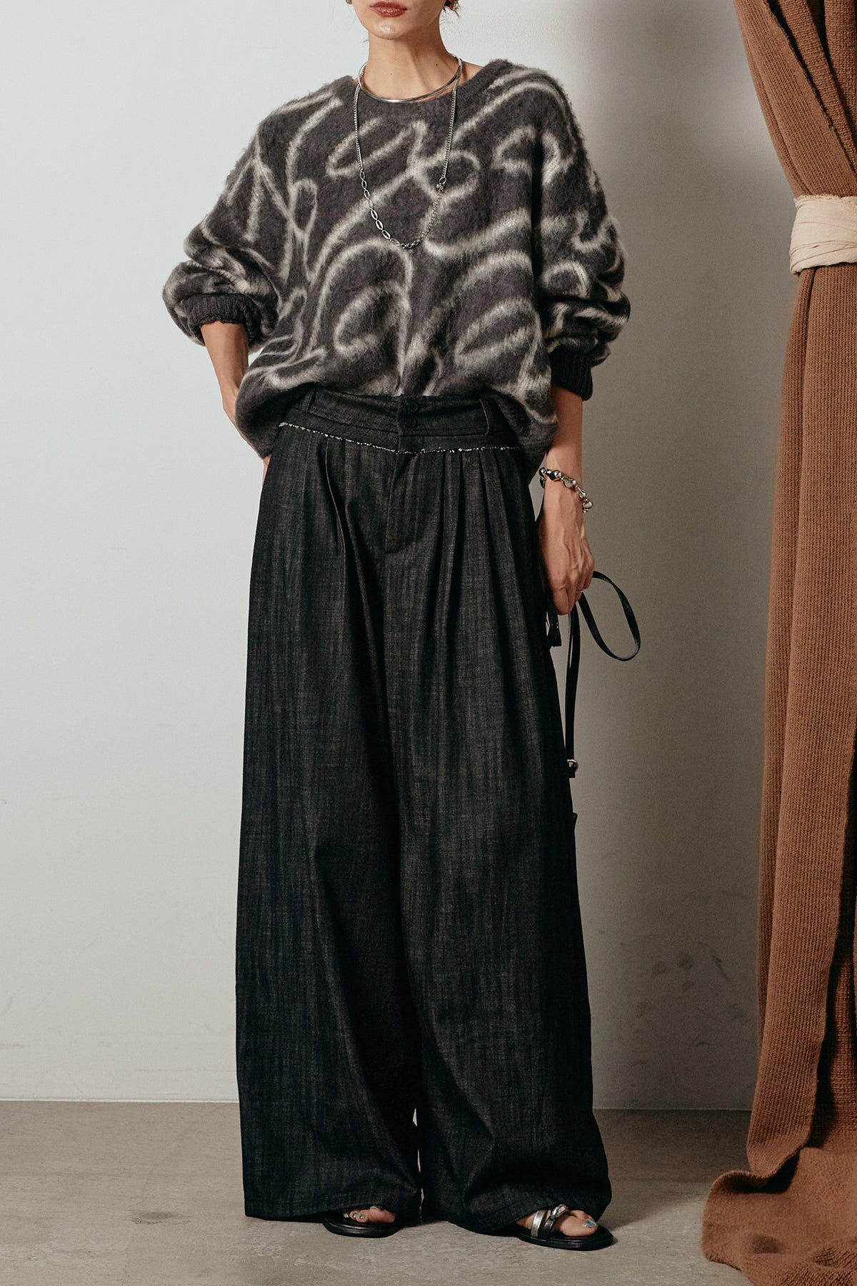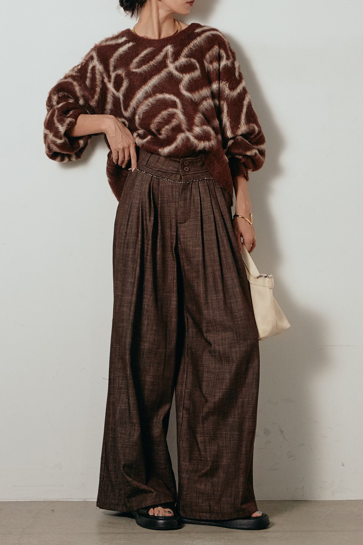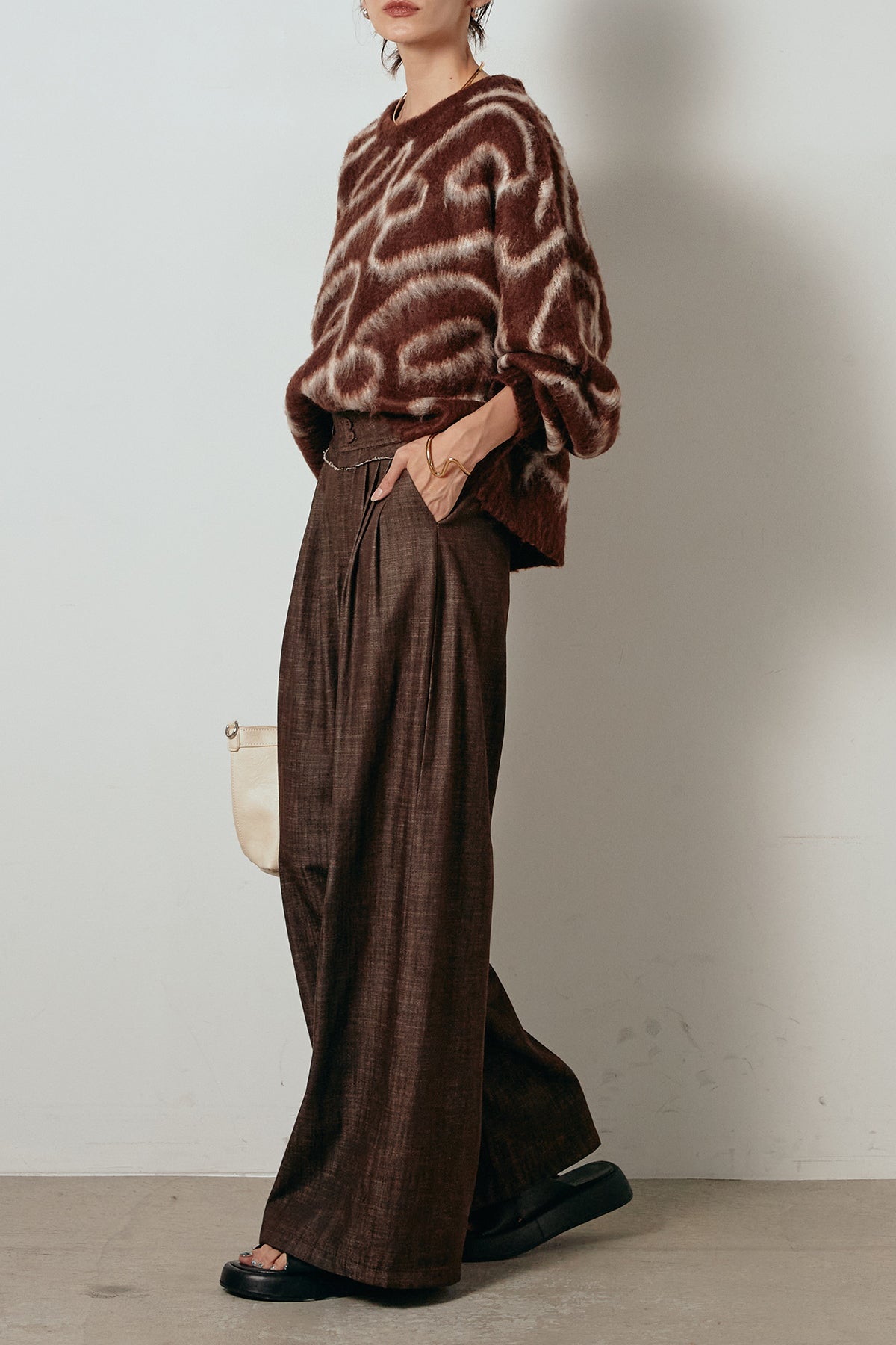 柔らかな毛足のあるニットに、印象的なライン柄を施したプルオーバー。抽象的なニュアンスデザインが存在感を放ち、シンプルながらもモードな印象を演出します。ゆったりとしたシルエットでリラックス感があり、ボトムを選ばず着回し自在。デニムやスカートと合わせるだけで洗練されたスタイリングが完成します。