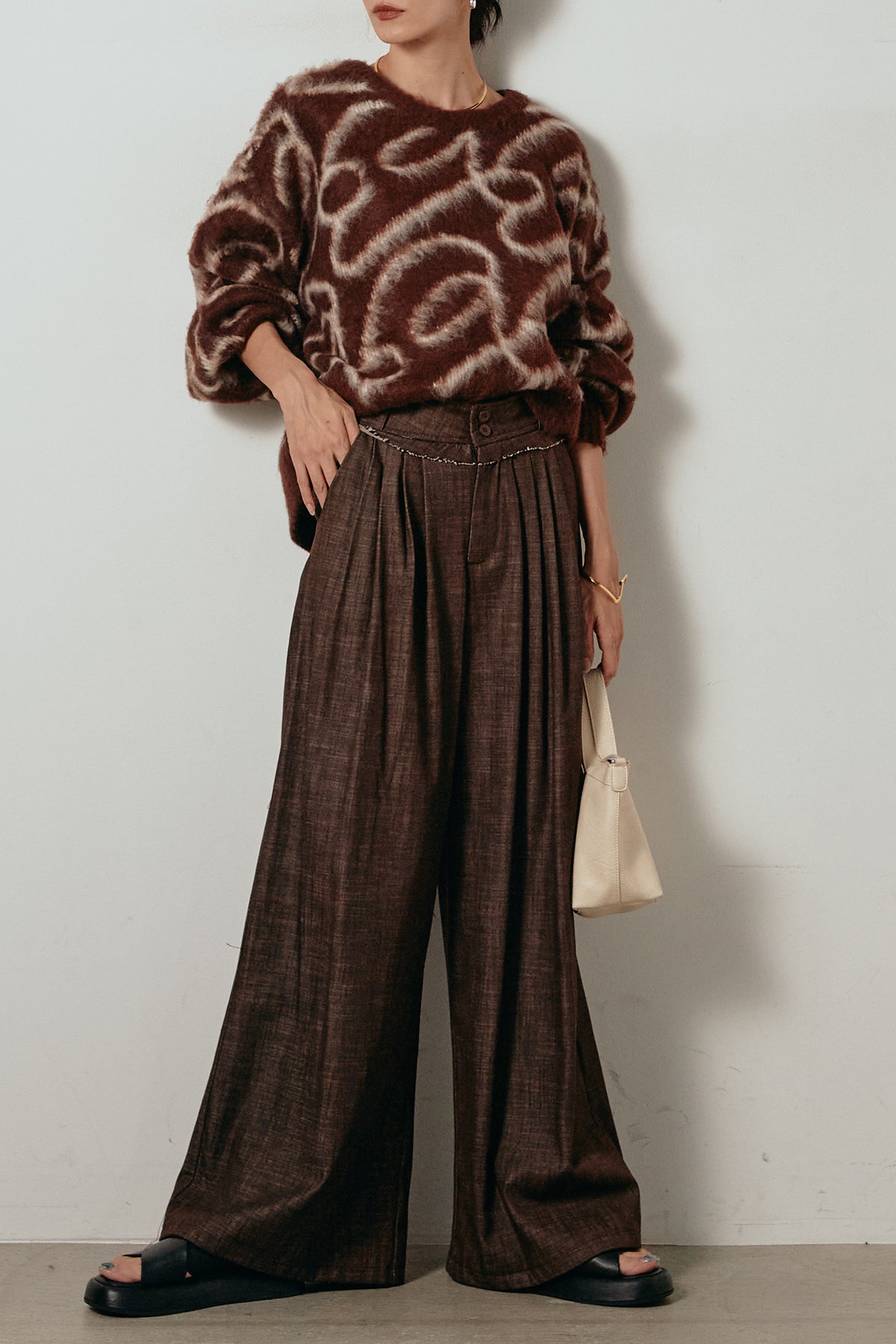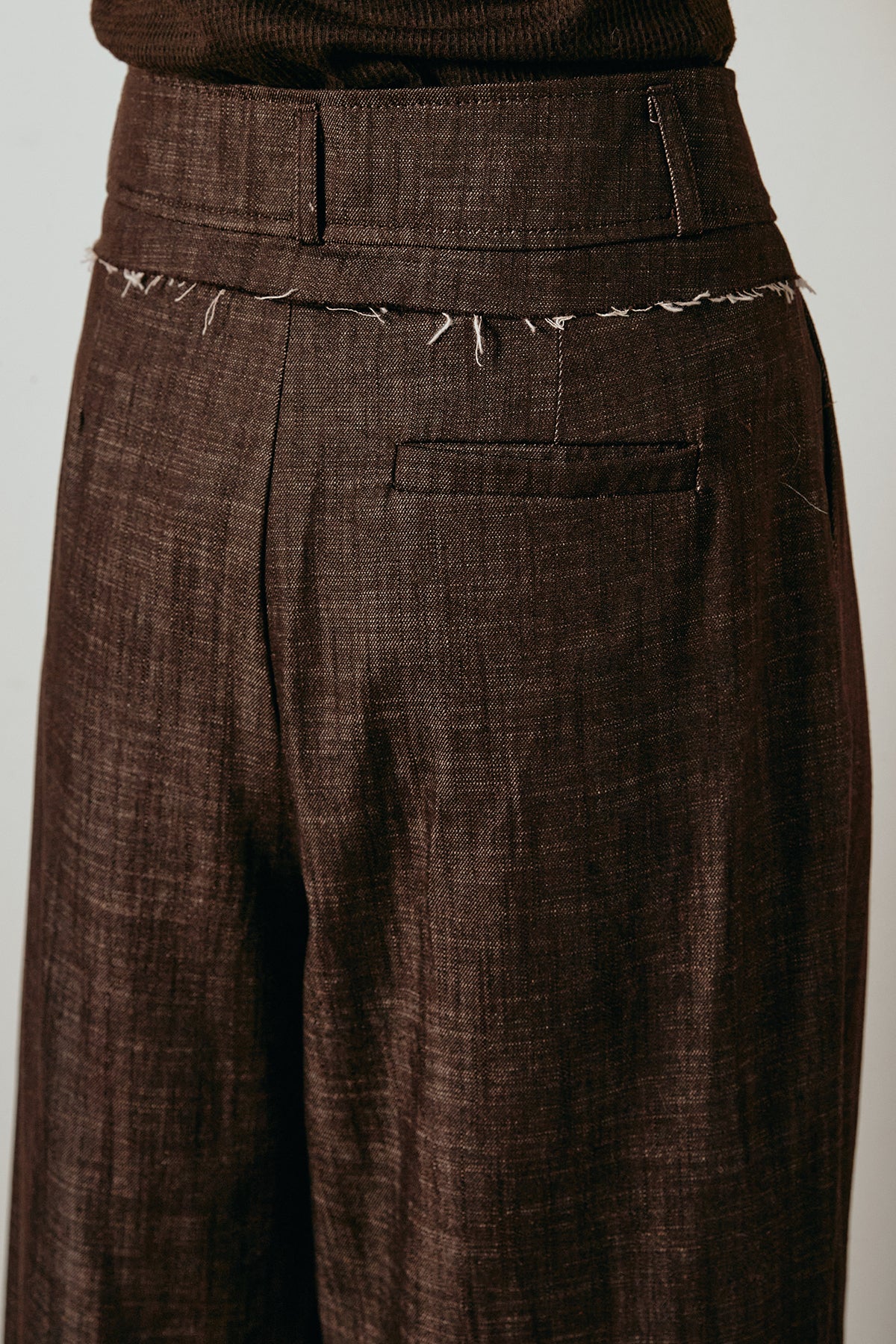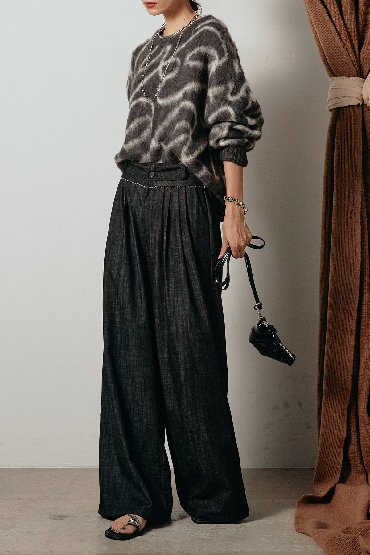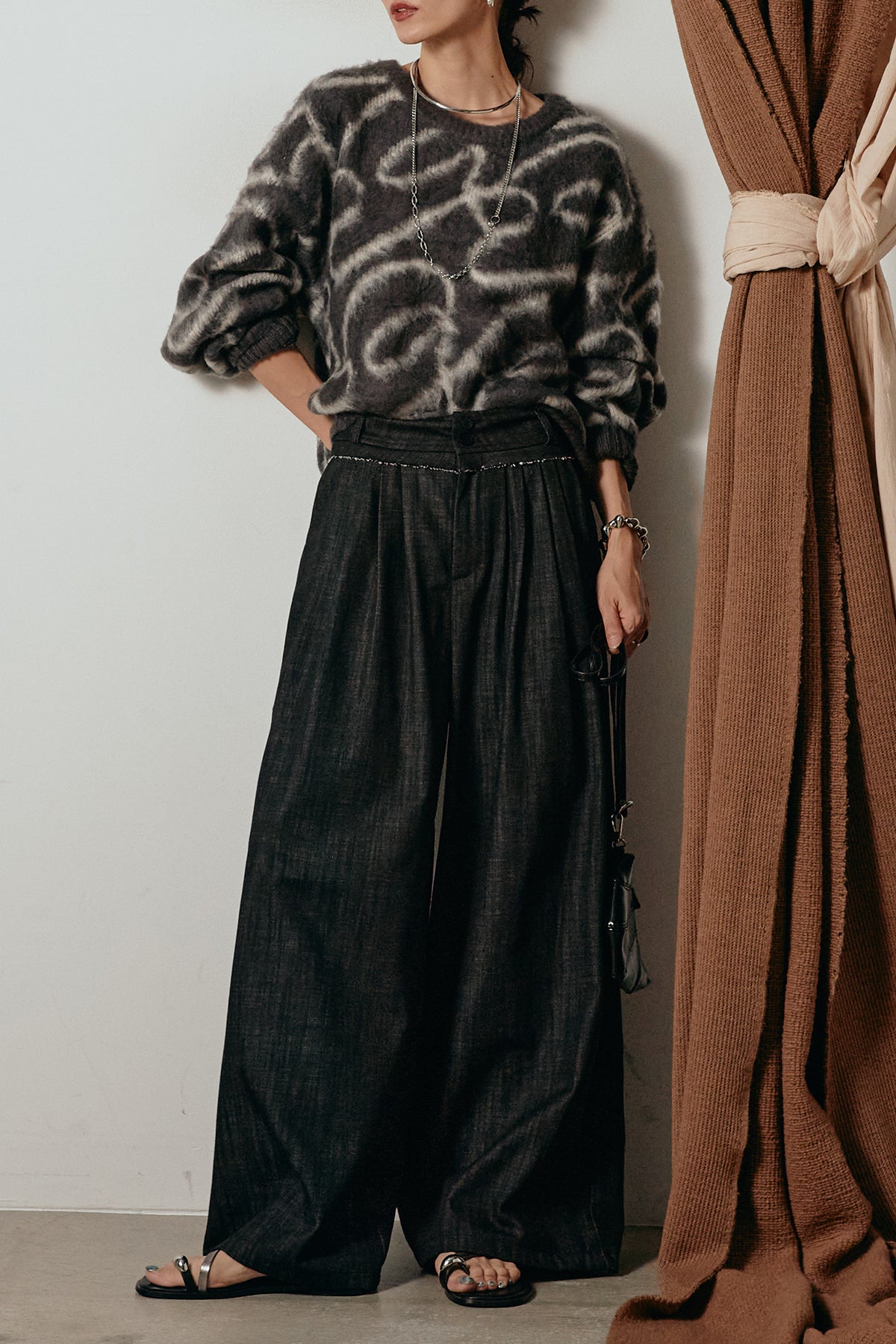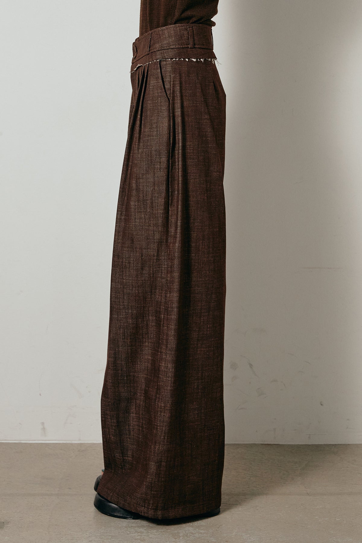 ラフな切りっぱなしデザインがアクセントになったタックワイドパンツ。ハイウエストと深めのタックで脚長効果がありながら、落ち感のある素材が動きに合わせて美しく揺れます。ウエスト周りのディテールがトップスインスタイルを引き立て、シンプルなニットやシャツと合わせるだけでモードな印象に。