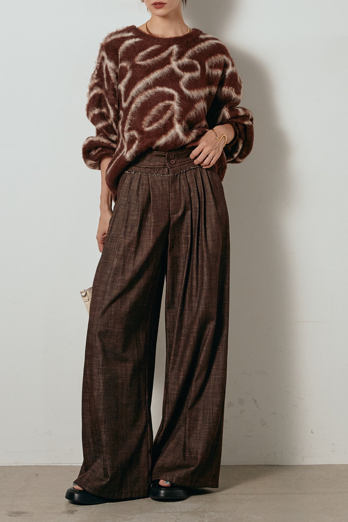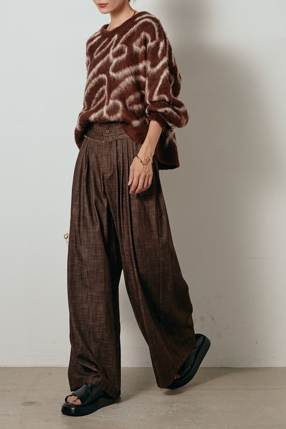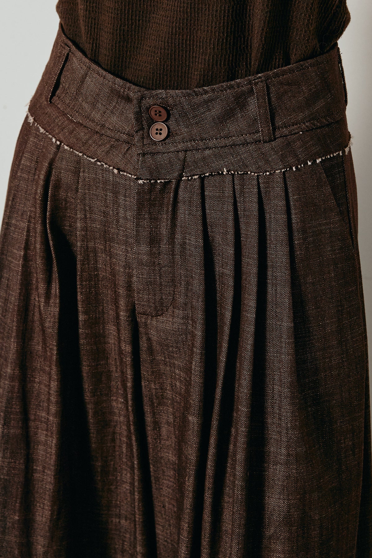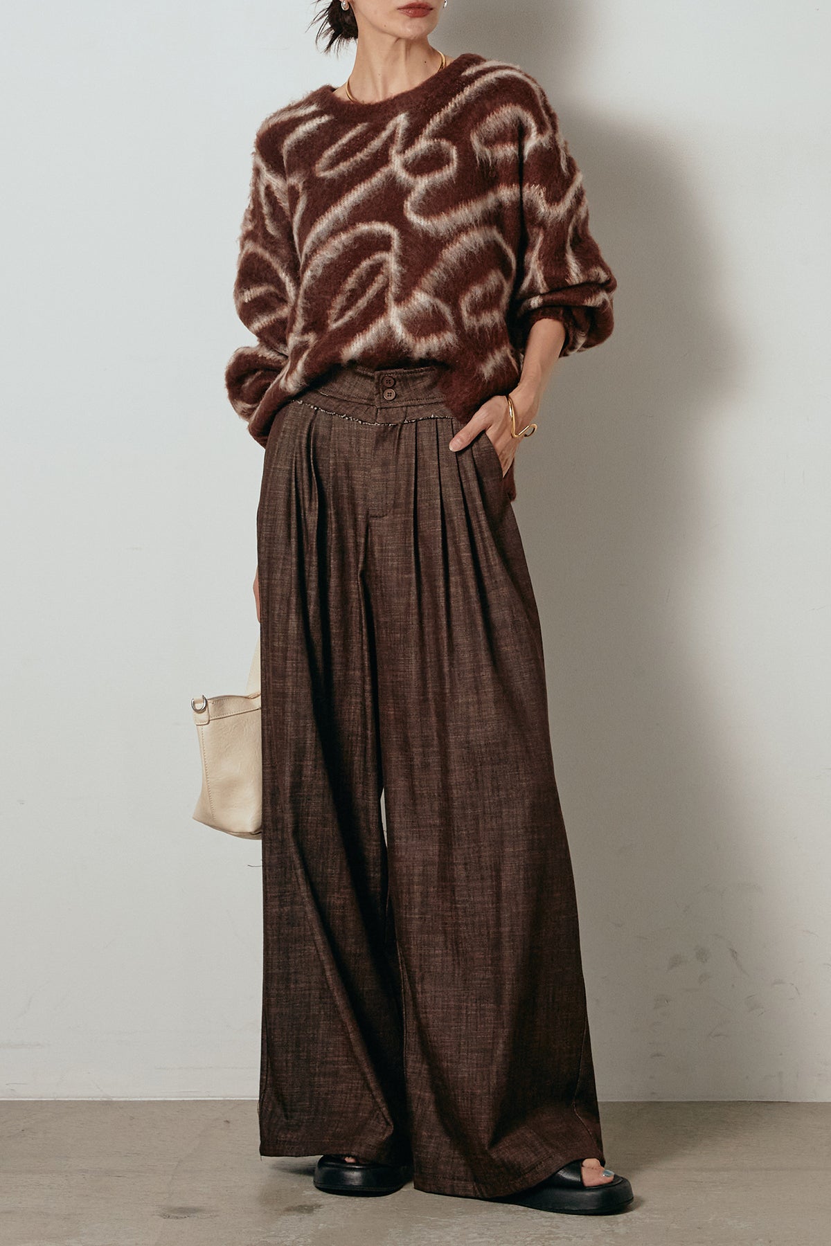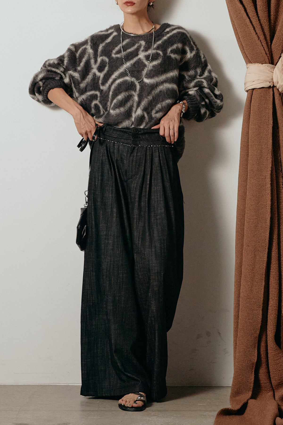 ラフな切りっぱなしデザインがアクセントになったタックワイドパンツ。ハイウエストと深めのタックで脚長効果がありながら、落ち感のある素材が動きに合わせて美しく揺れます。ウエスト周りのディテールがトップスインスタイルを引き立て、シンプルなニットやシャツと合わせるだけでモードな印象に。