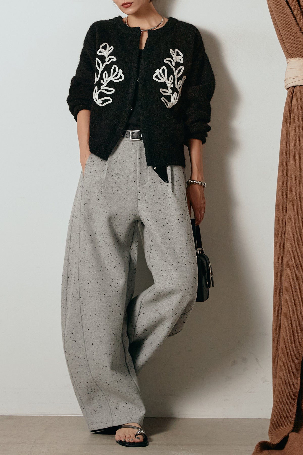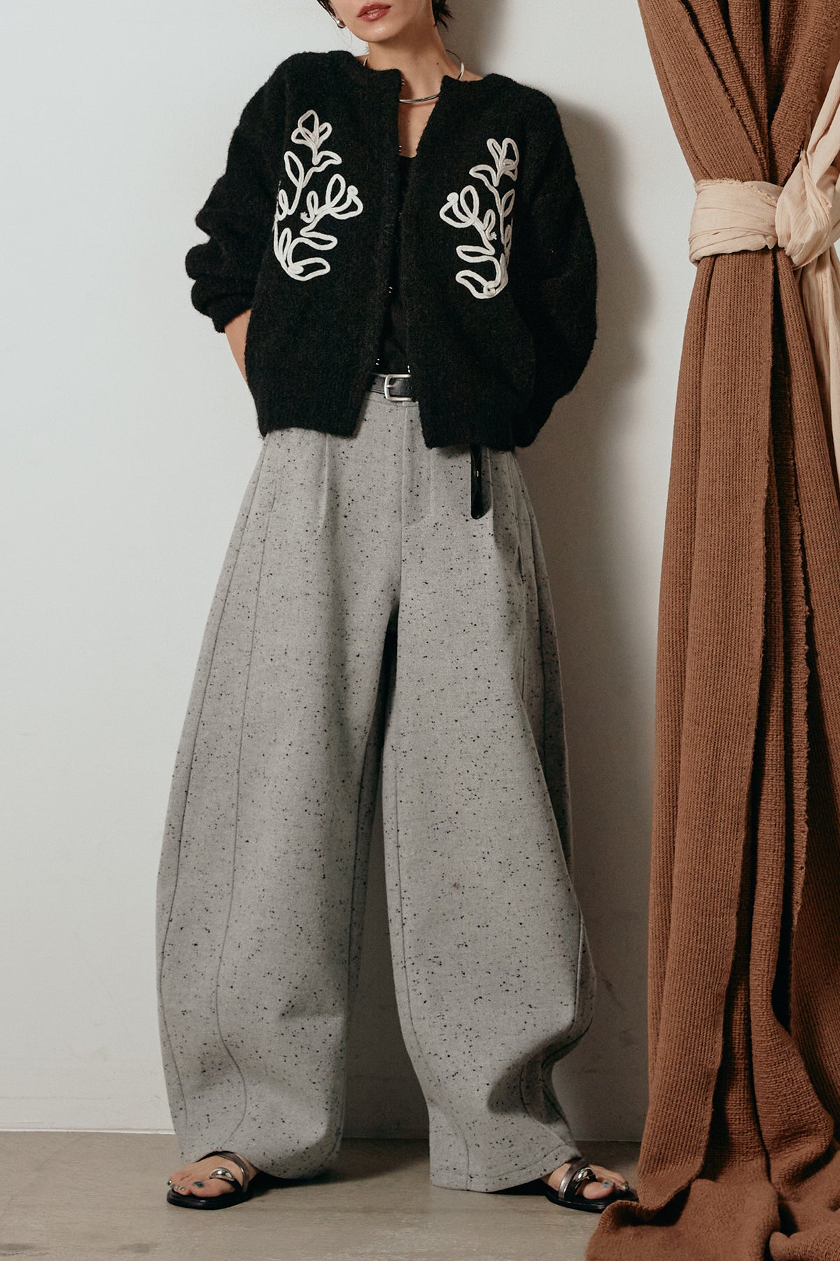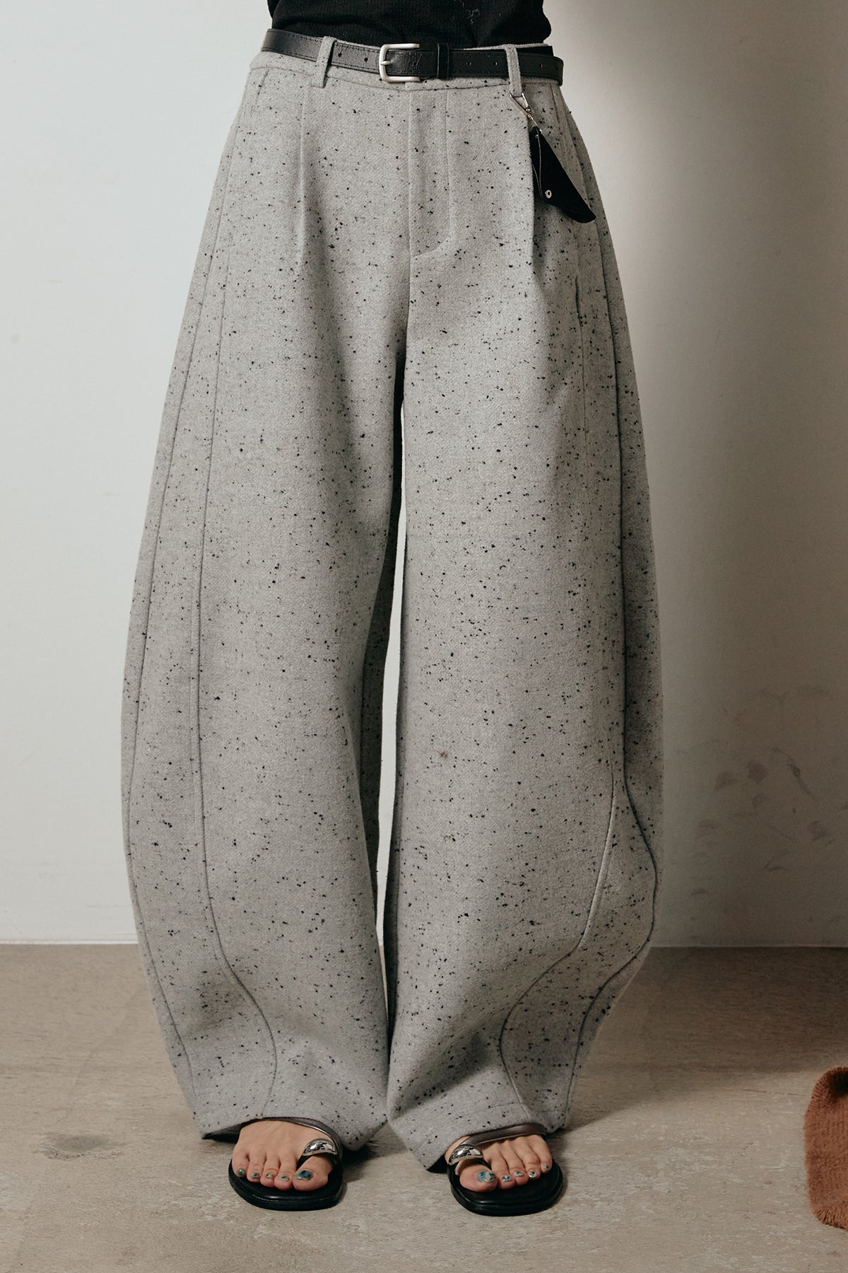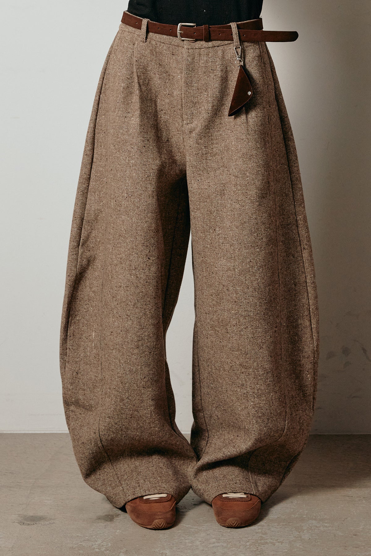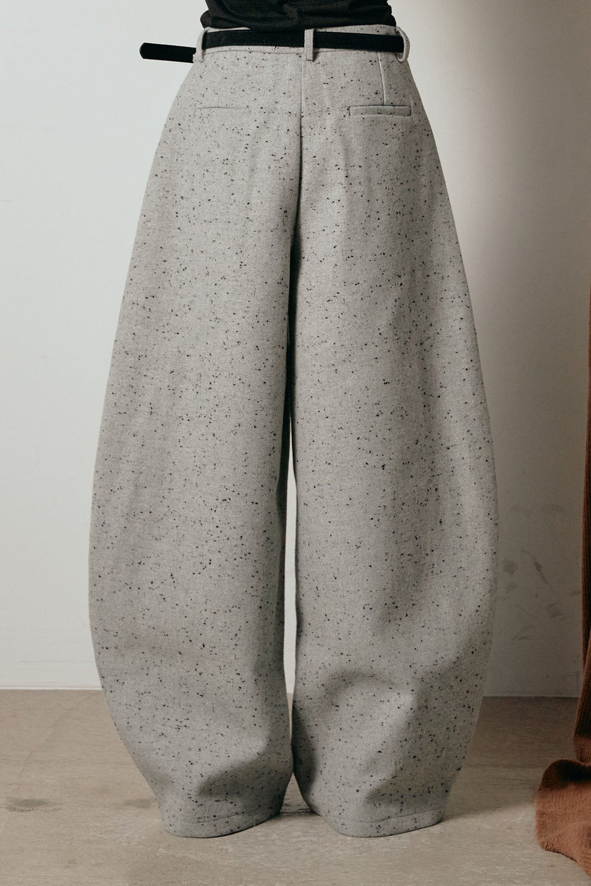 存在感のあるネップツイード素材で仕立てたカーブパンツ。立体的なシルエットが特徴で、足元に向かってゆるやかにカーブするラインが抜け感をプラス。付属のレザーベルトがウエストを引き締め、スタイリングに上品なアクセントを添えます。シンプルなトップスを合わせるだけで洒落感のある着こなしに仕上がる一本です。
