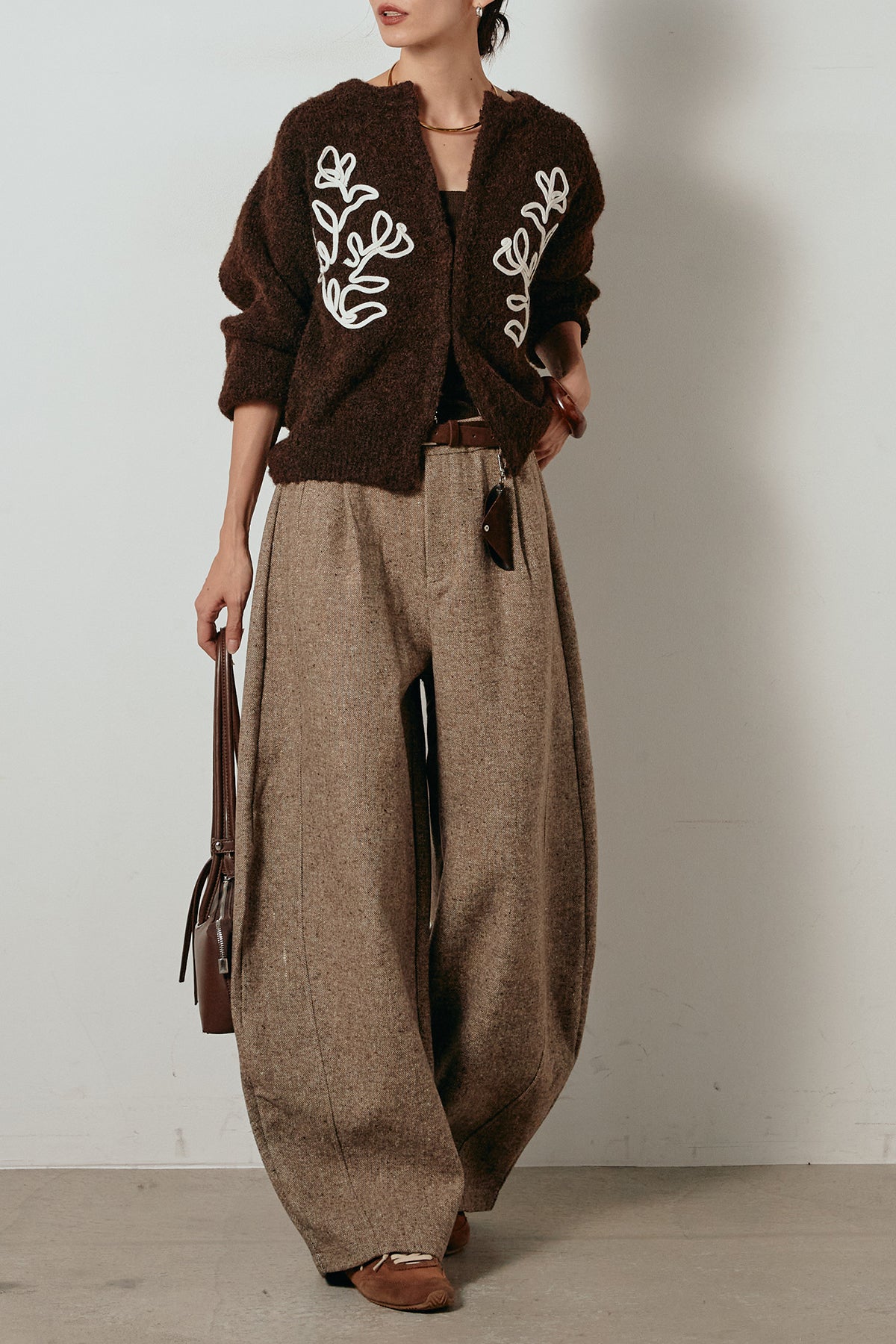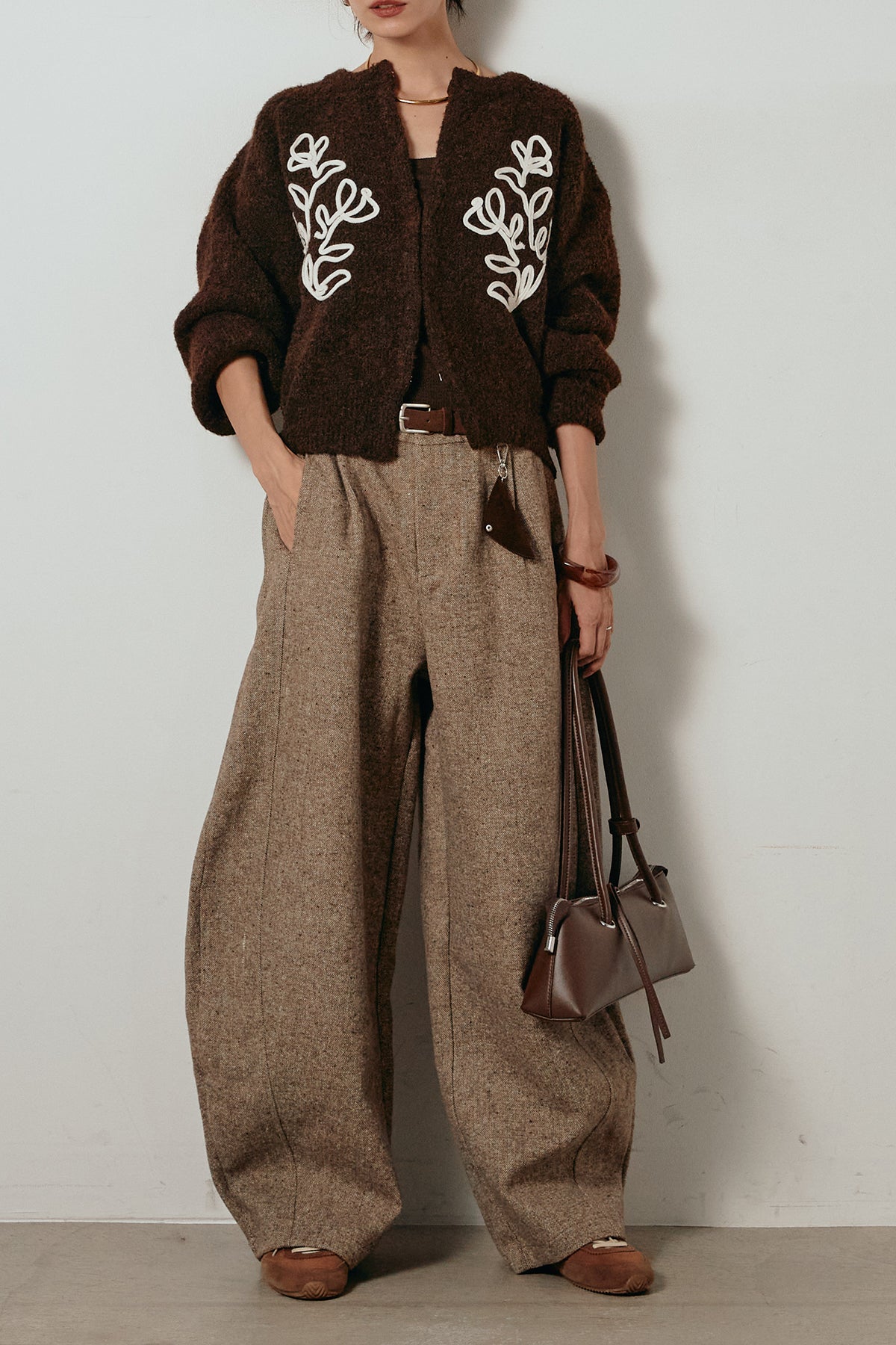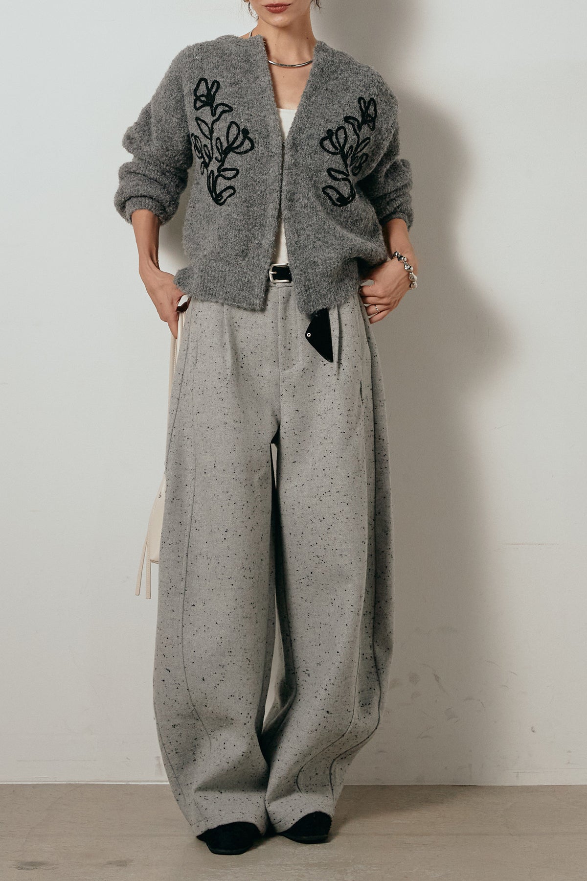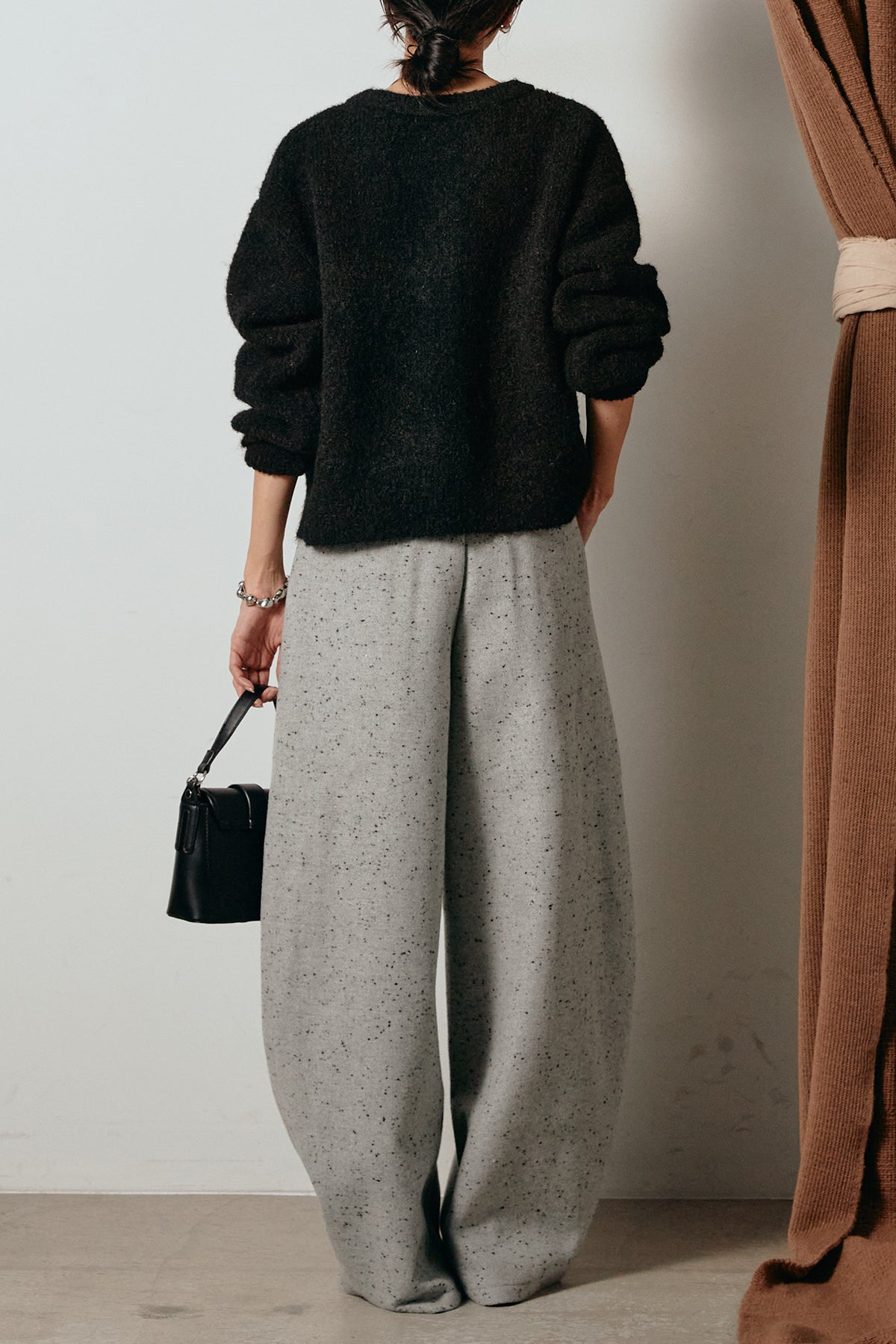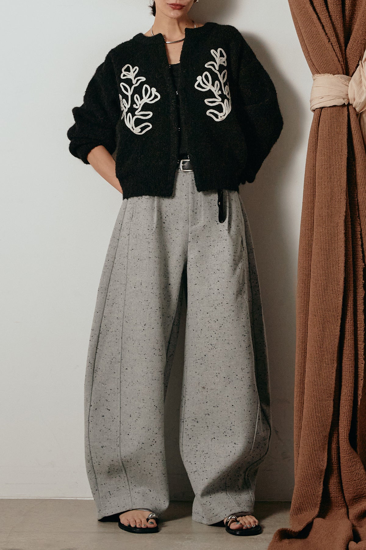 存在感のあるネップツイード素材で仕立てたカーブパンツ。立体的なシルエットが特徴で、足元に向かってゆるやかにカーブするラインが抜け感をプラス。付属のレザーベルトがウエストを引き締め、スタイリングに上品なアクセントを添えます。シンプルなトップスを合わせるだけで洒落感のある着こなしに仕上がる一本です。