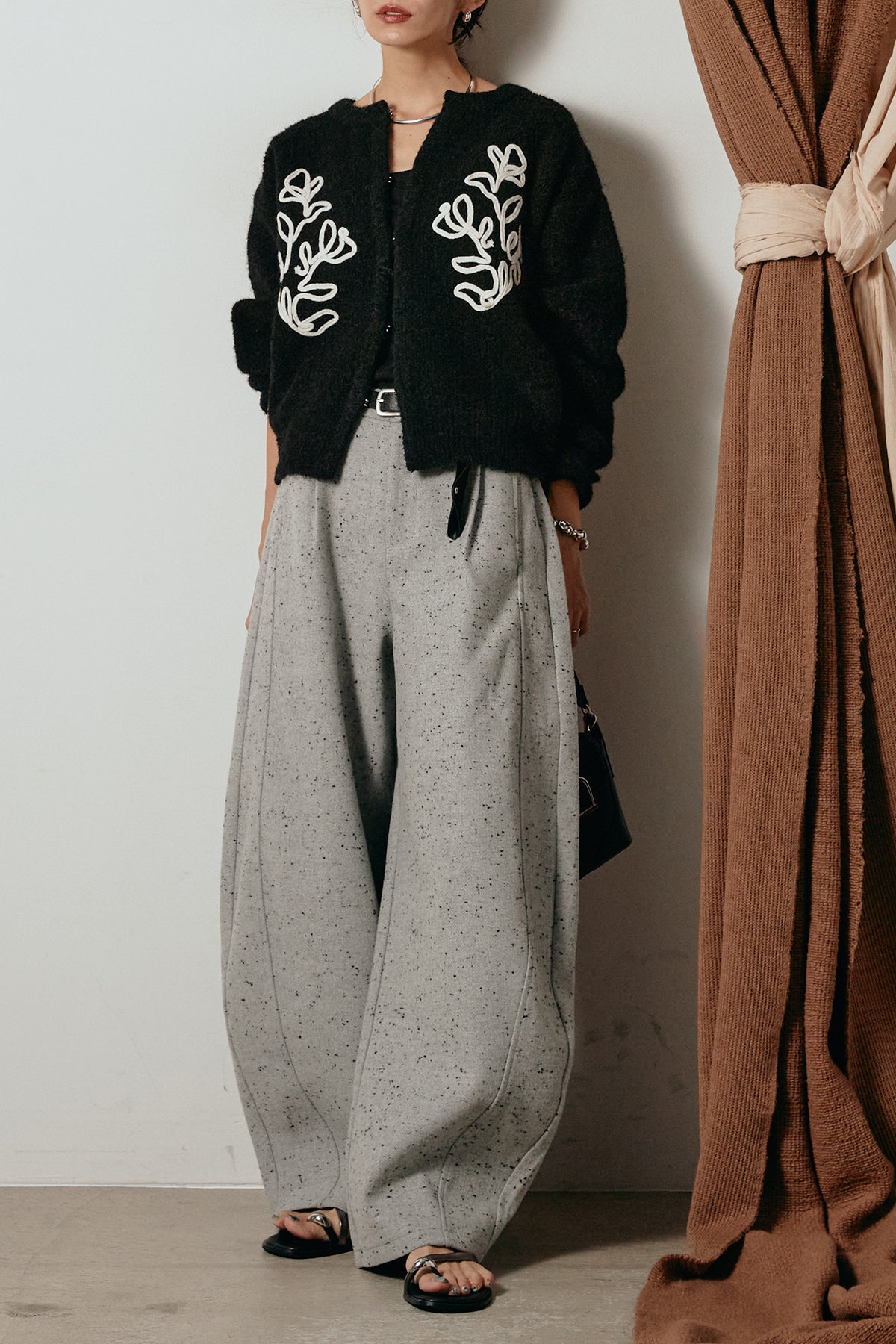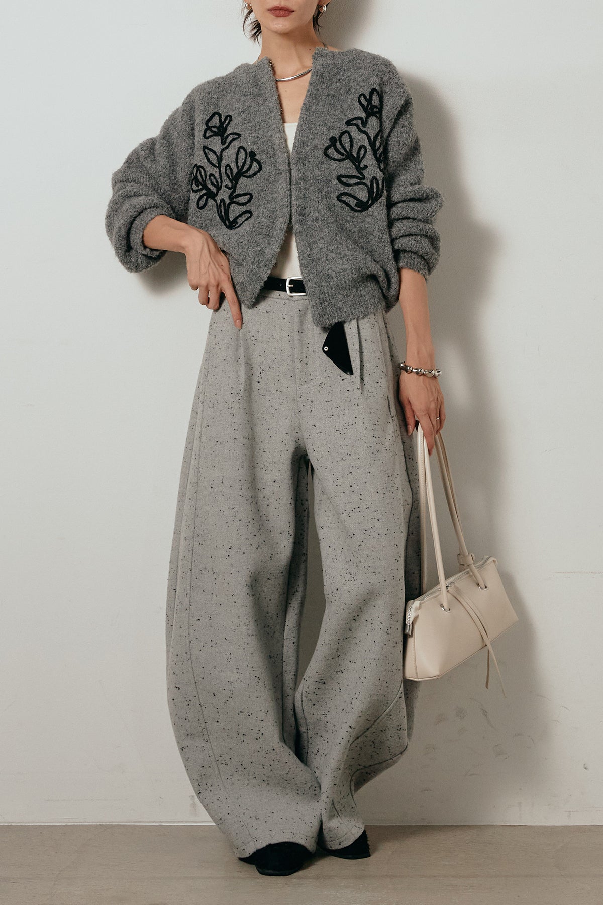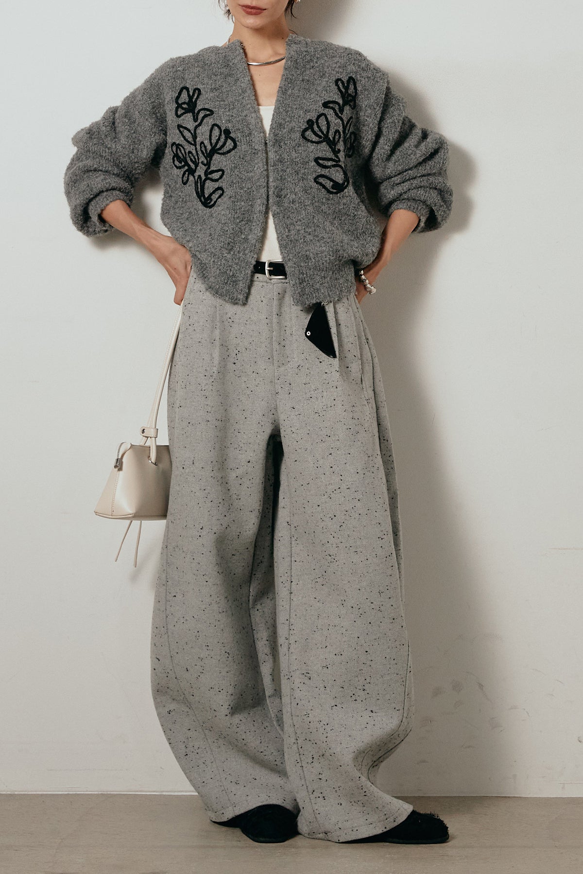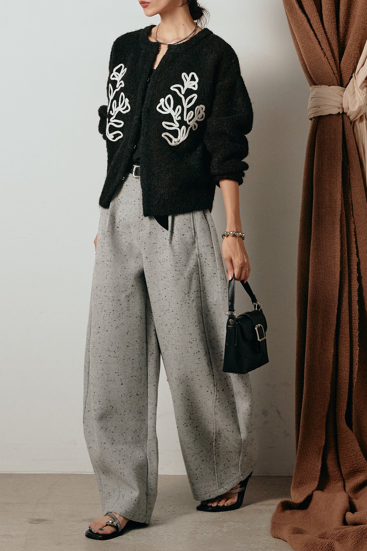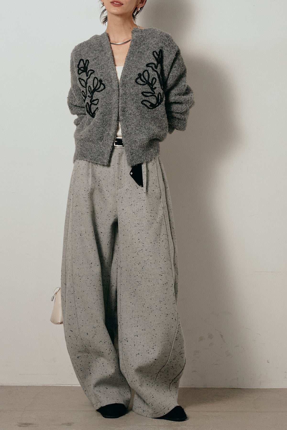 存在感のあるネップツイード素材で仕立てたカーブパンツ。立体的なシルエットが特徴で、足元に向かってゆるやかにカーブするラインが抜け感をプラス。付属のレザーベルトがウエストを引き締め、スタイリングに上品なアクセントを添えます。シンプルなトップスを合わせるだけで洒落感のある着こなしに仕上がる一本です。