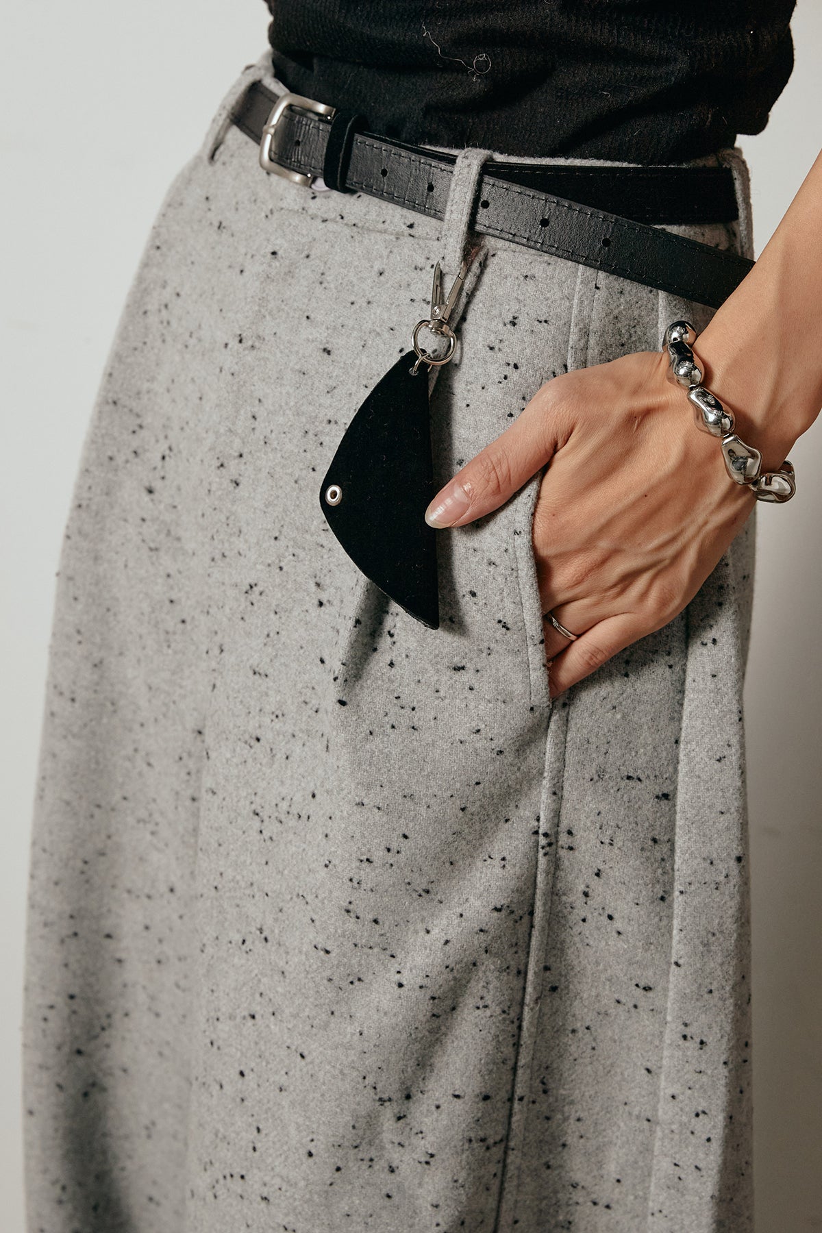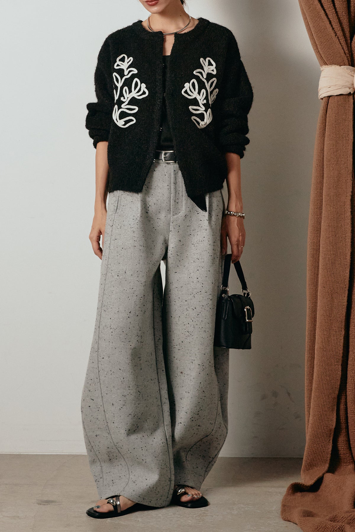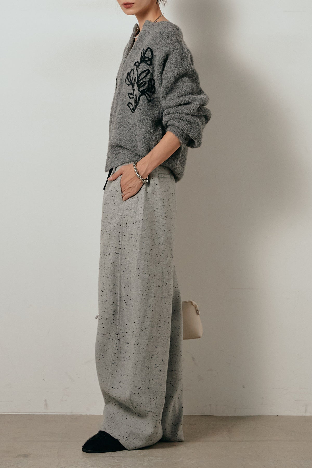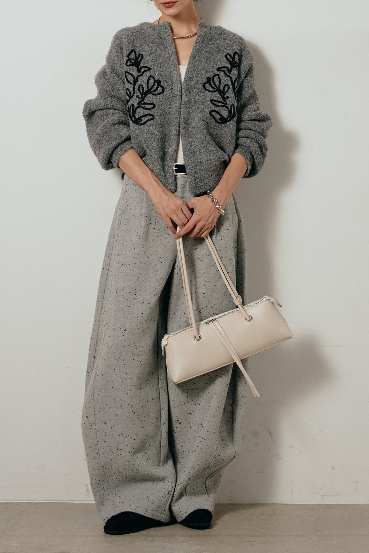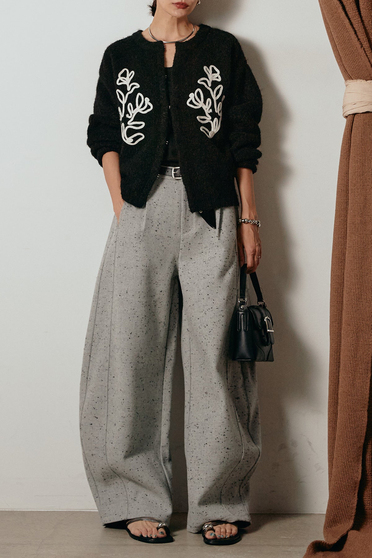 存在感のあるネップツイード素材で仕立てたカーブパンツ。立体的なシルエットが特徴で、足元に向かってゆるやかにカーブするラインが抜け感をプラス。付属のレザーベルトがウエストを引き締め、スタイリングに上品なアクセントを添えます。シンプルなトップスを合わせるだけで洒落感のある着こなしに仕上がる一本です。