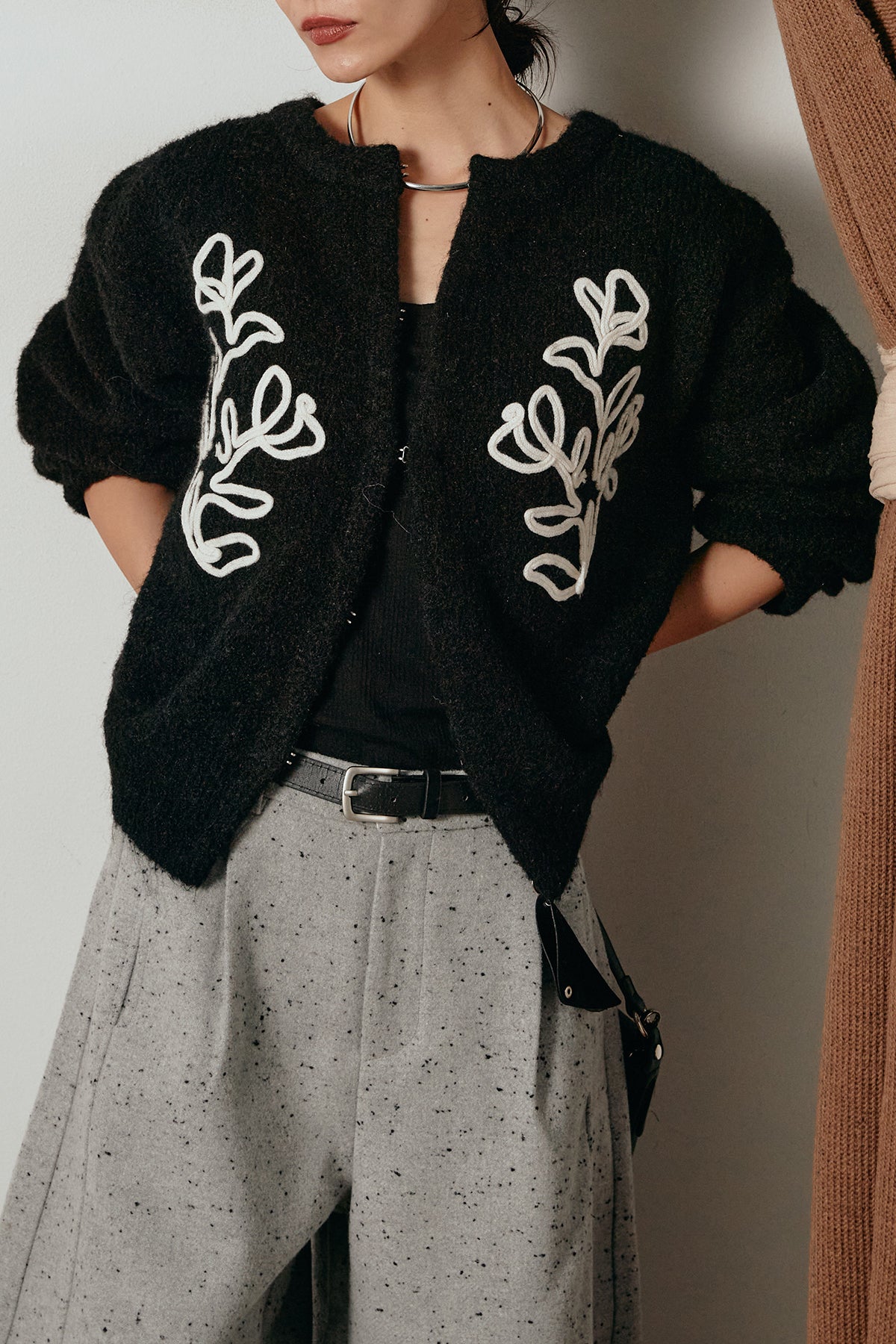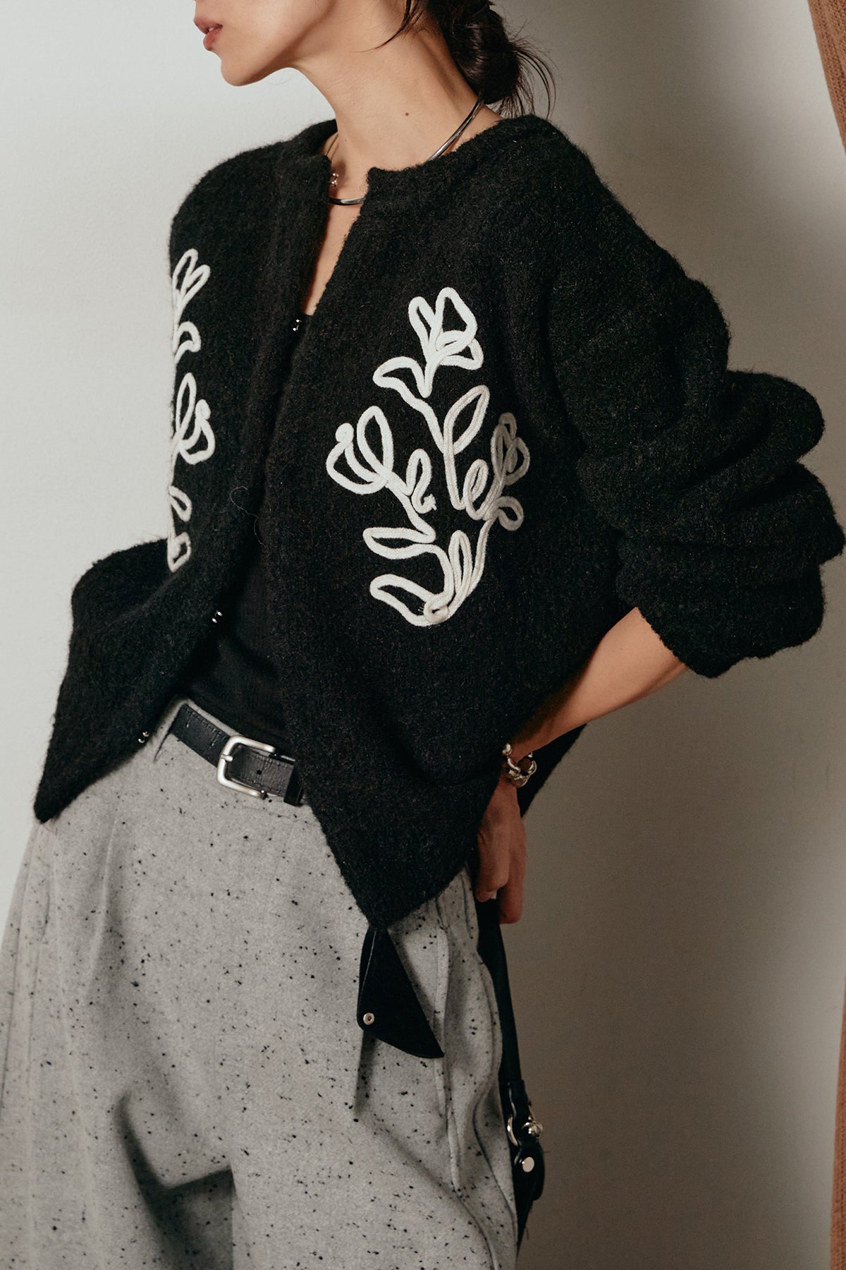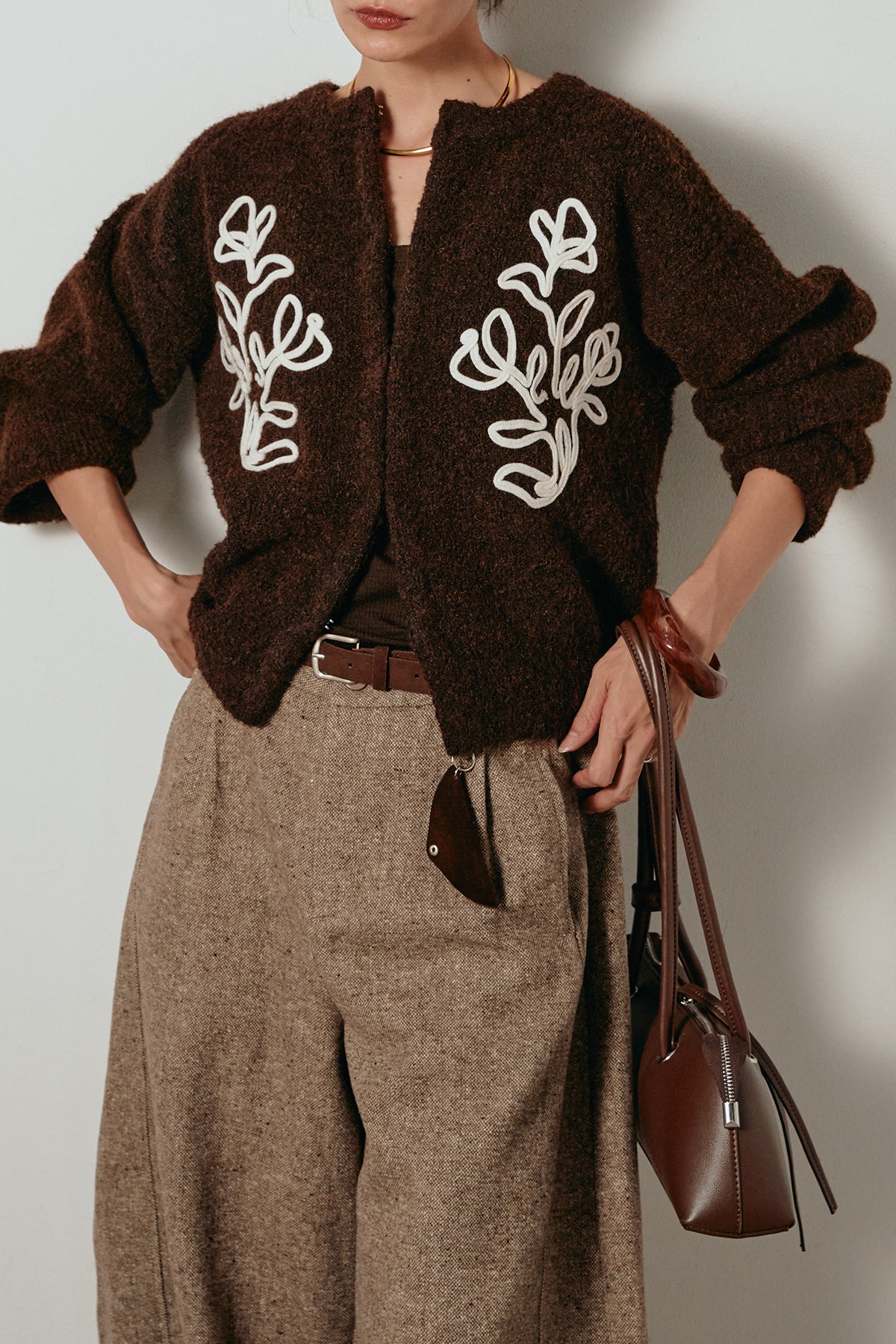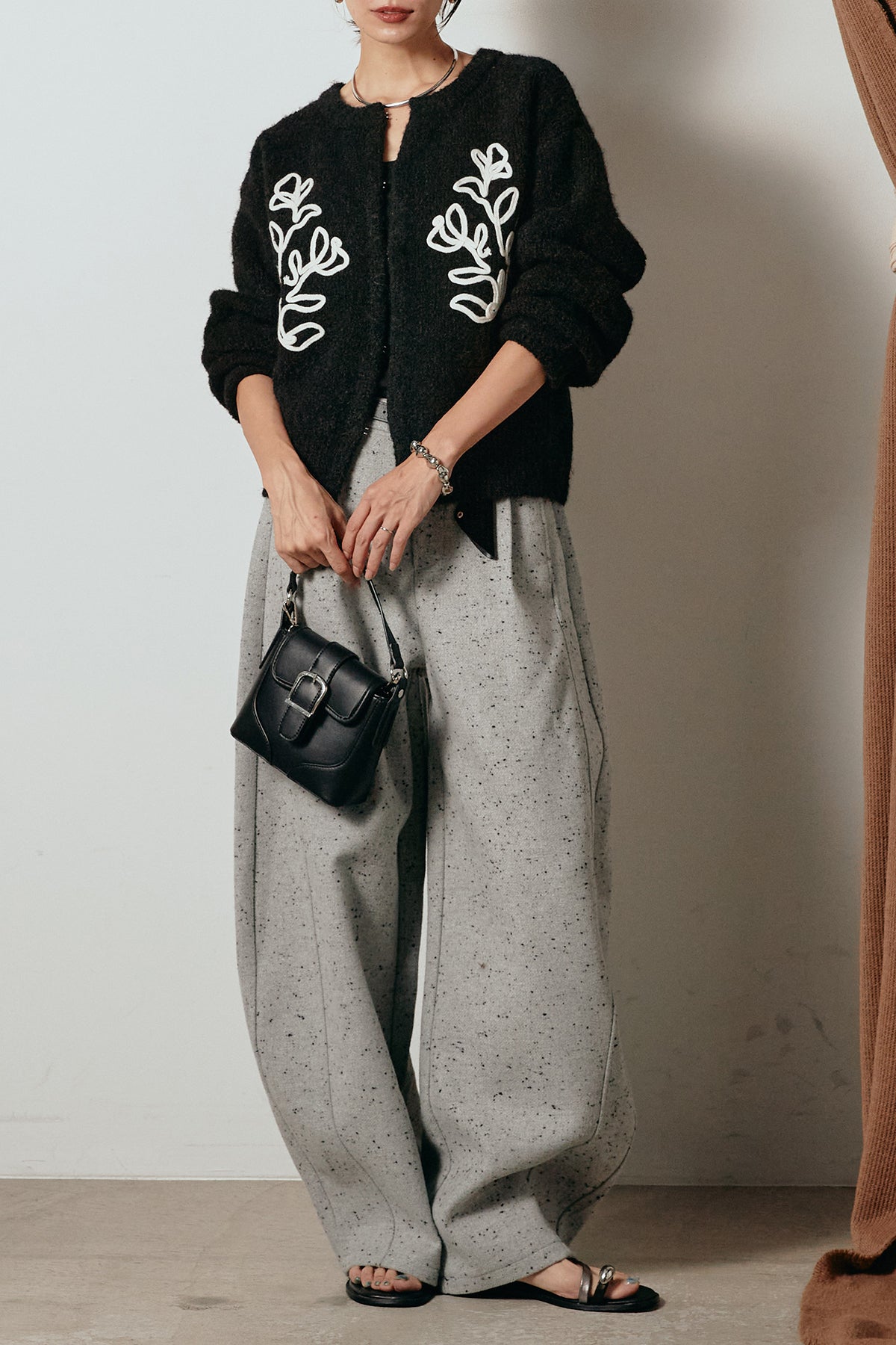 立体的なテープ刺繍が目を惹くニットカーディガン。ふんわりとした毛足のある素材がシーズンムードを高め、着心地も抜群です。フロントの刺繍デザインが華やかさをプラスし、シンプルなコーディネートに映える一枚。ボタンを留めてプルオーバー風に着ても、羽織りとしても楽しめます。