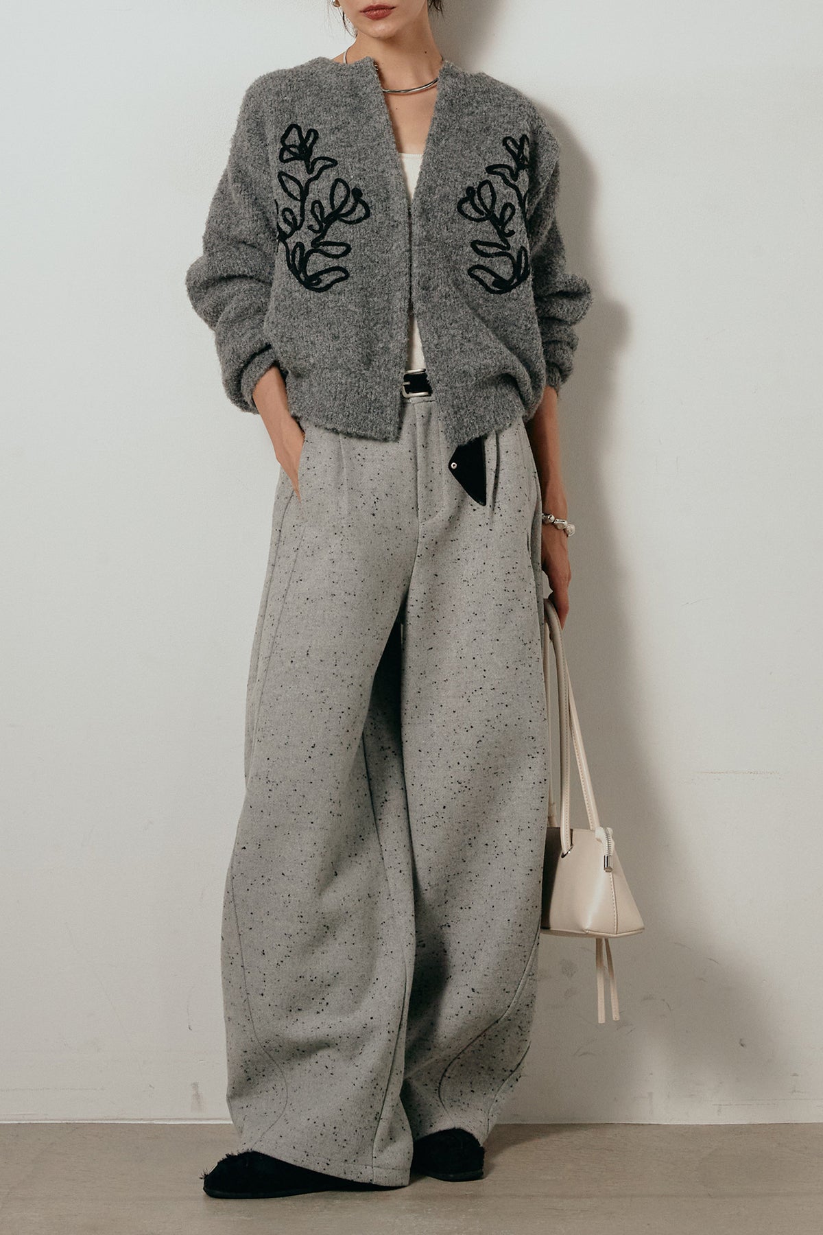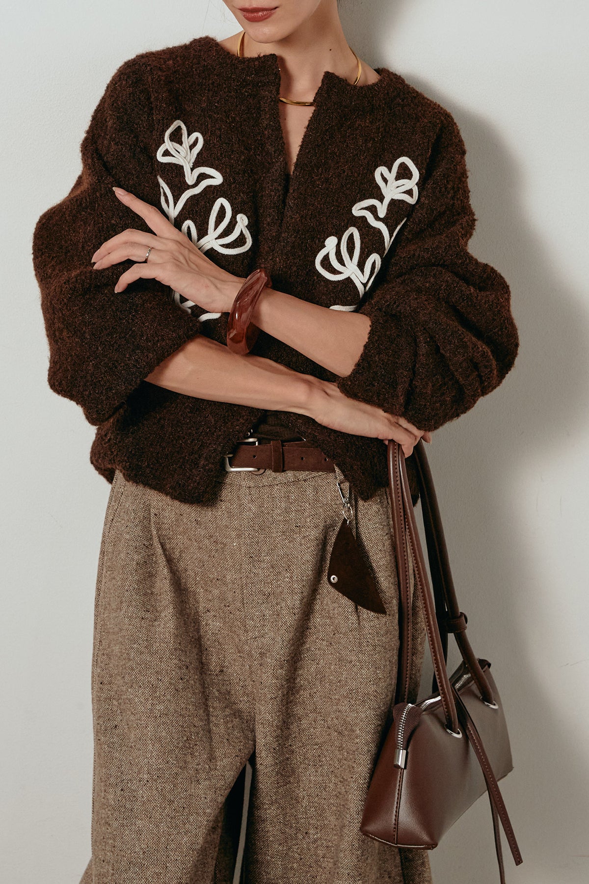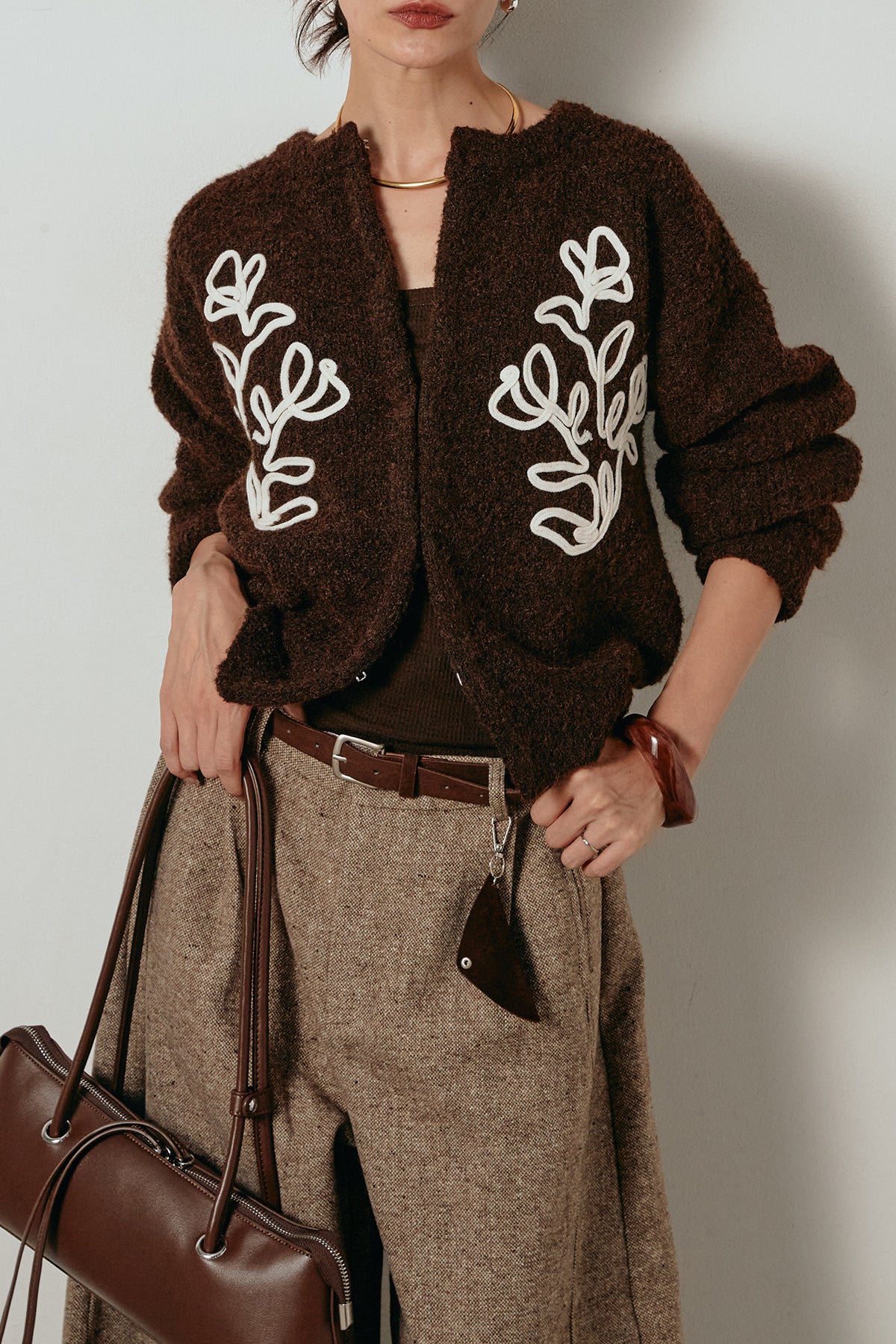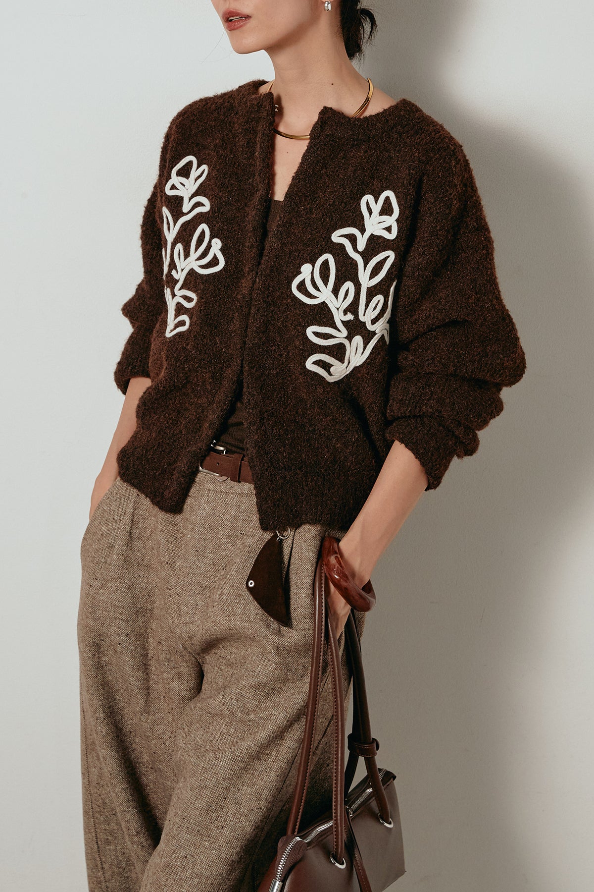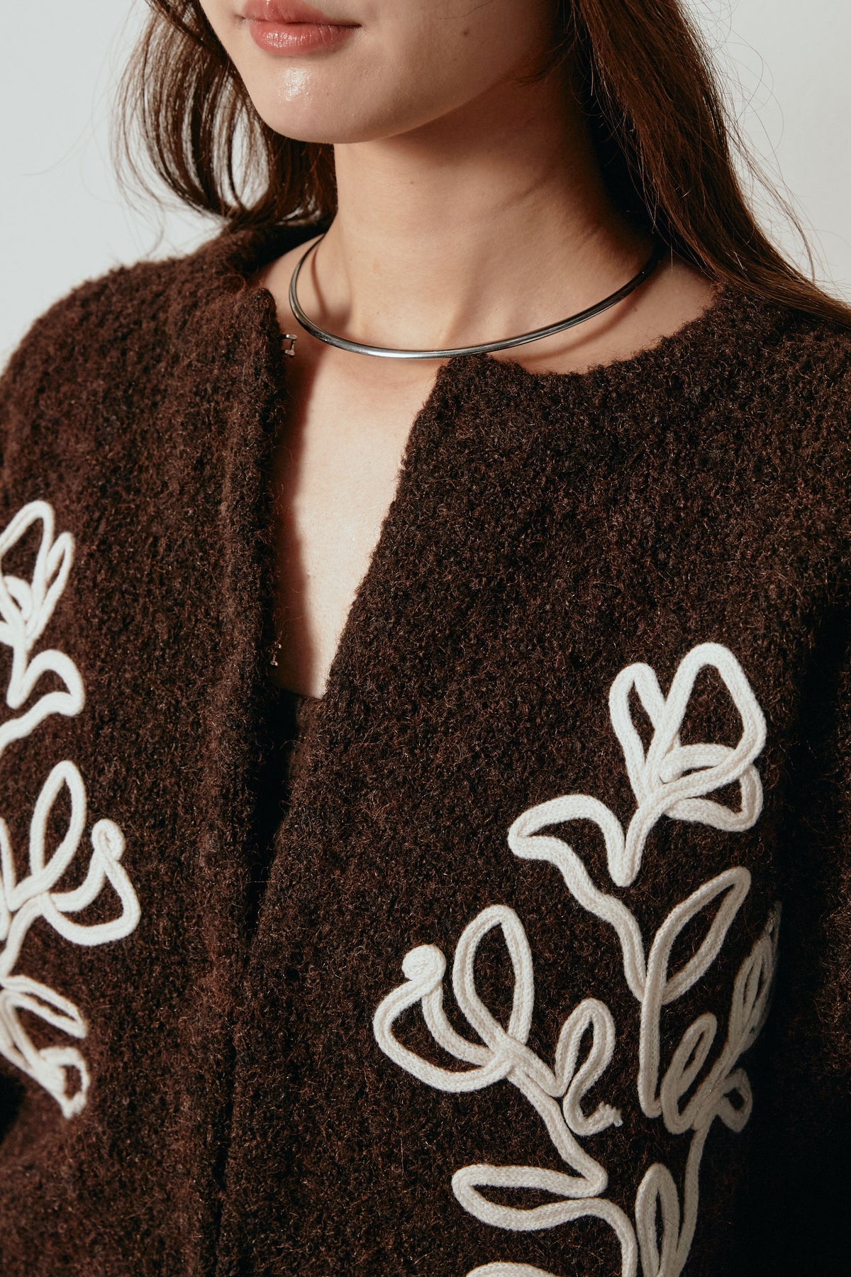 立体的なテープ刺繍が目を惹くニットカーディガン。ふんわりとした毛足のある素材がシーズンムードを高め、着心地も抜群です。フロントの刺繍デザインが華やかさをプラスし、シンプルなコーディネートに映える一枚。ボタンを留めてプルオーバー風に着ても、羽織りとしても楽しめます。