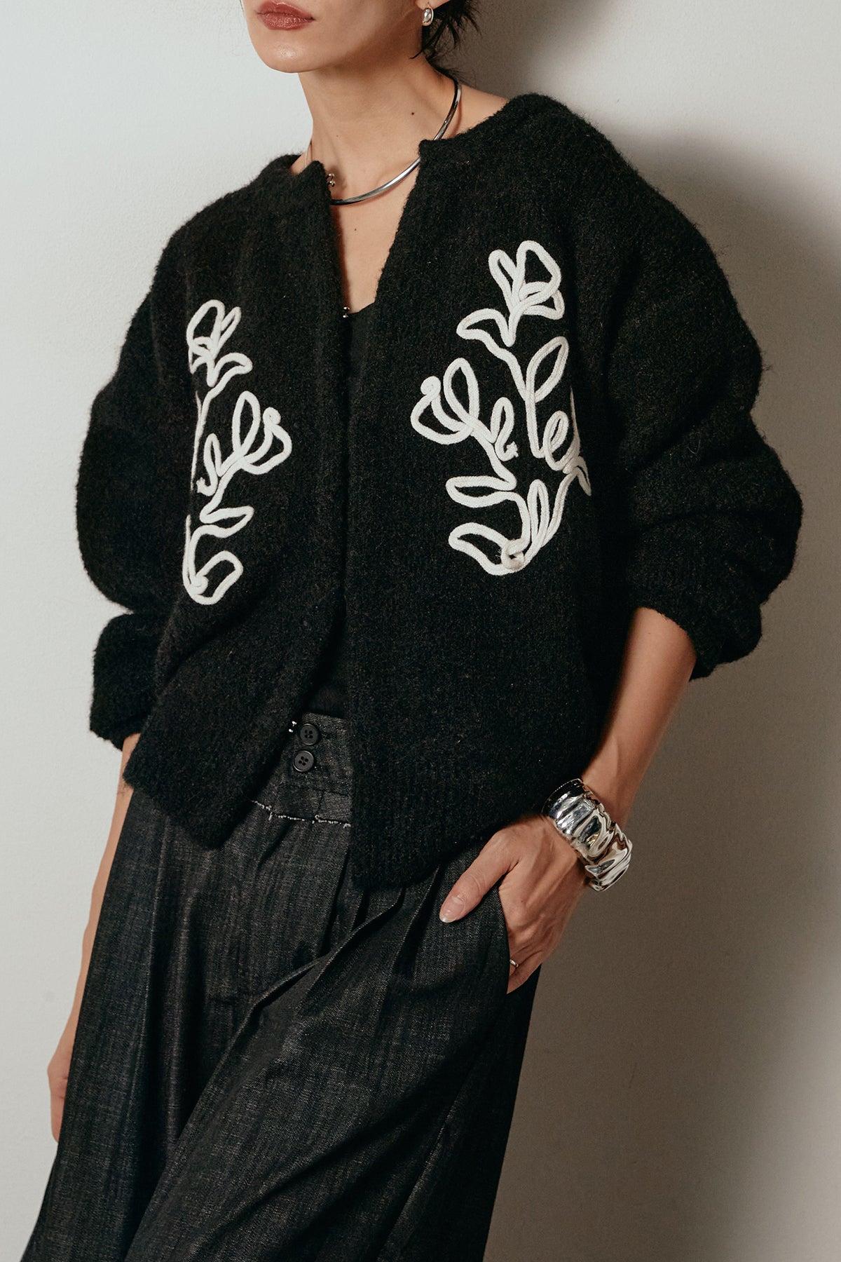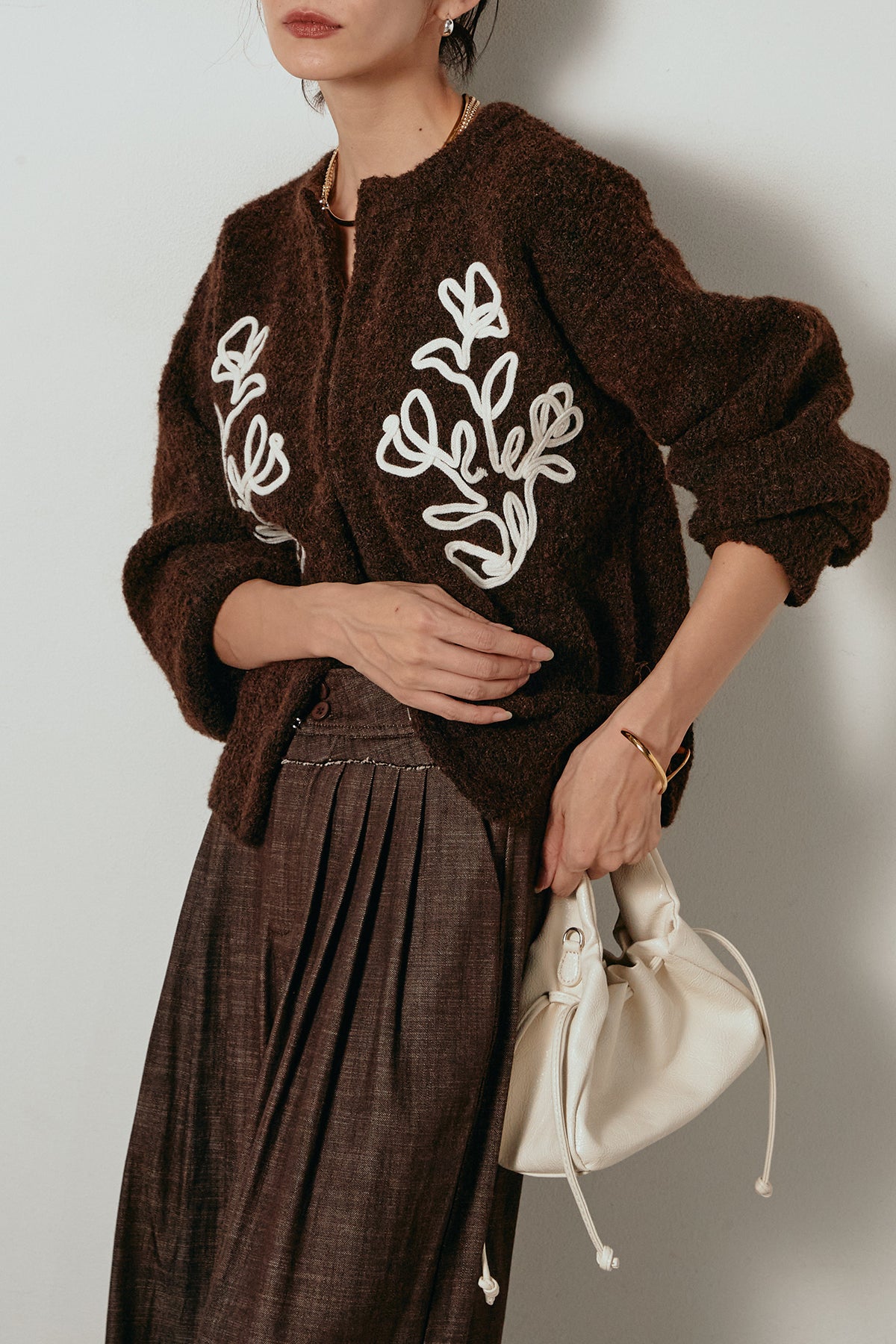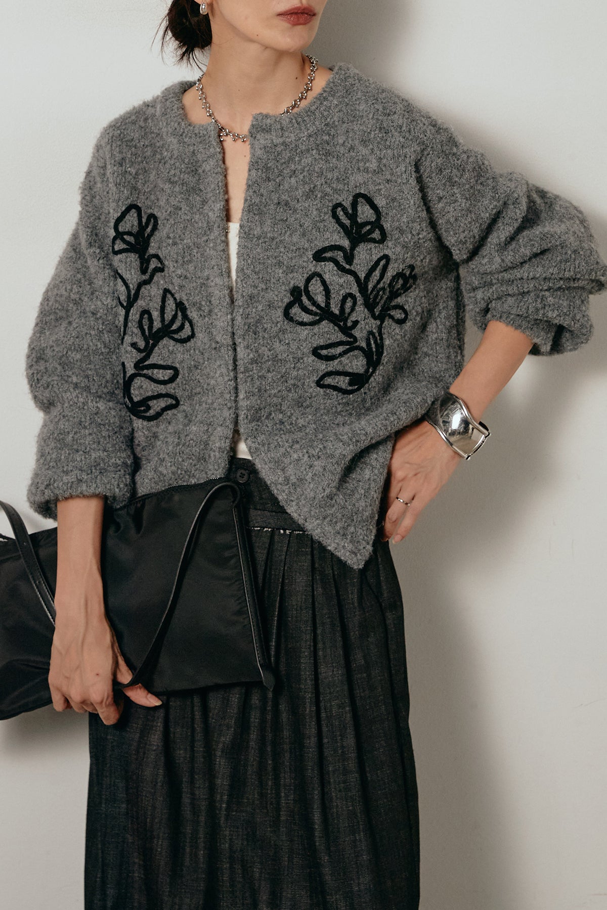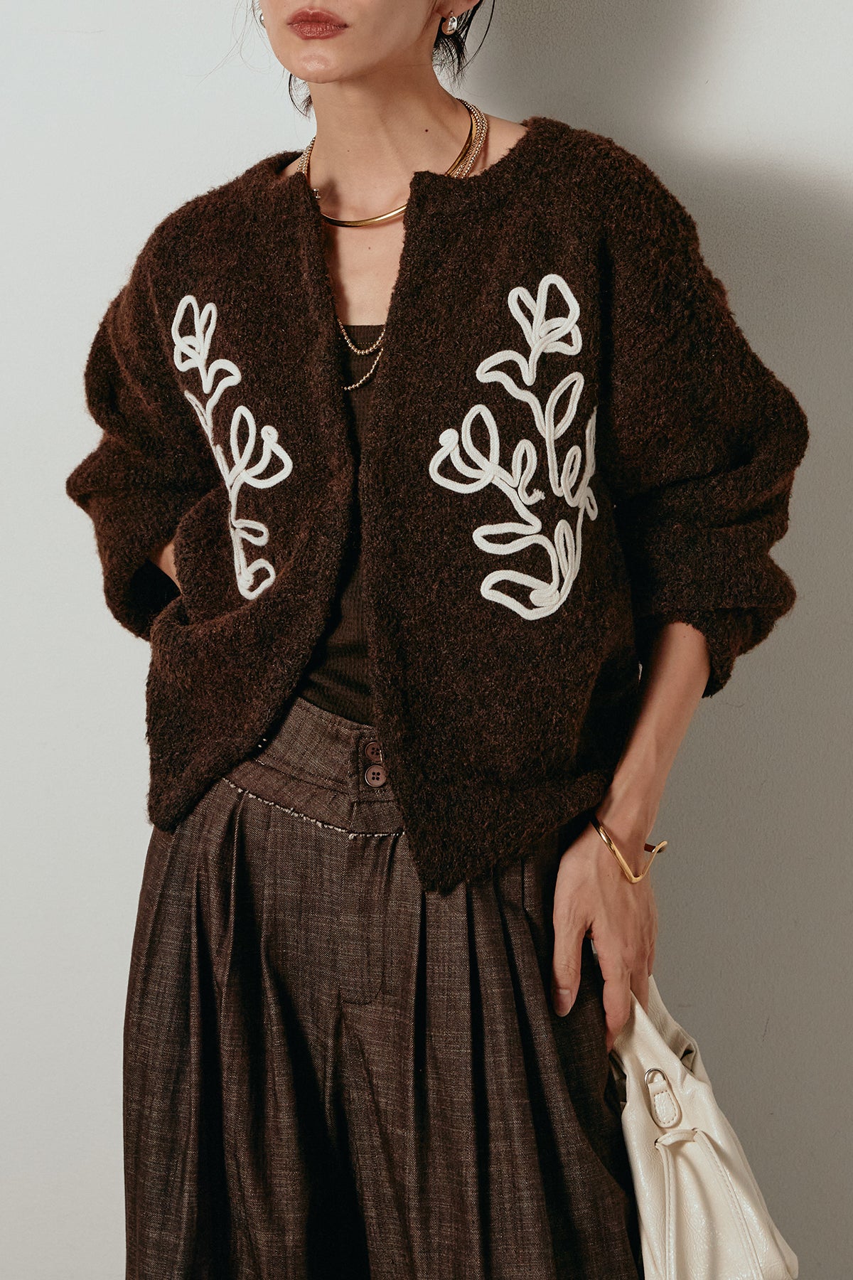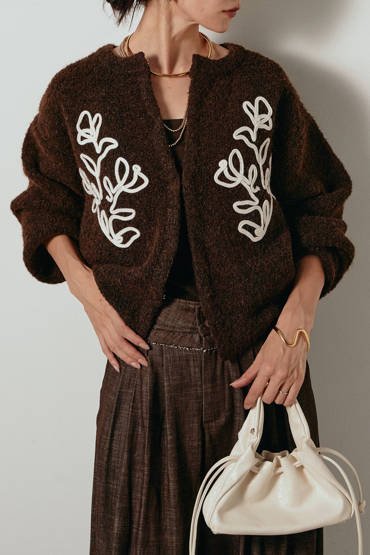 立体的なテープ刺繍が目を惹くニットカーディガン。ふんわりとした毛足のある素材がシーズンムードを高め、着心地も抜群です。フロントの刺繍デザインが華やかさをプラスし、シンプルなコーディネートに映える一枚。ボタンを留めてプルオーバー風に着ても、羽織りとしても楽しめます。