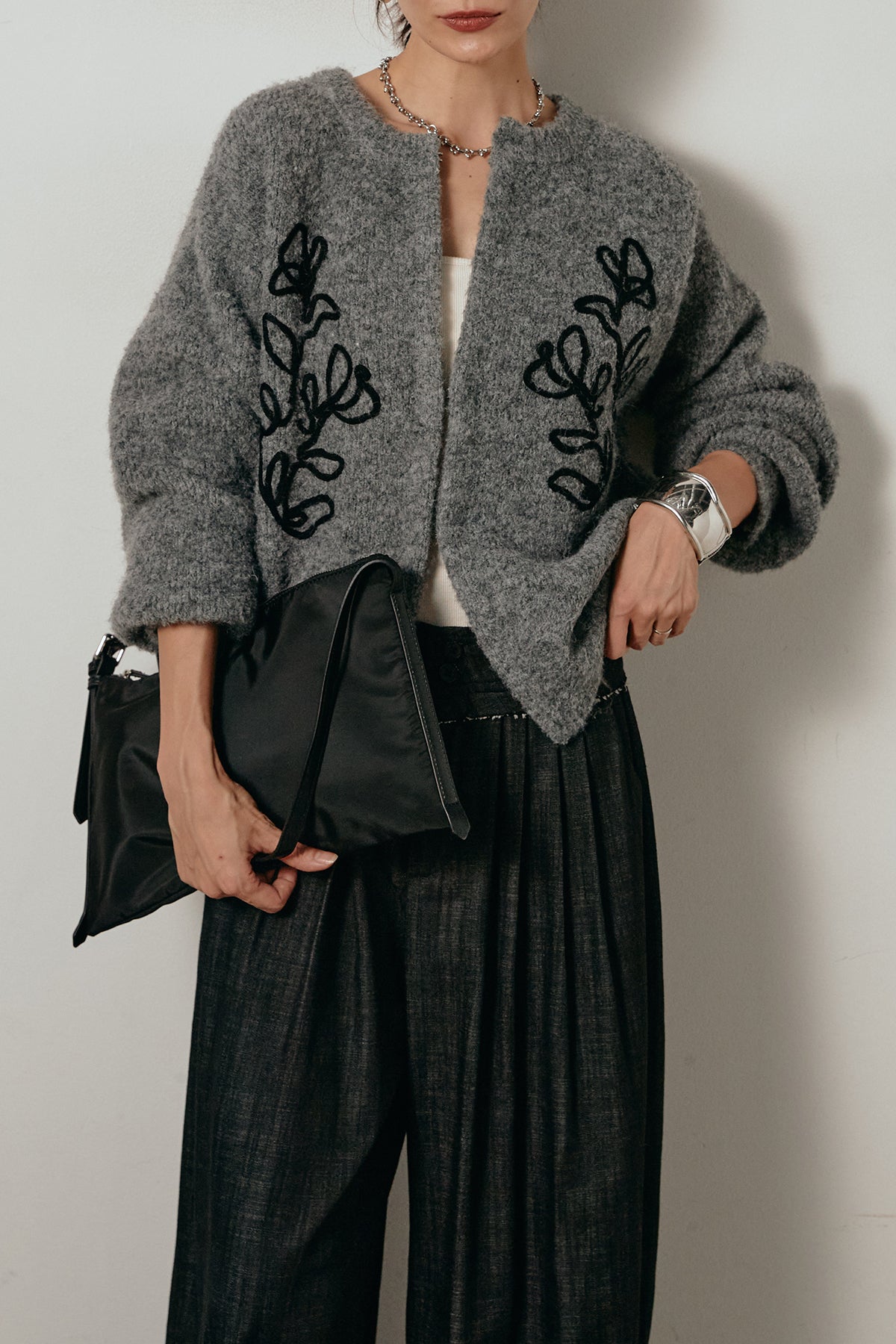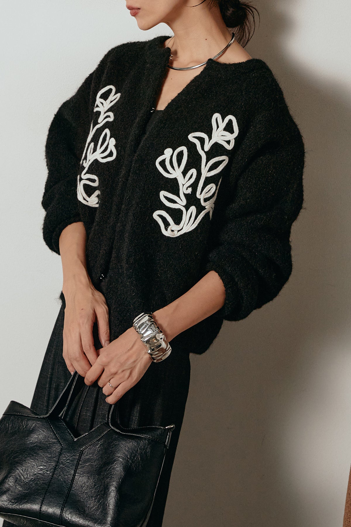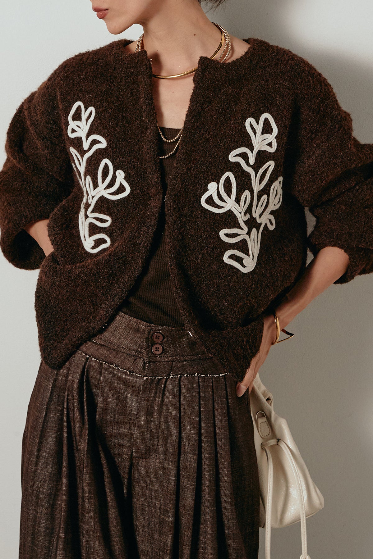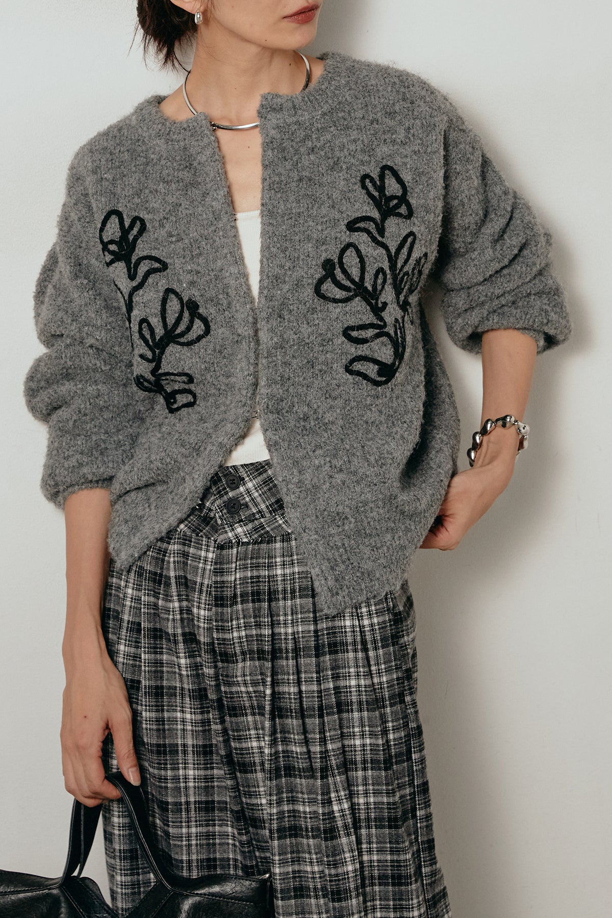 立体的なテープ刺繍が目を惹くニットカーディガン。ふんわりとした毛足のある素材がシーズンムードを高め、着心地も抜群です。フロントの刺繍デザインが華やかさをプラスし、シンプルなコーディネートに映える一枚。ボタンを留めてプルオーバー風に着ても、羽織りとしても楽しめます。