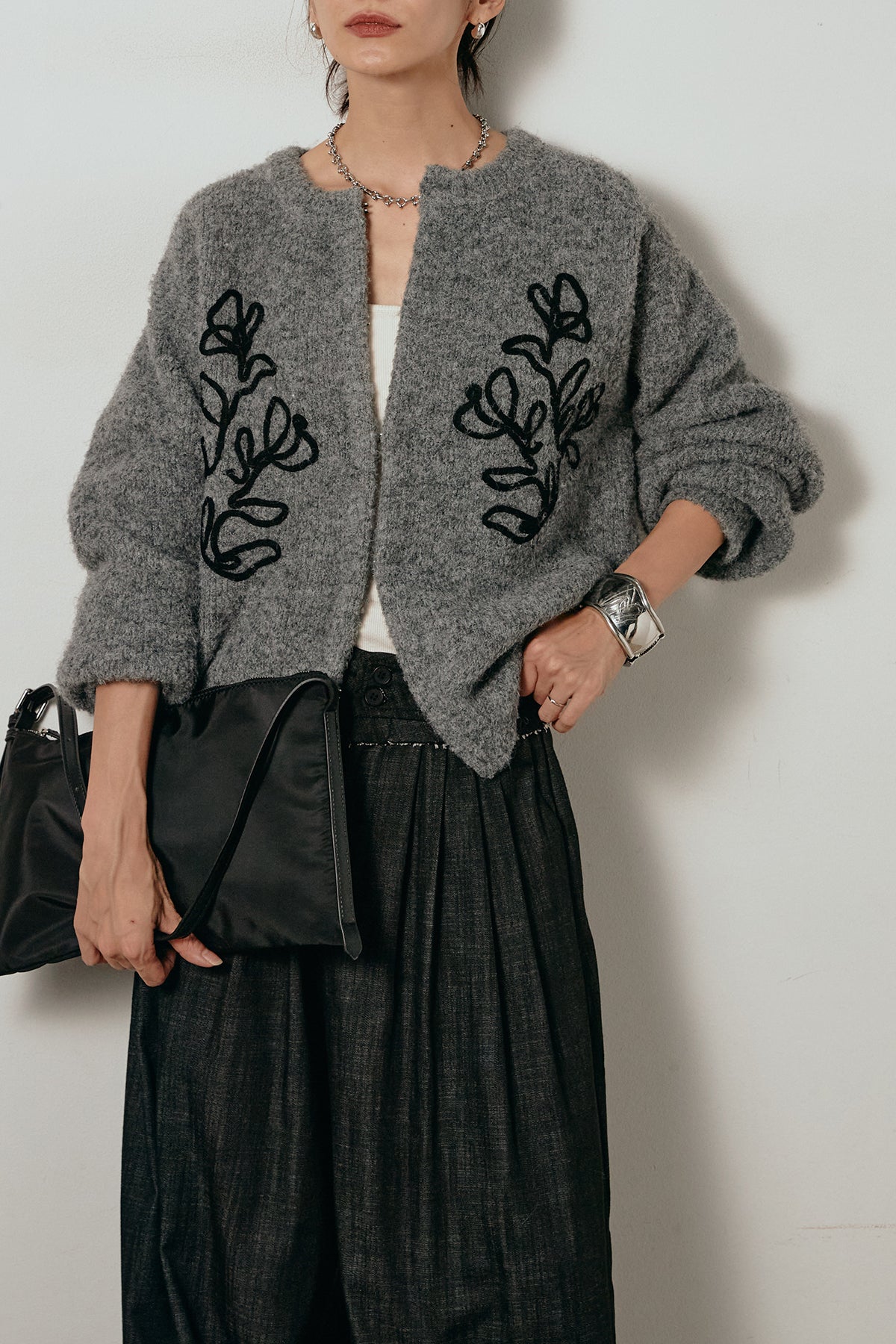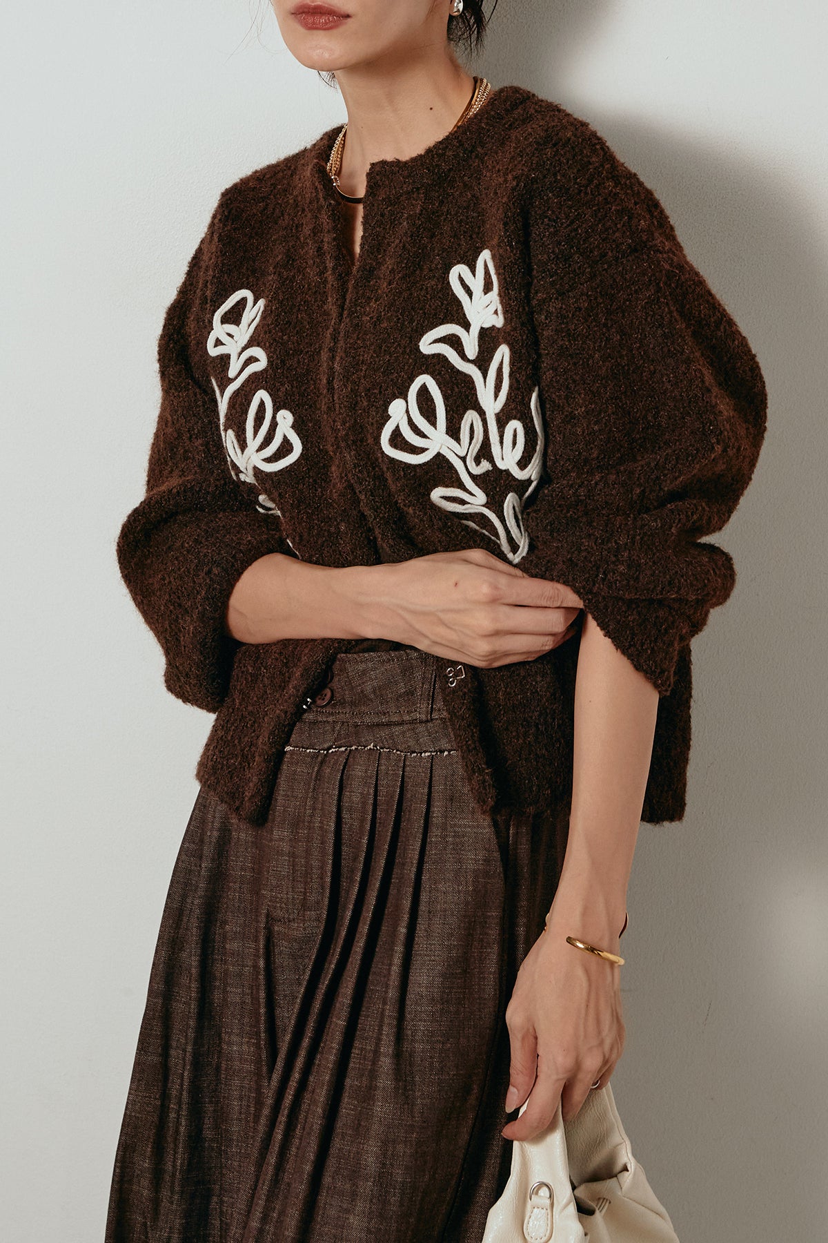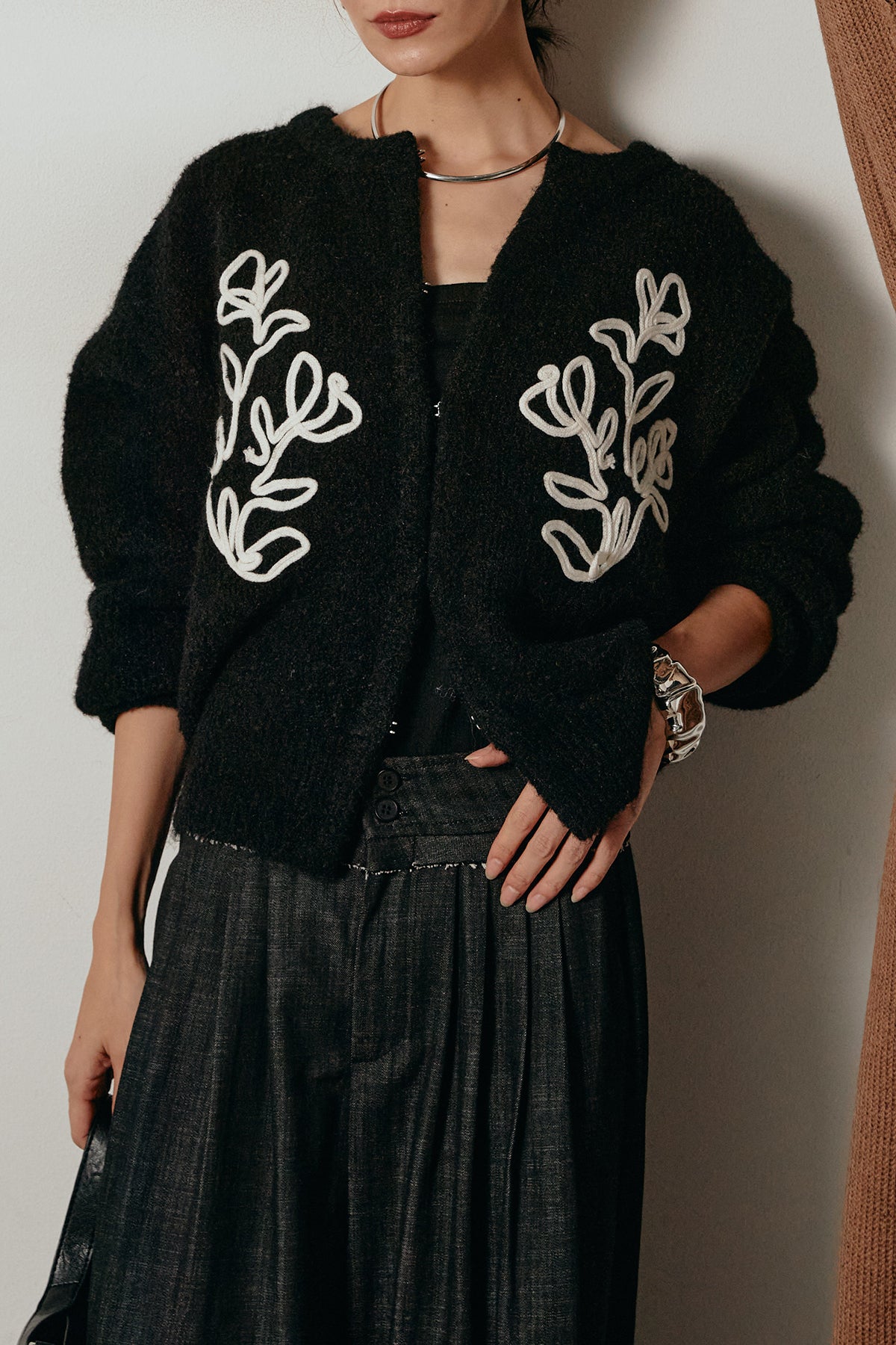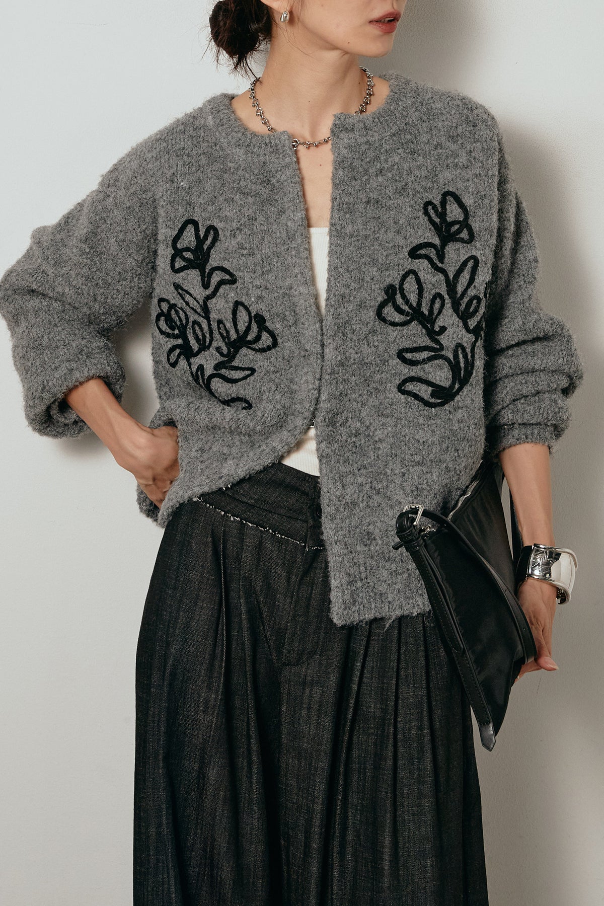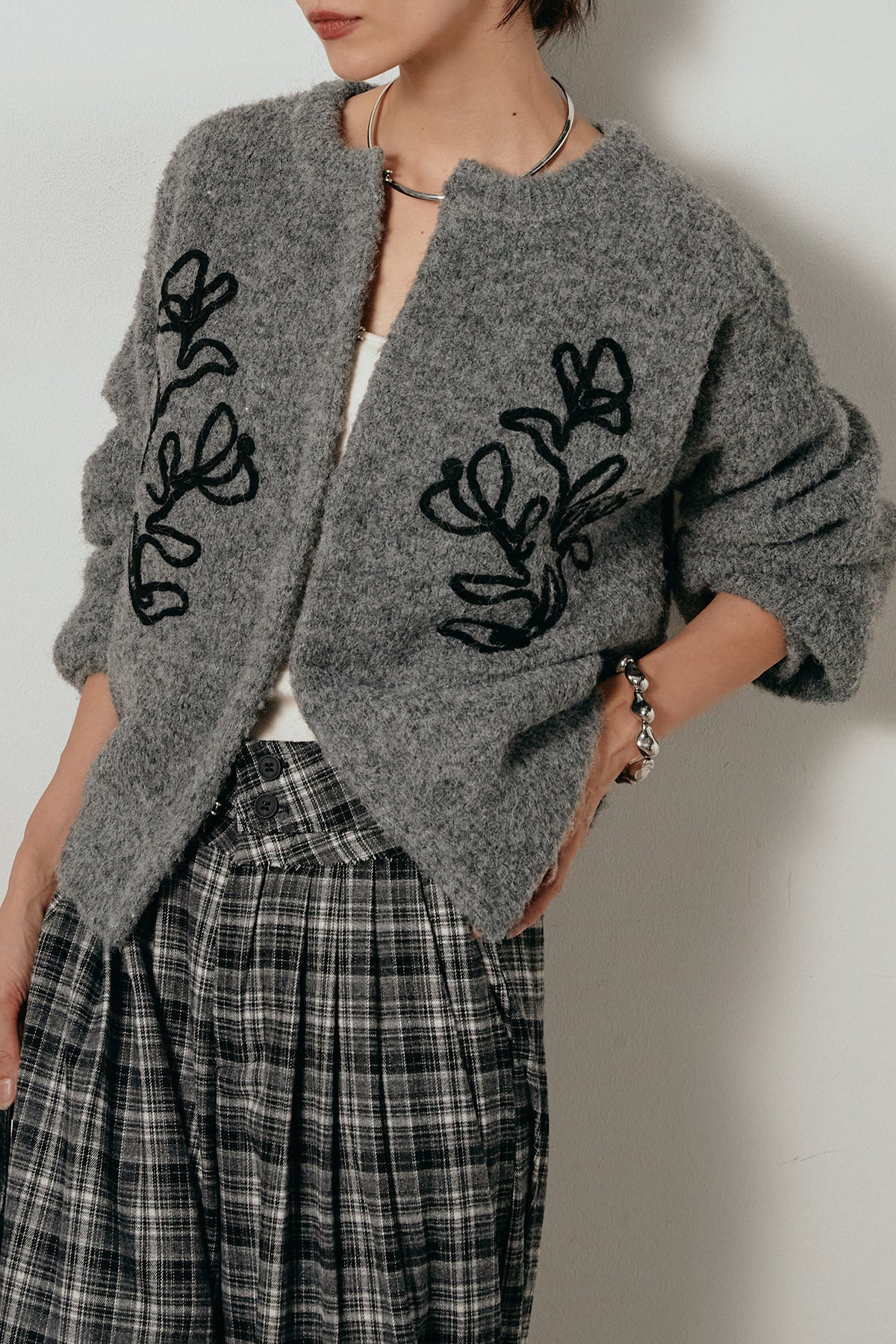 立体的なテープ刺繍が目を惹くニットカーディガン。ふんわりとした毛足のある素材がシーズンムードを高め、着心地も抜群です。フロントの刺繍デザインが華やかさをプラスし、シンプルなコーディネートに映える一枚。ボタンを留めてプルオーバー風に着ても、羽織りとしても楽しめます。