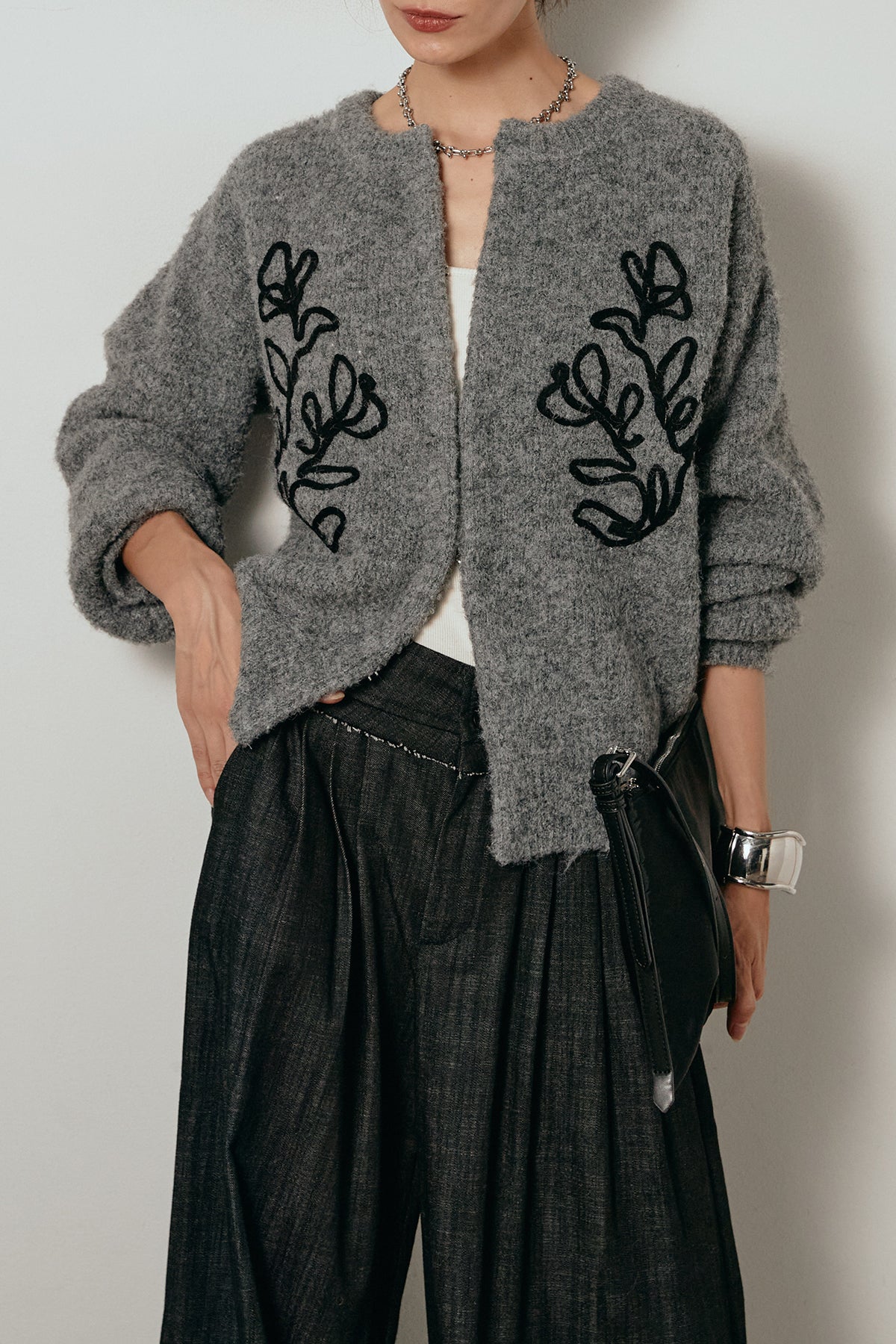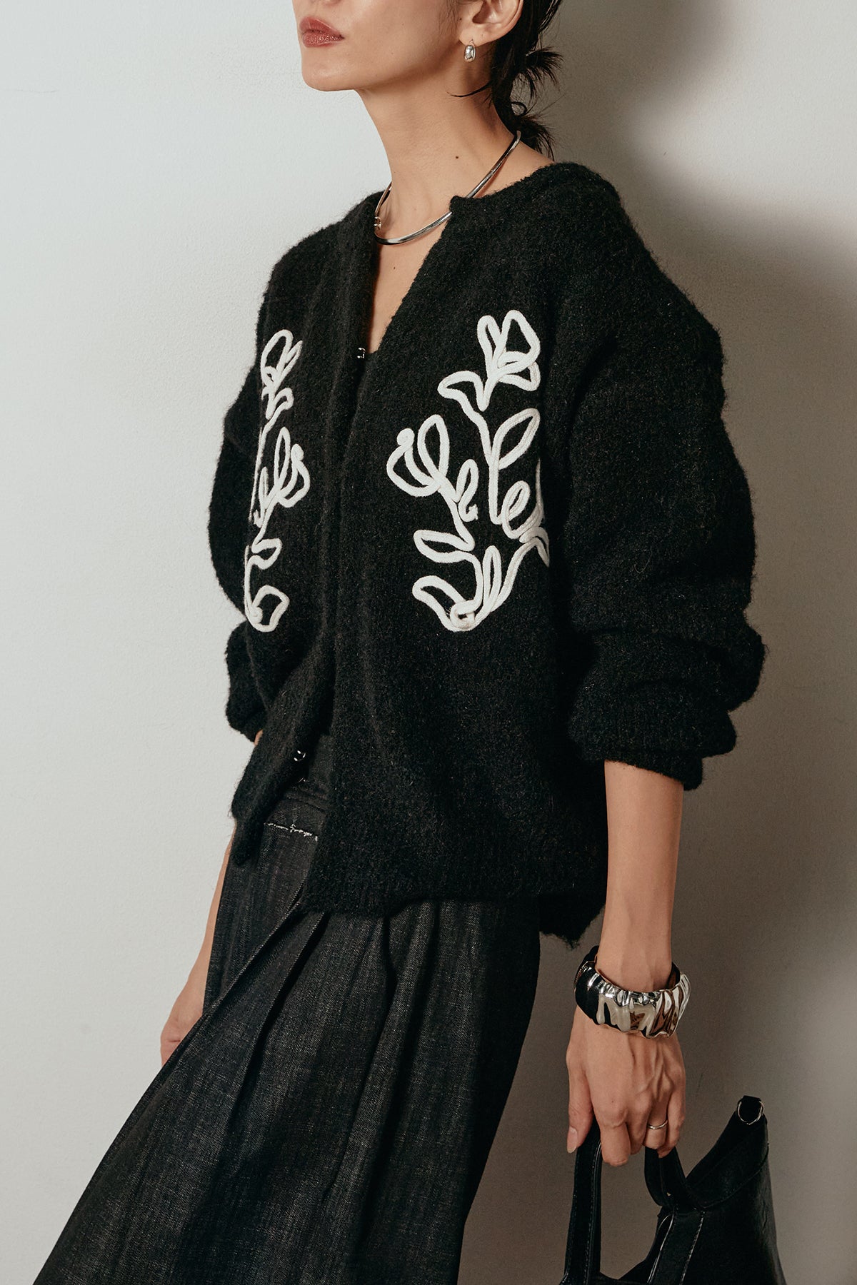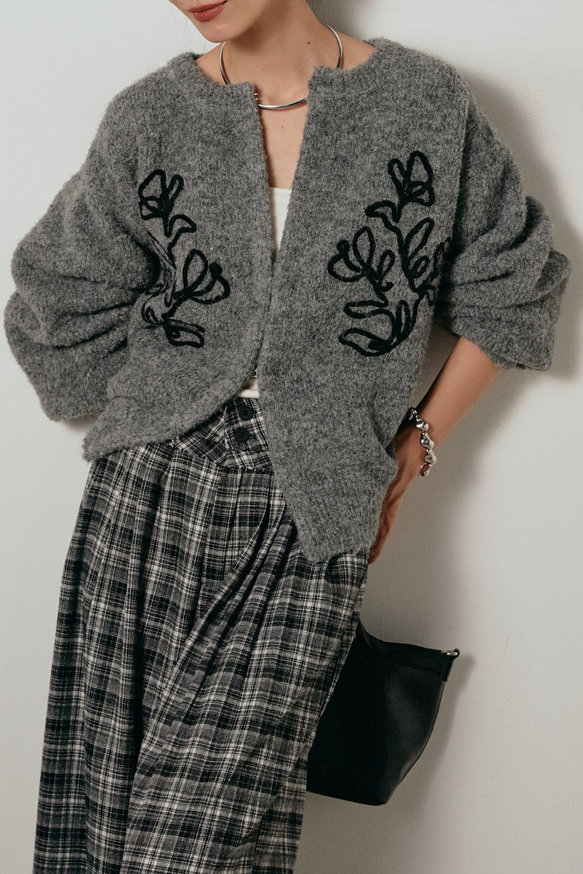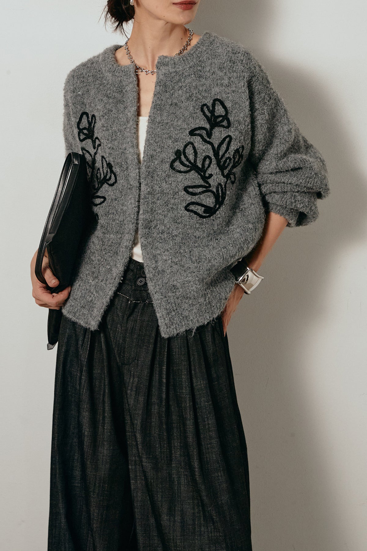 立体的なテープ刺繍が目を惹くニットカーディガン。ふんわりとした毛足のある素材がシーズンムードを高め、着心地も抜群です。フロントの刺繍デザインが華やかさをプラスし、シンプルなコーディネートに映える一枚。ボタンを留めてプルオーバー風に着ても、羽織りとしても楽しめます。
