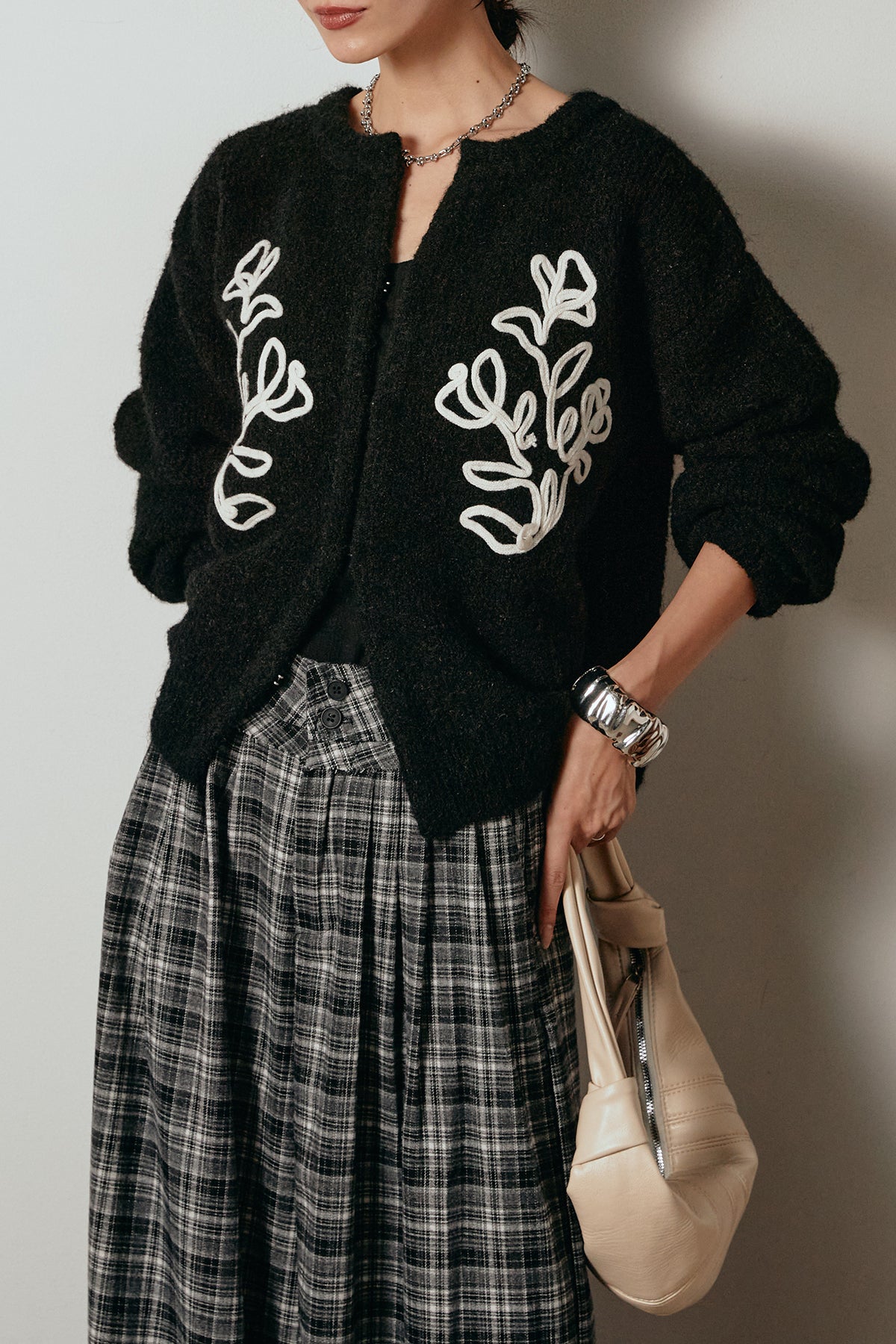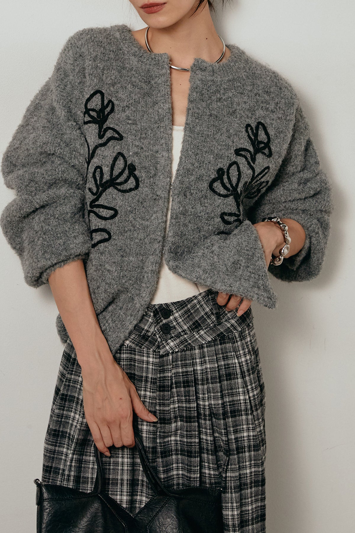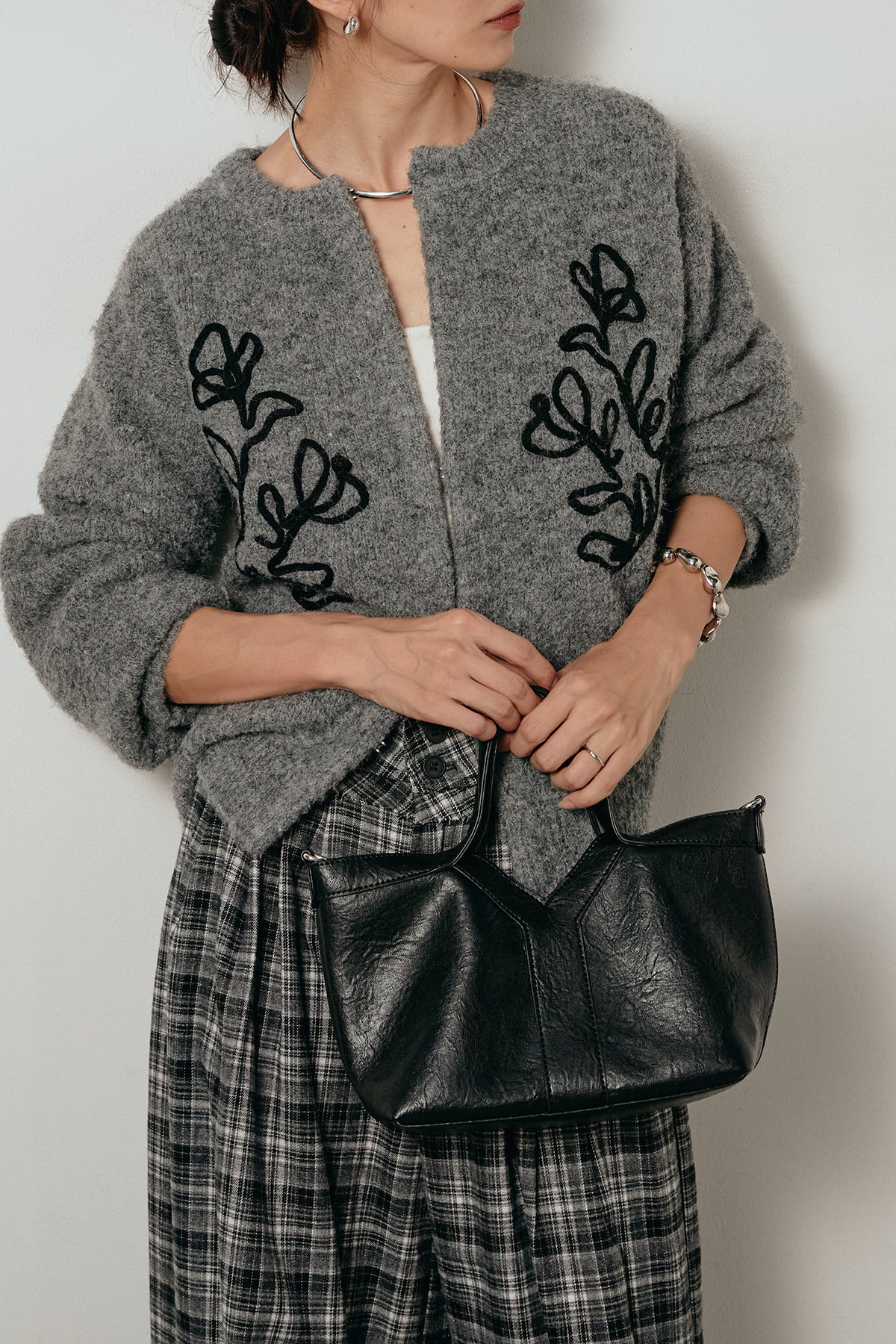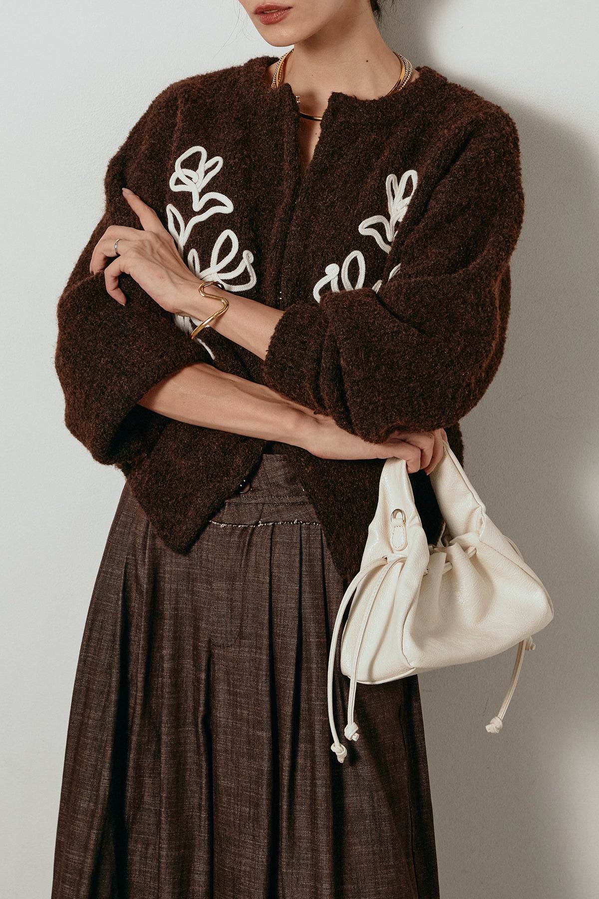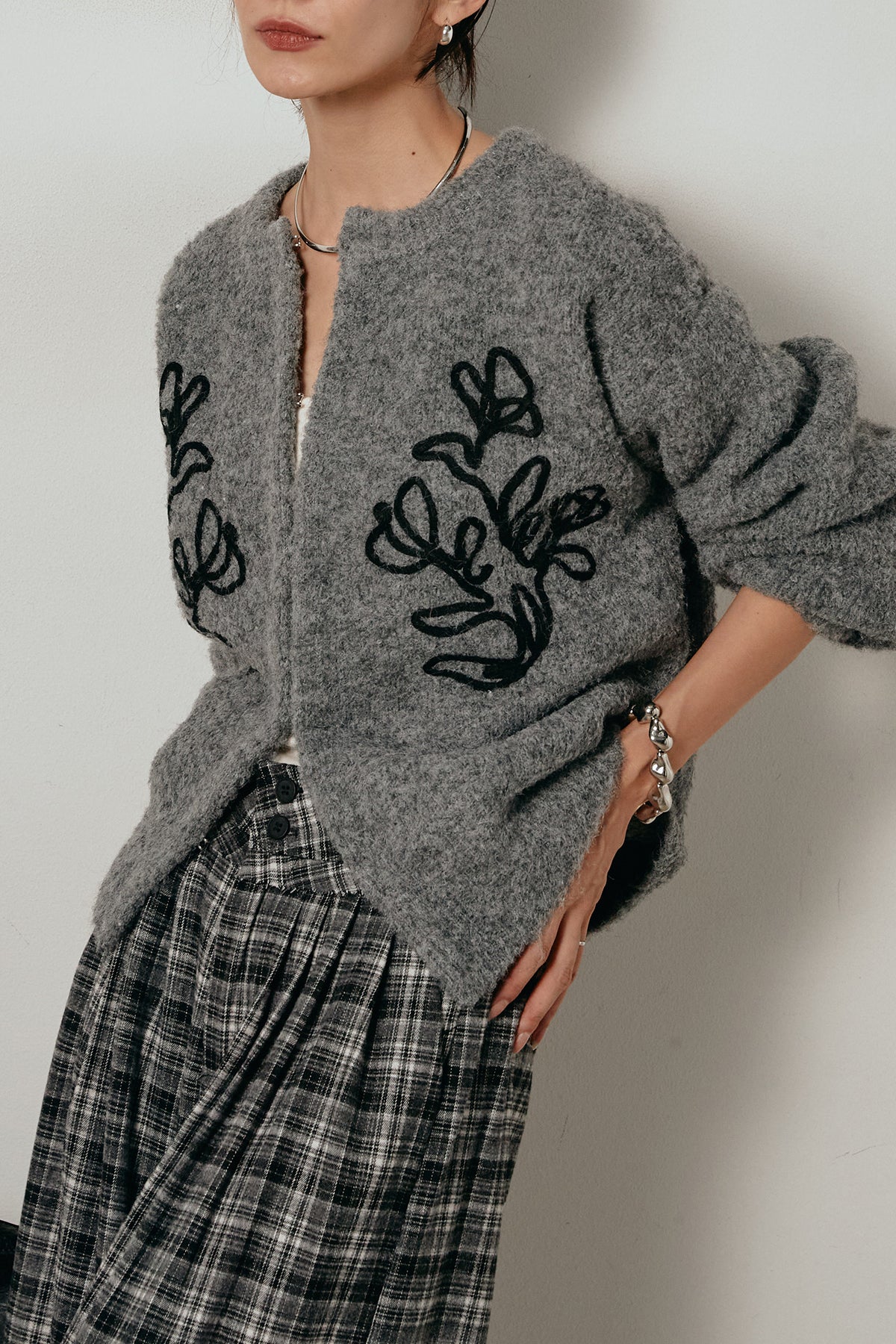 立体的なテープ刺繍が目を惹くニットカーディガン。ふんわりとした毛足のある素材がシーズンムードを高め、着心地も抜群です。フロントの刺繍デザインが華やかさをプラスし、シンプルなコーディネートに映える一枚。ボタンを留めてプルオーバー風に着ても、羽織りとしても楽しめます。