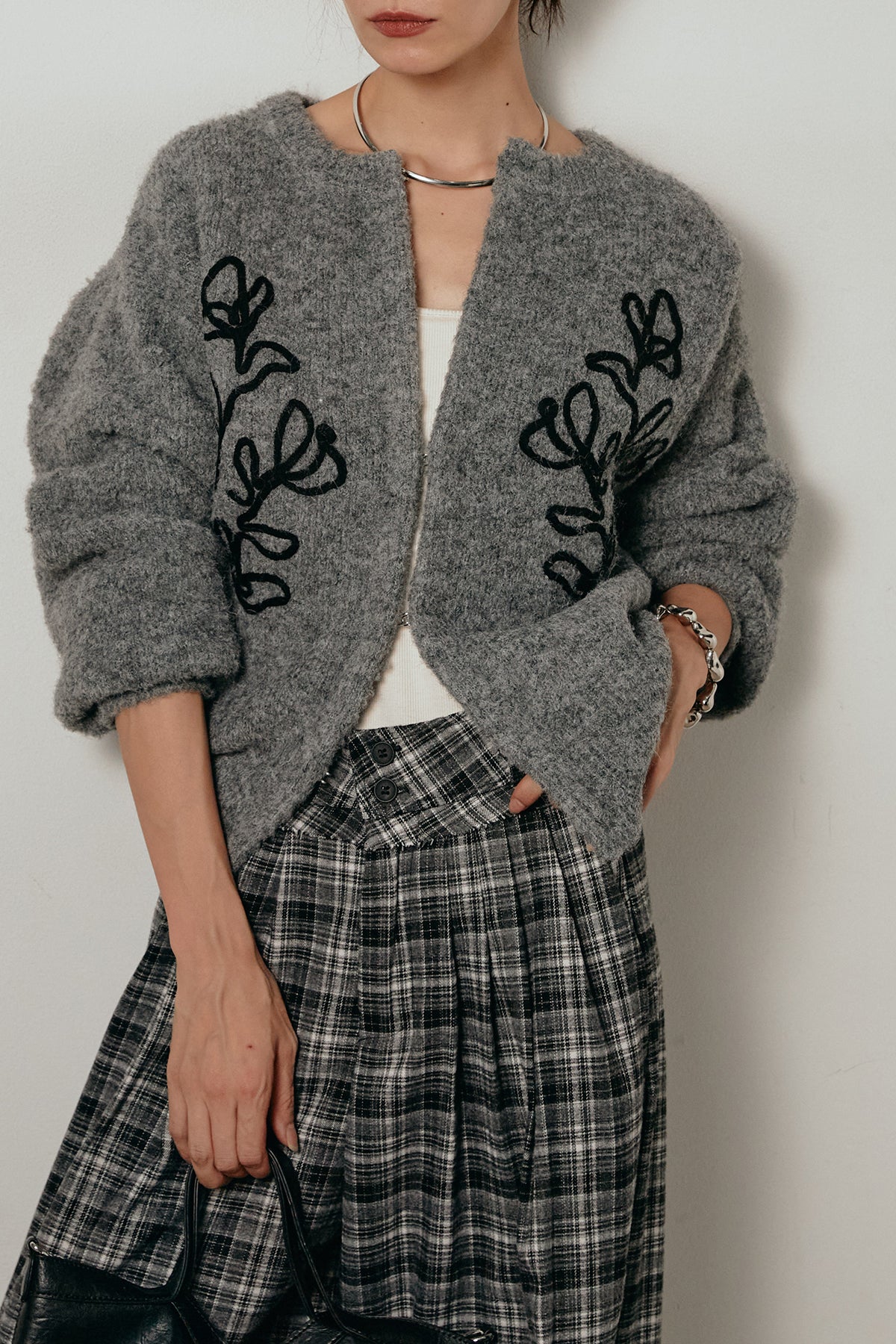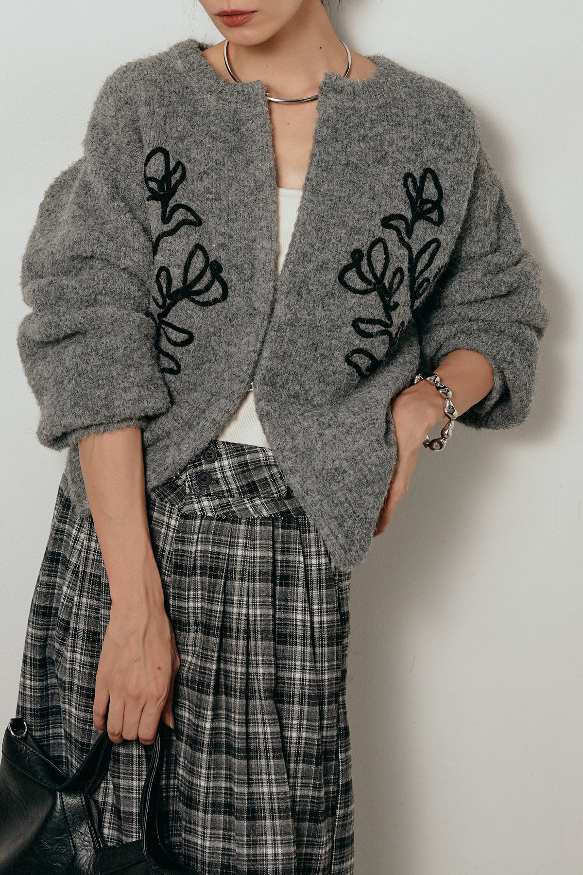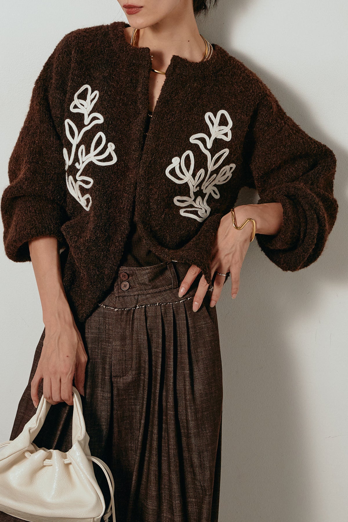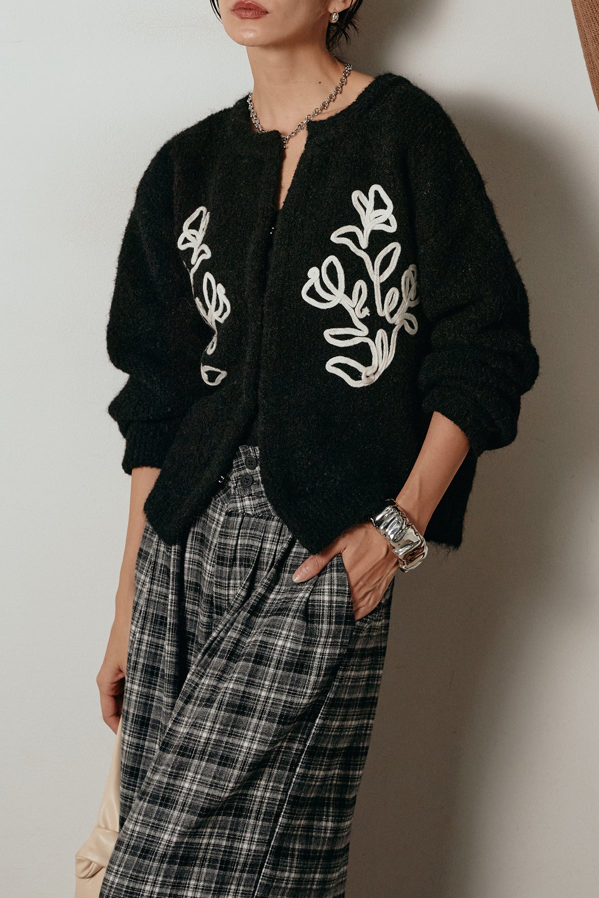 立体的なテープ刺繍が目を惹くニットカーディガン。ふんわりとした毛足のある素材がシーズンムードを高め、着心地も抜群です。フロントの刺繍デザインが華やかさをプラスし、シンプルなコーディネートに映える一枚。ボタンを留めてプルオーバー風に着ても、羽織りとしても楽しめます。
