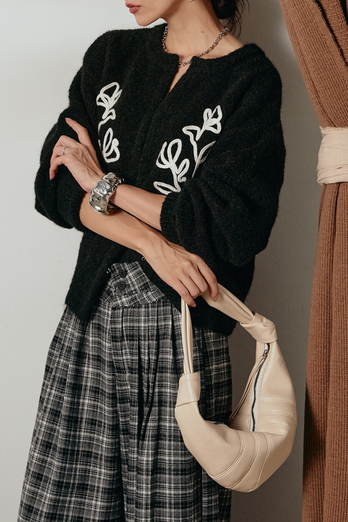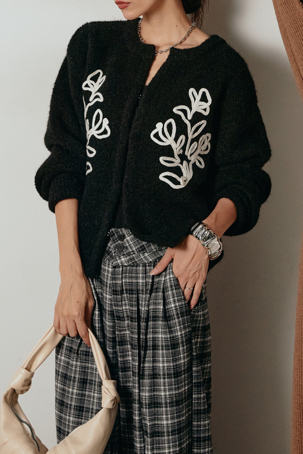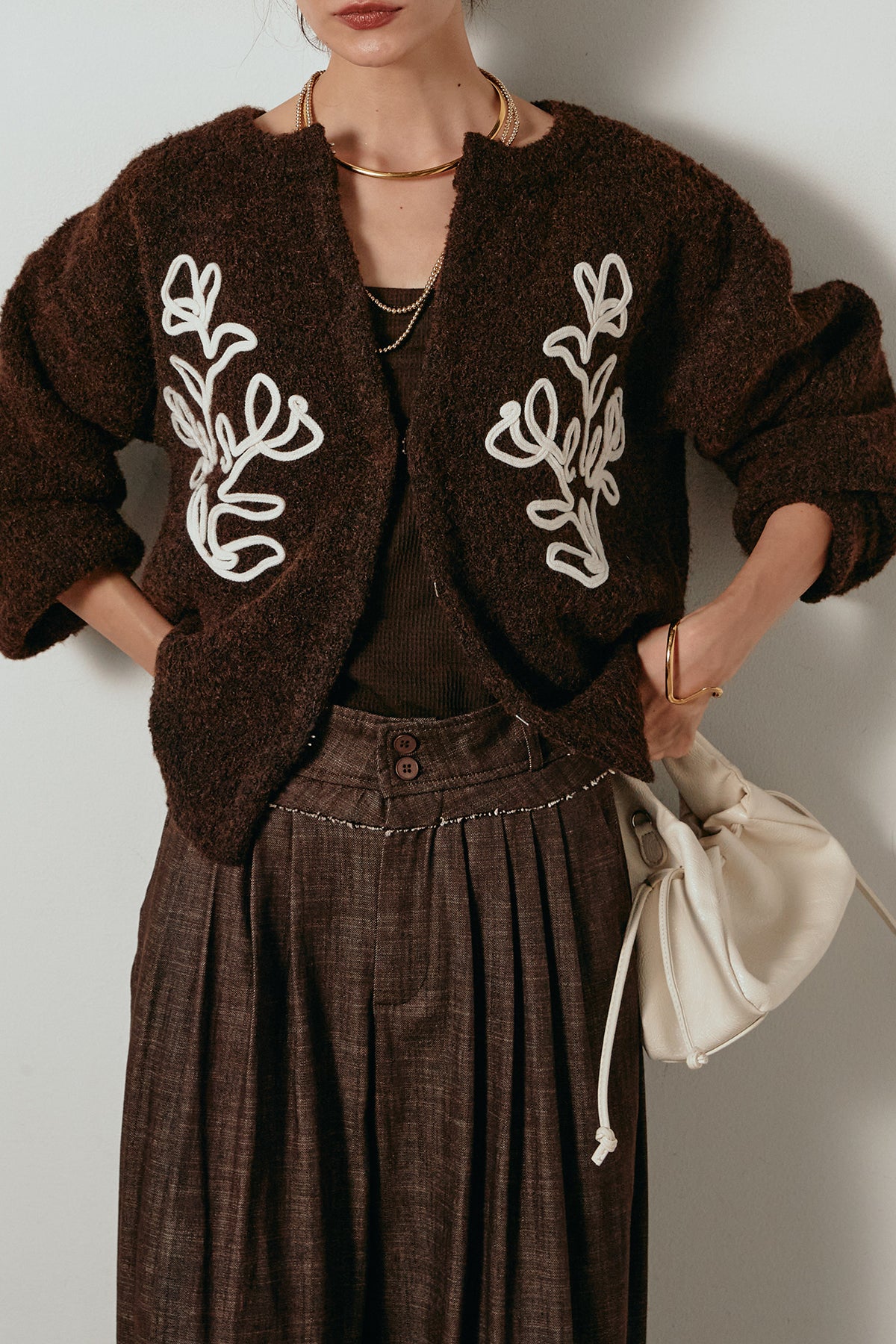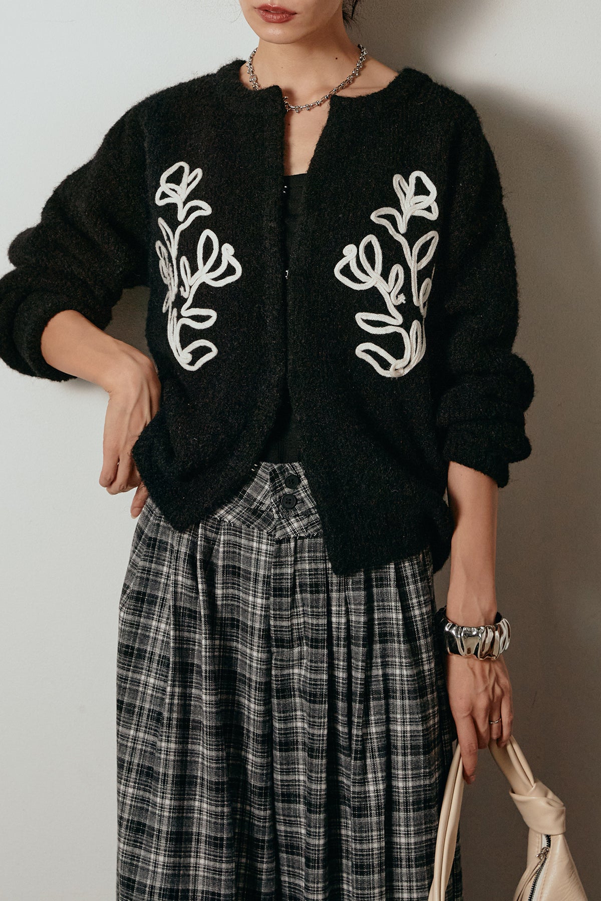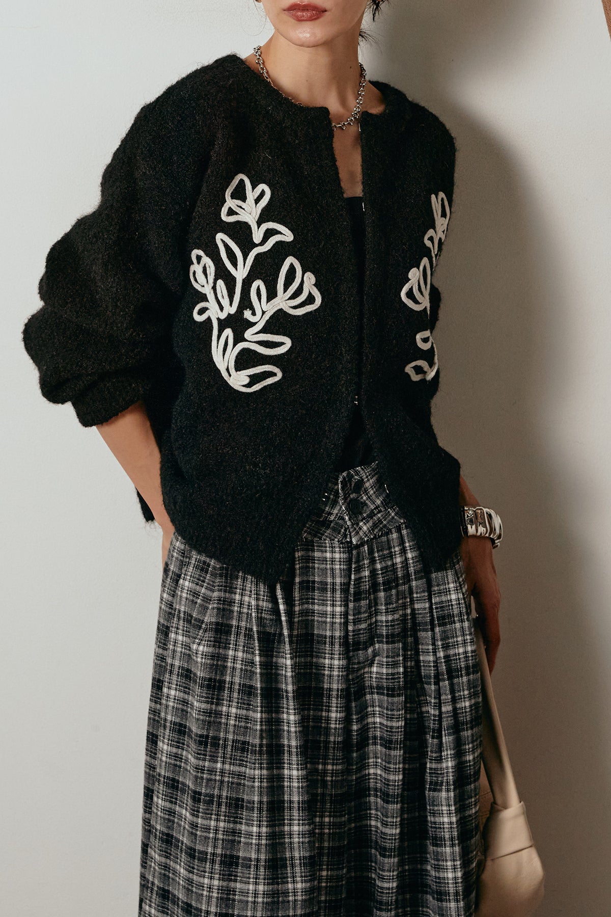 立体的なテープ刺繍が目を惹くニットカーディガン。ふんわりとした毛足のある素材がシーズンムードを高め、着心地も抜群です。フロントの刺繍デザインが華やかさをプラスし、シンプルなコーディネートに映える一枚。ボタンを留めてプルオーバー風に着ても、羽織りとしても楽しめます。