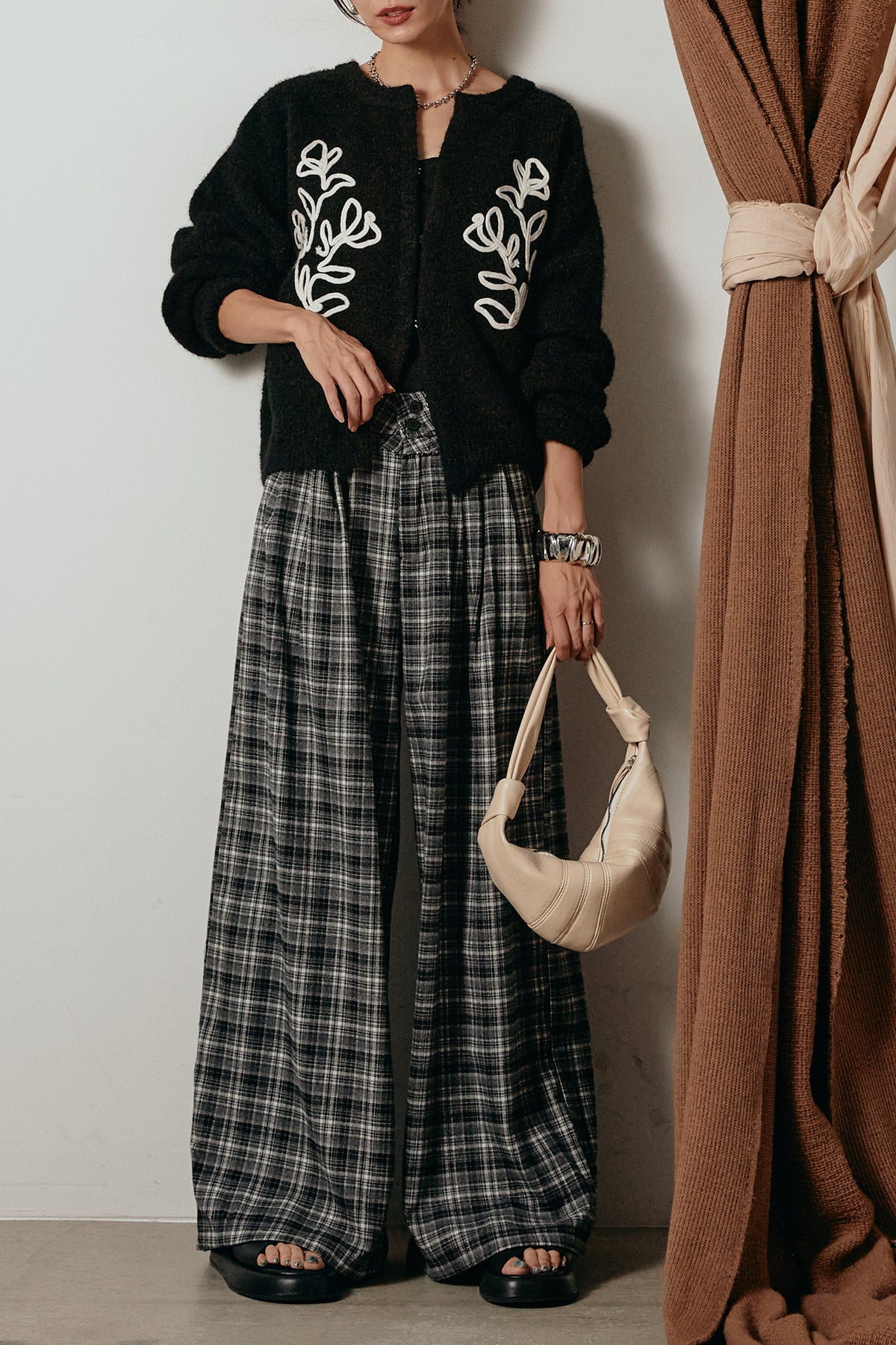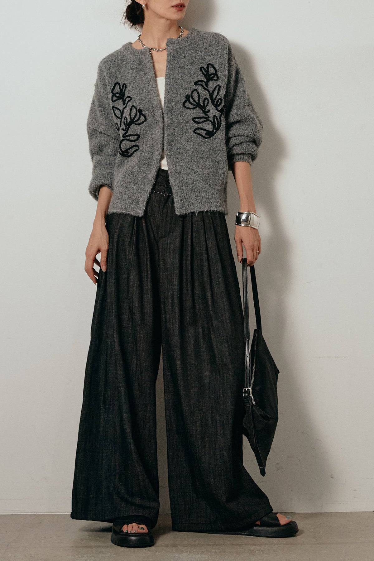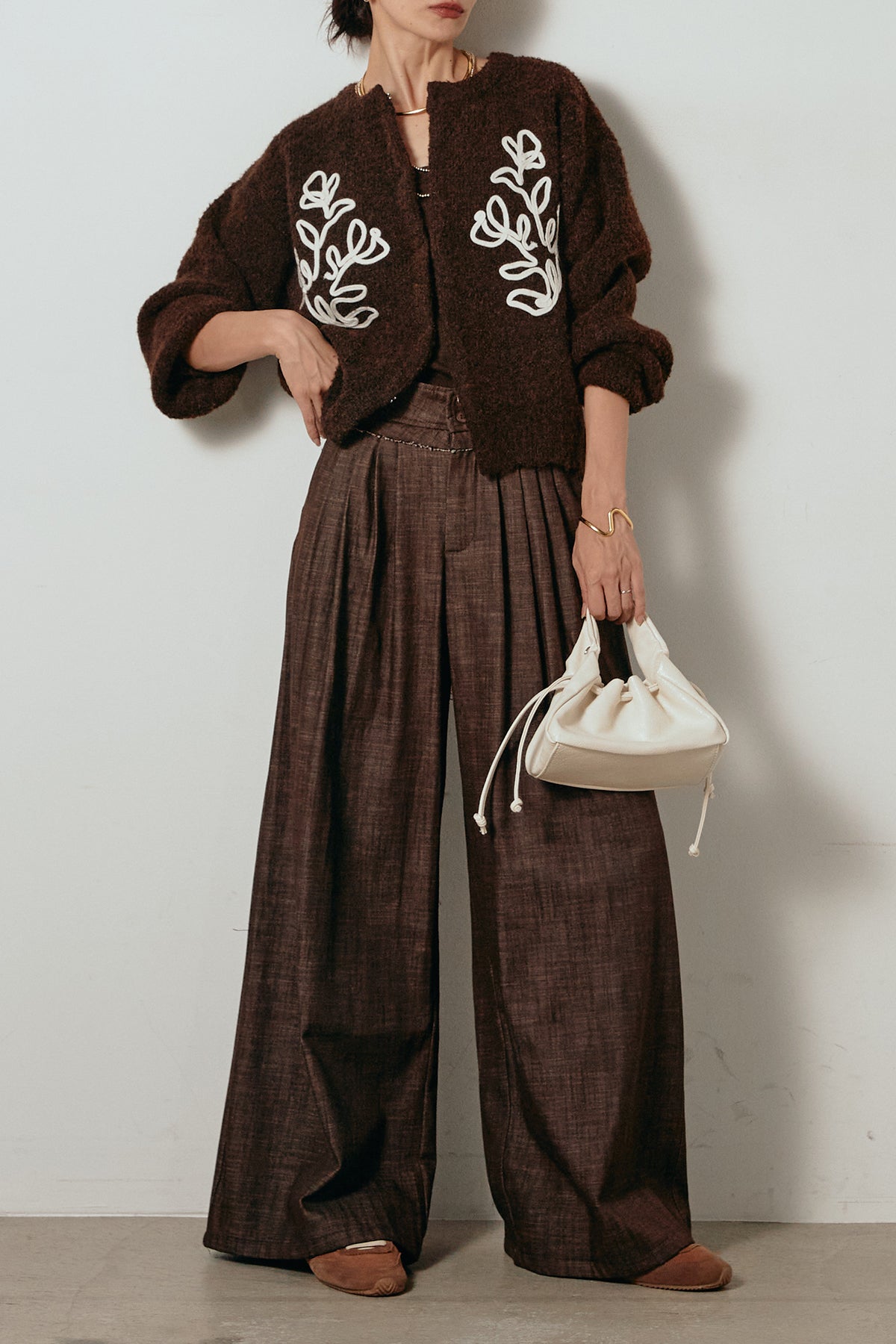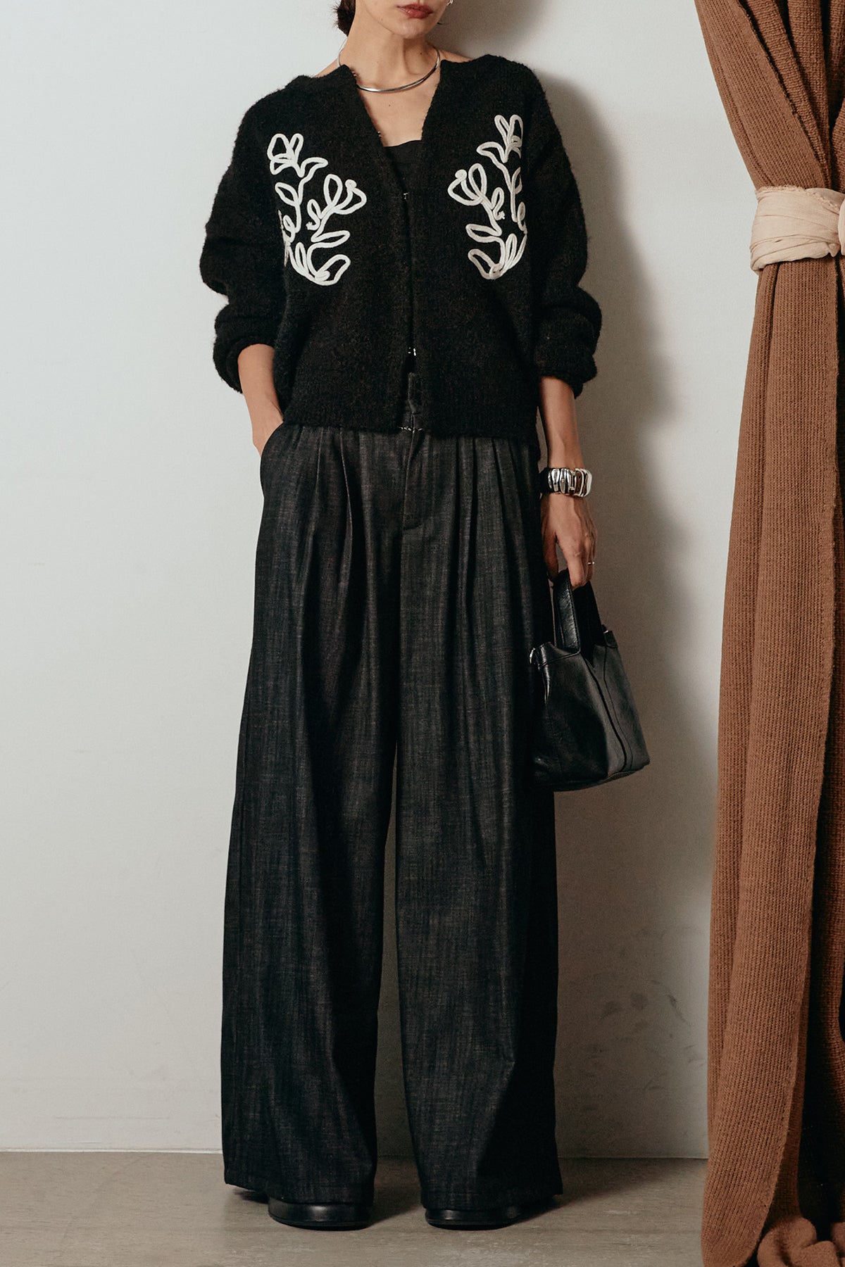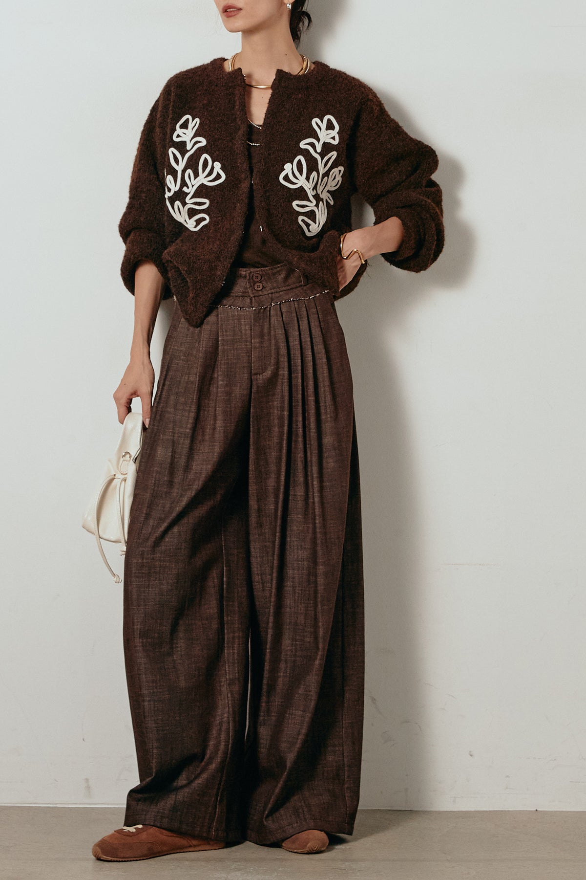 [SET]テープ刺繍ニットカーディガン+ウエスト切りっぱなしタックワイドパンツ(2set)