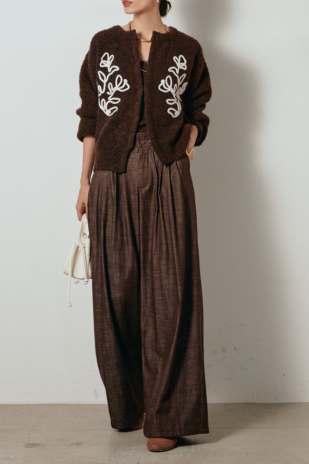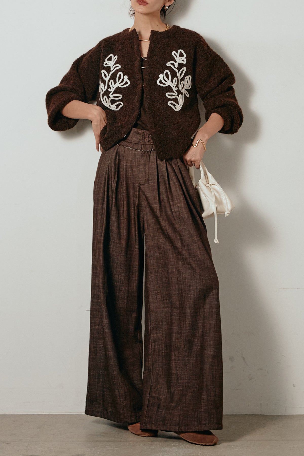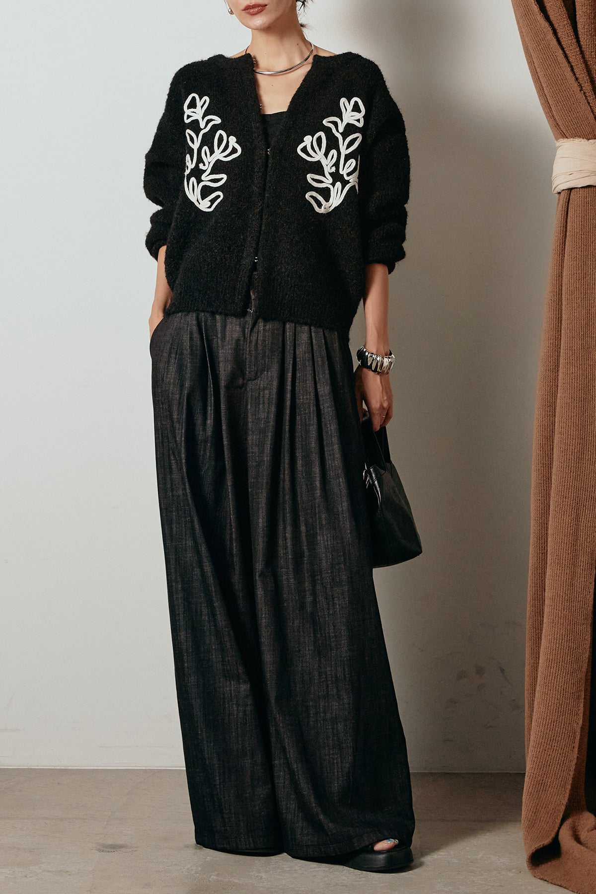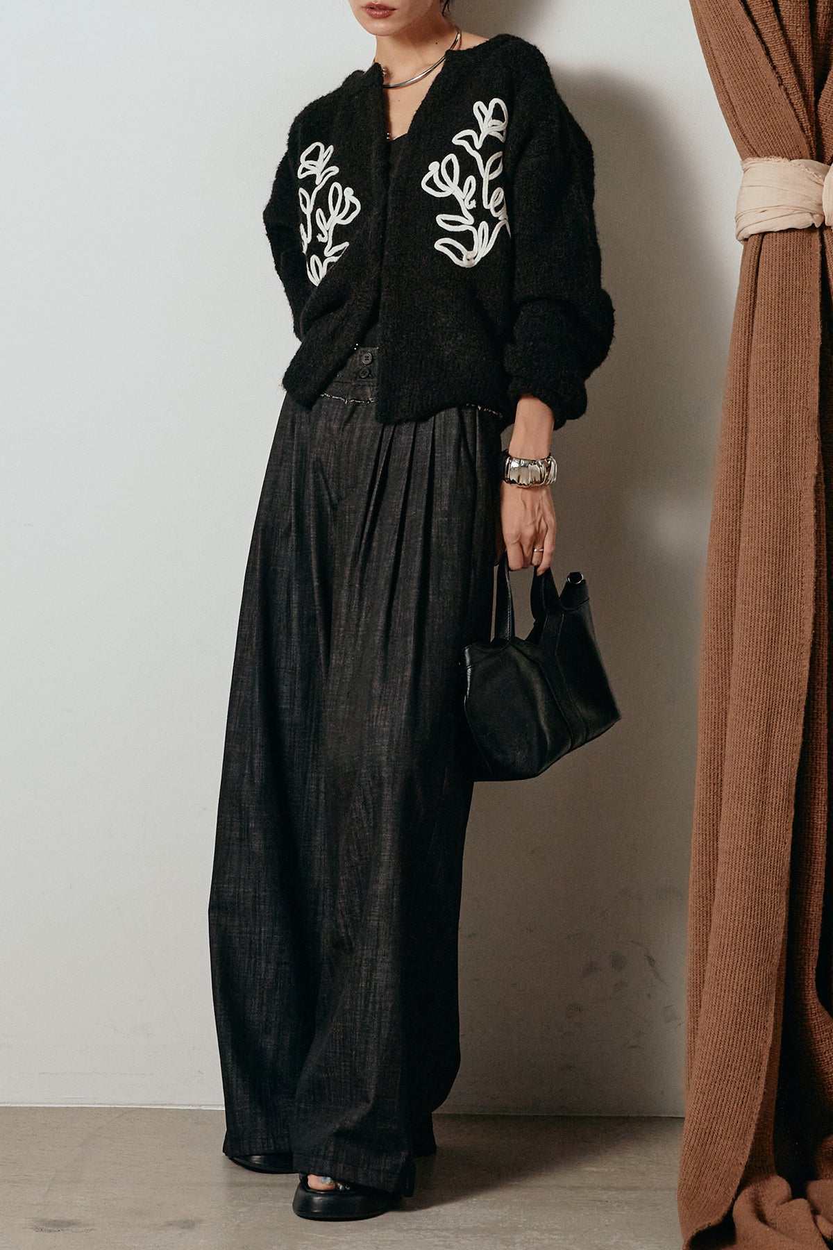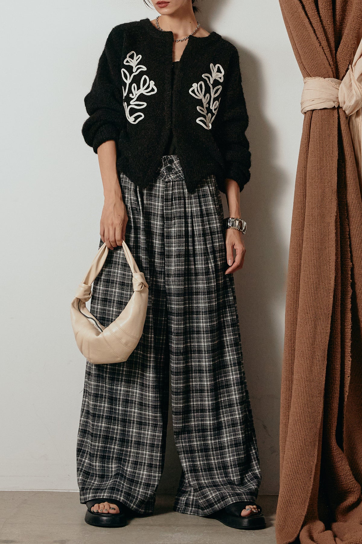 [SET]テープ刺繍ニットカーディガン+ウエスト切りっぱなしタックワイドパンツ(2set)