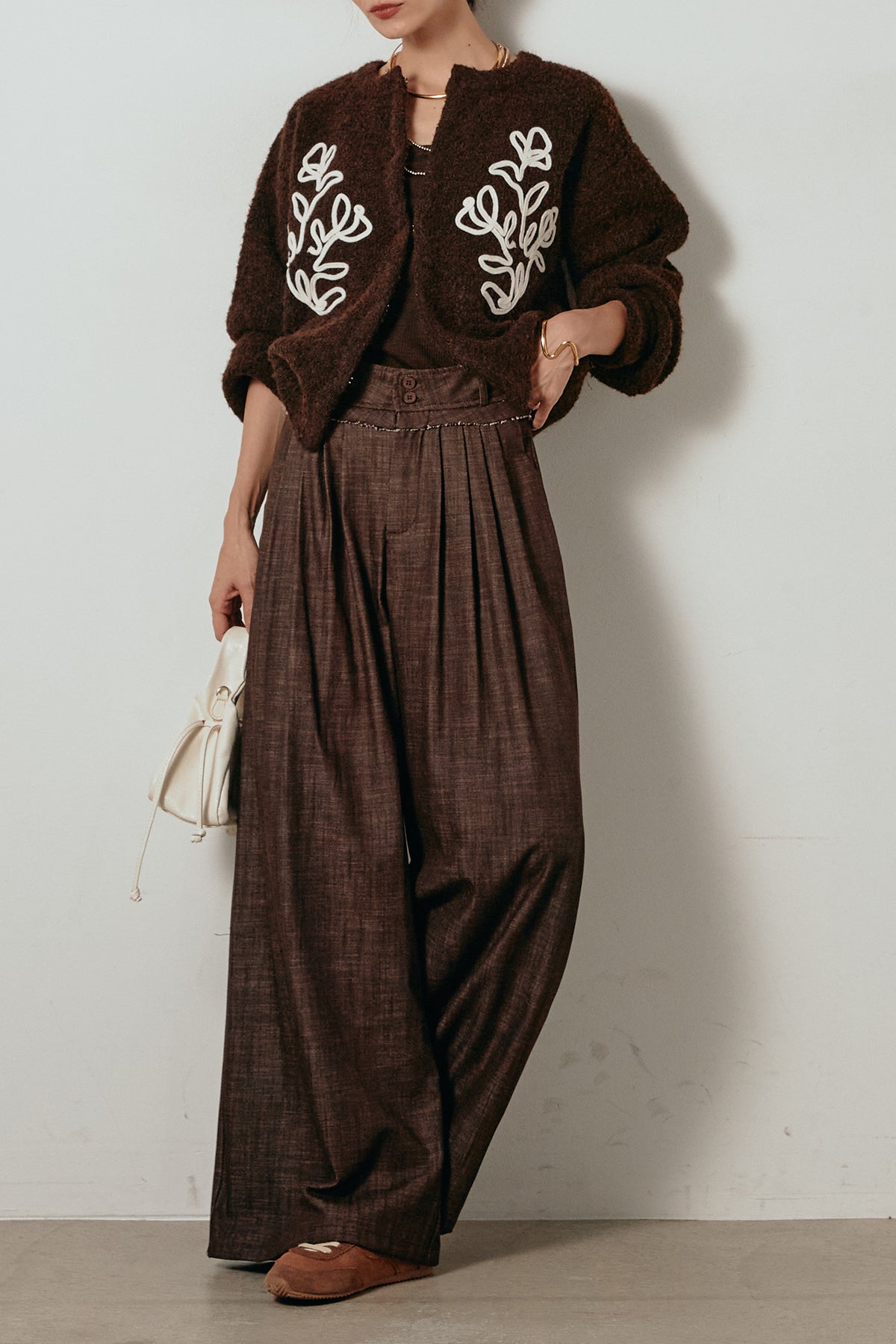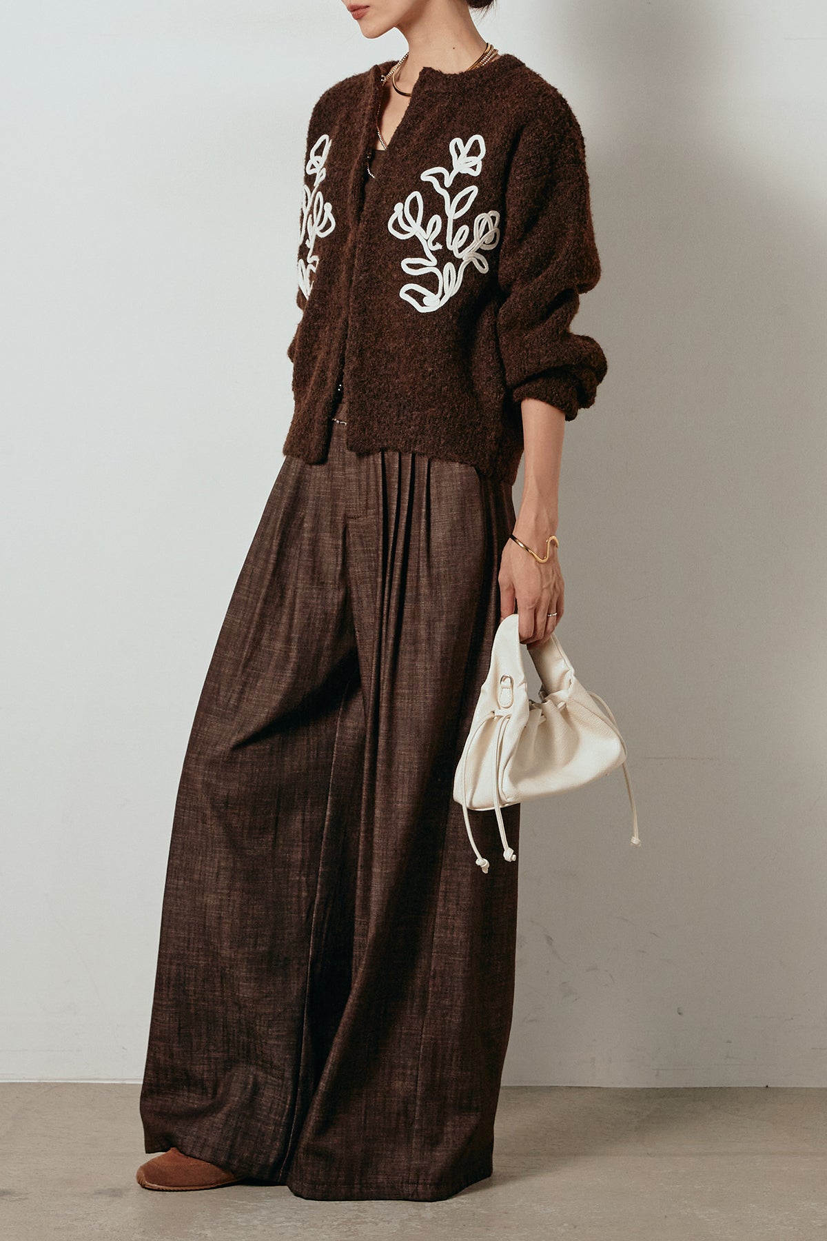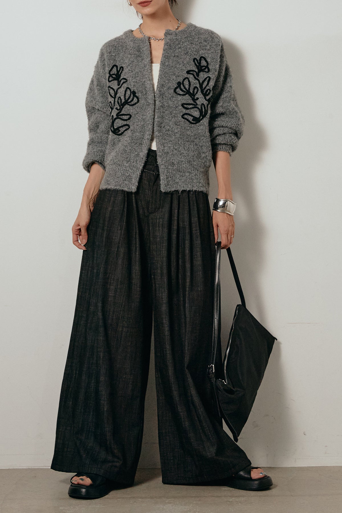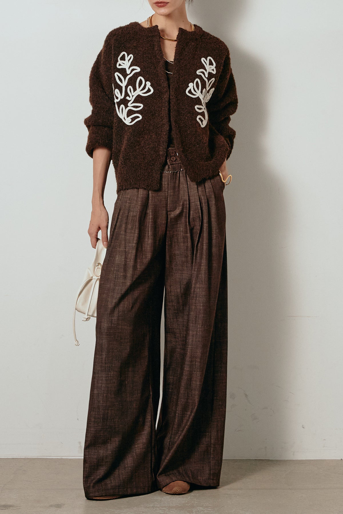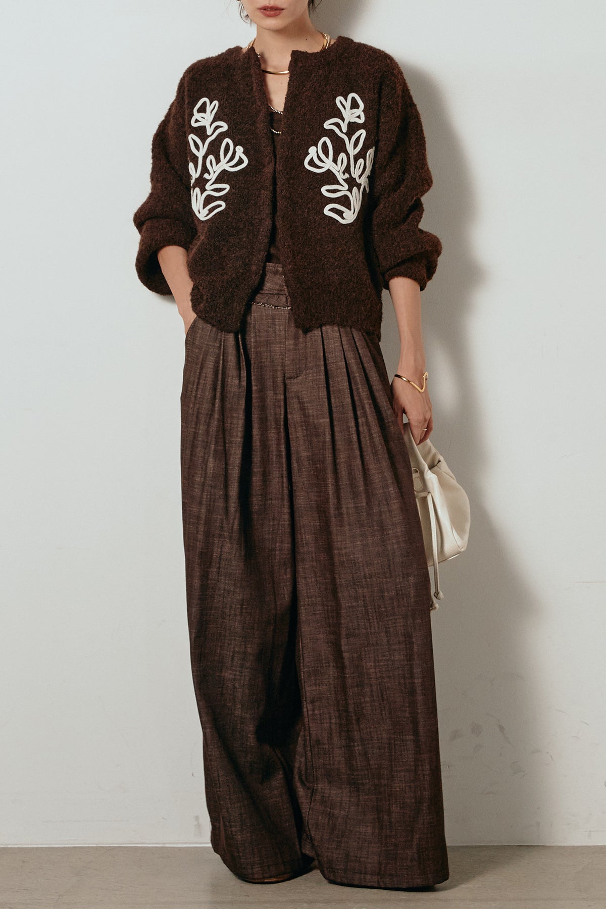 [SET]テープ刺繍ニットカーディガン+ウエスト切りっぱなしタックワイドパンツ(2set)
