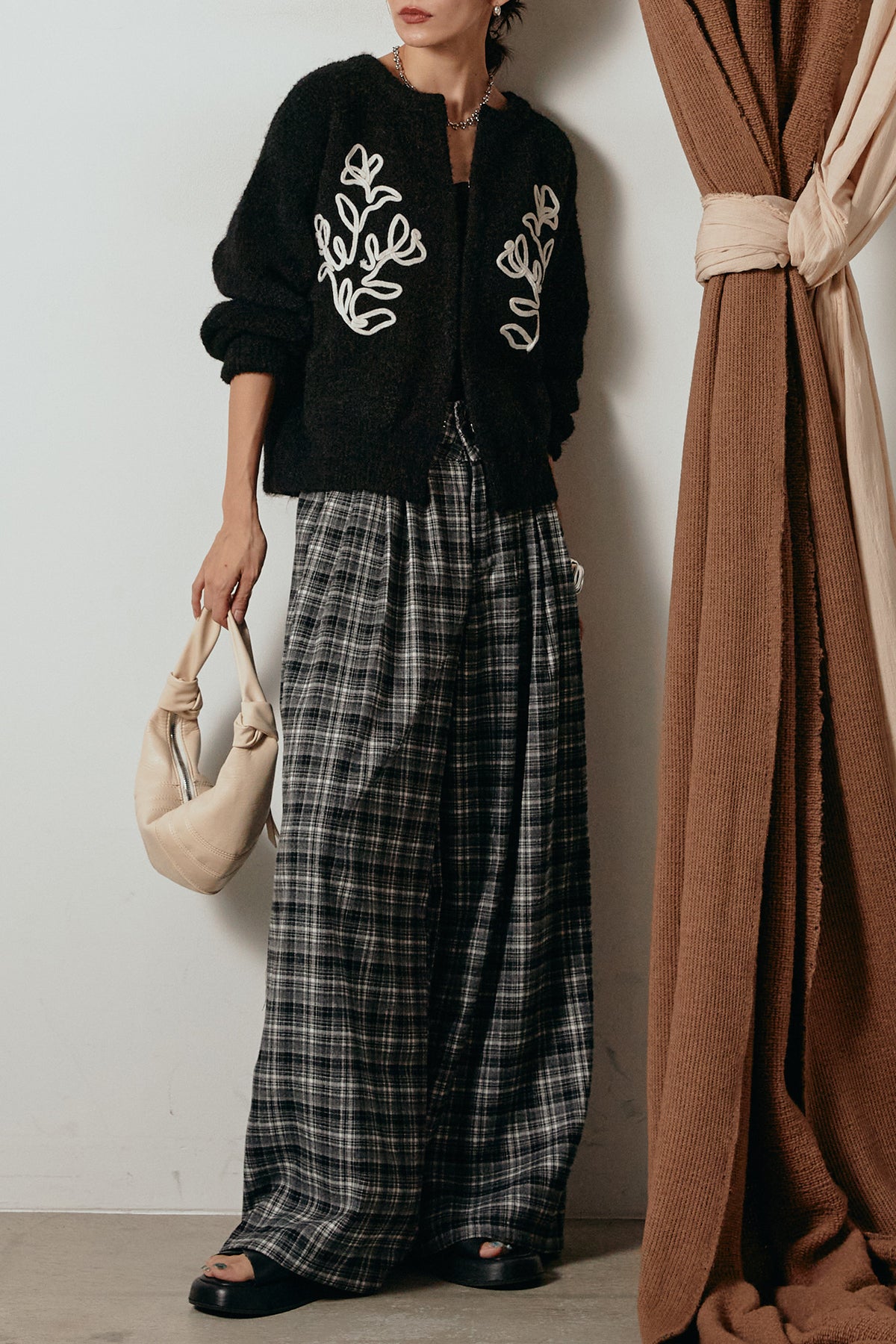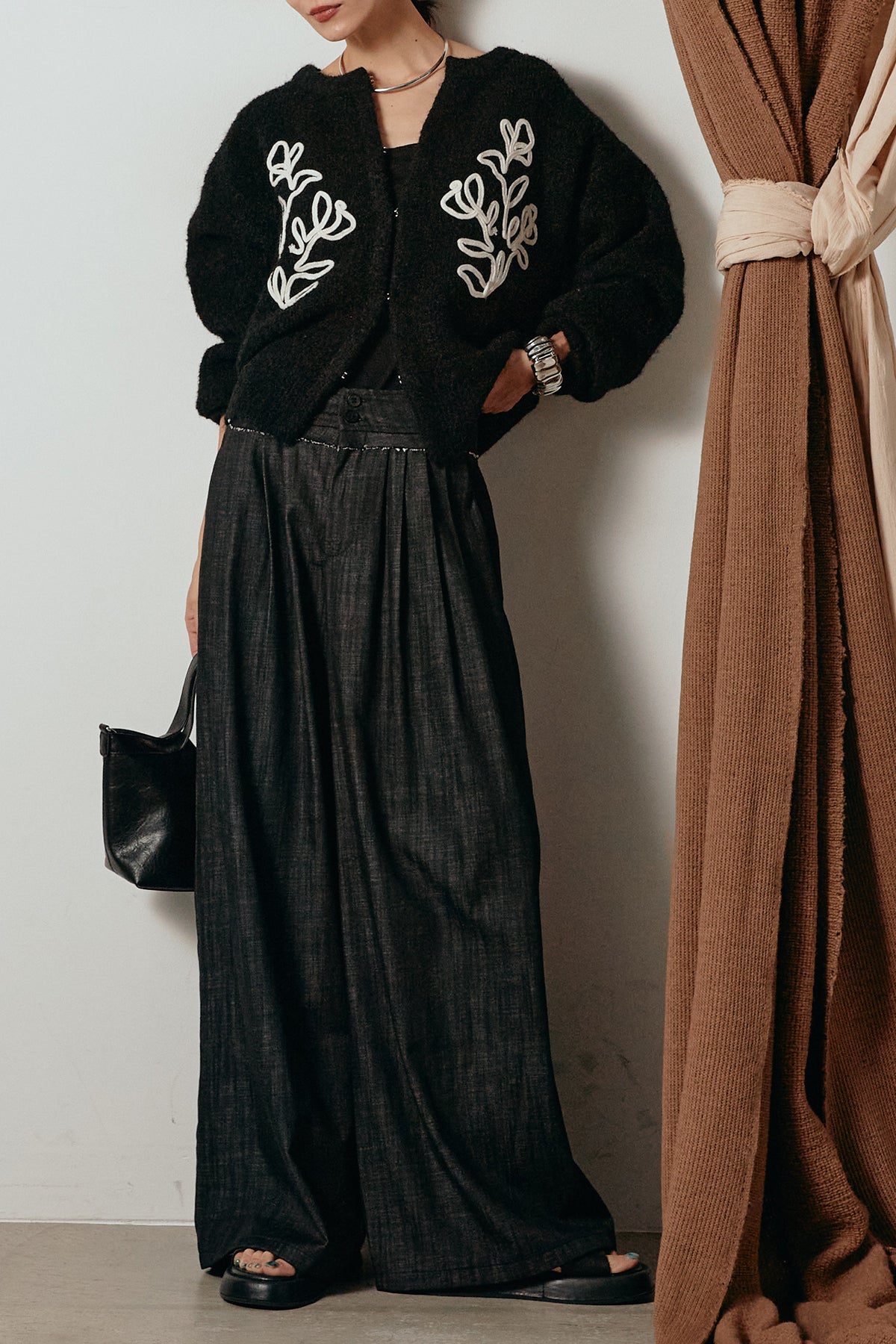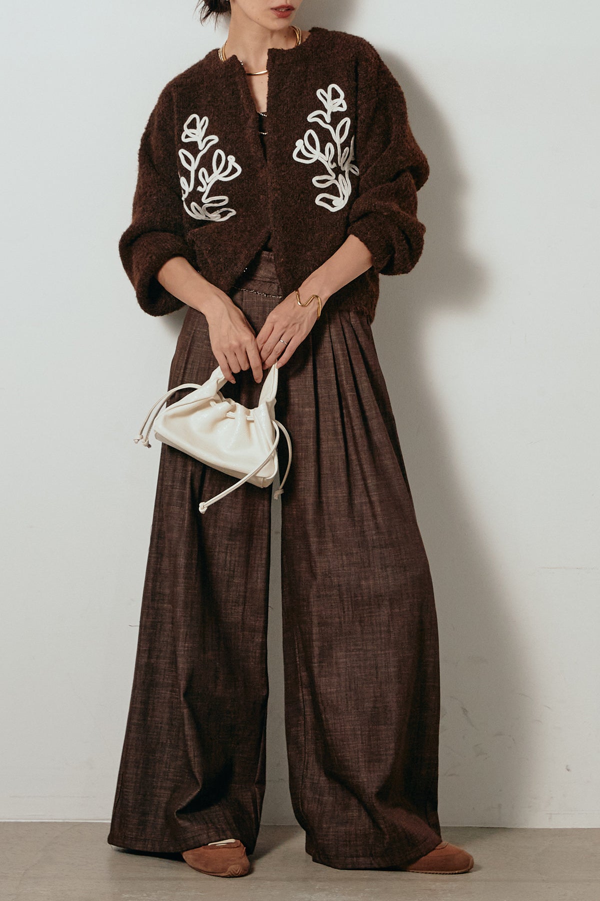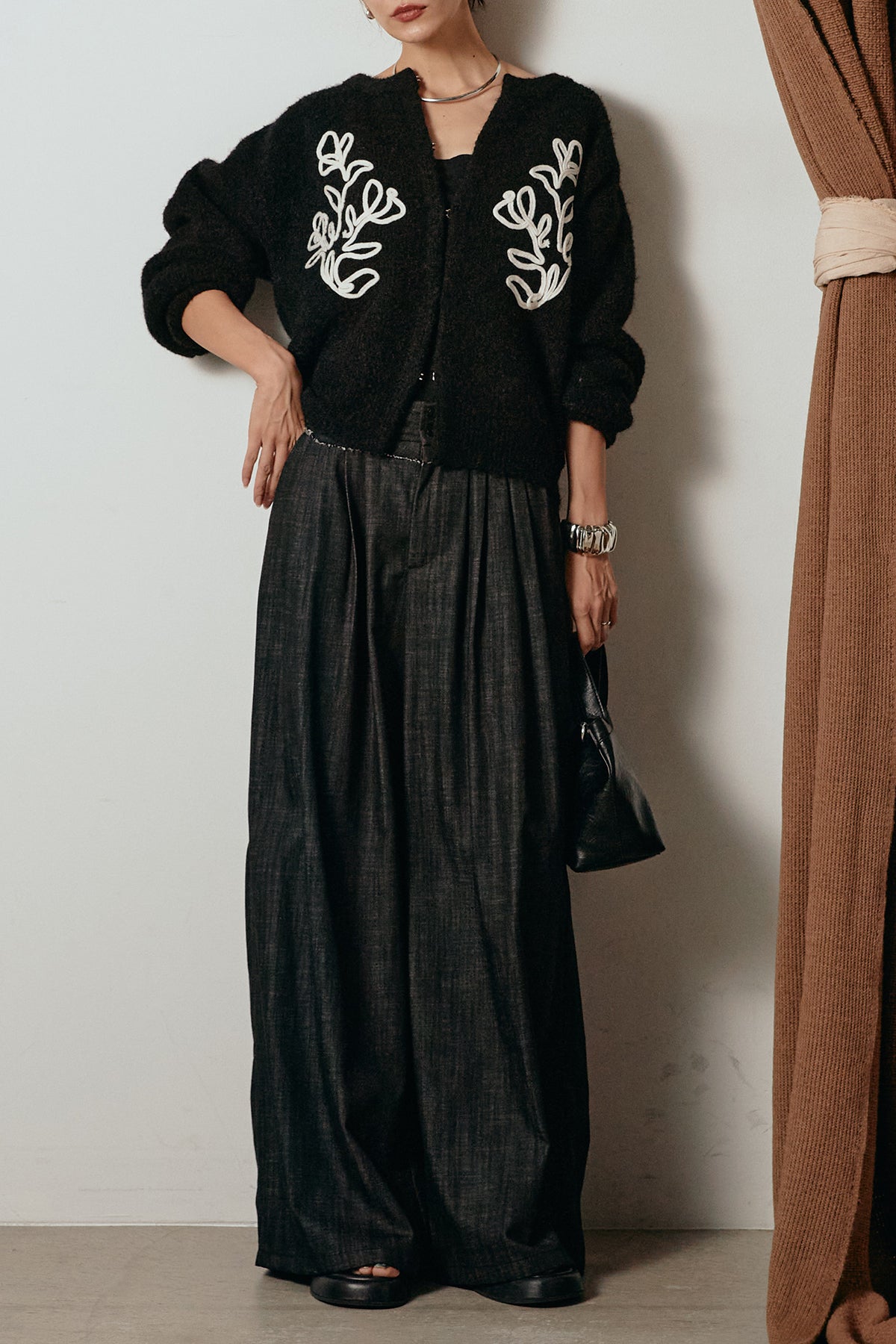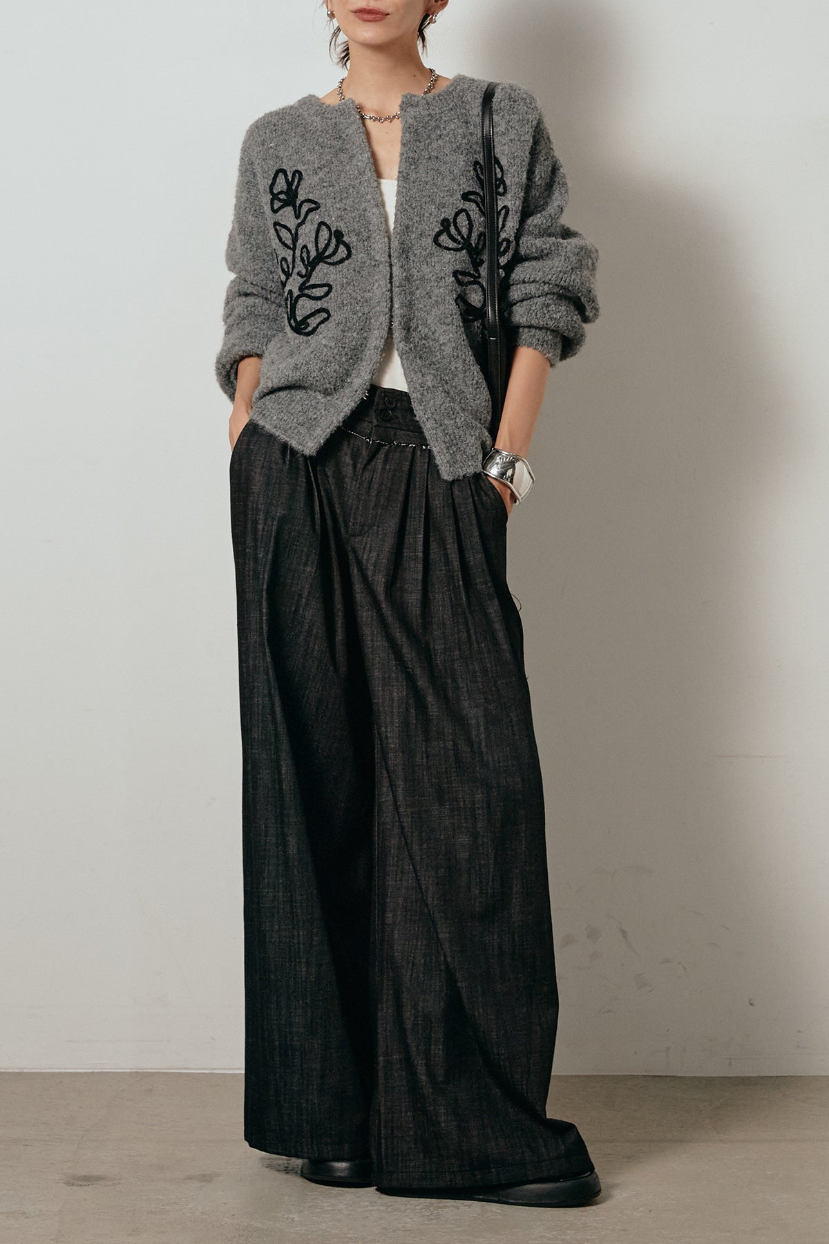 [SET]テープ刺繍ニットカーディガン+ウエスト切りっぱなしタックワイドパンツ(2set)