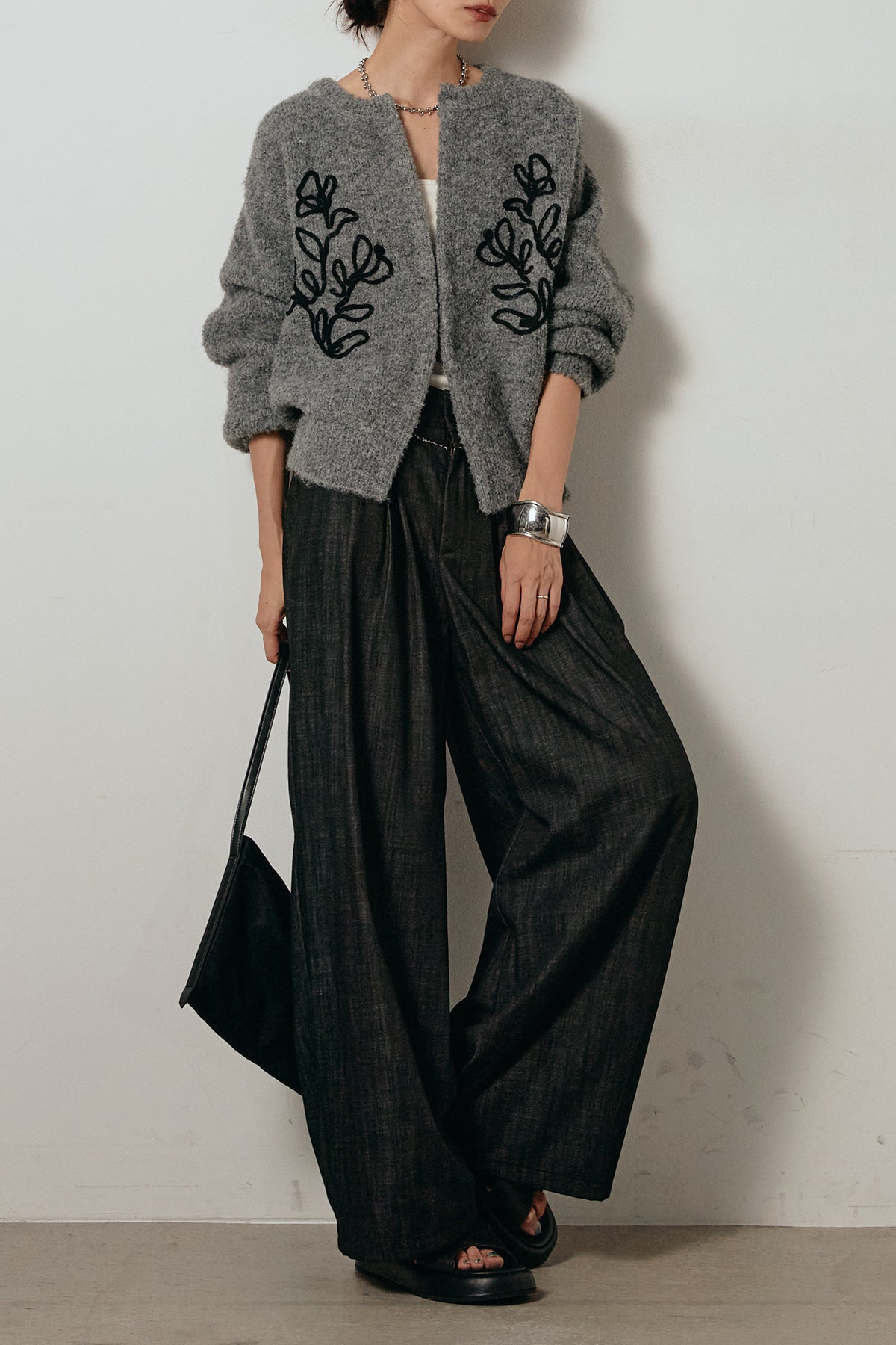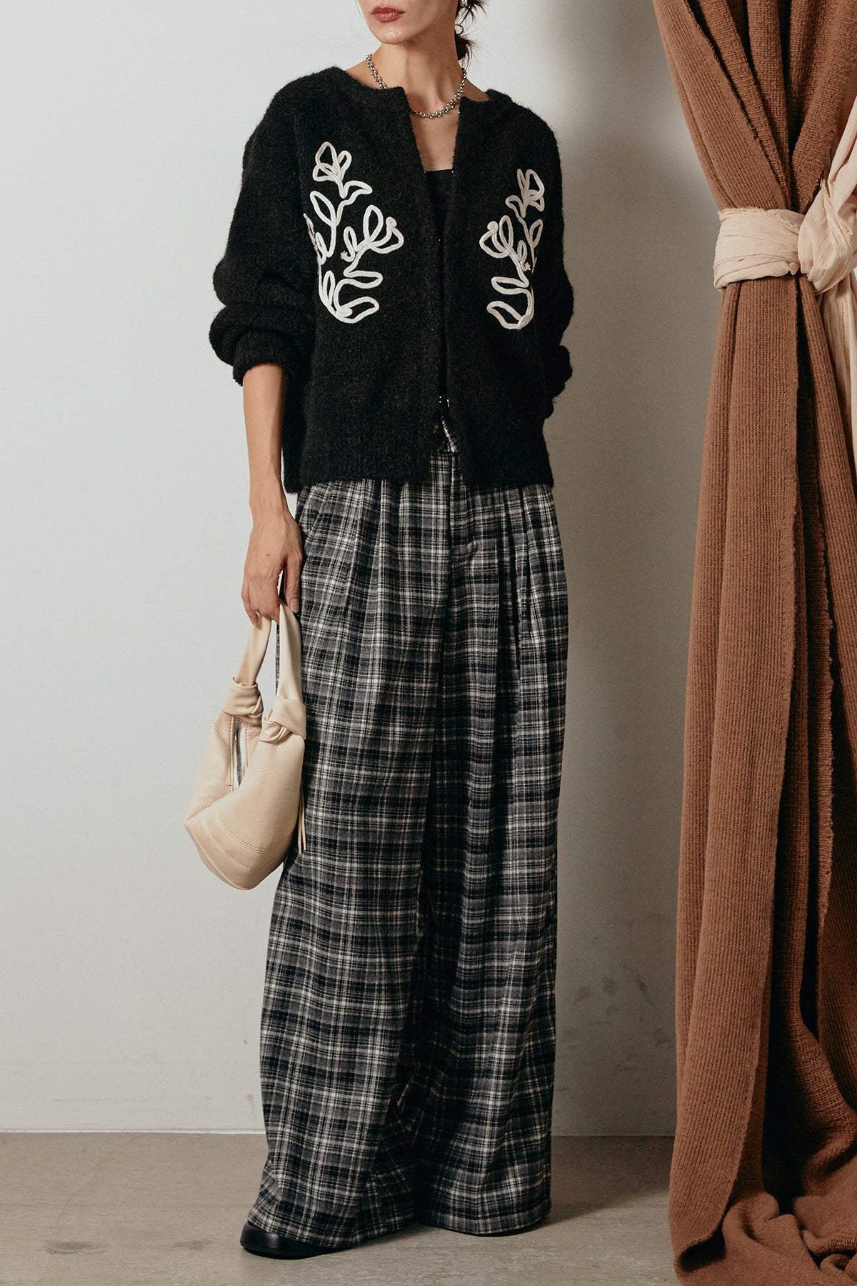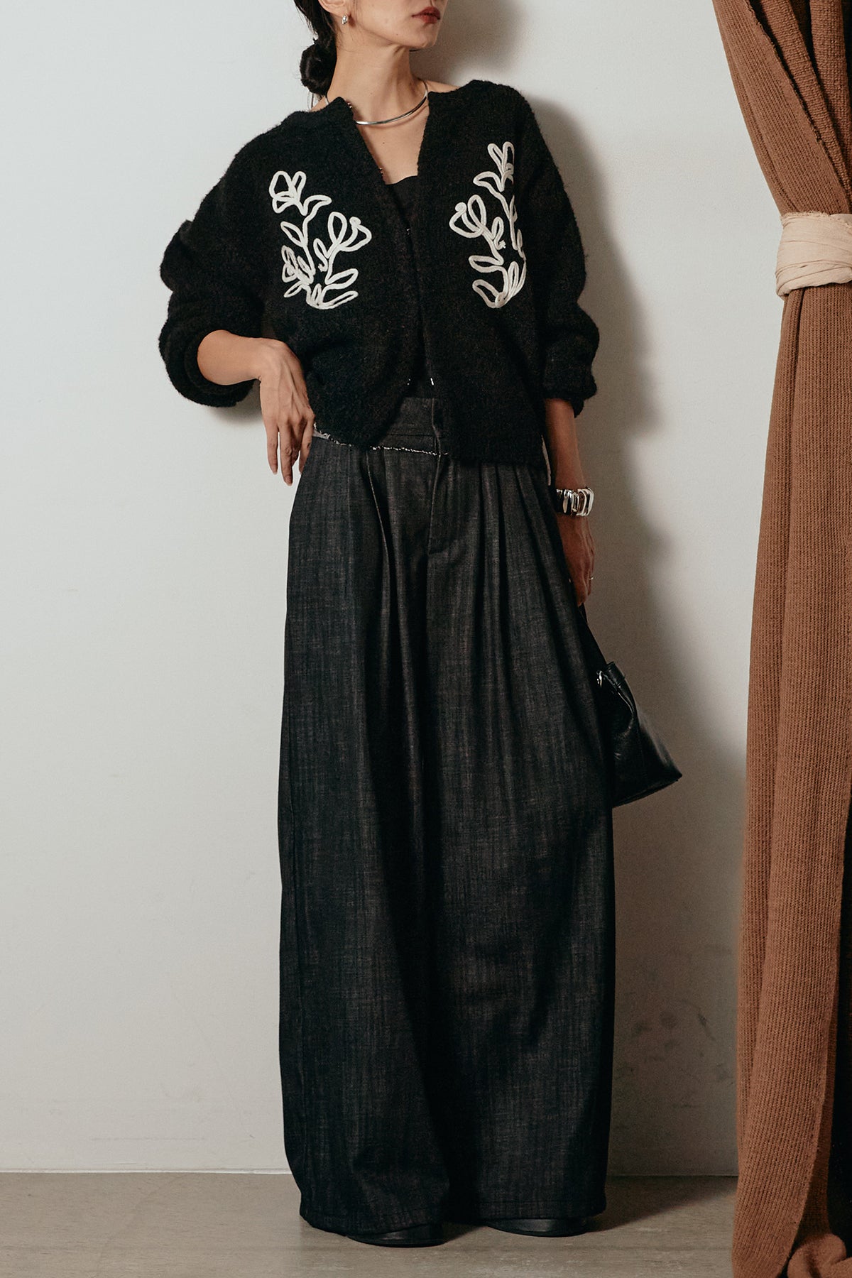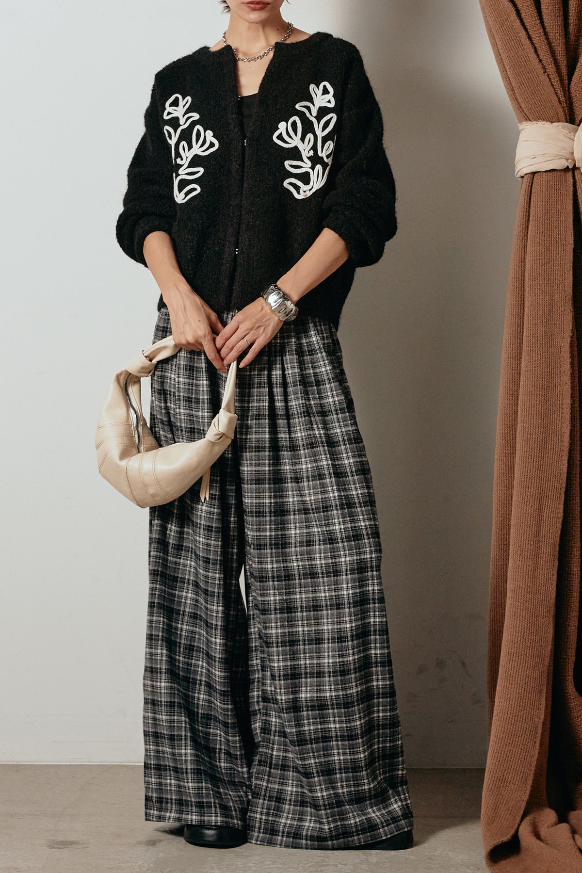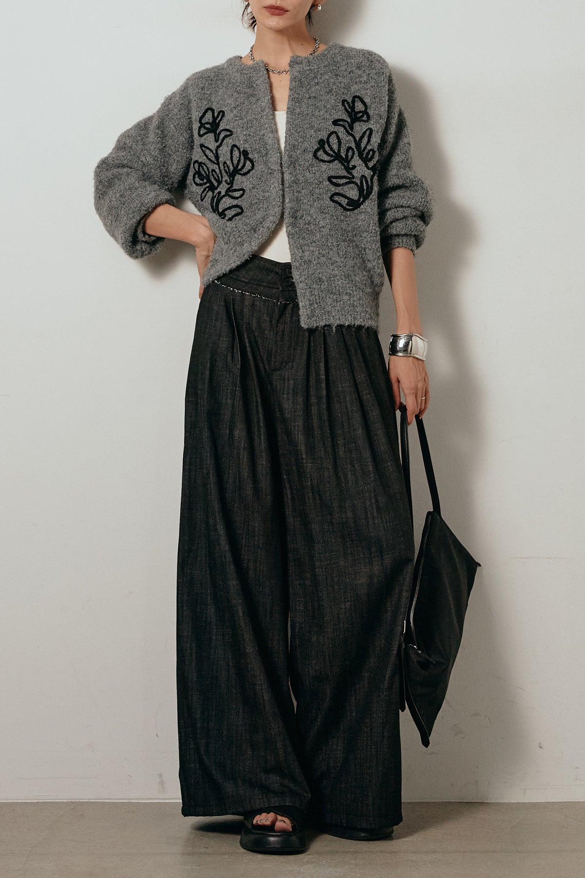 [SET]テープ刺繍ニットカーディガン+ウエスト切りっぱなしタックワイドパンツ(2set)