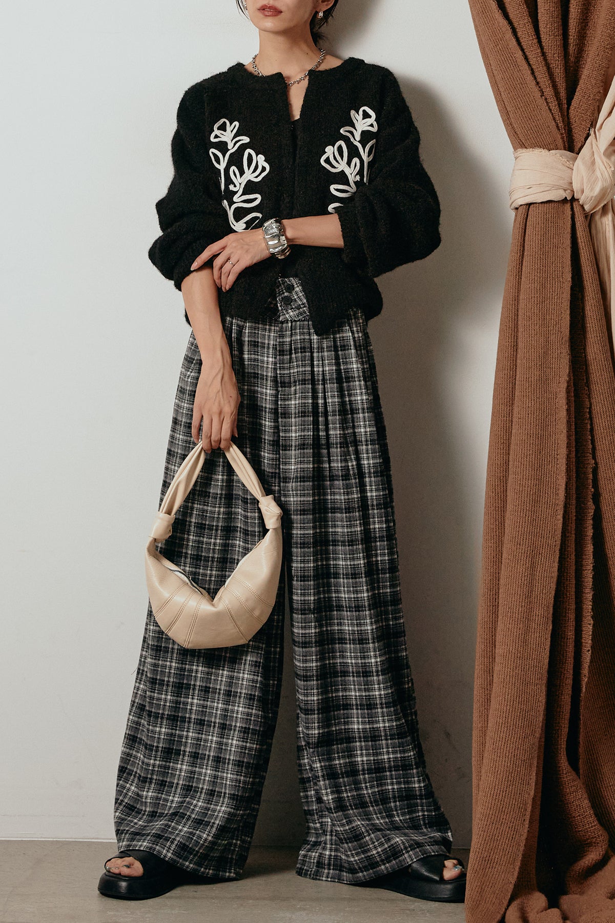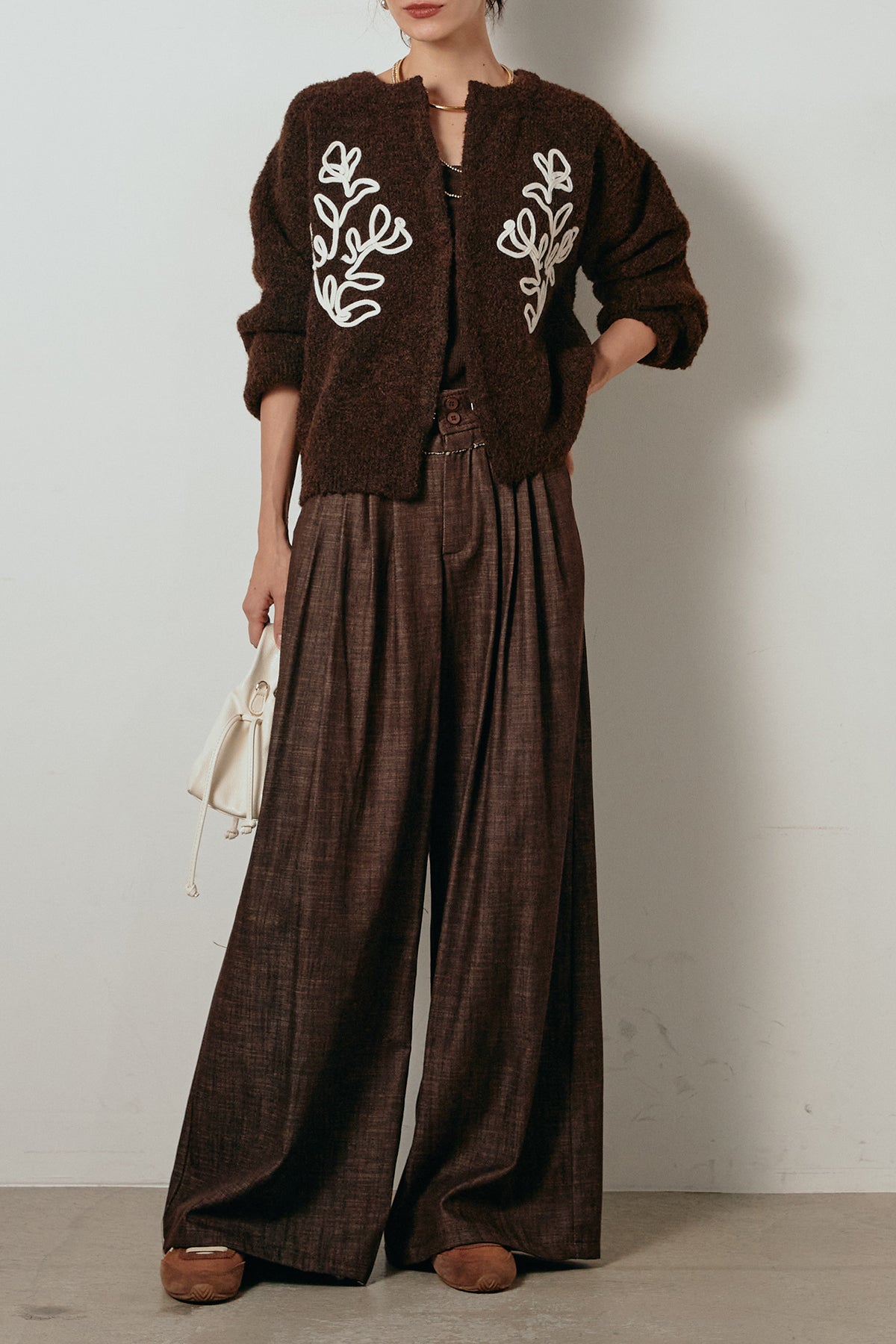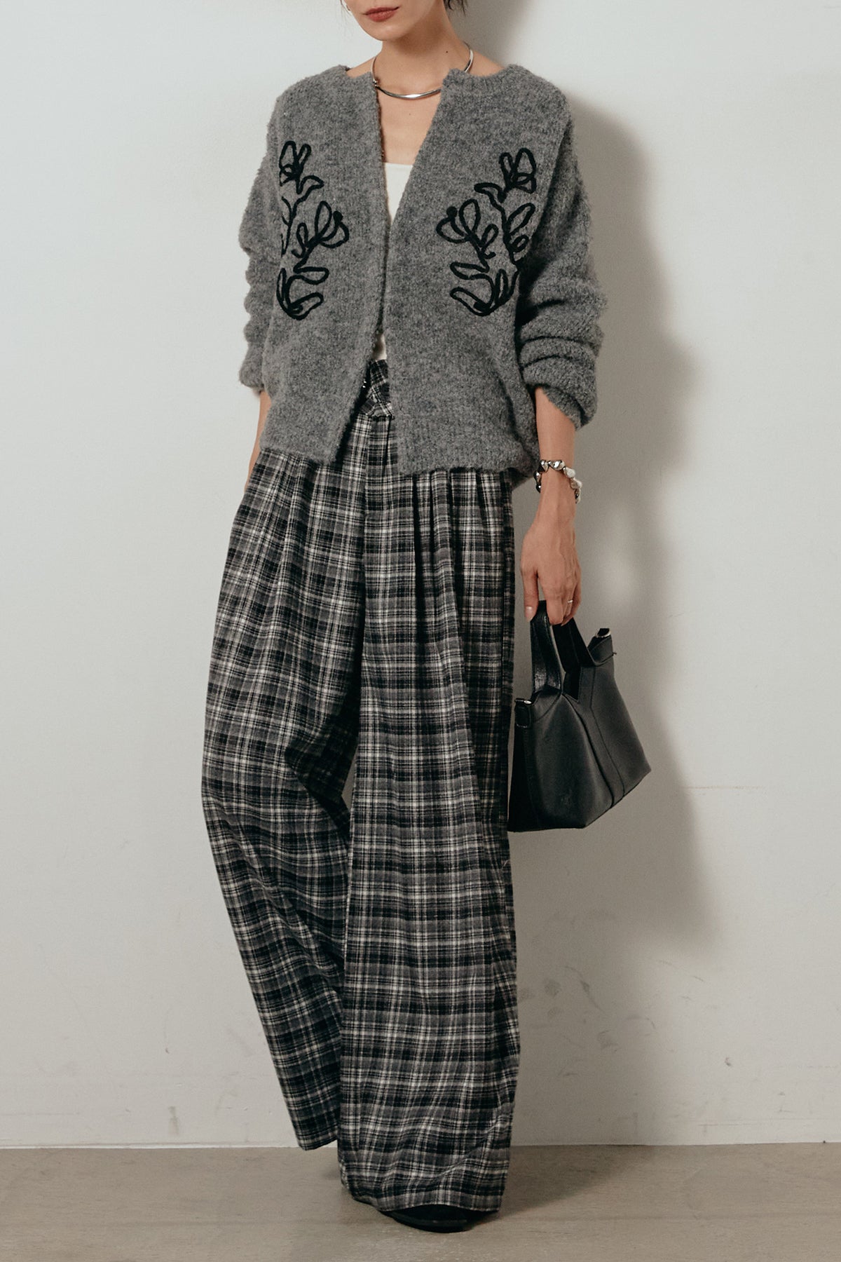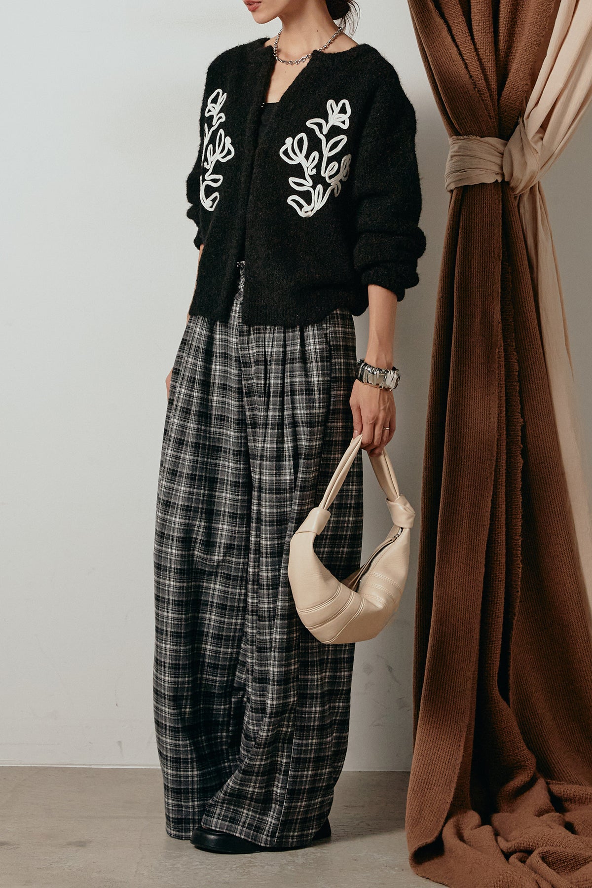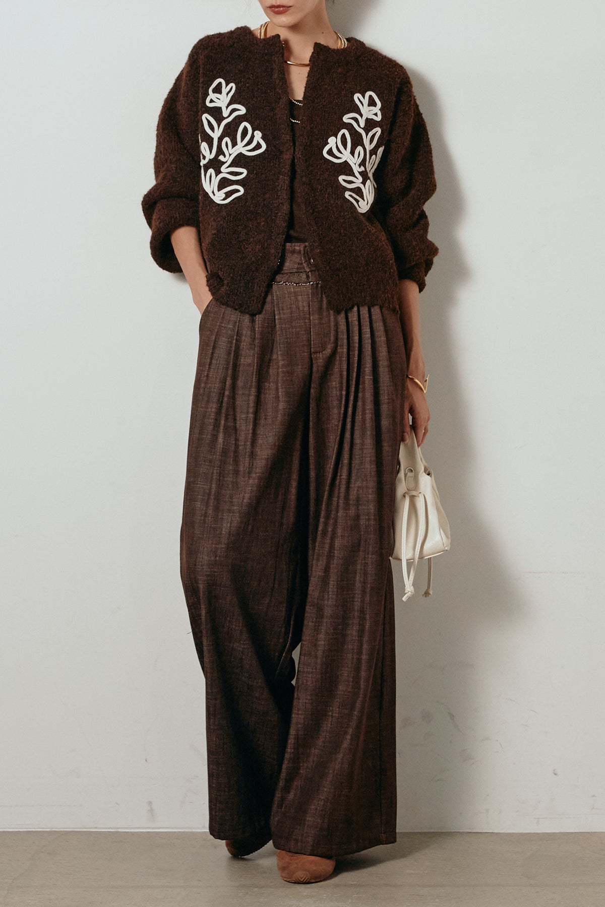 [SET]テープ刺繍ニットカーディガン+ウエスト切りっぱなしタックワイドパンツ(2set)