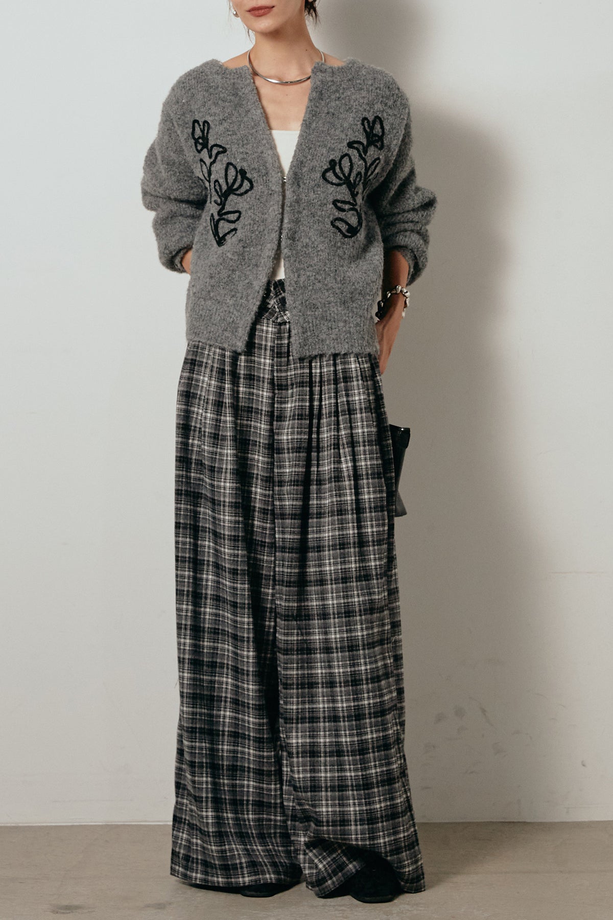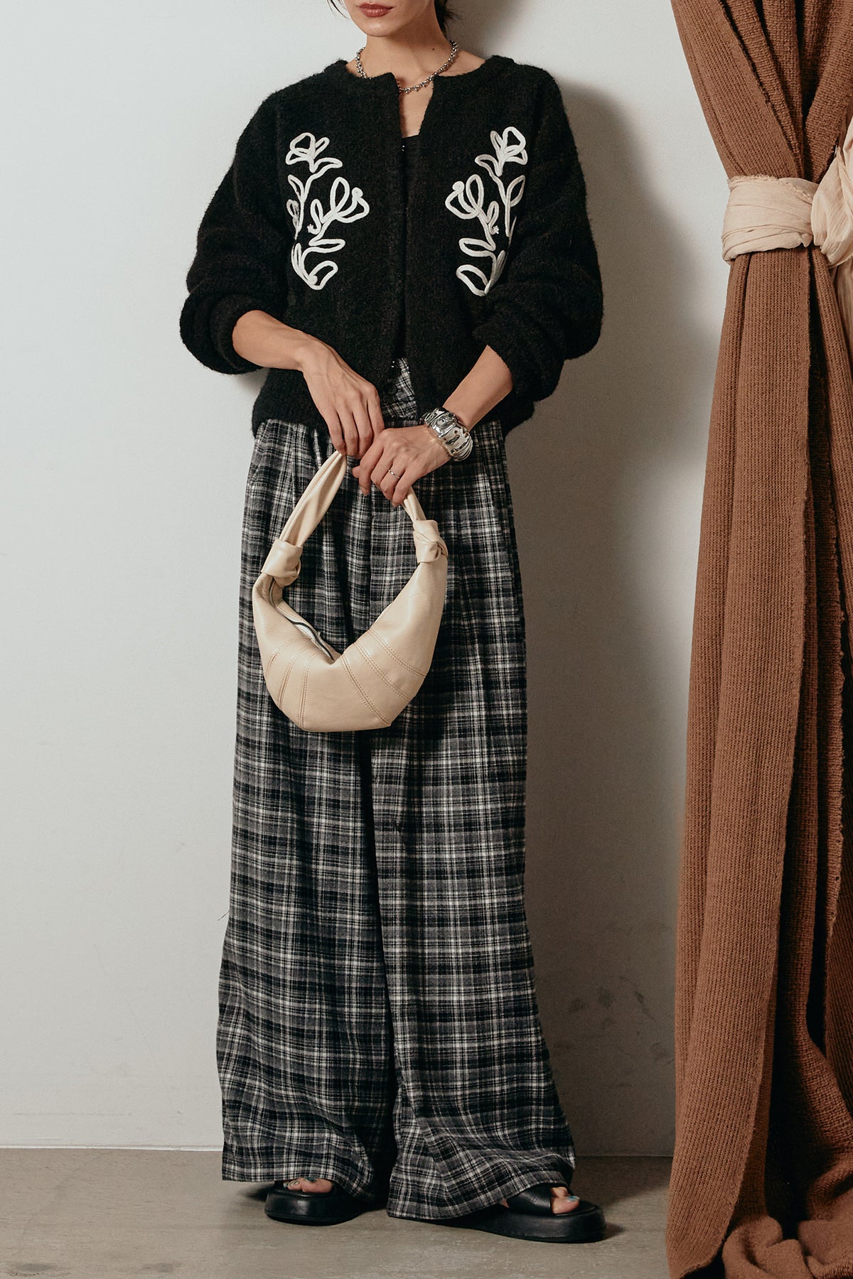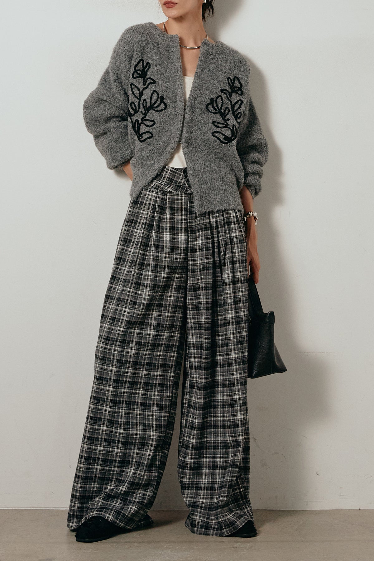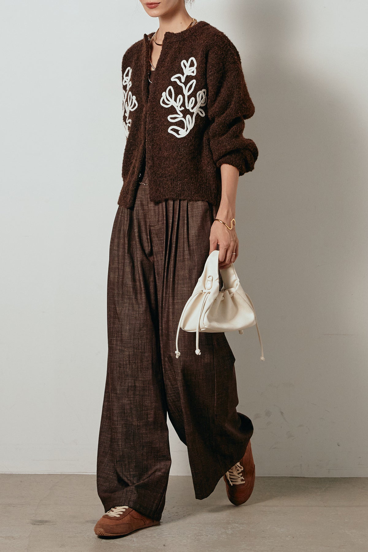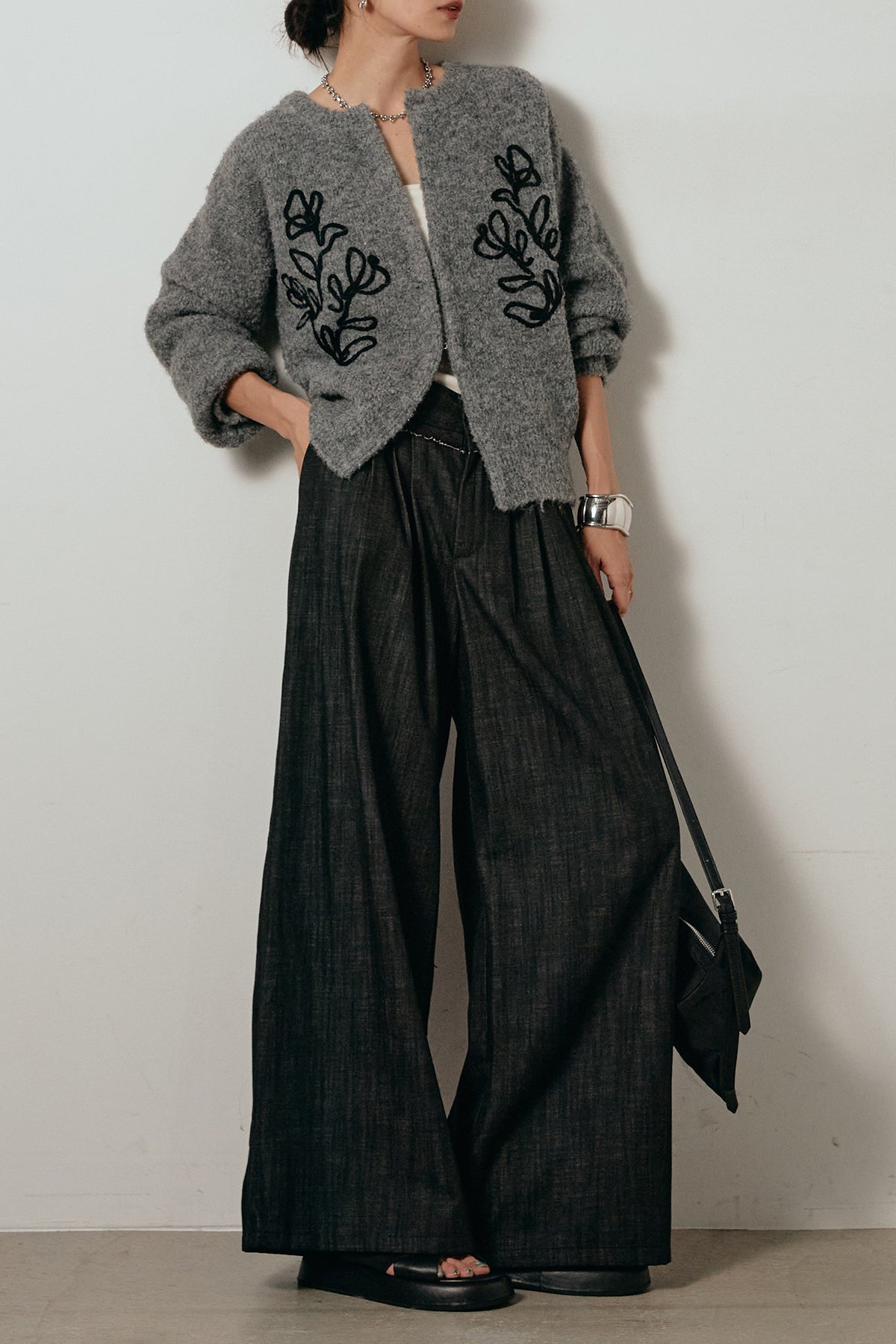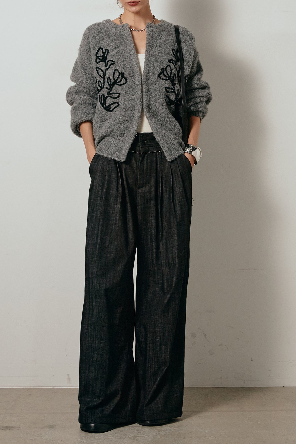 [SET]テープ刺繍ニットカーディガン+ウエスト切りっぱなしタックワイドパンツ(2set)