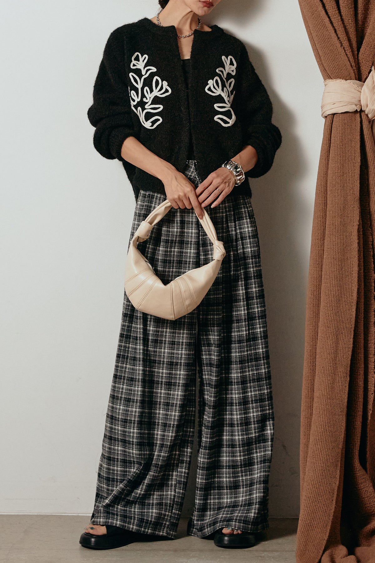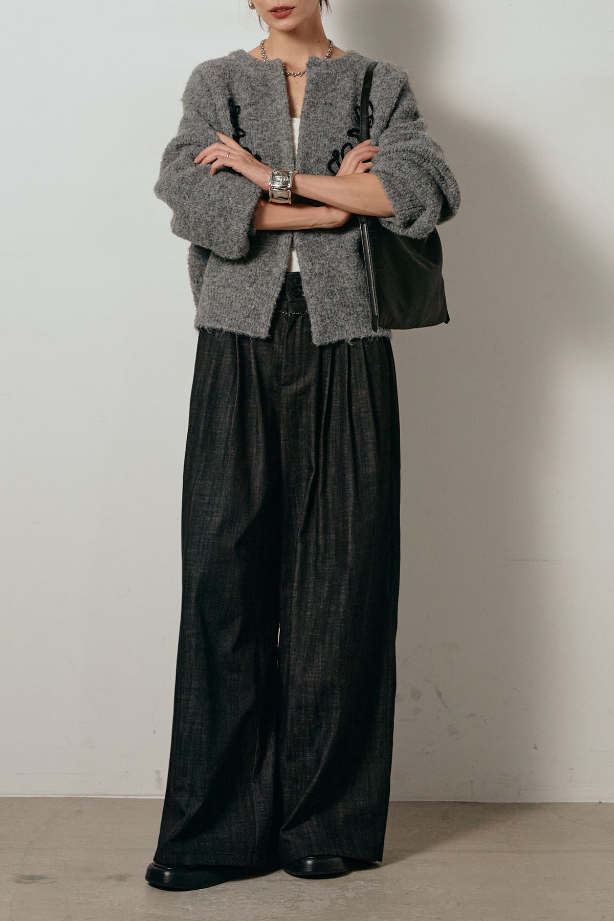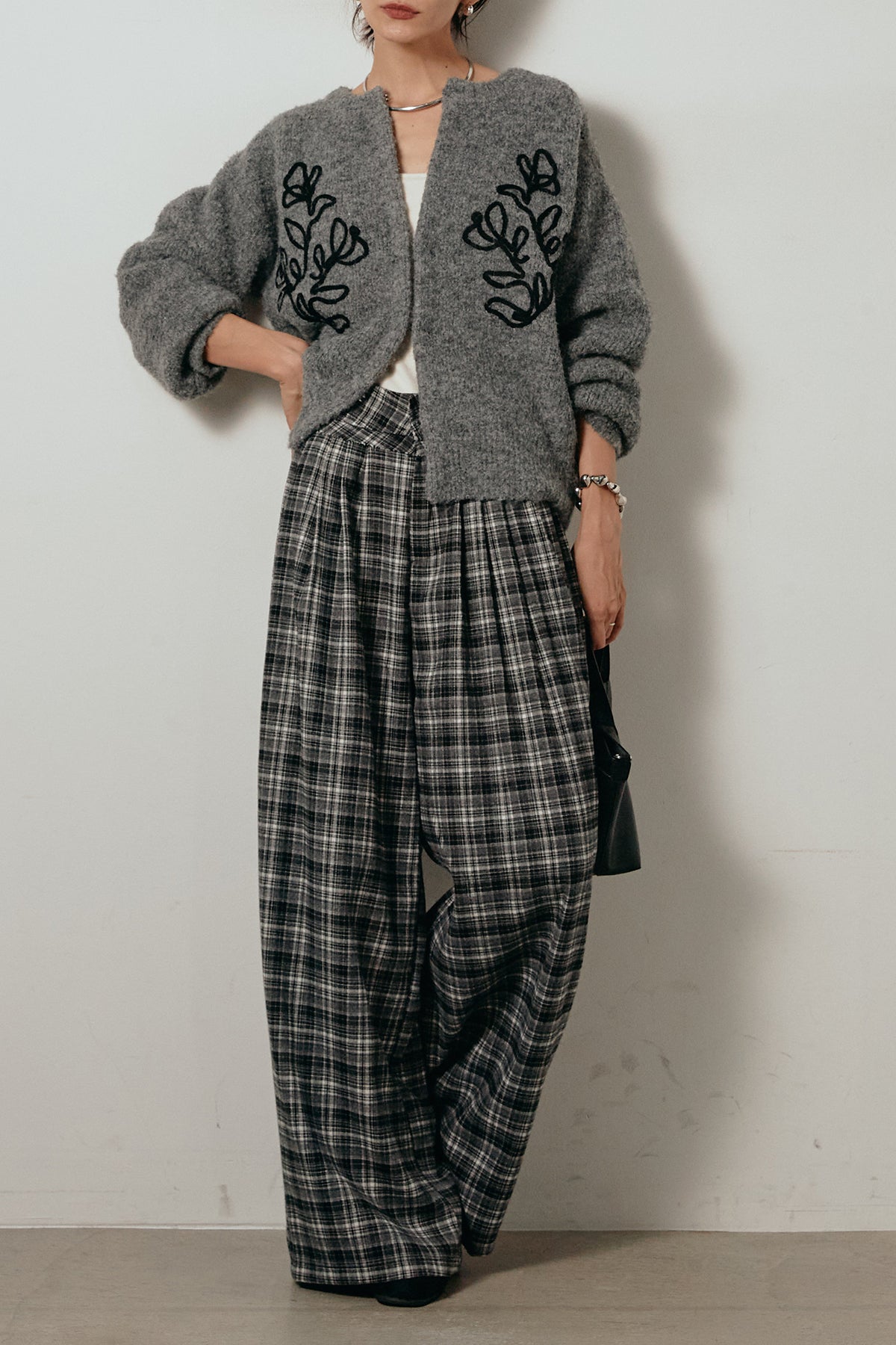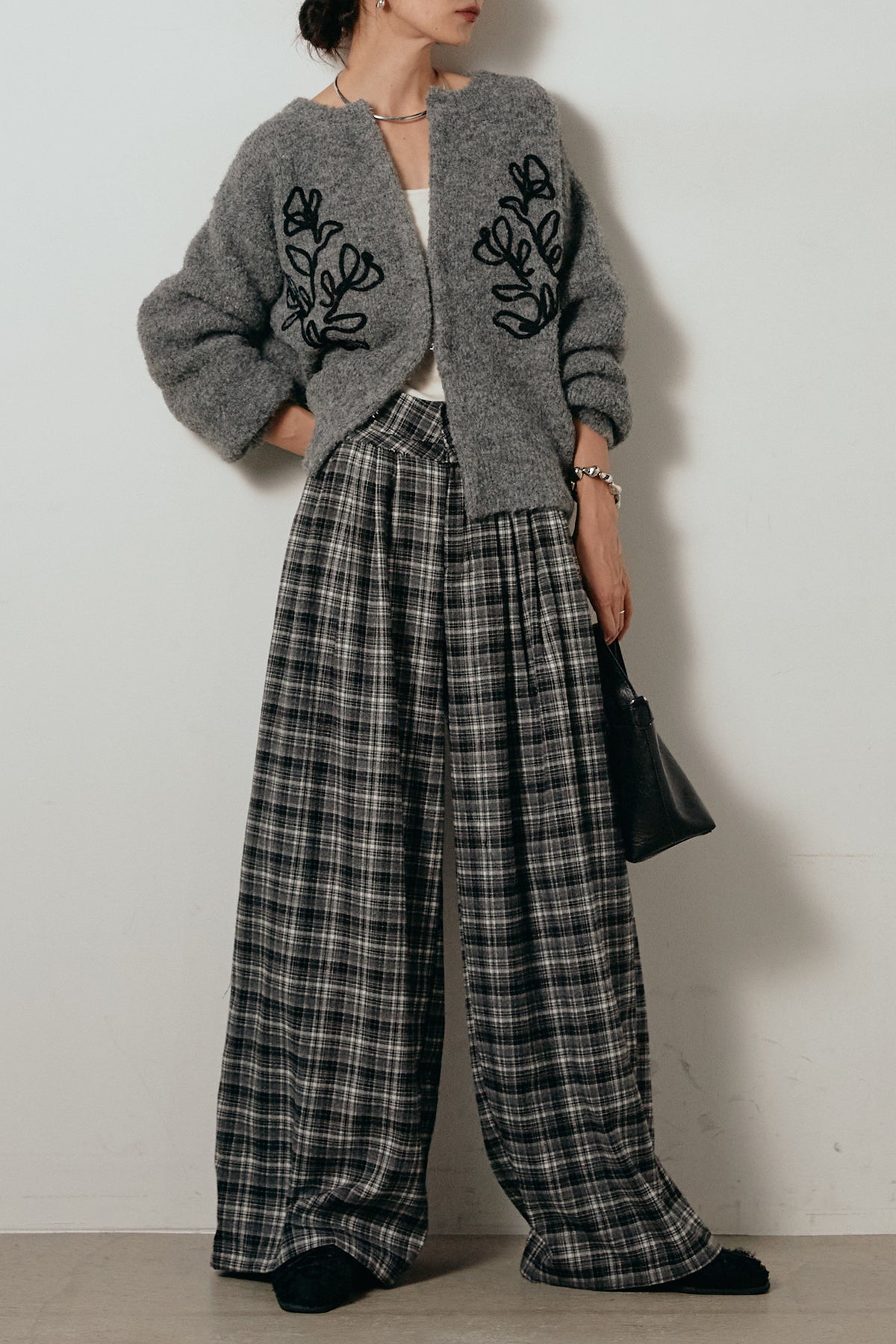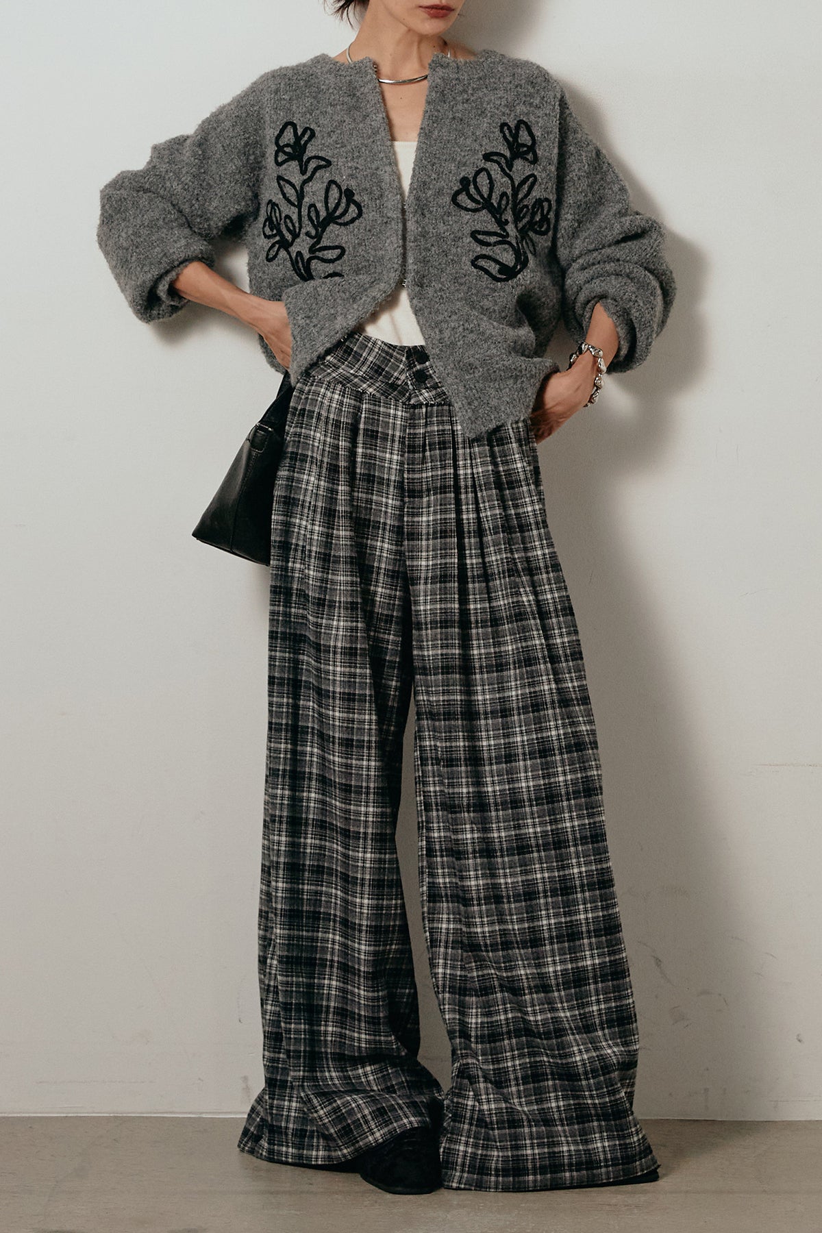[SET]テープ刺繍ニットカーディガン+ウエスト切りっぱなしタックワイドパンツ(2set)
