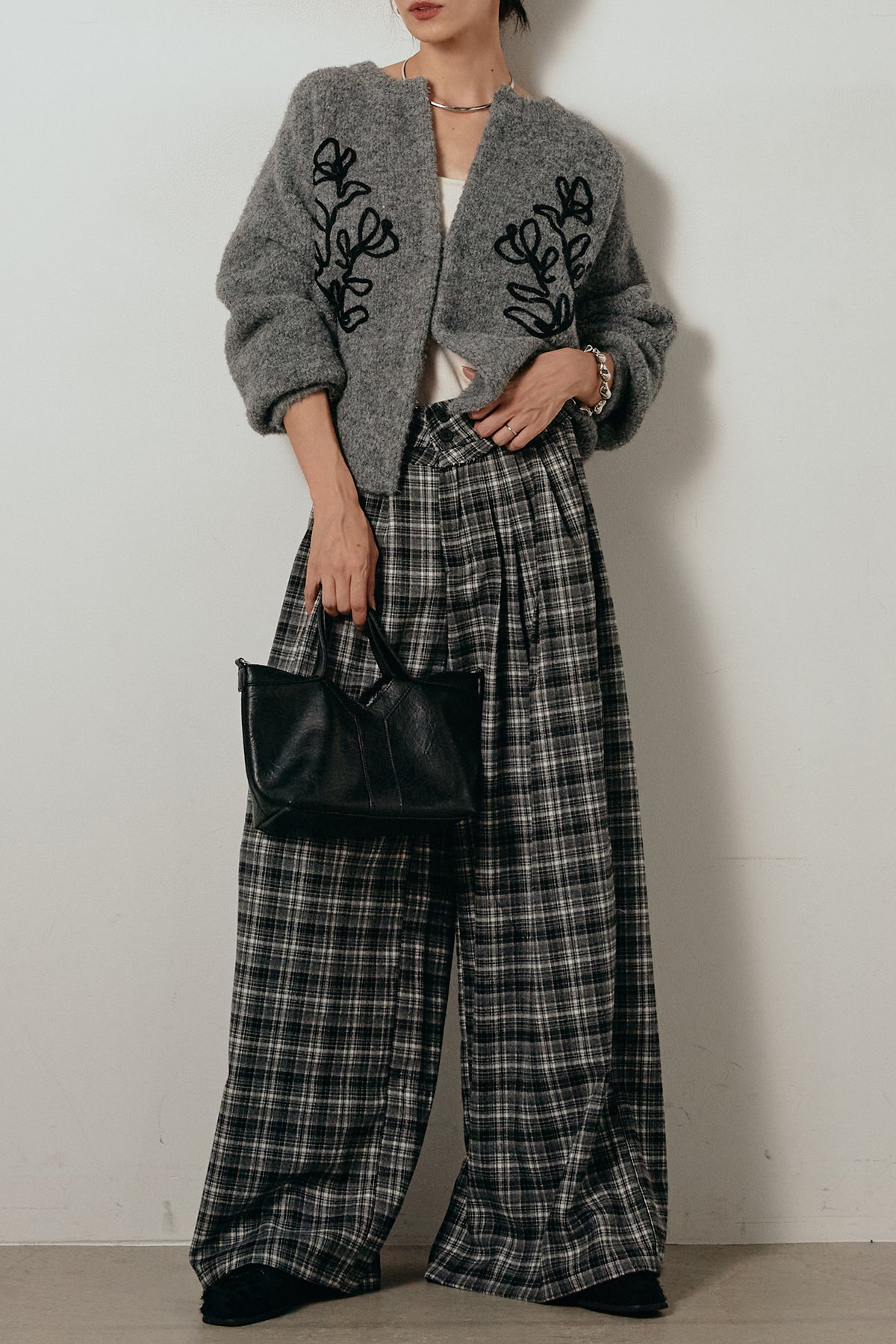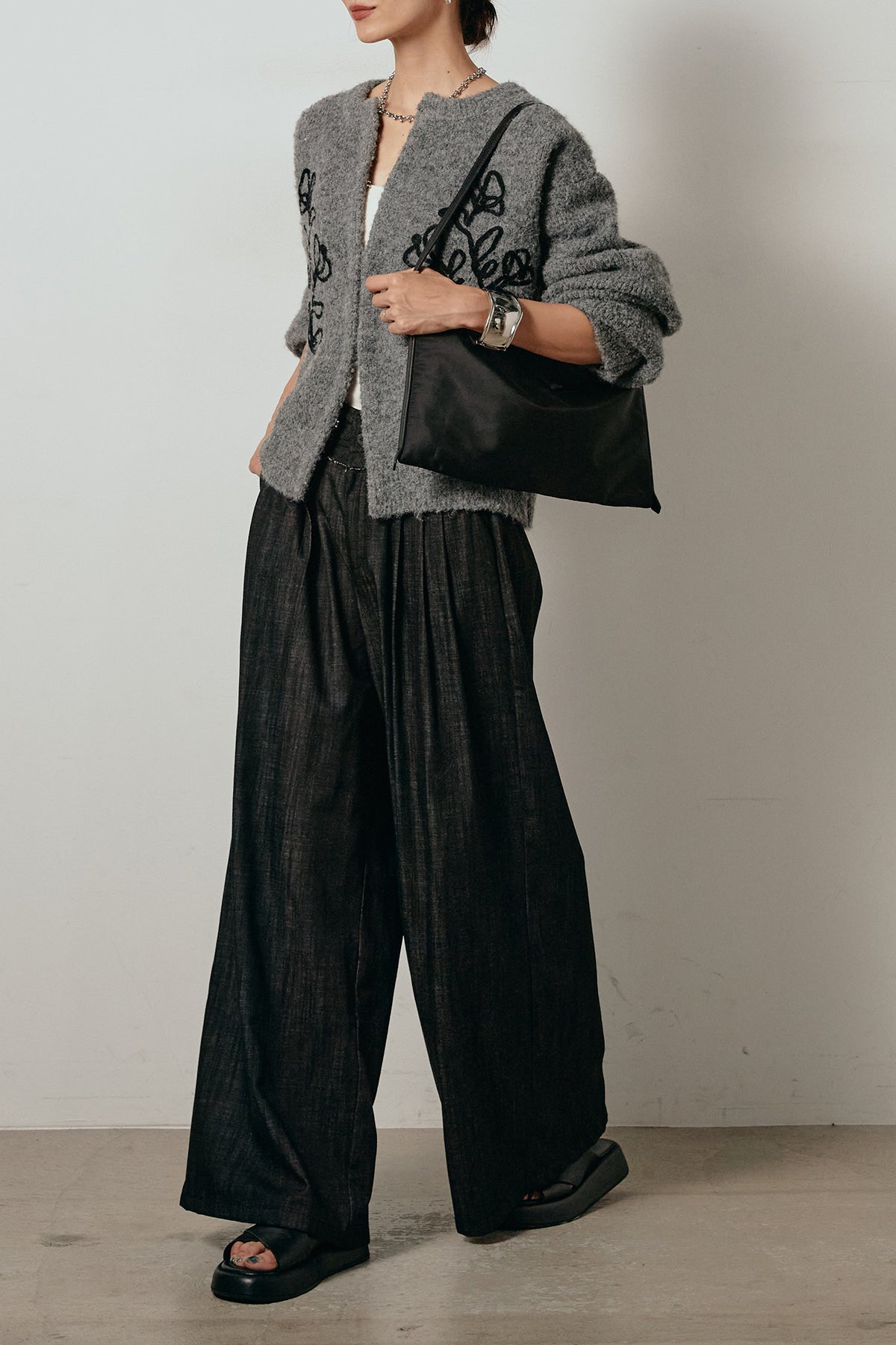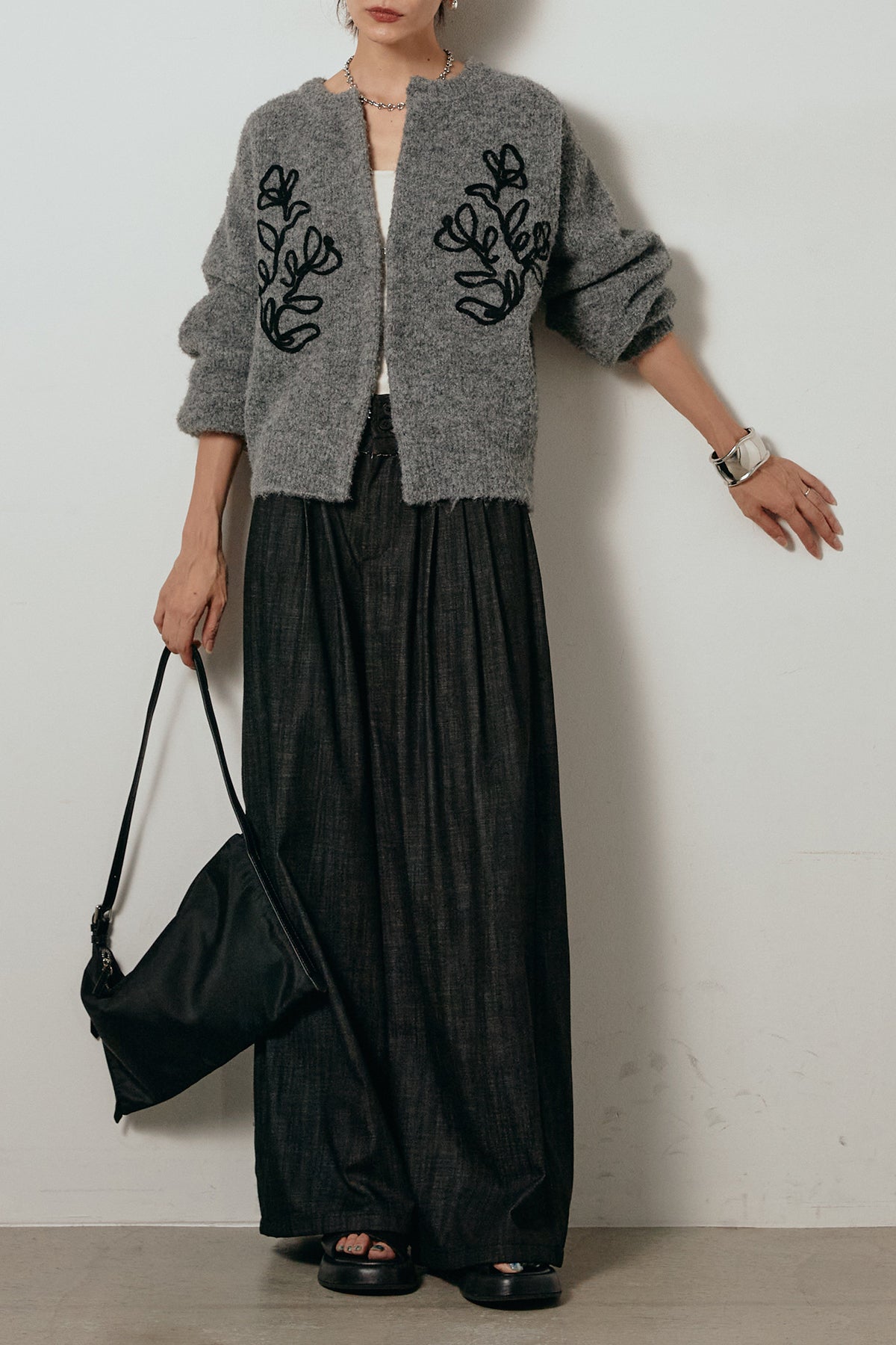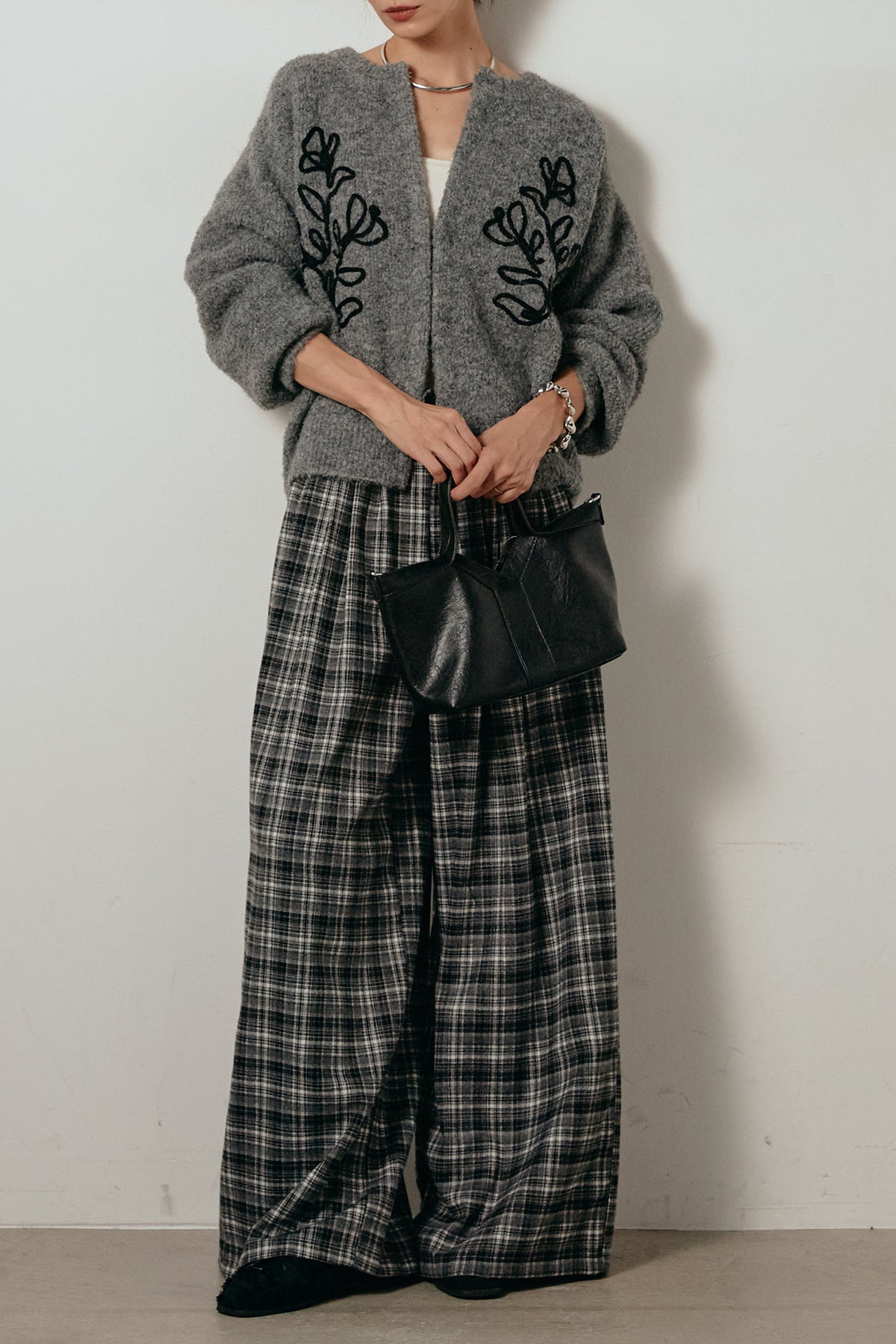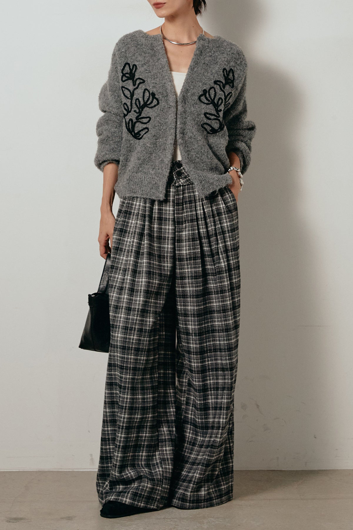 [SET]テープ刺繍ニットカーディガン+ウエスト切りっぱなしタックワイドパンツ(2set)