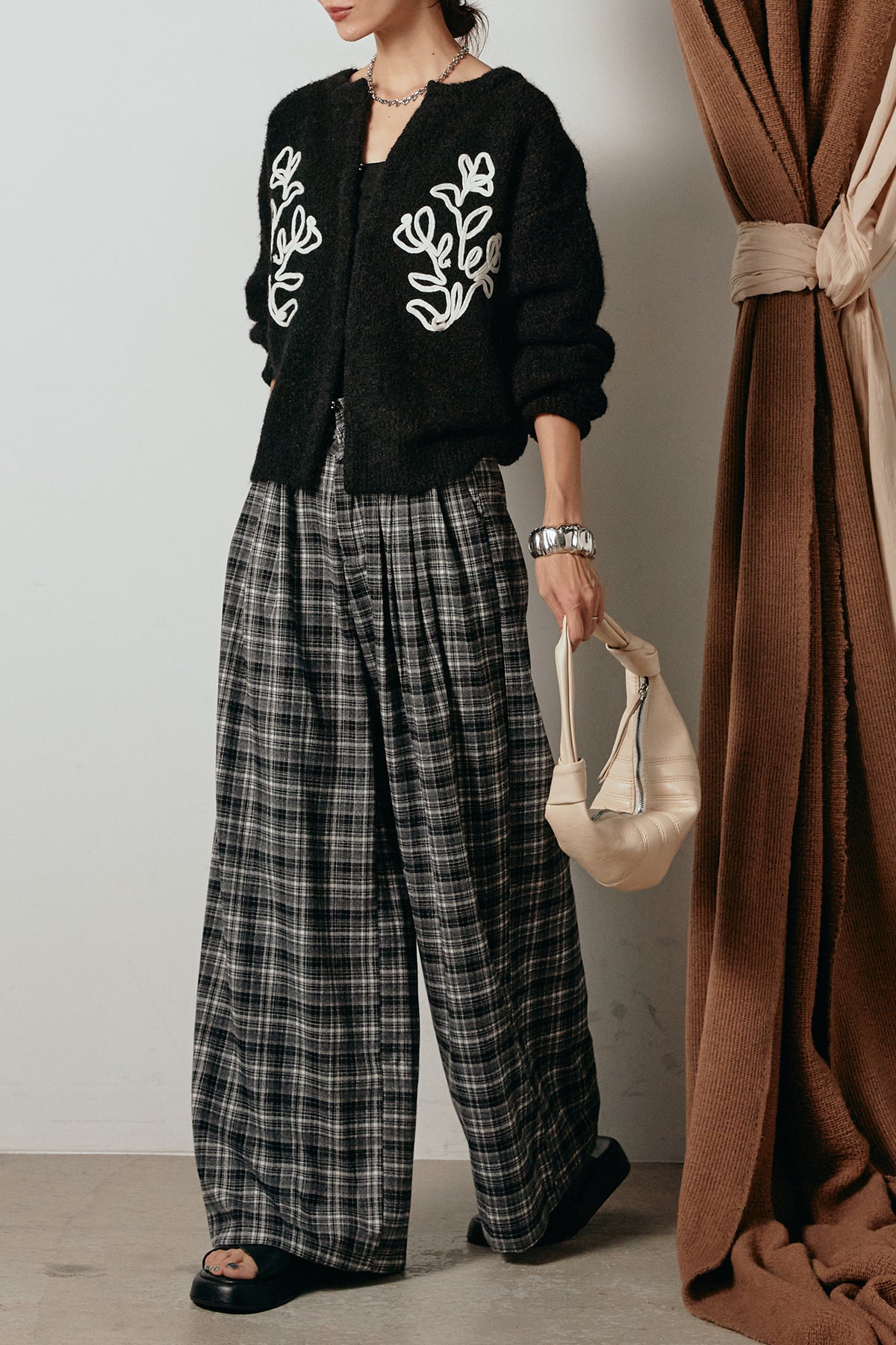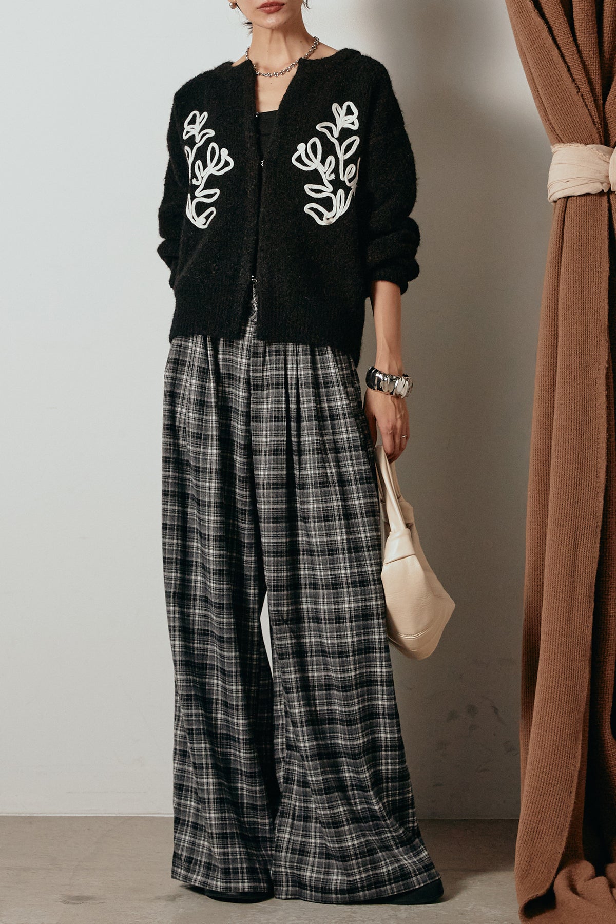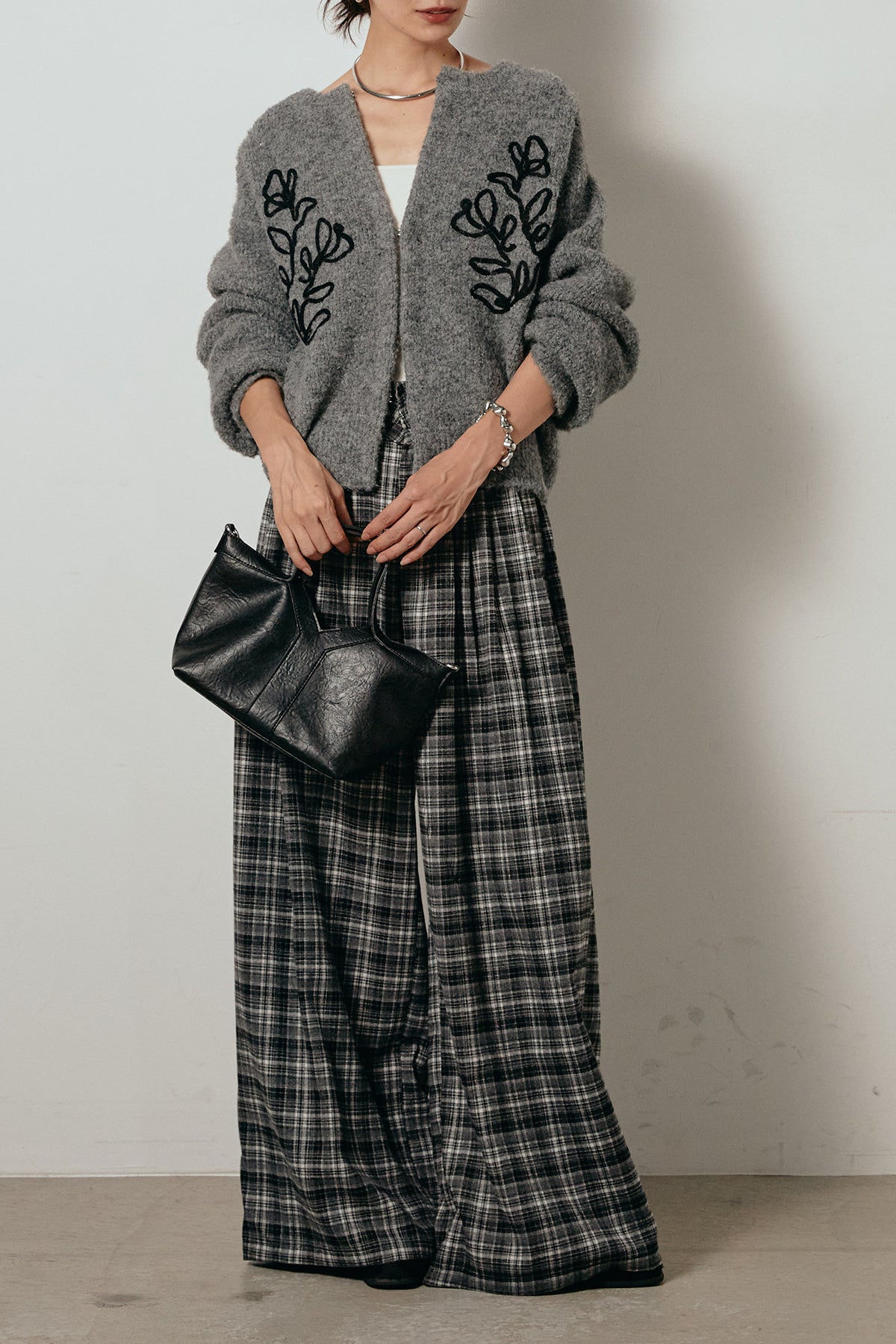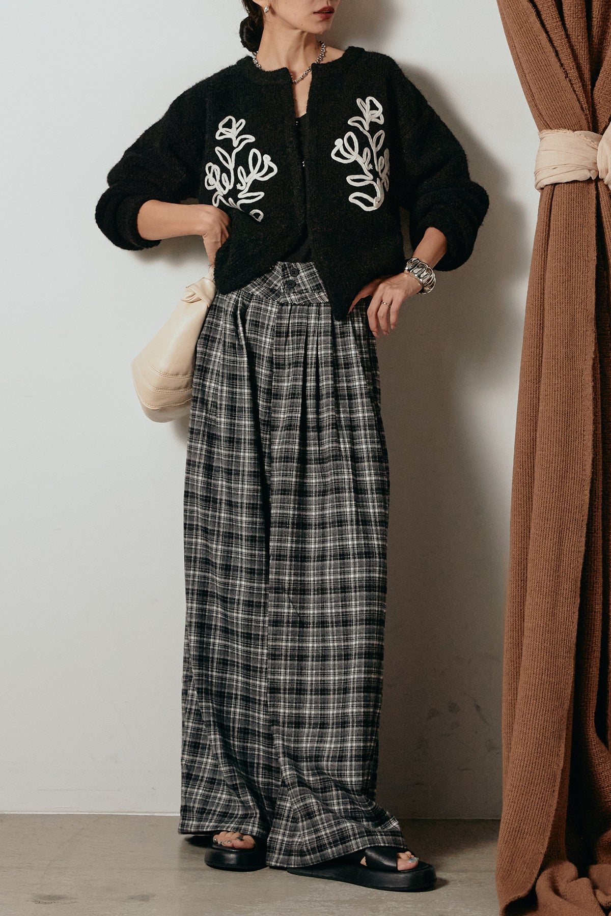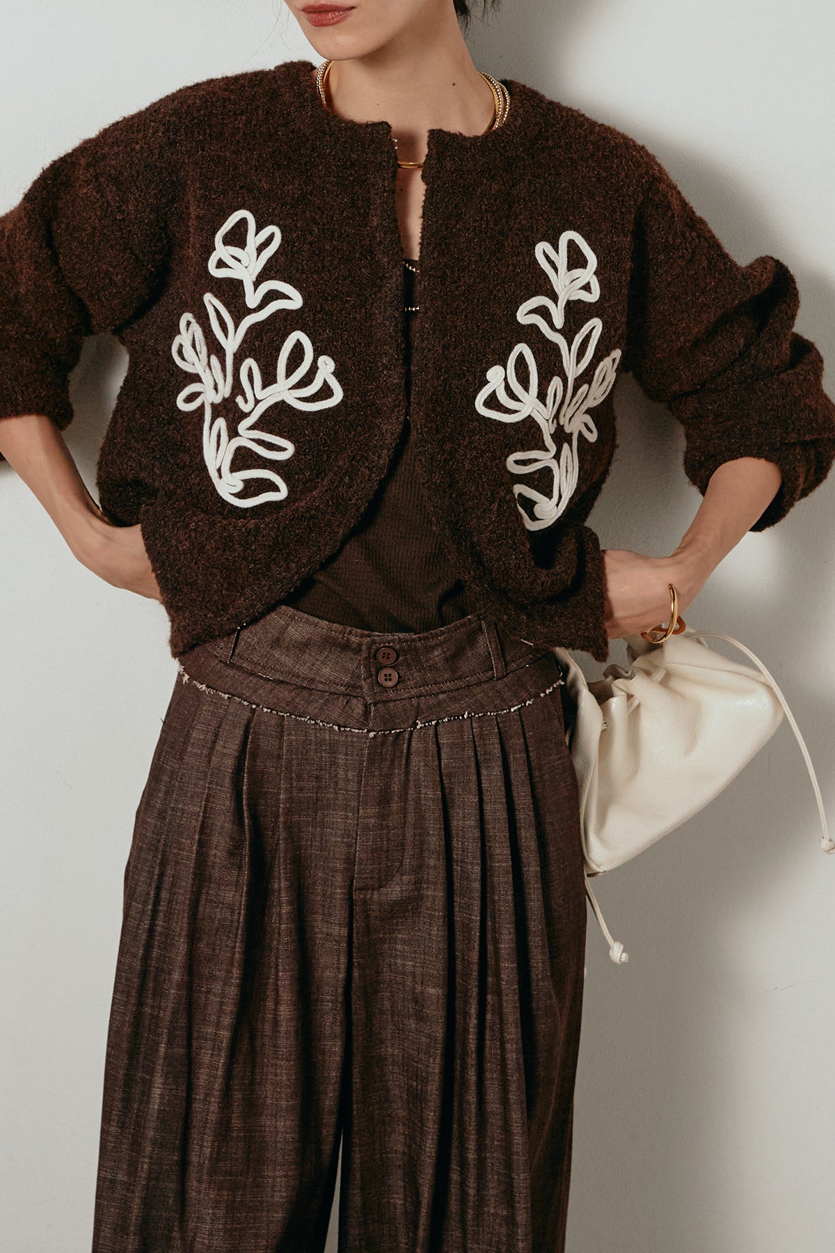[SET]テープ刺繍ニットカーディガン+ウエスト切りっぱなしタックワイドパンツ(2set)