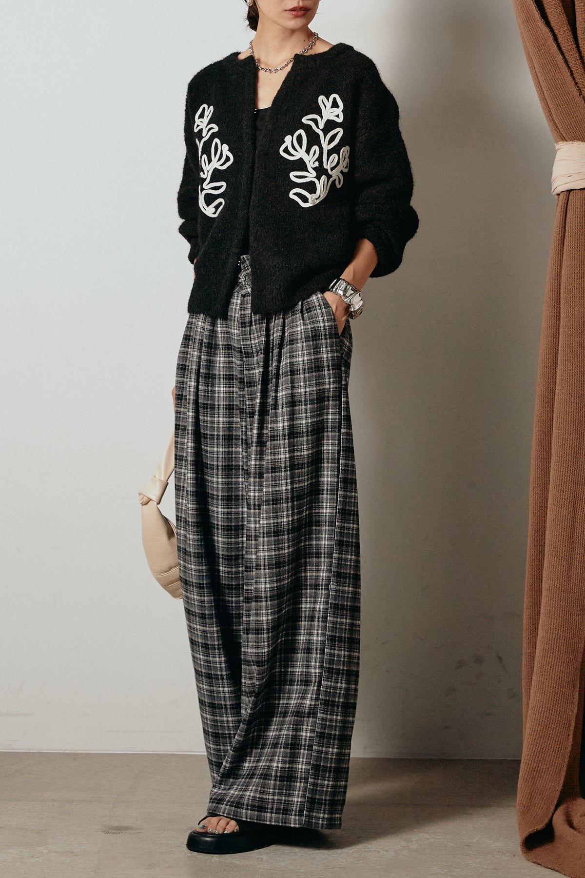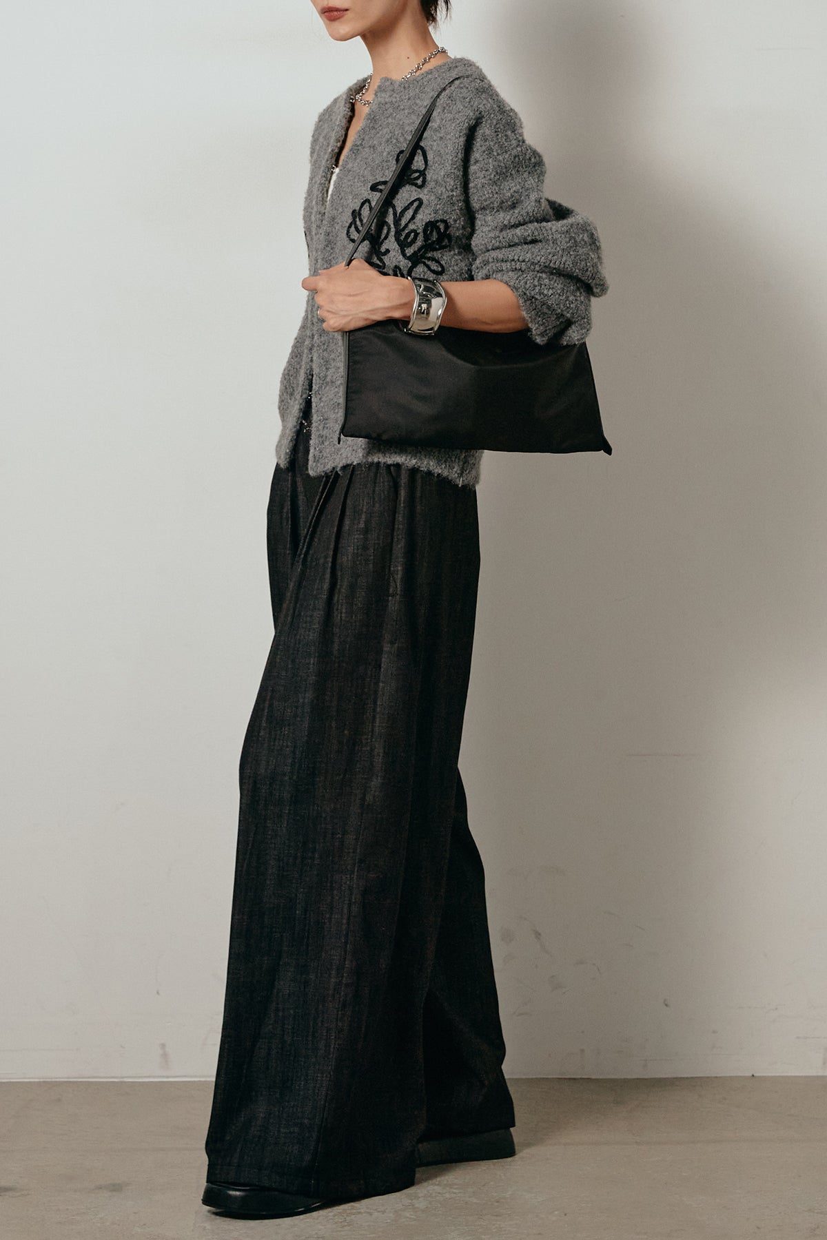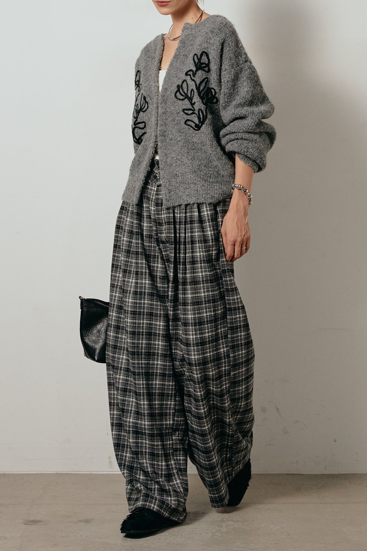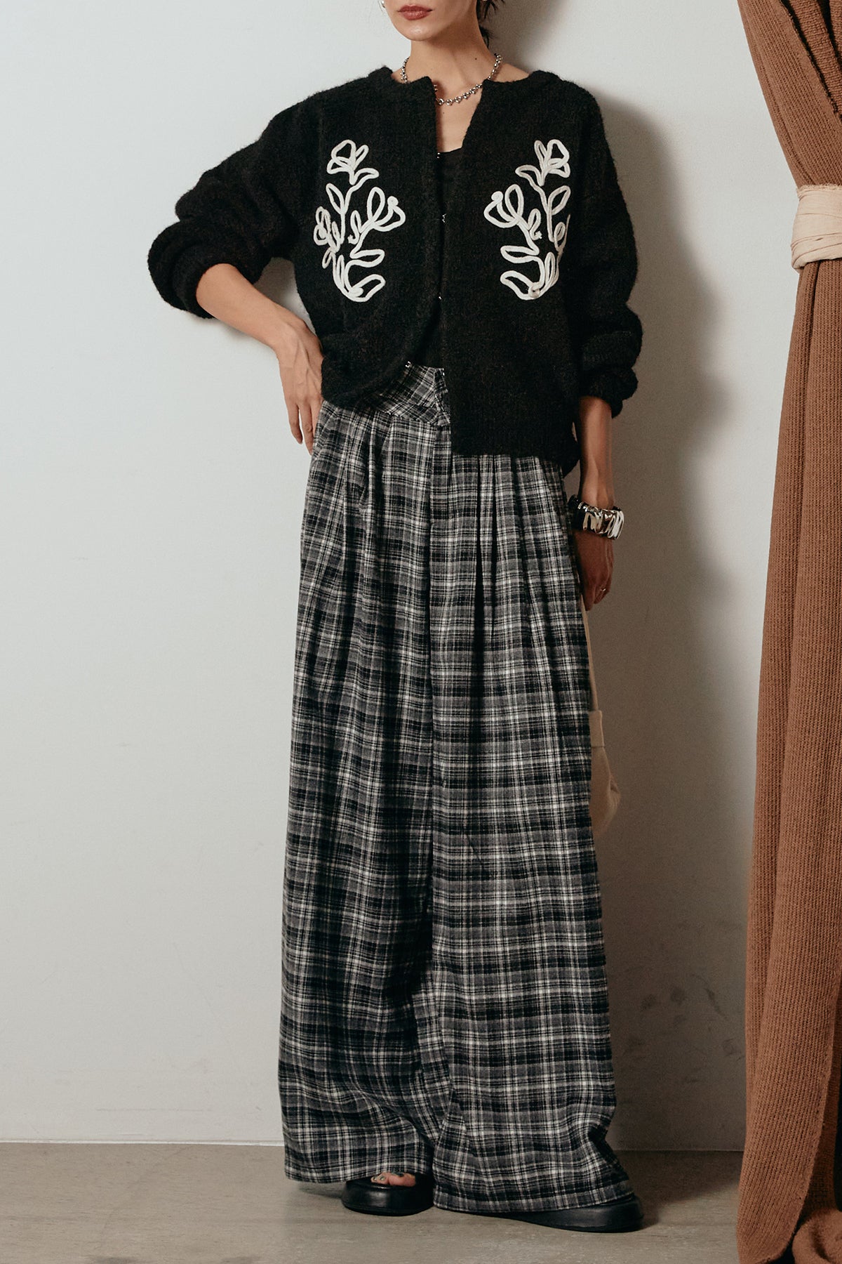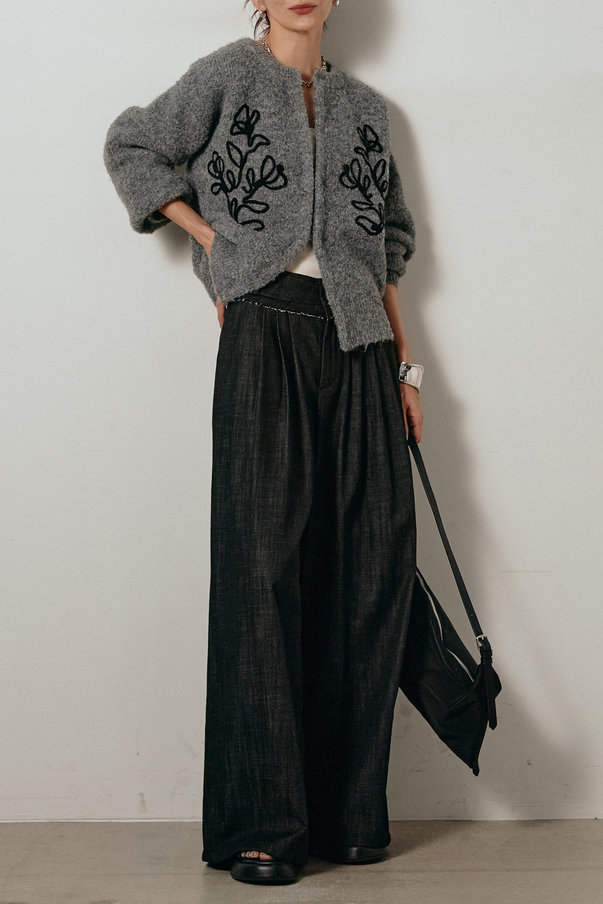[SET]テープ刺繍ニットカーディガン+ウエスト切りっぱなしタックワイドパンツ(2set)