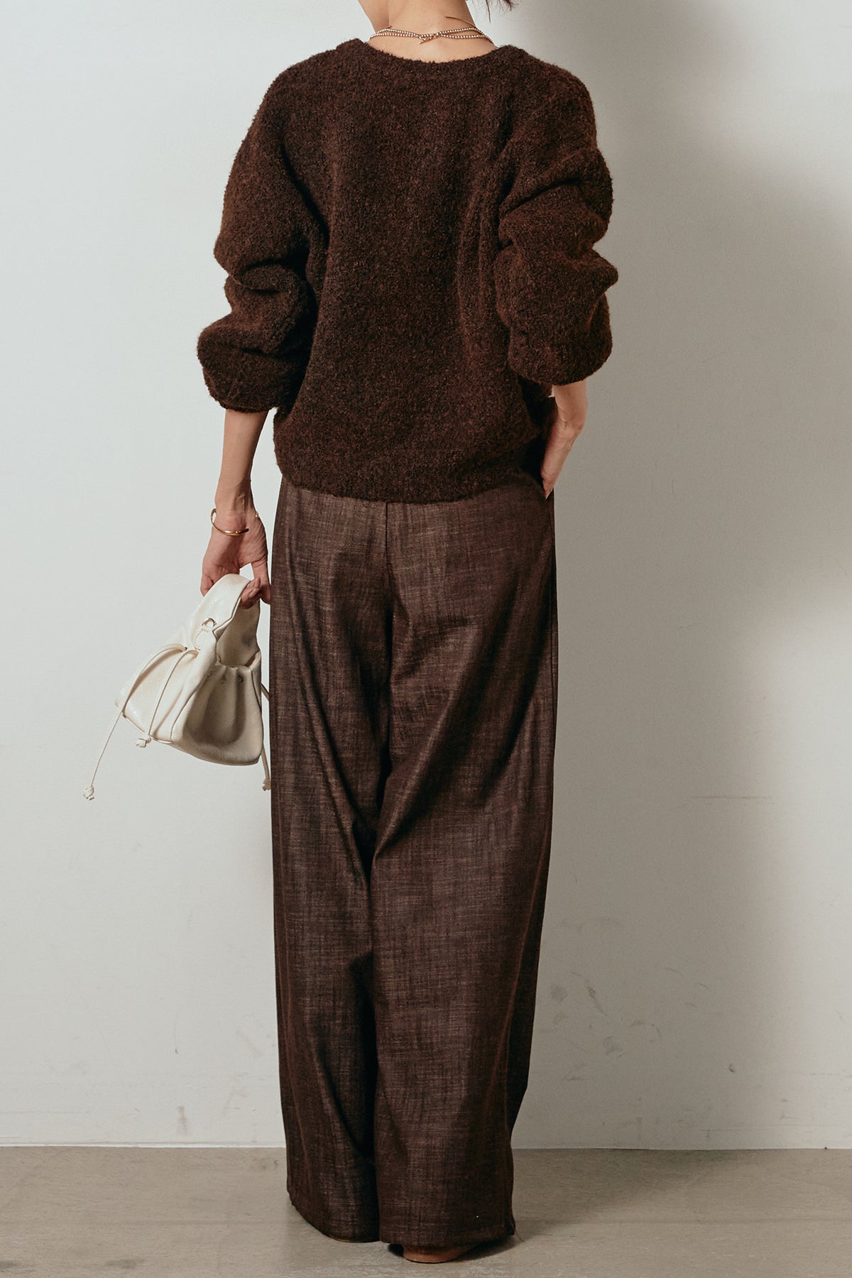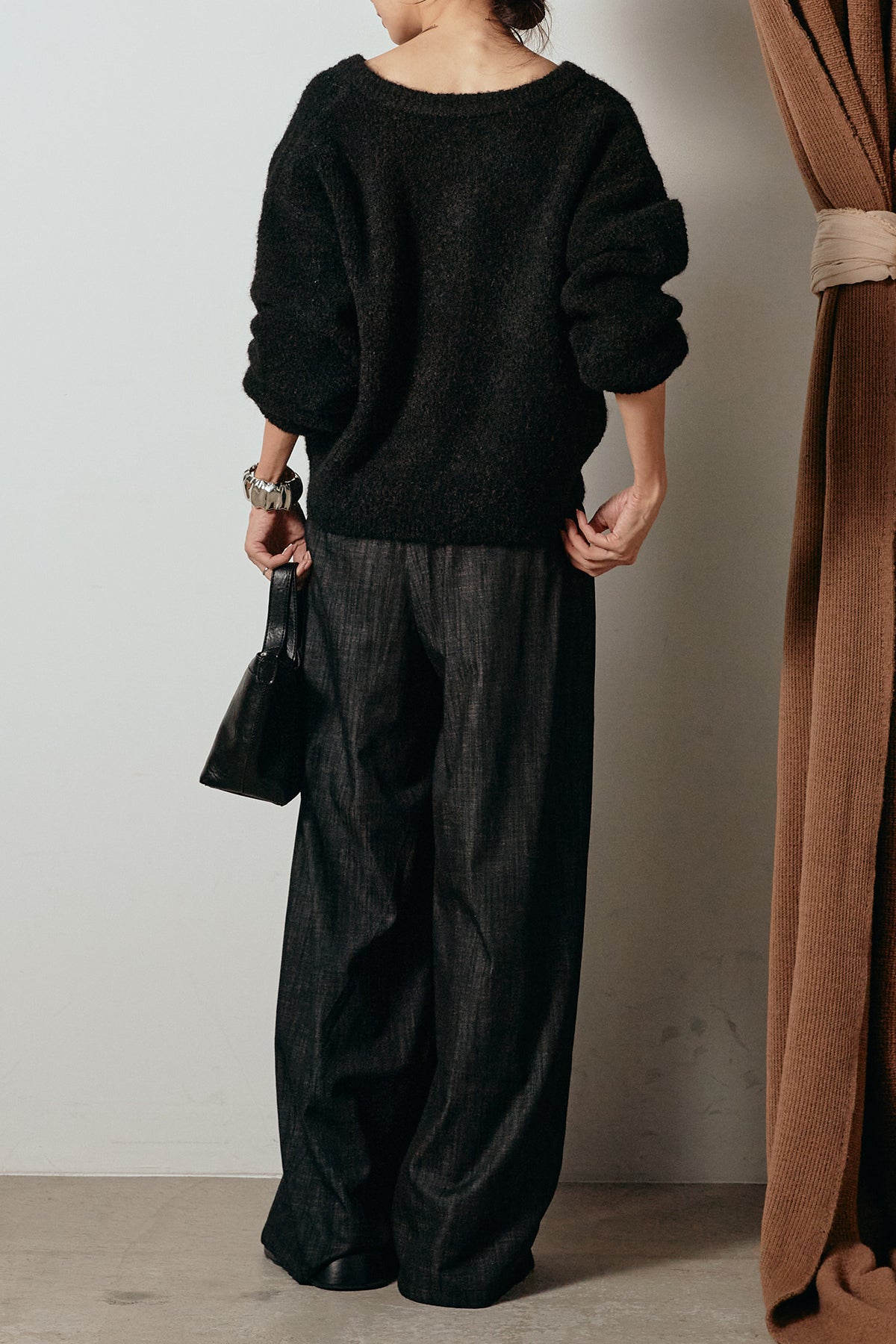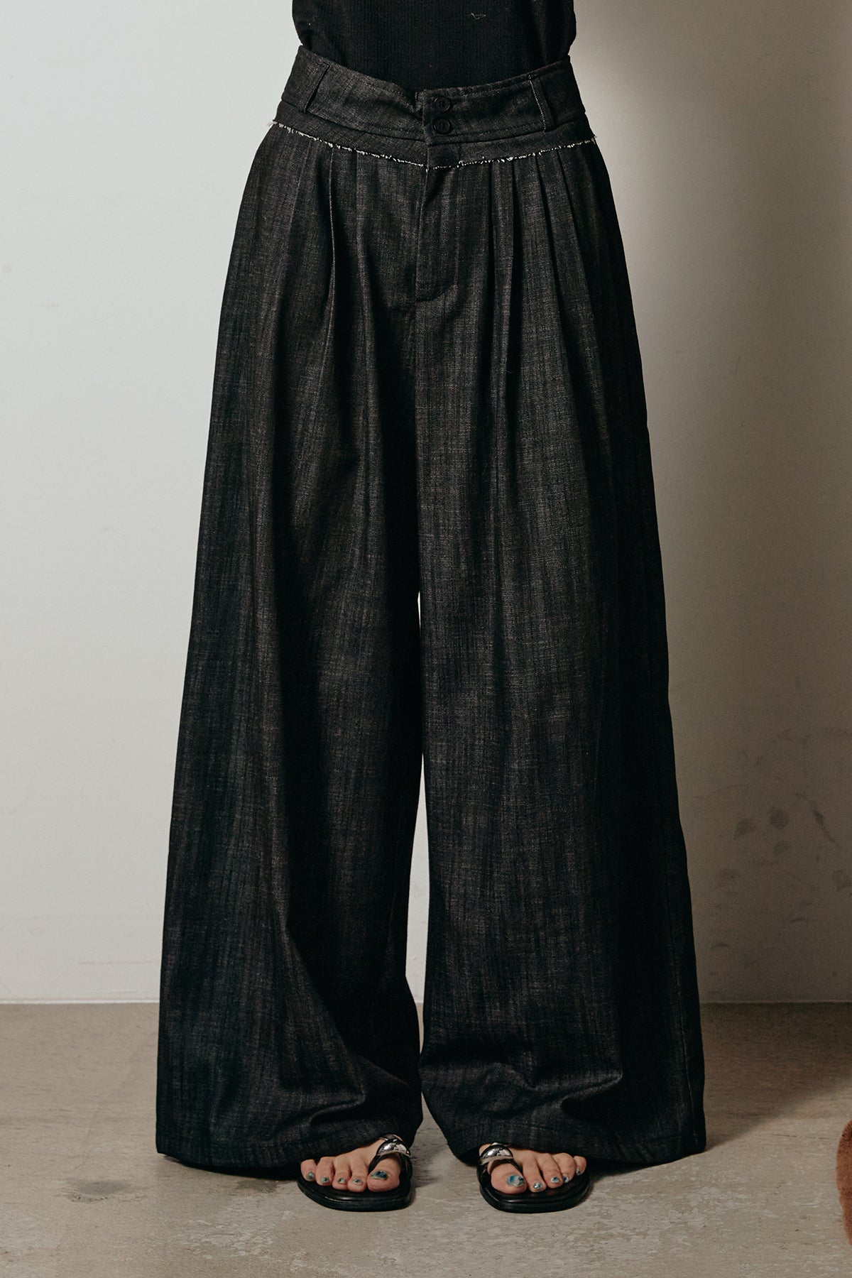 ラフな切りっぱなしデザインがアクセントになったタックワイドパンツ。ハイウエストと深めのタックで脚長効果がありながら、落ち感のある素材が動きに合わせて美しく揺れます。ウエスト周りのディテールがトップスインスタイルを引き立て、シンプルなニットやシャツと合わせるだけでモードな印象に。