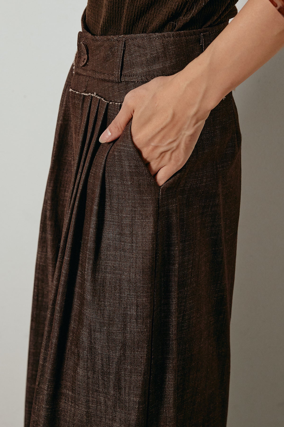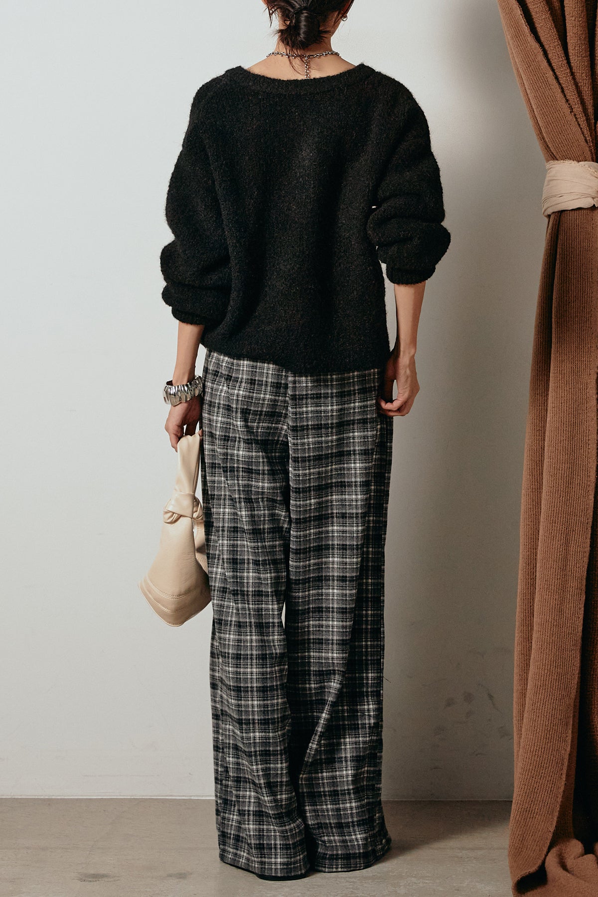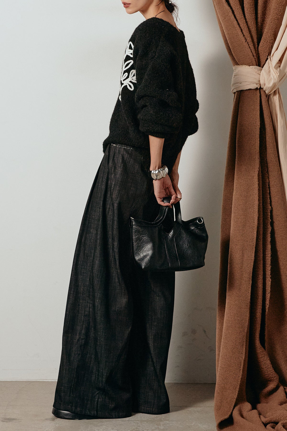ラフな切りっぱなしデザインがアクセントになったタックワイドパンツ。ハイウエストと深めのタックで脚長効果がありながら、落ち感のある素材が動きに合わせて美しく揺れます。ウエスト周りのディテールがトップスインスタイルを引き立て、シンプルなニットやシャツと合わせるだけでモードな印象に。