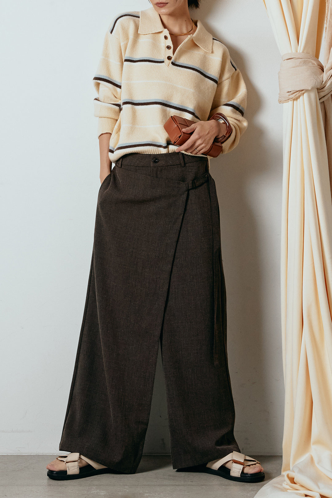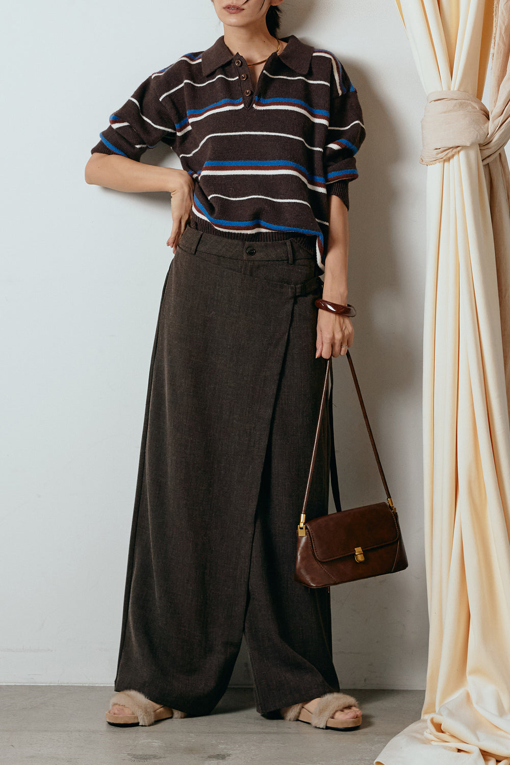 [SET]襟付きマルチボーダーニットポロトップス+ラップ巻きワイドスラックス(2set)