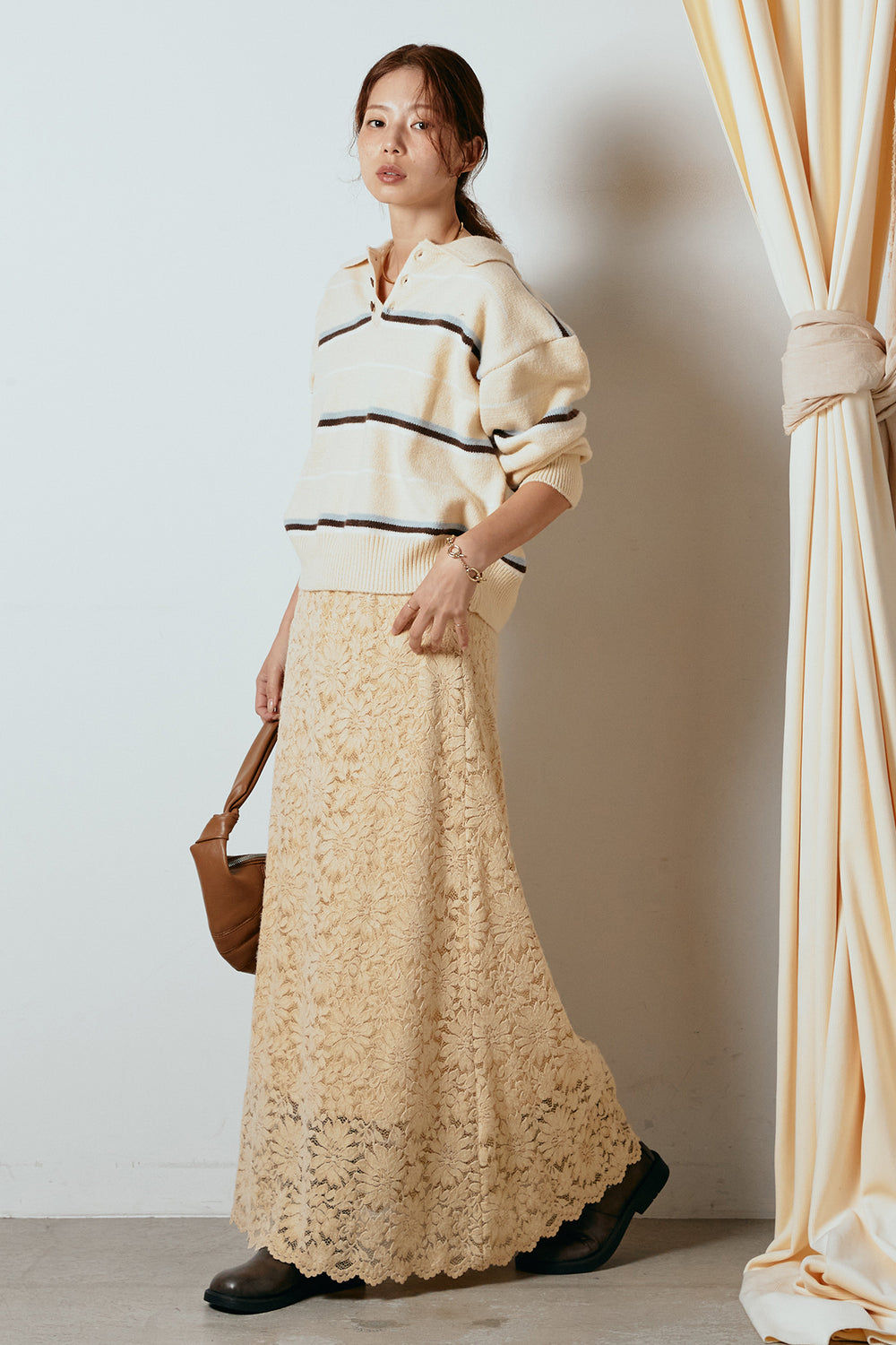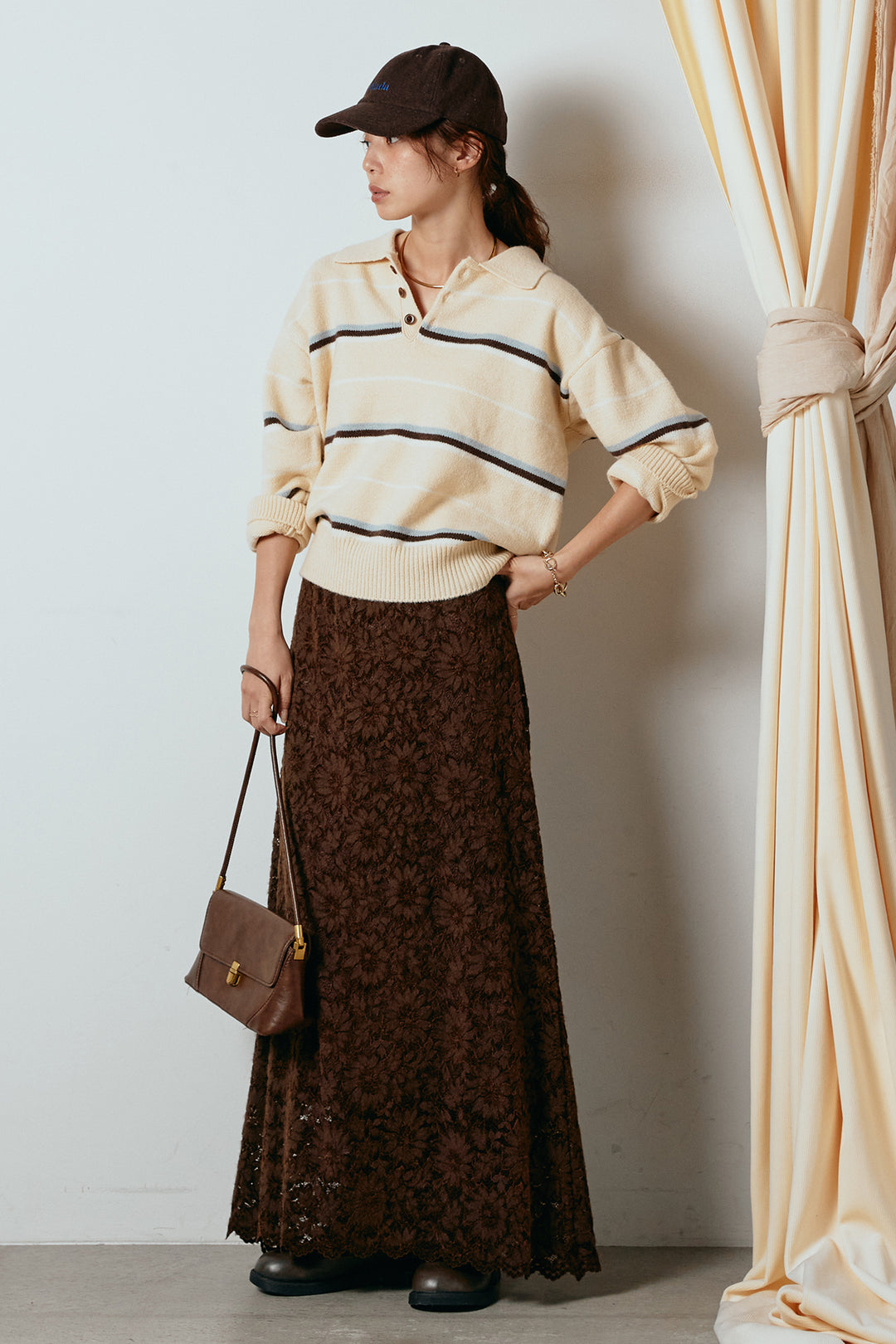[SET]襟付きマルチボーダーニットポロトップス+花柄刺繍ベロアフレアスカート(2set)