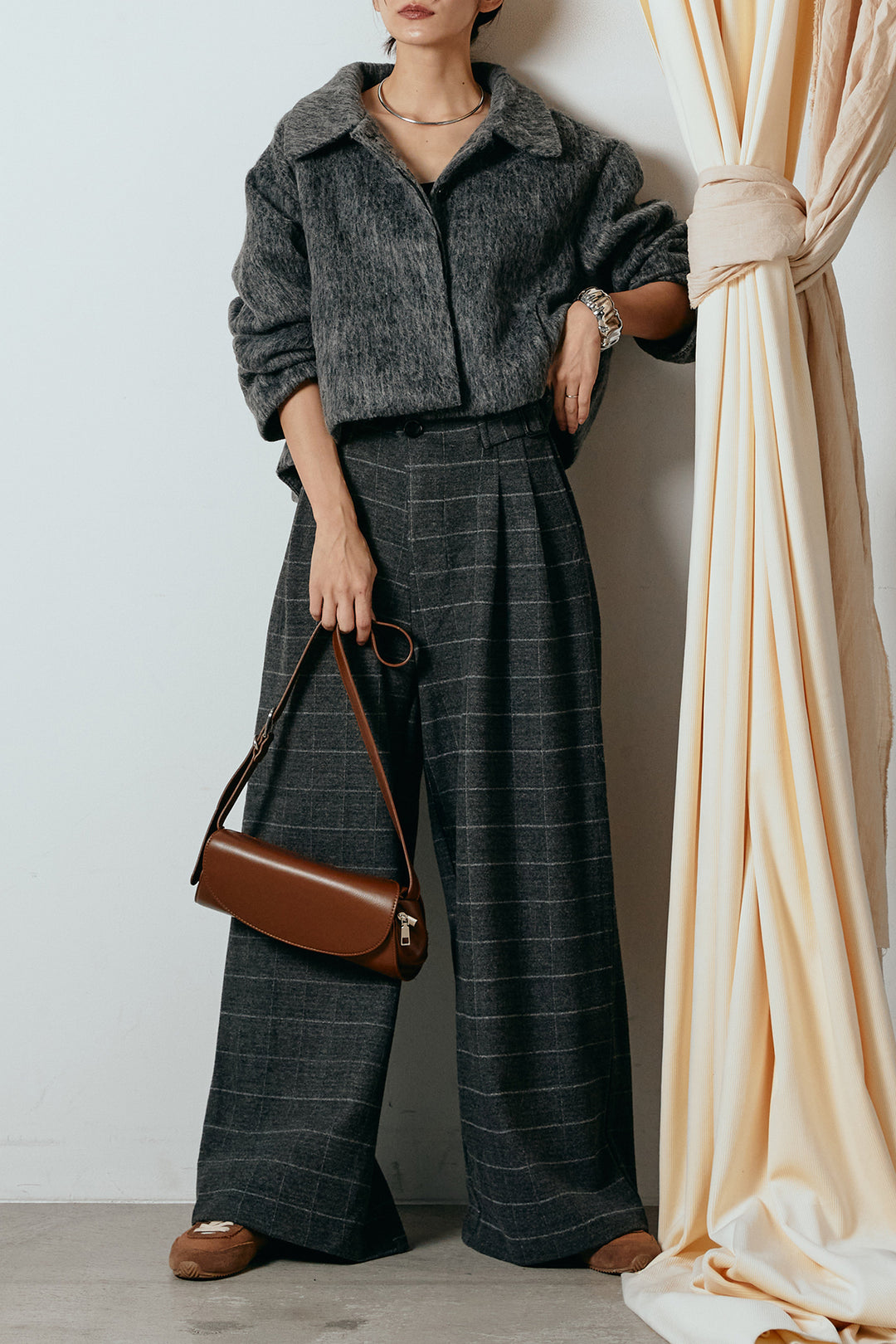 [SET]シャギーショートジャケット+スクエアチェック柄ワイドパンツ(2set)