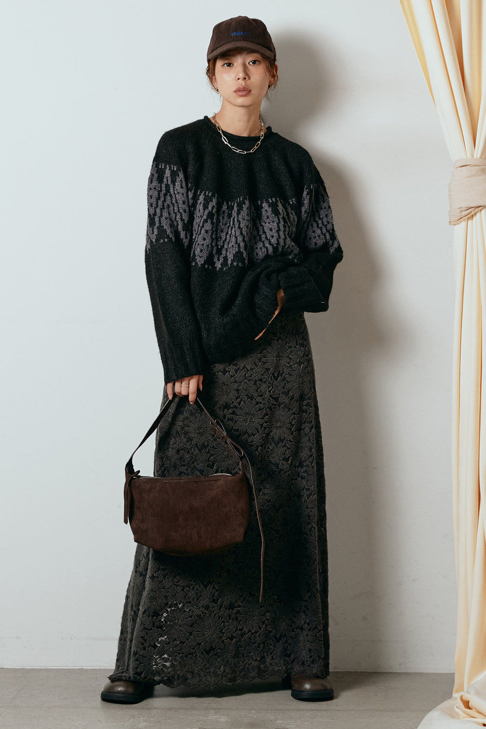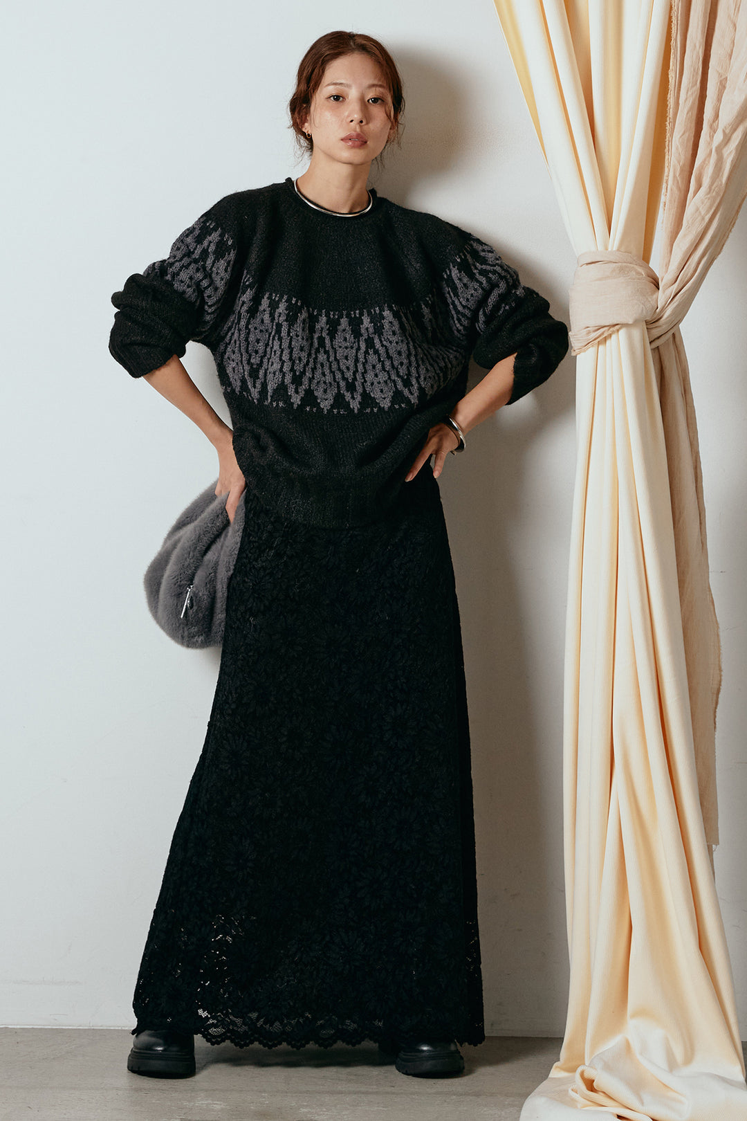 [SET]モノトーン柄ニットトップス+花柄刺繍ベロアフレアスカート(2set)
