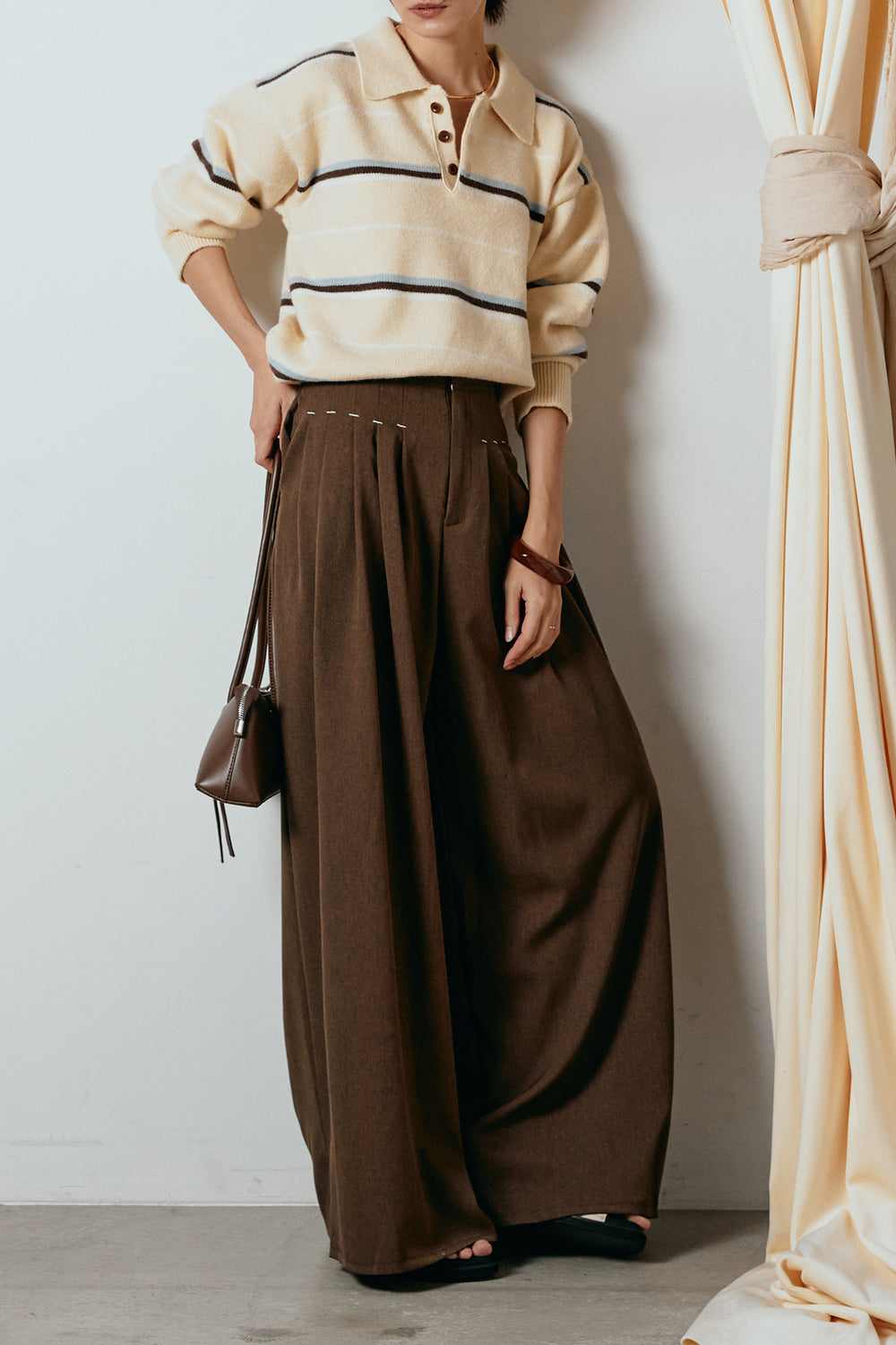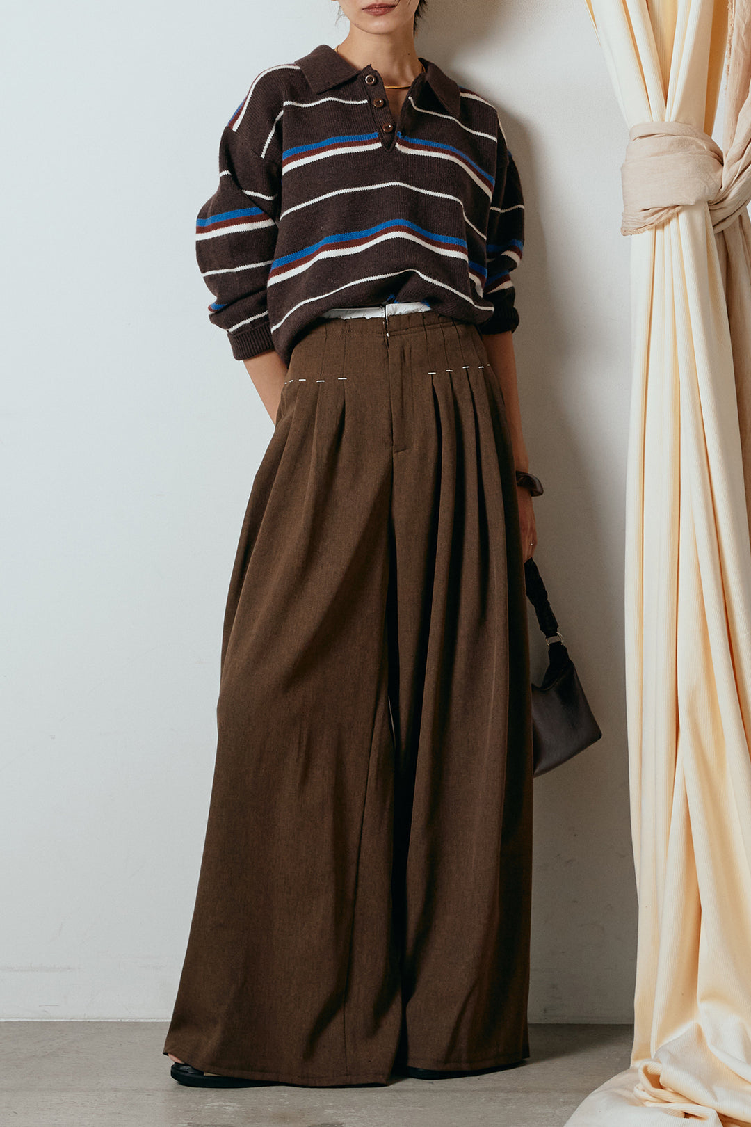 [SET]襟付きマルチボーダーニットポロトップス+ウエストステッチデザインワイドスラックス(2set)