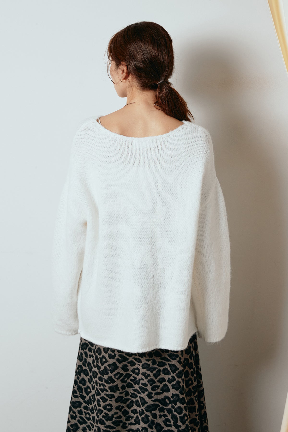 深めのVネックデザインで顔周りをすっきりと見せ、インナー次第で表情を変えられる万能アイテムです。