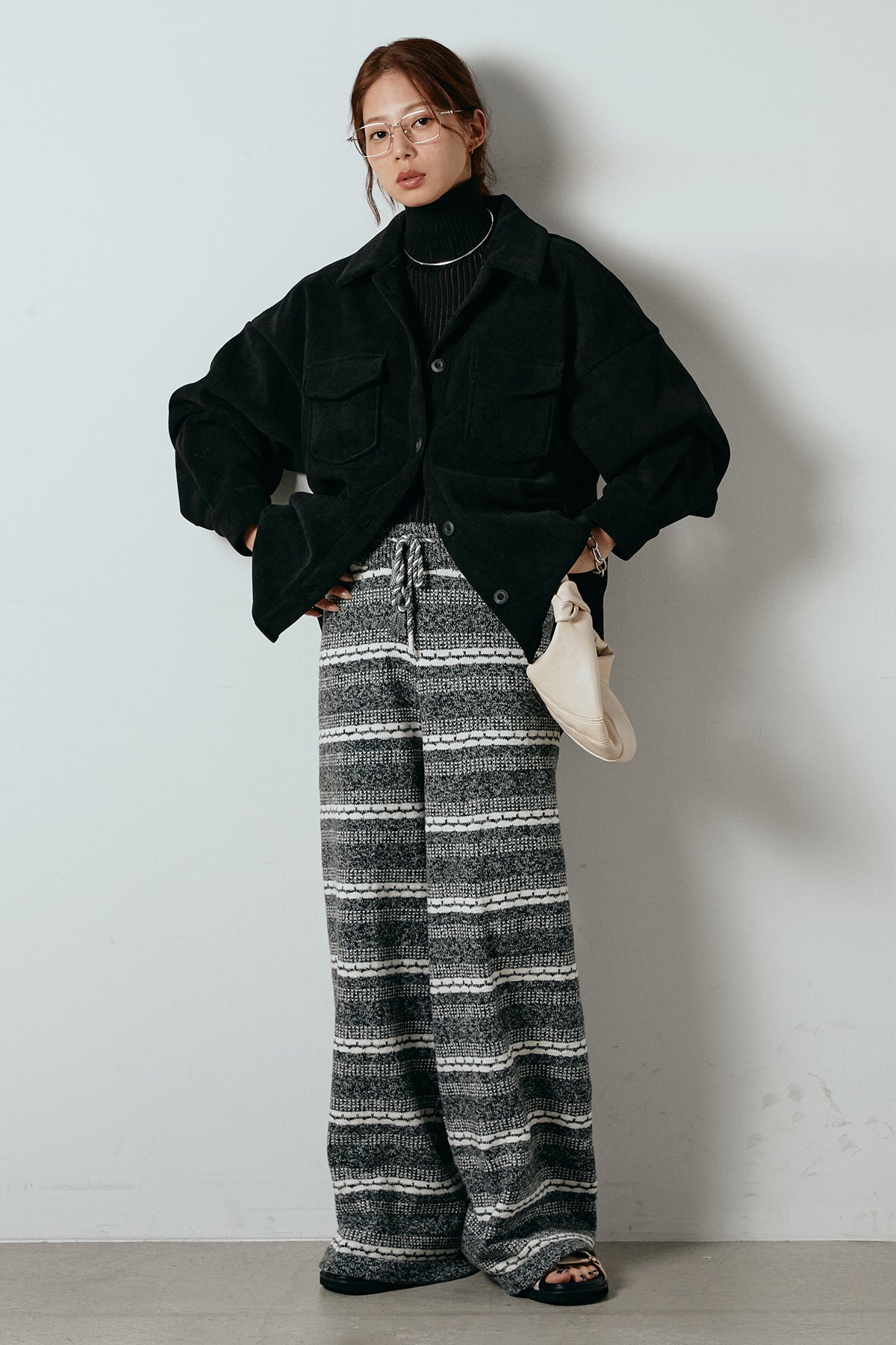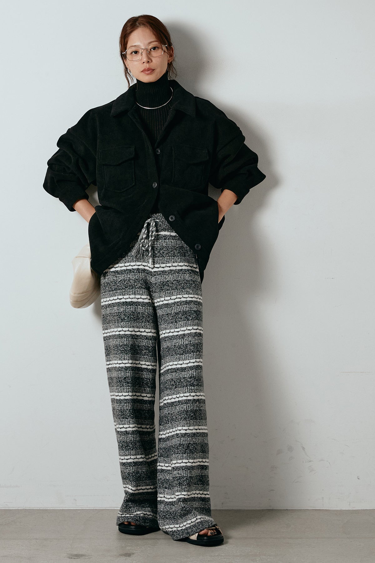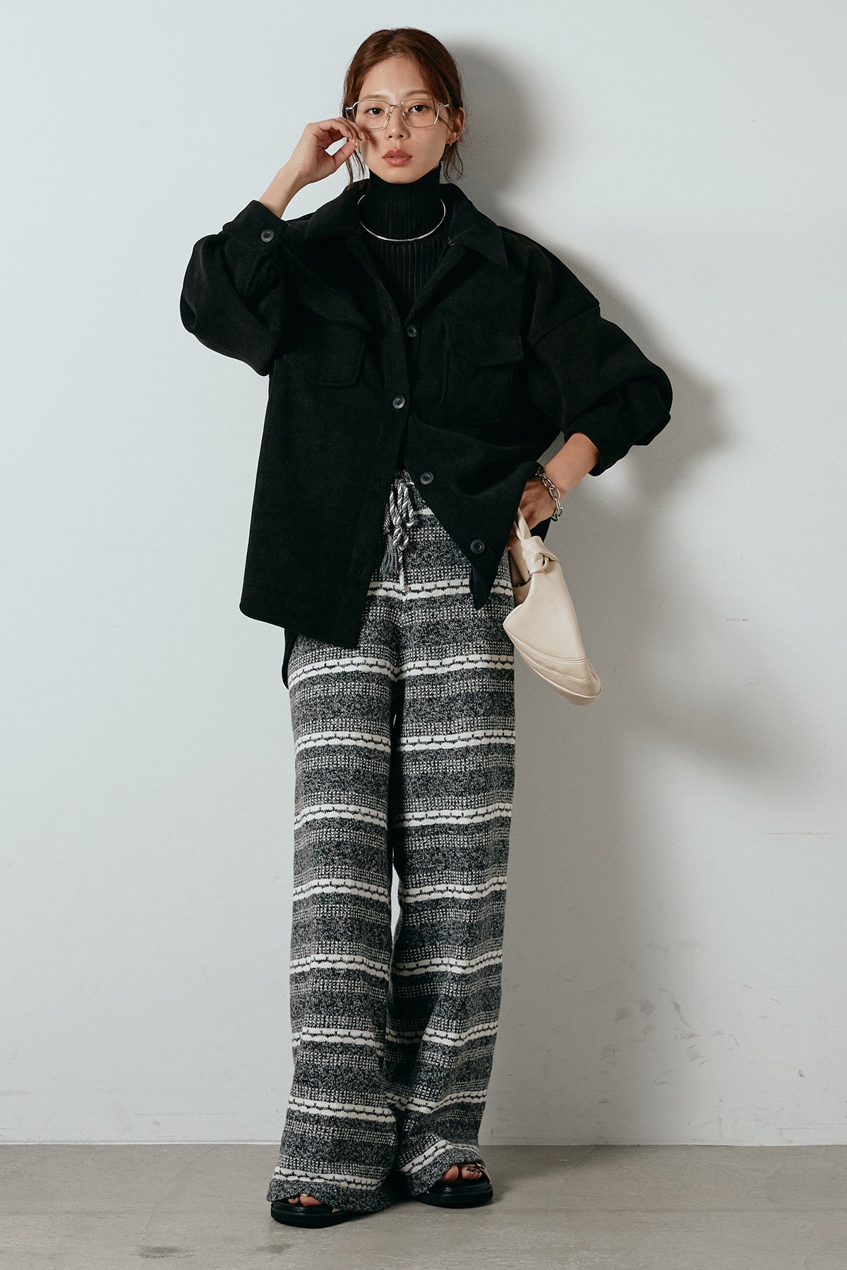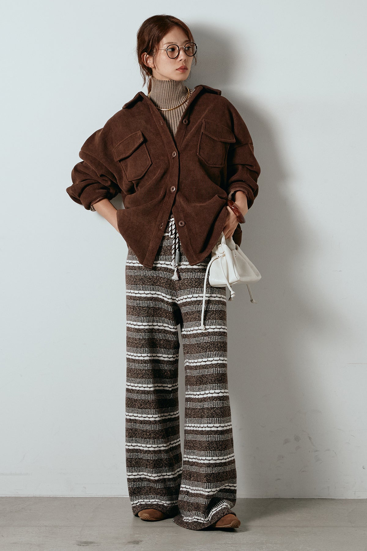 [SET]襟付きコーデュロイポケットシャツ+リブニットシームレスタートルプルオーバー+マルチライン柄リラックスニットパンツ(3set)