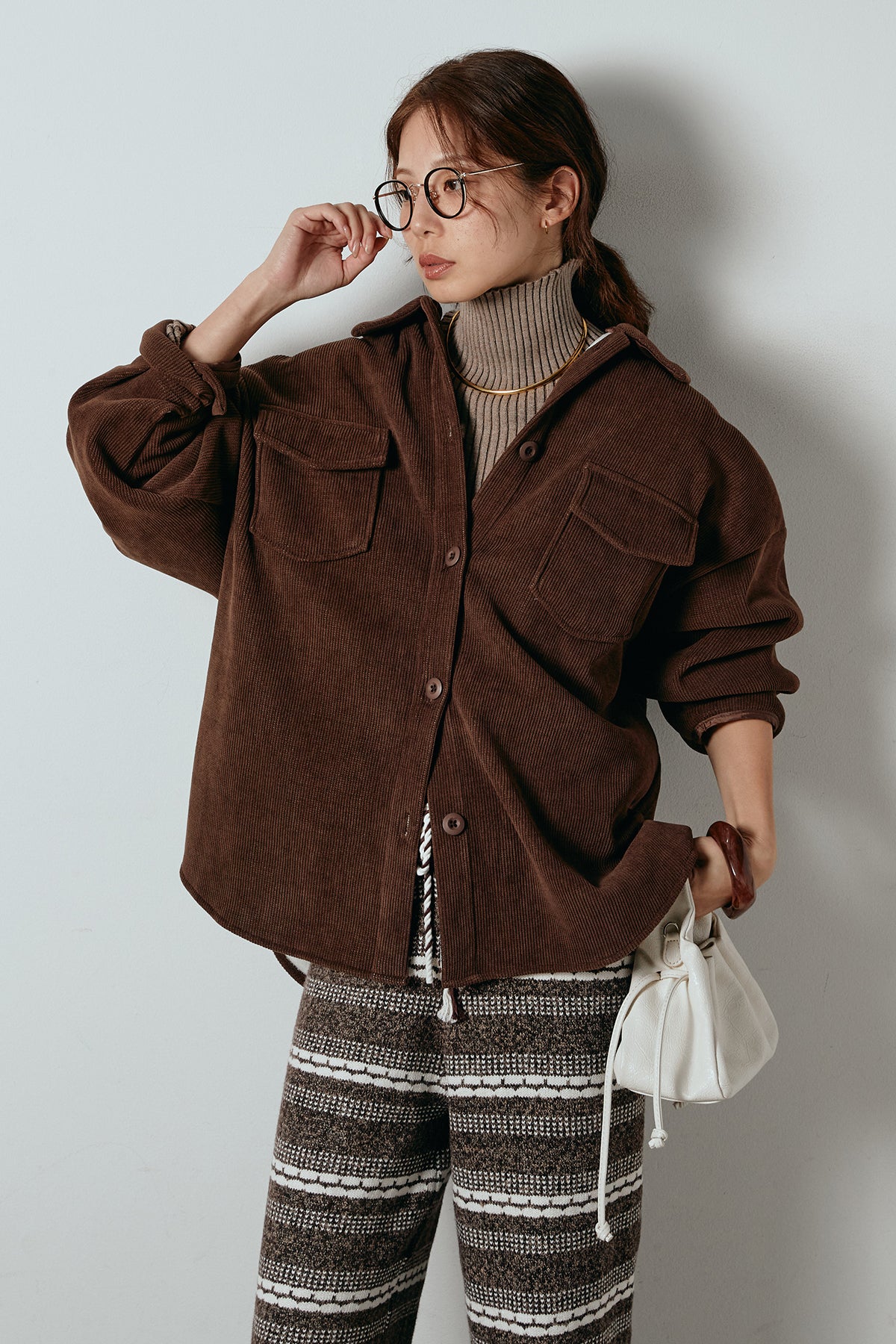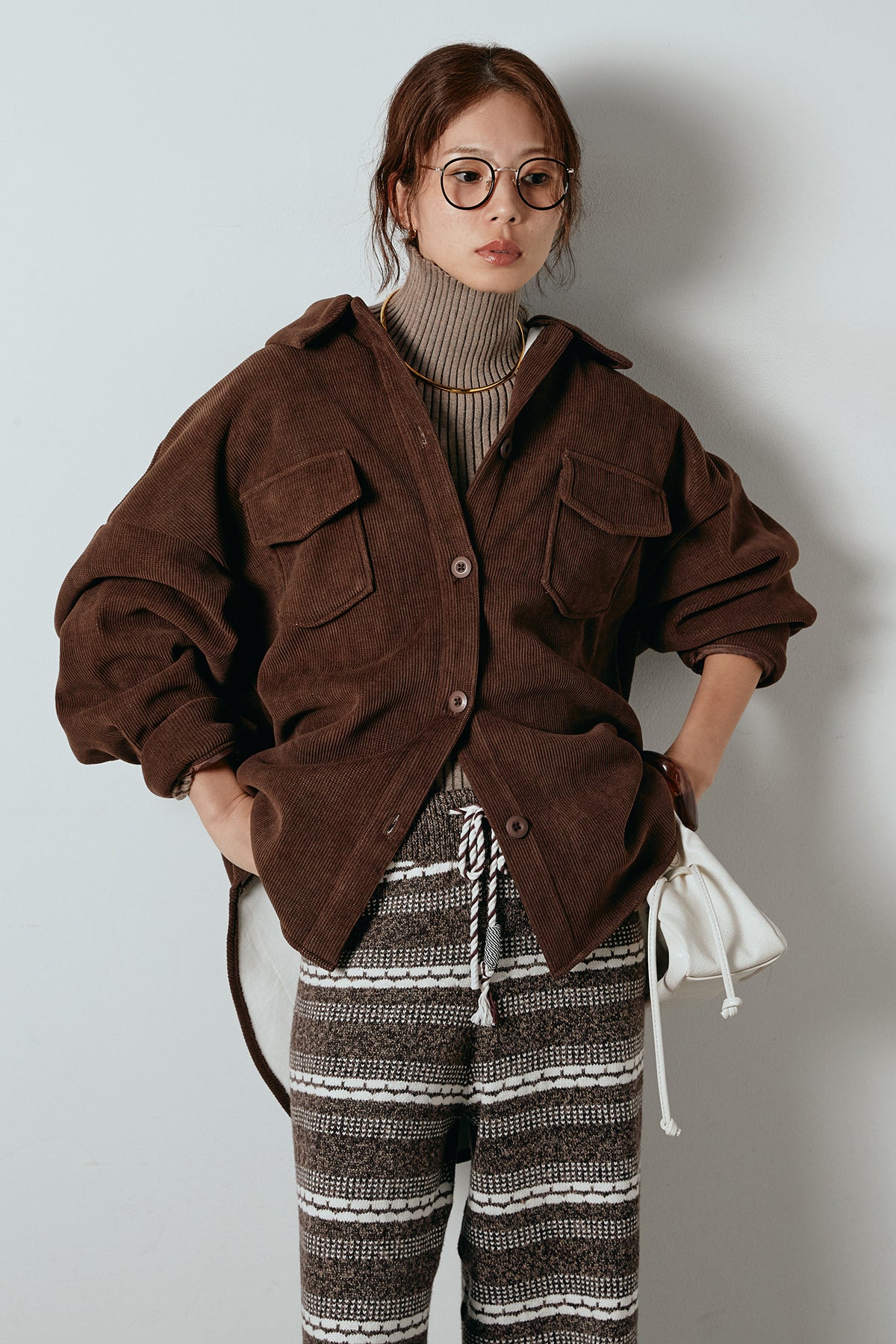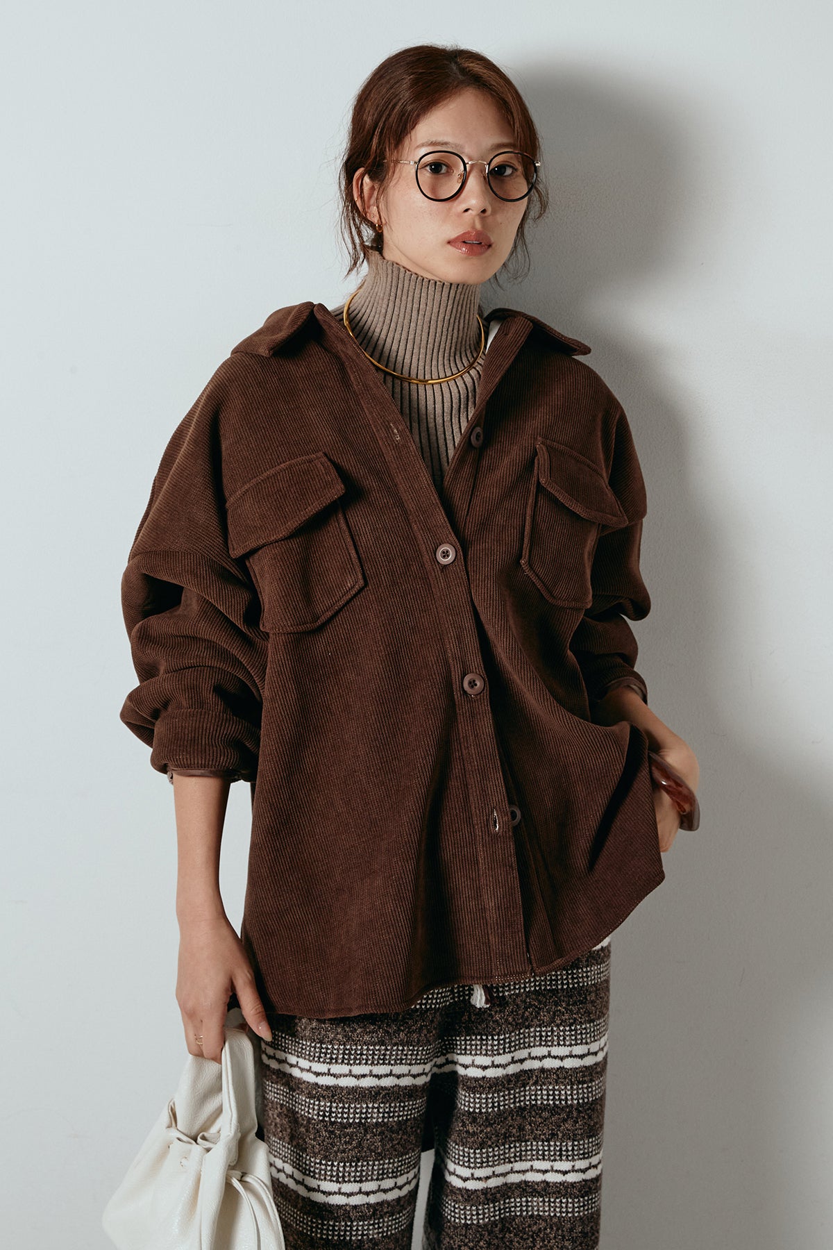 ふんわりとしたコーデュロイ素材が季節感を引き立てる、襟付きのポケットシャツ。 オーバーサイズ気味のシルエットで抜け感を演出しつつ、胸元の大きめポケットが程よいアクセントに。 一枚で着るのはもちろん、タートルやロンTとのレイヤードもおすすめです。 羽織としても使いやすく、秋冬のカジュアルスタイルに活躍する万能アイテム。