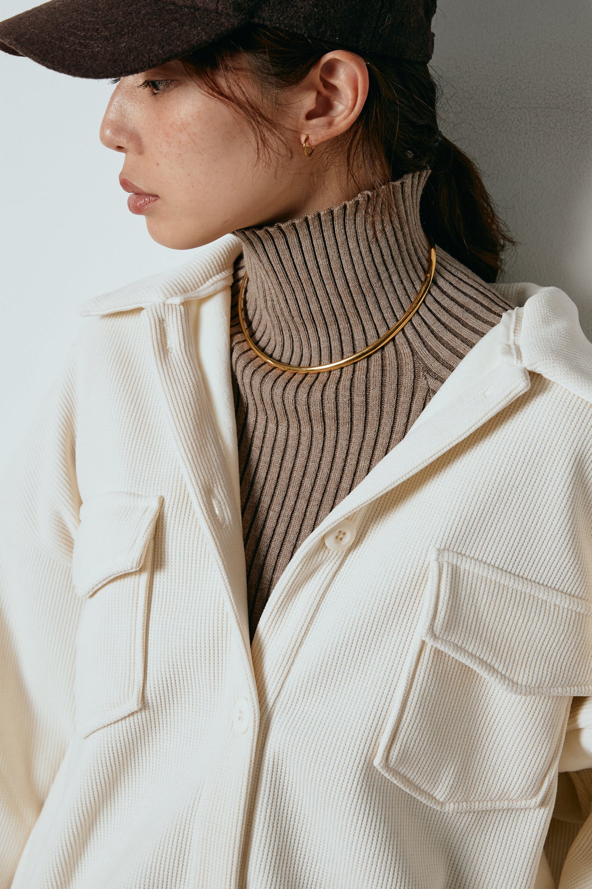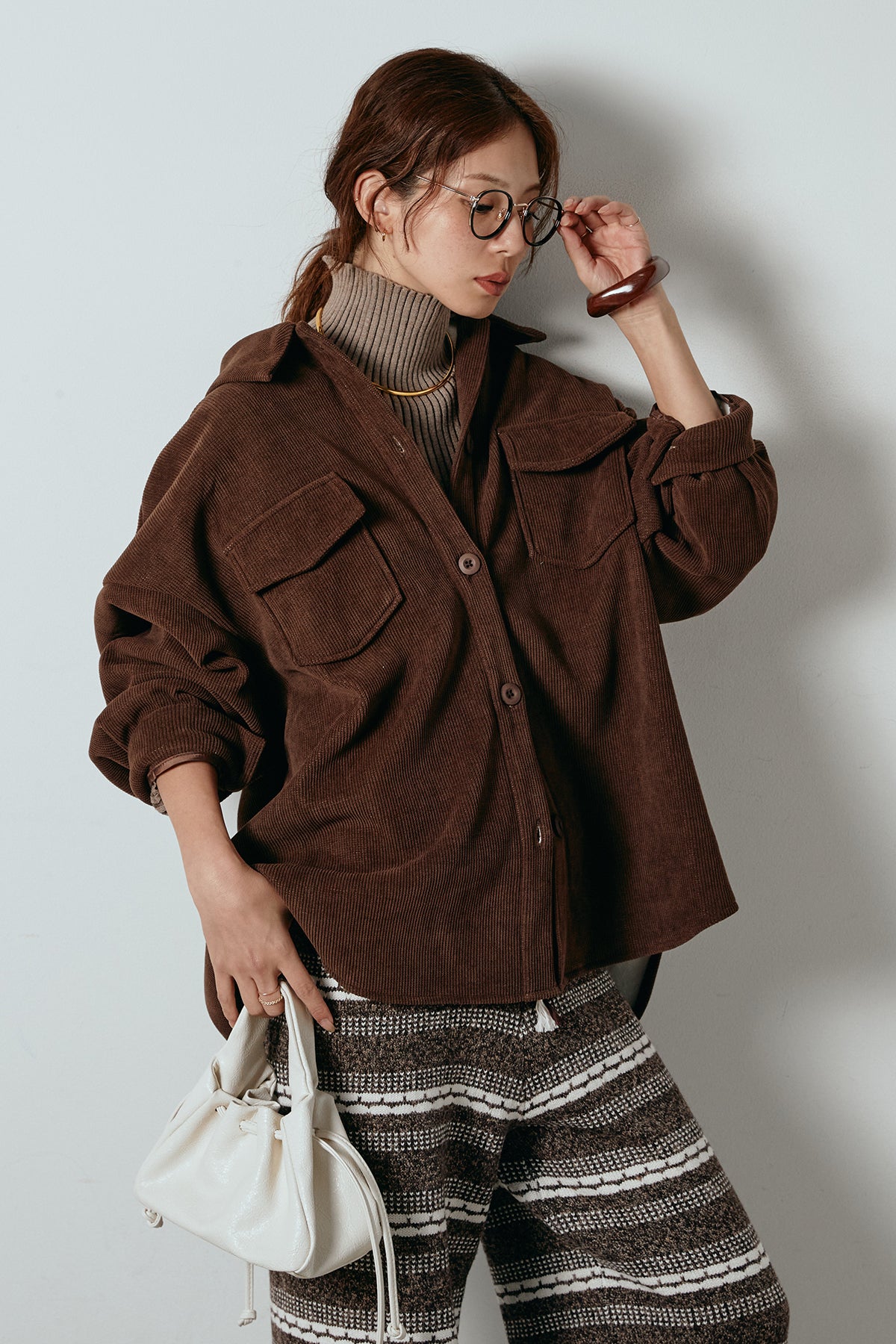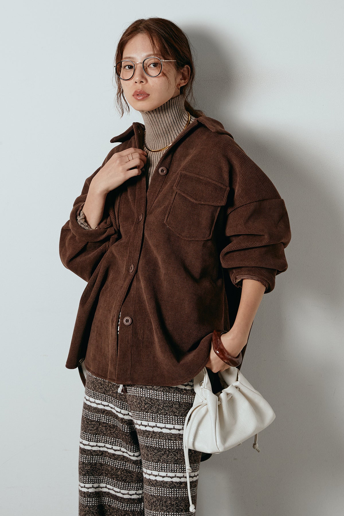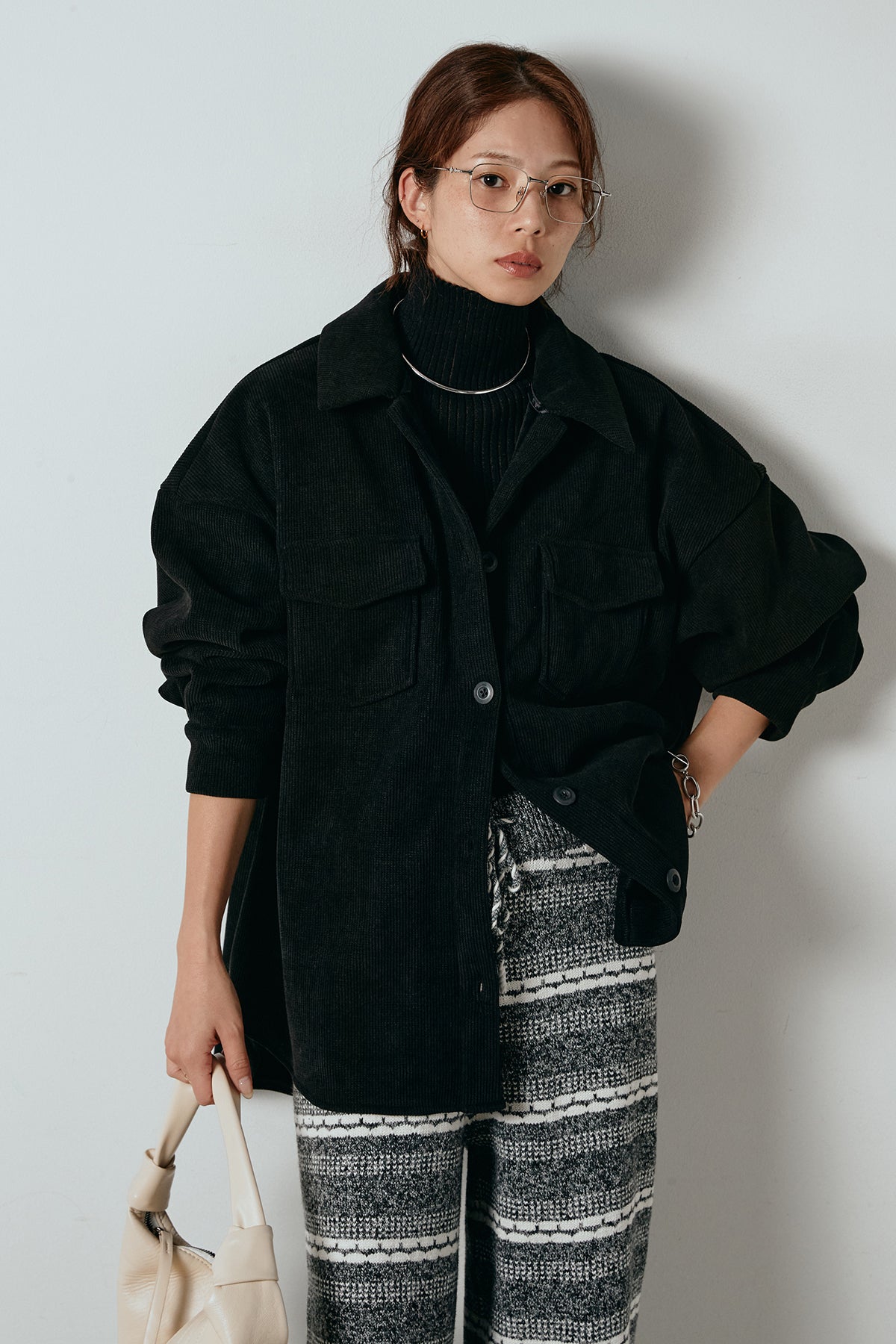 ふんわりとしたコーデュロイ素材が季節感を引き立てる、襟付きのポケットシャツ。 オーバーサイズ気味のシルエットで抜け感を演出しつつ、胸元の大きめポケットが程よいアクセントに。 一枚で着るのはもちろん、タートルやロンTとのレイヤードもおすすめです。 羽織としても使いやすく、秋冬のカジュアルスタイルに活躍する万能アイテム。